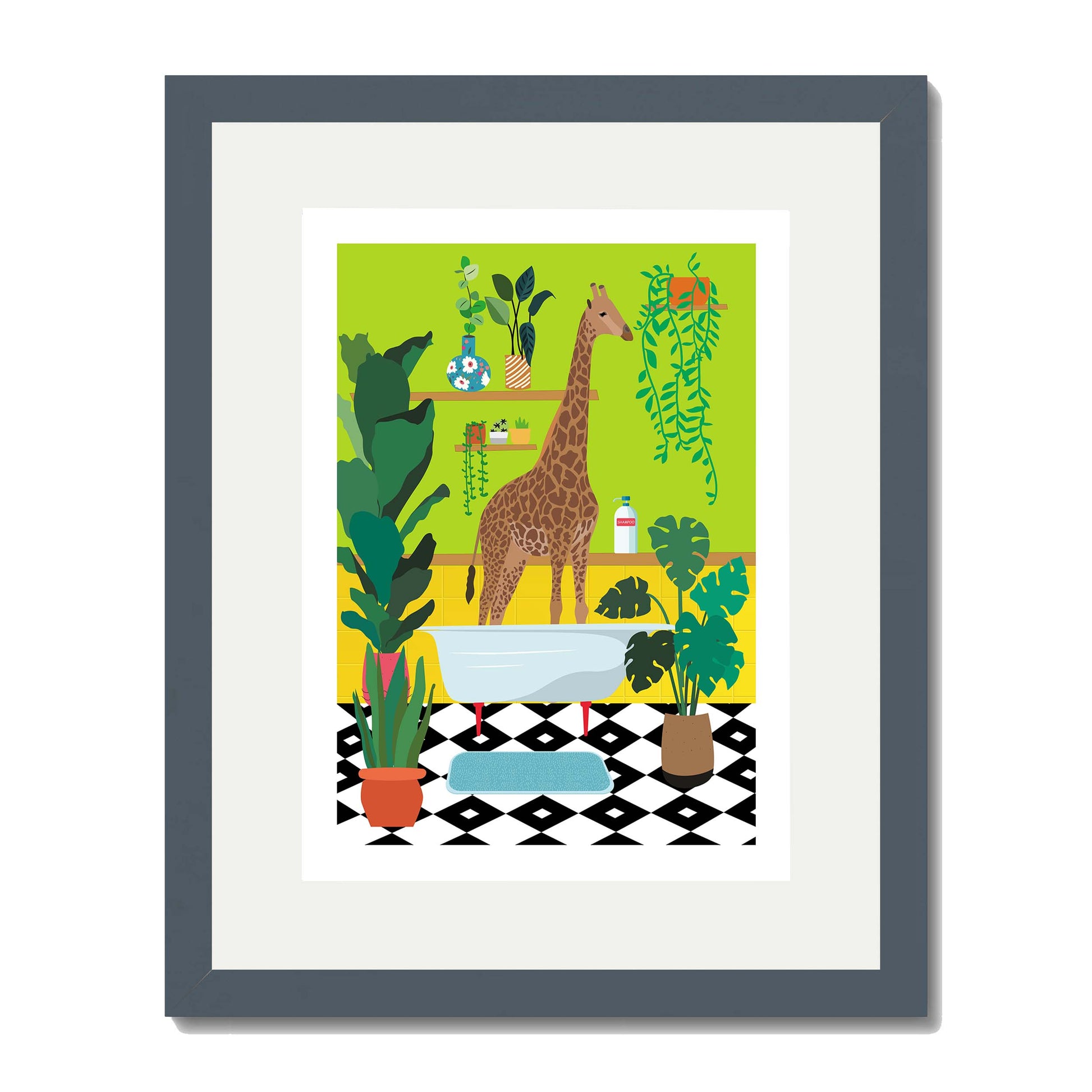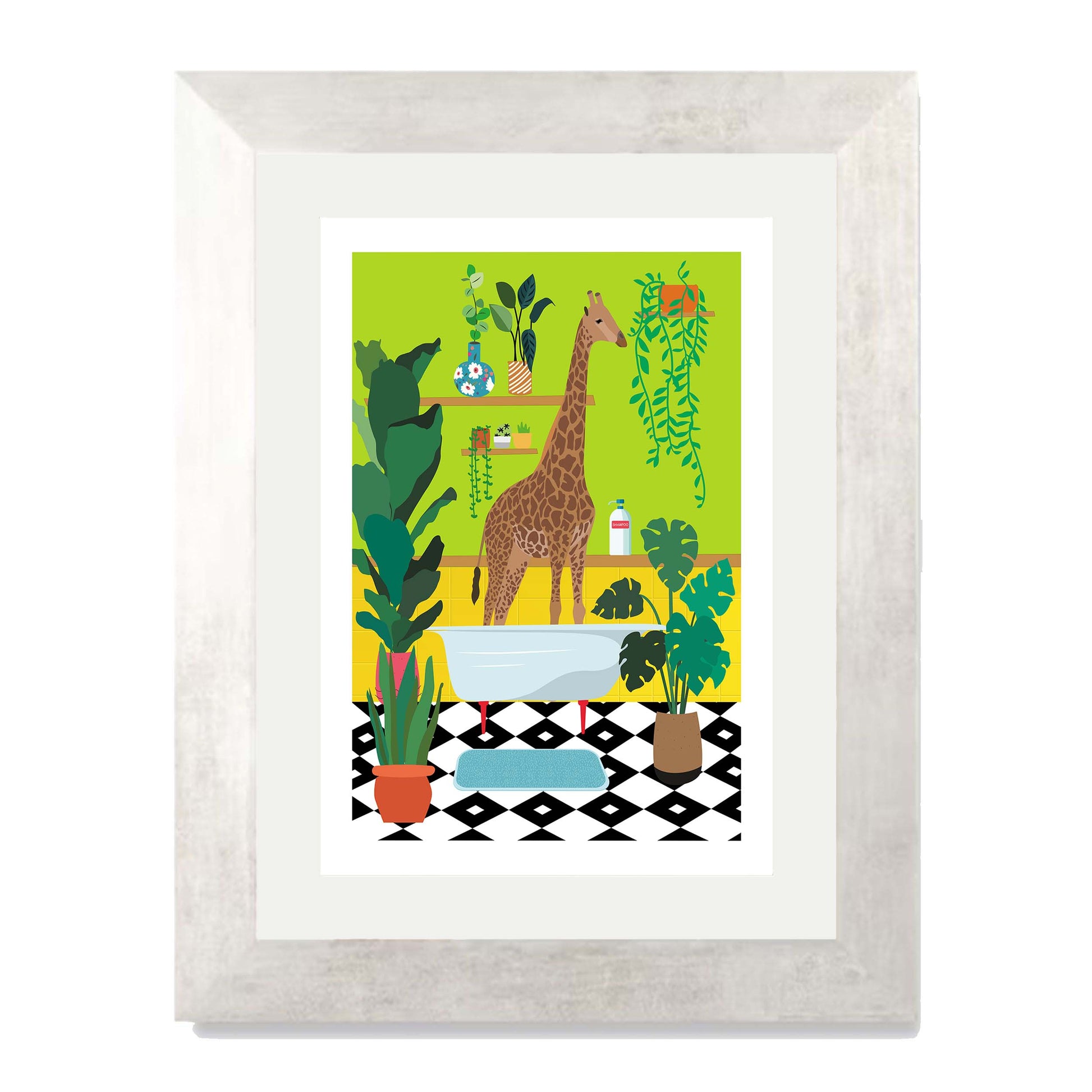 Whimsical and vibrant canvas print featuring a giraffe relaxing in a bathtub surrounded by lush green houseplants. A playful and colorful artwork that adds quirky charm to bathrooms, laundry rooms, or any space needing a fun pop of personality.