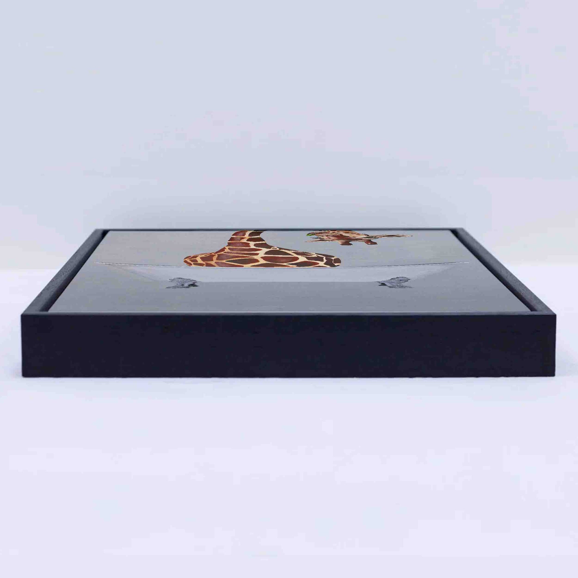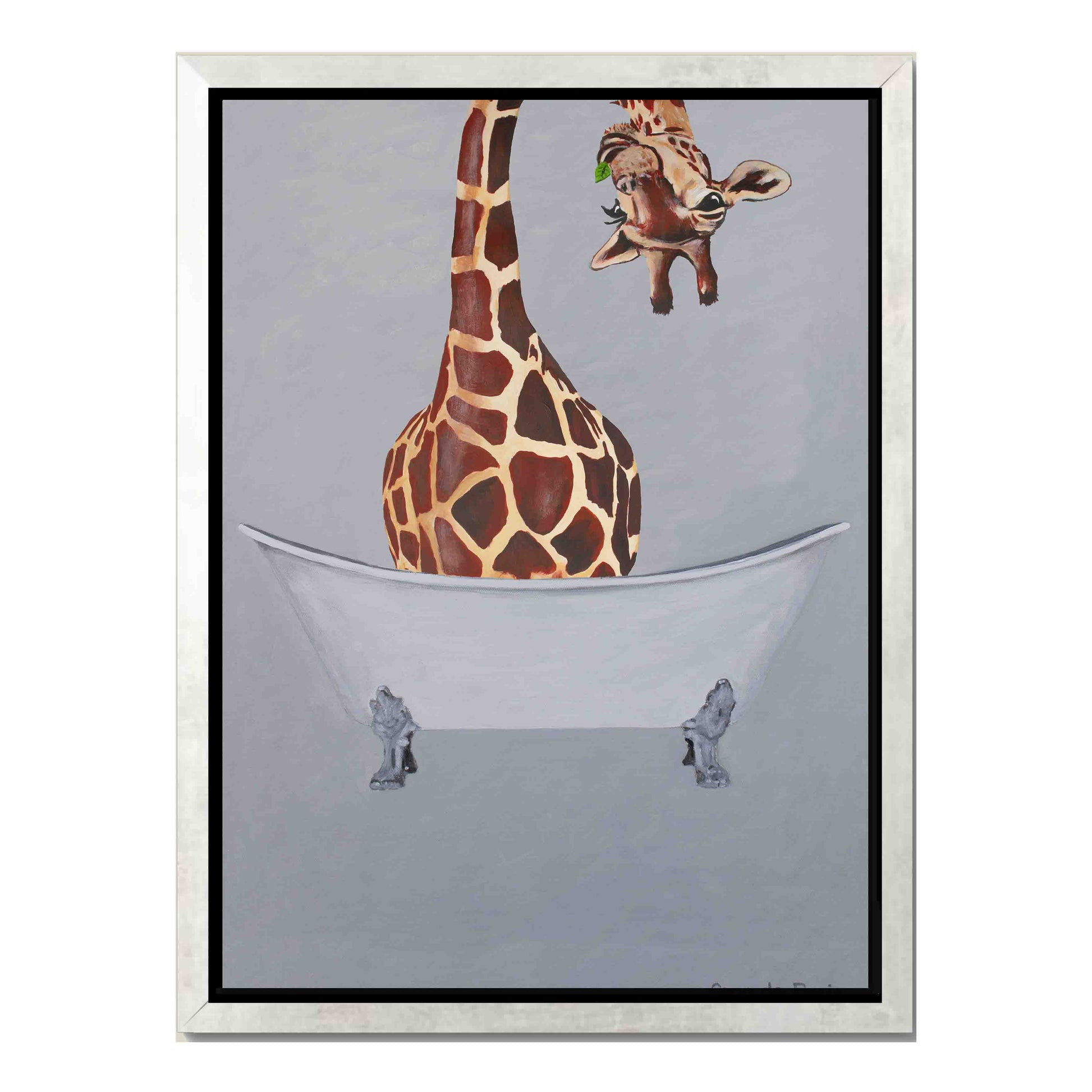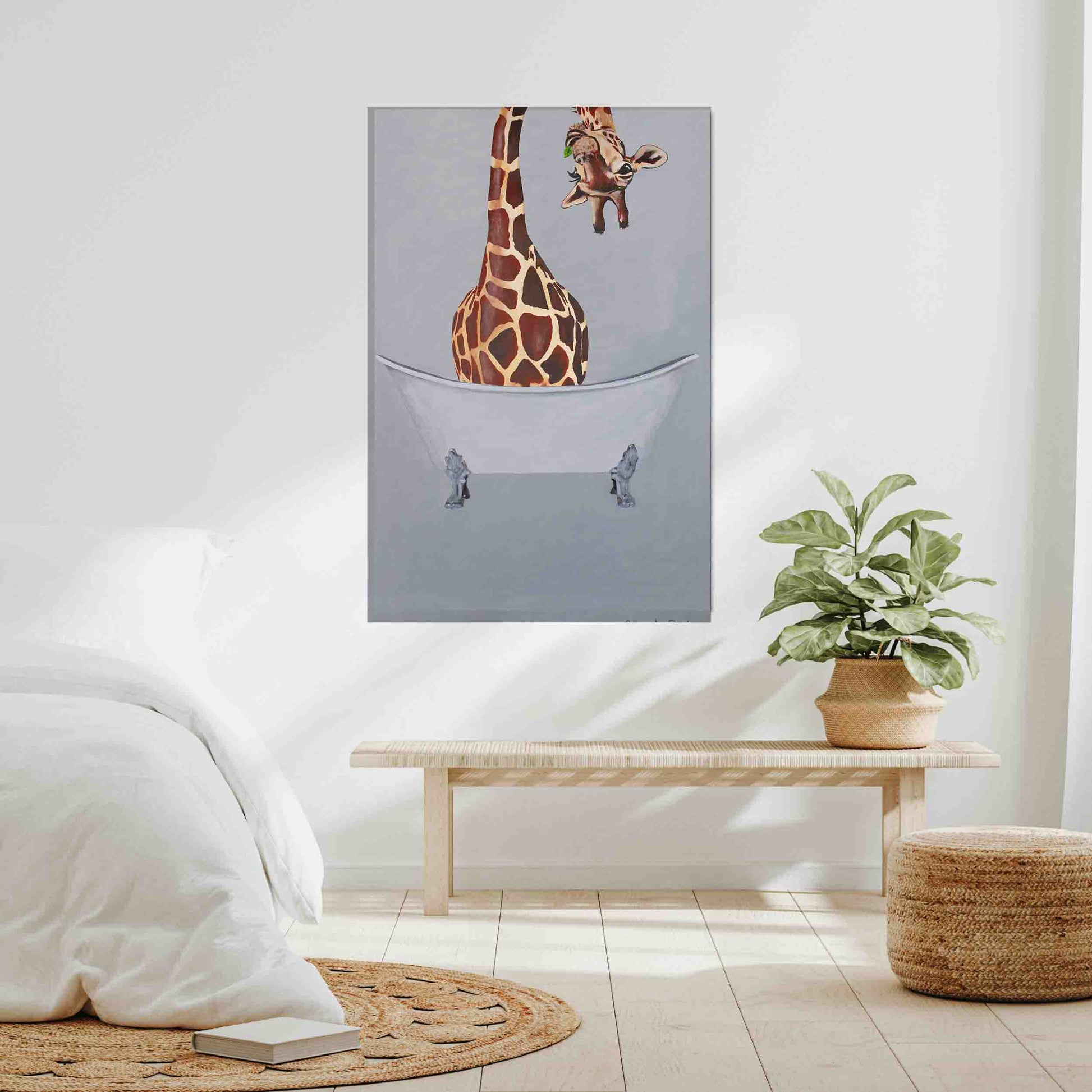 Quirky canvas print of a GIRAFFE IN BATHTUB. A whimsical, surreal artwork that adds humor and personality to bathrooms, laundry rooms, or any fun space.