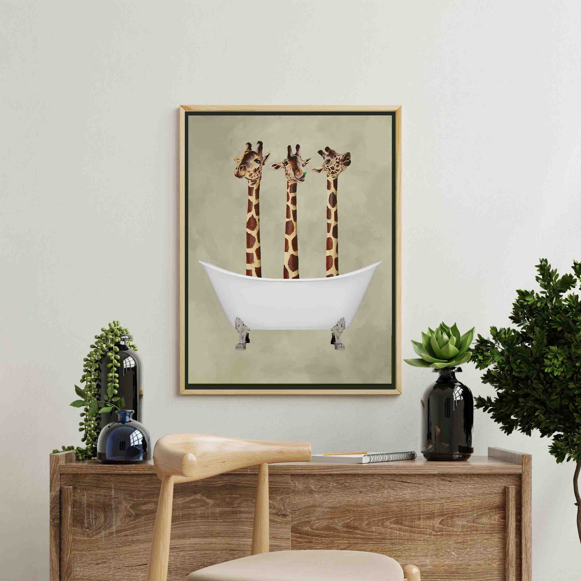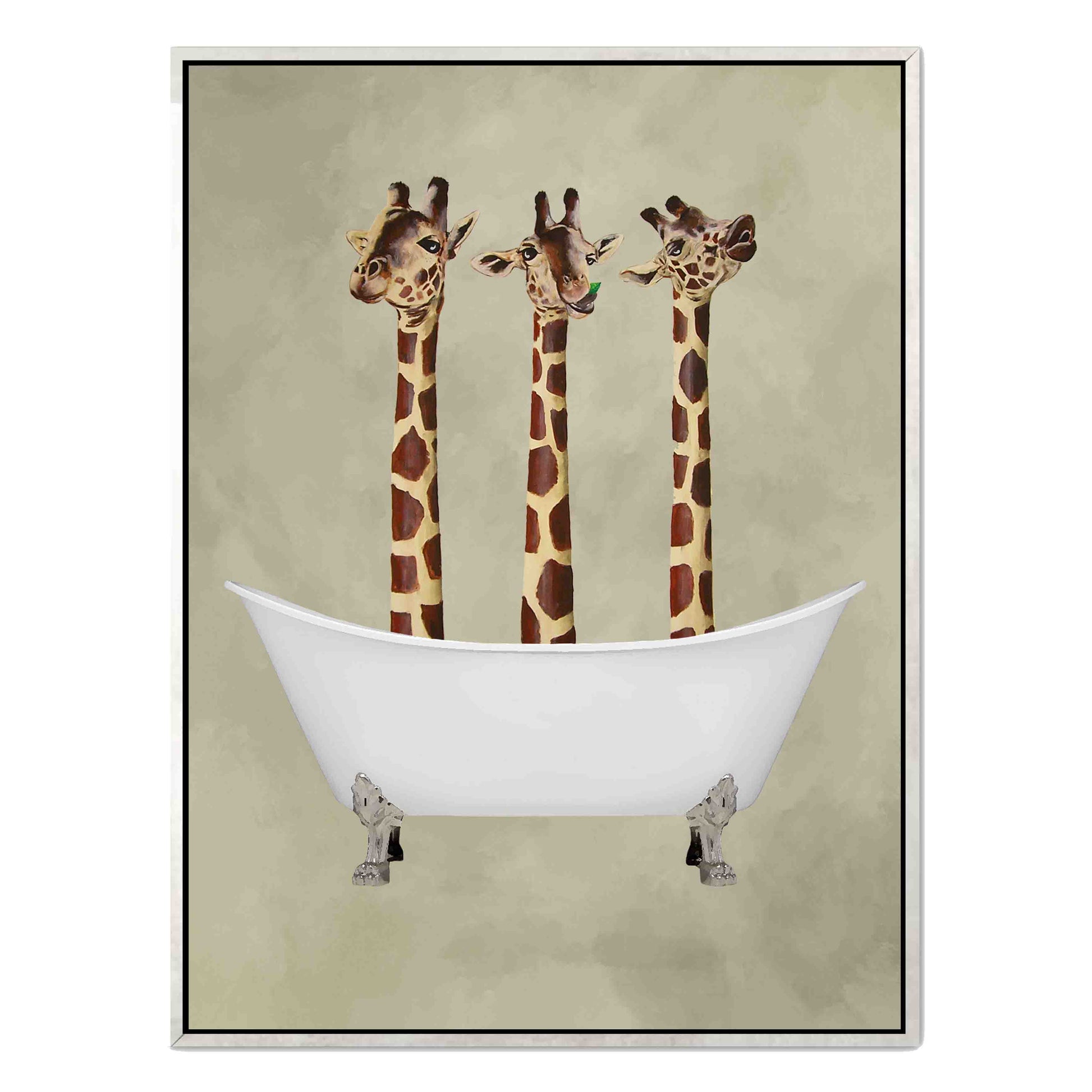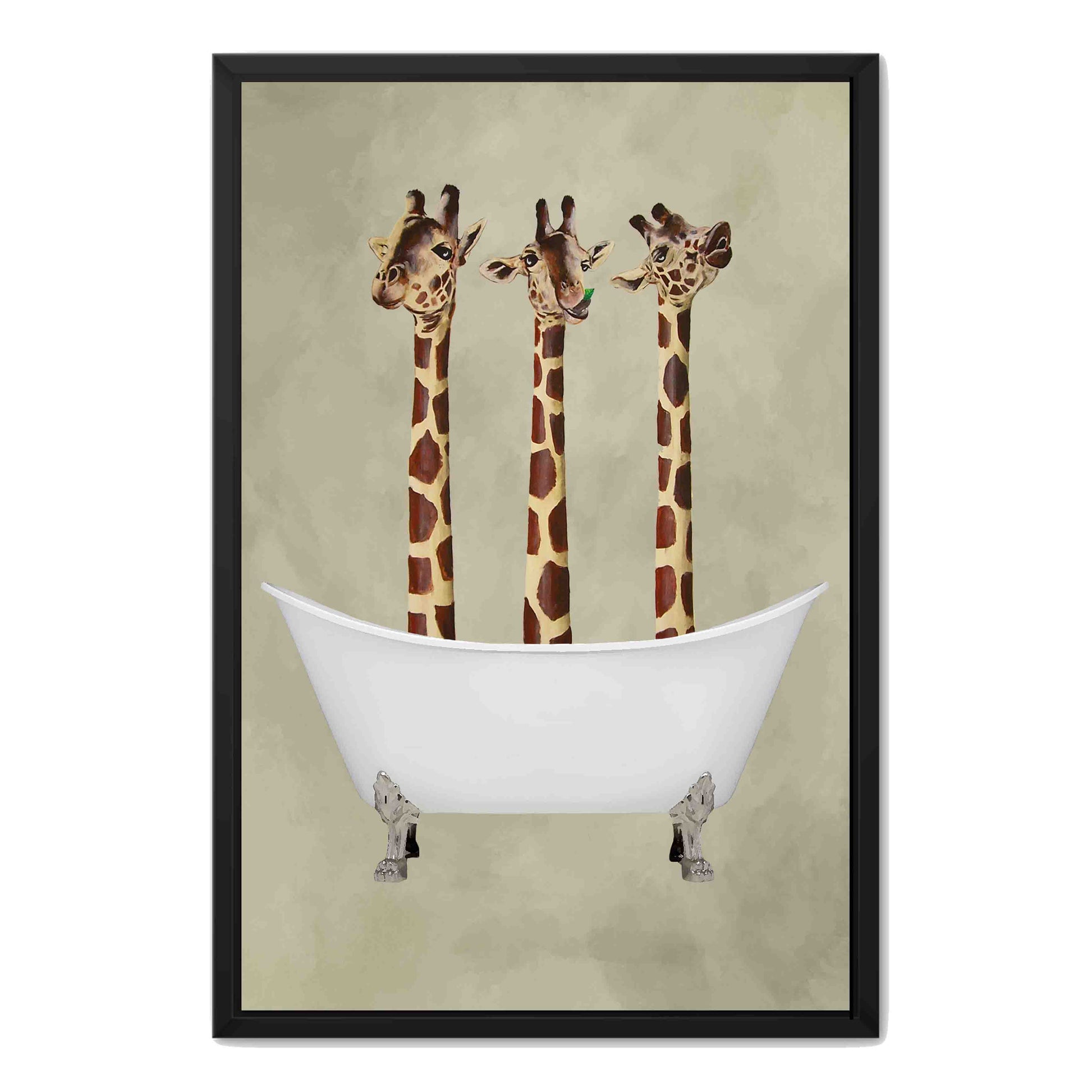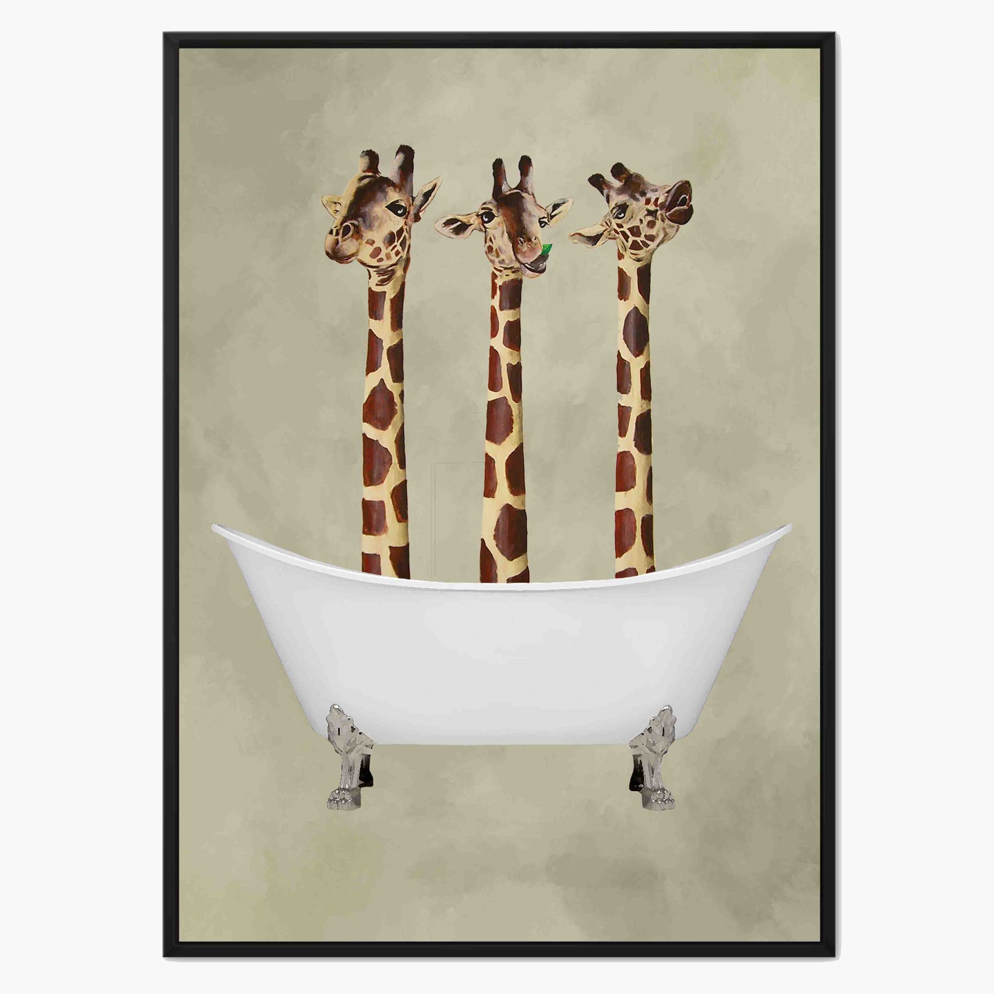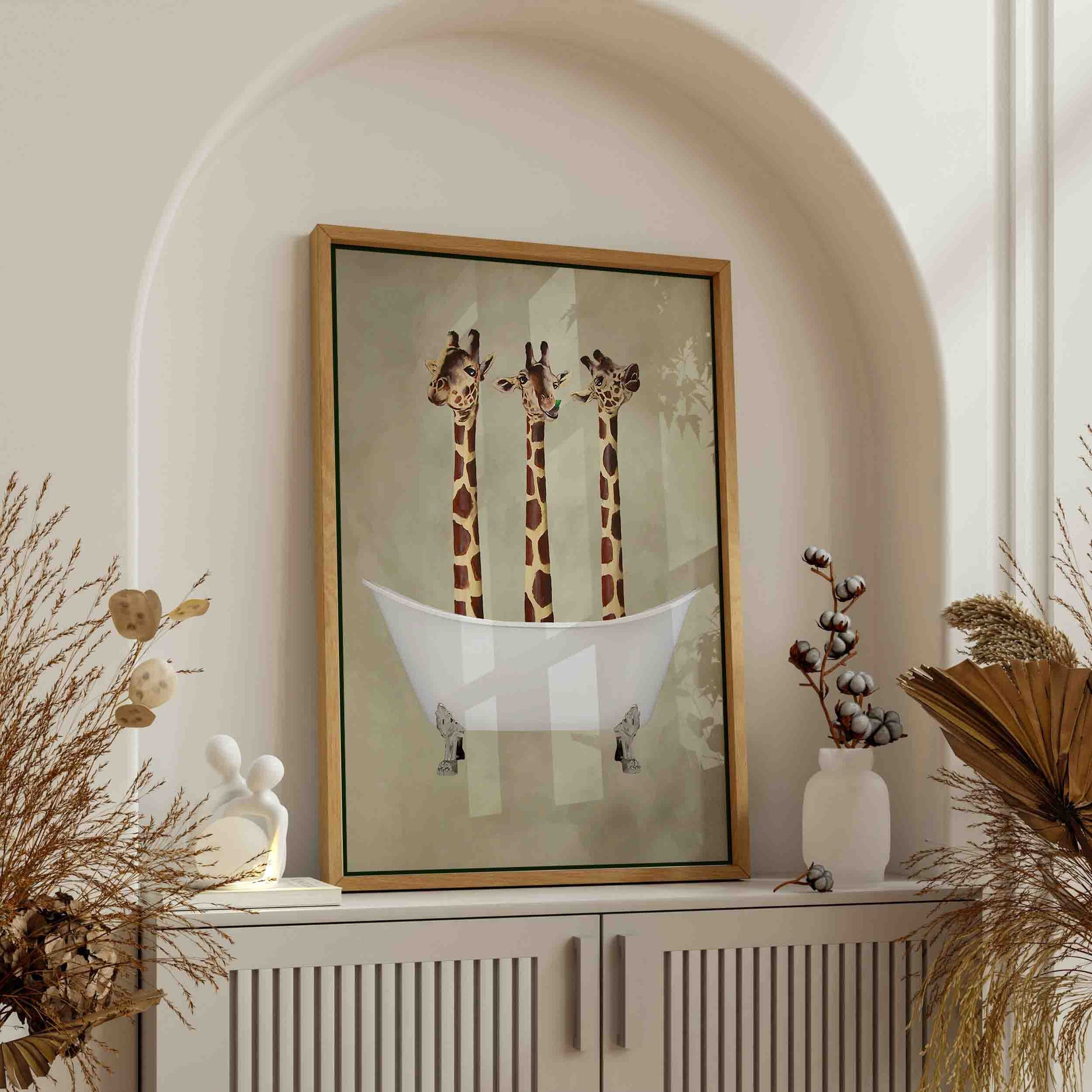 Quirky canvas print of three playful GIRAFFES IN BATHTUB. A surreal and humorous wall art piece perfect for bathrooms, laundry rooms, or quirky home decor.