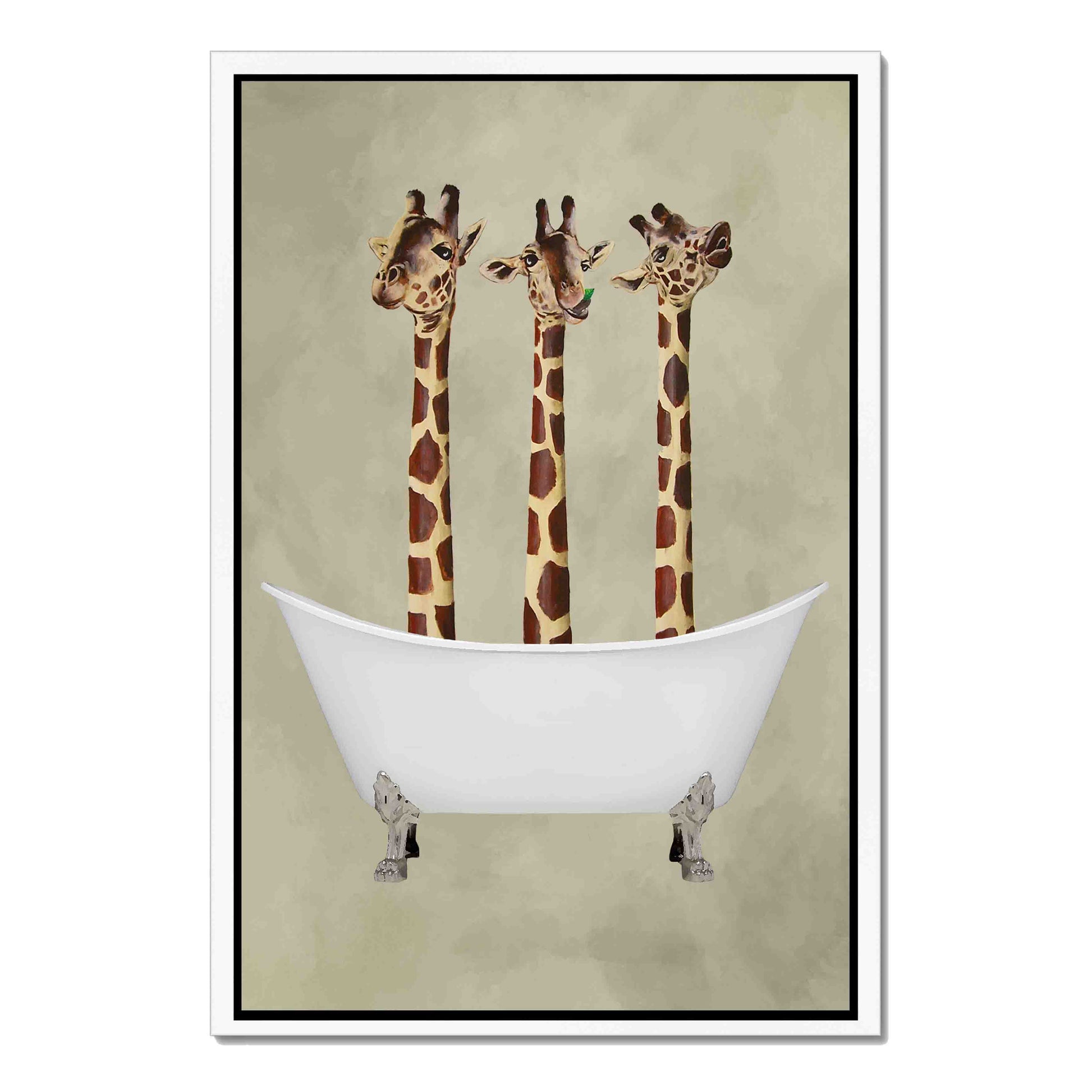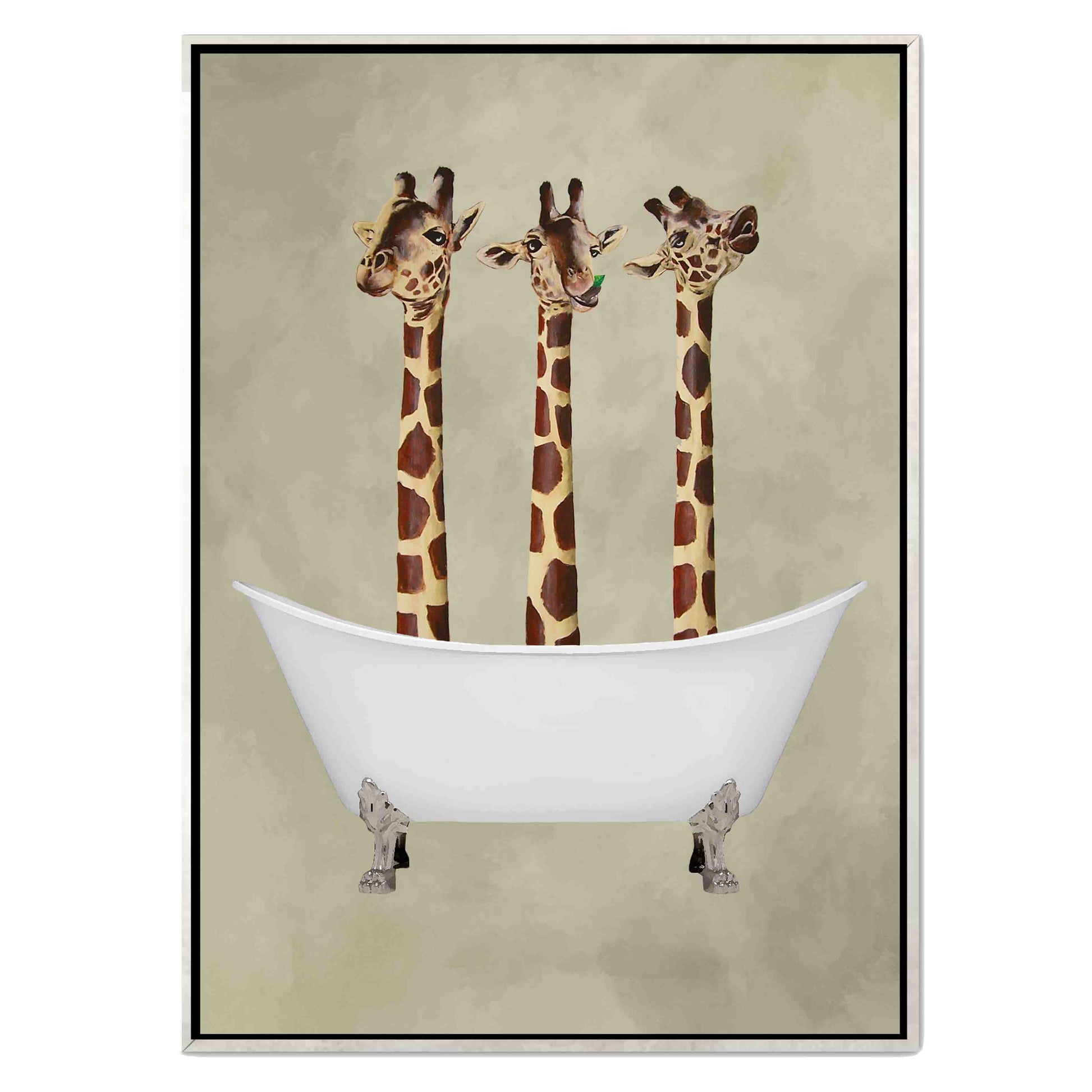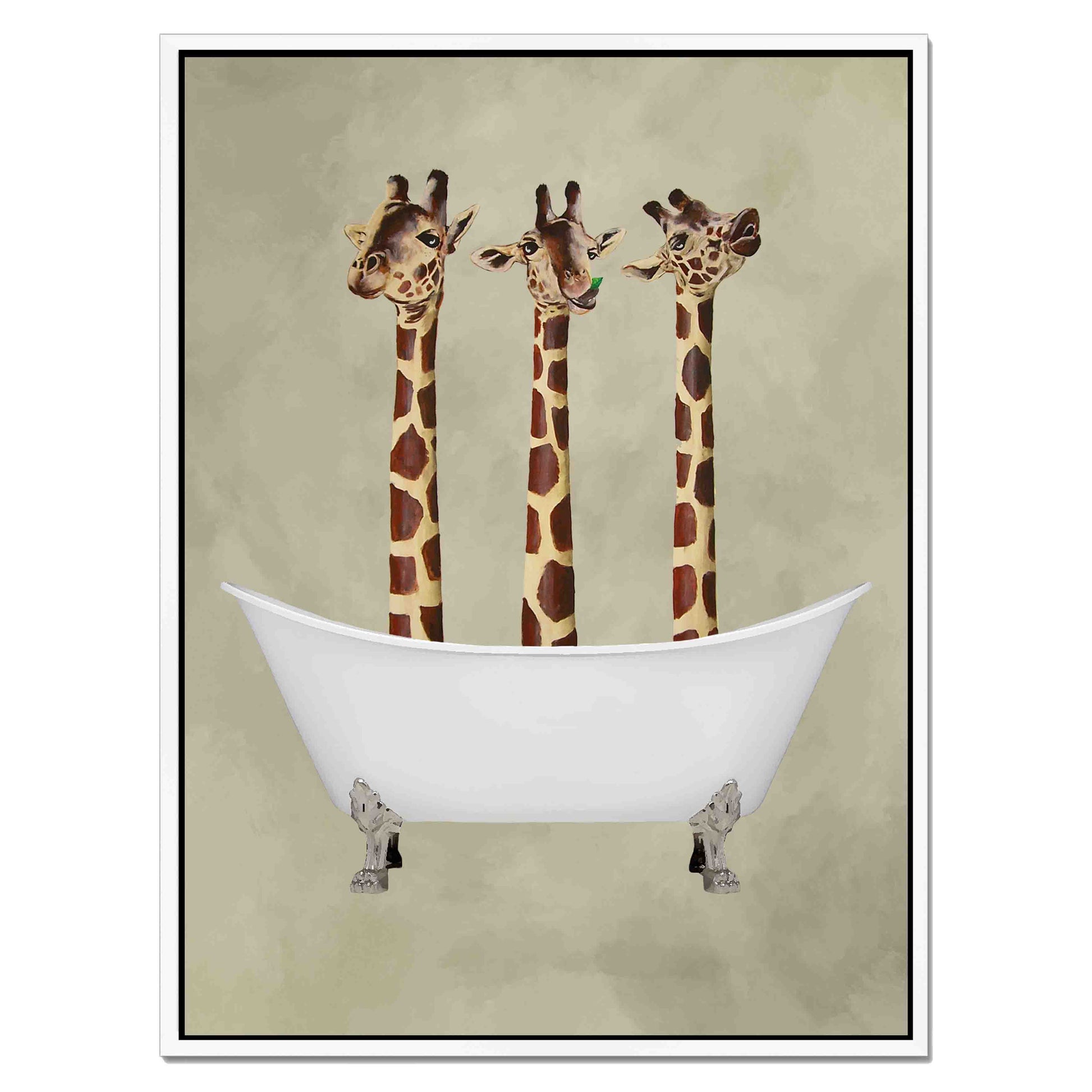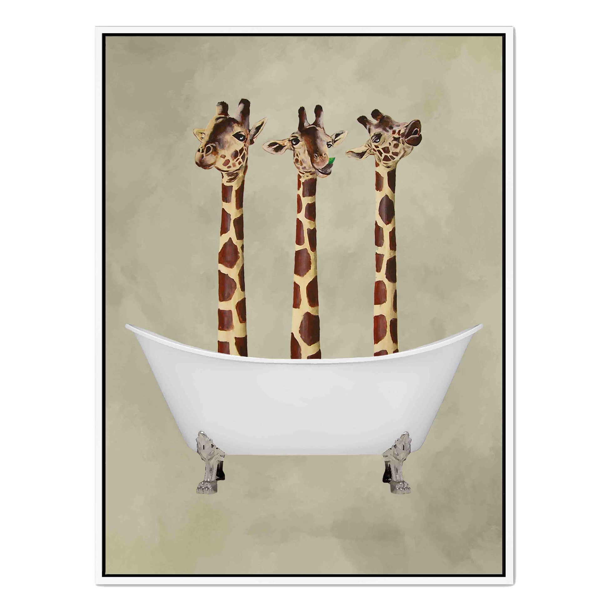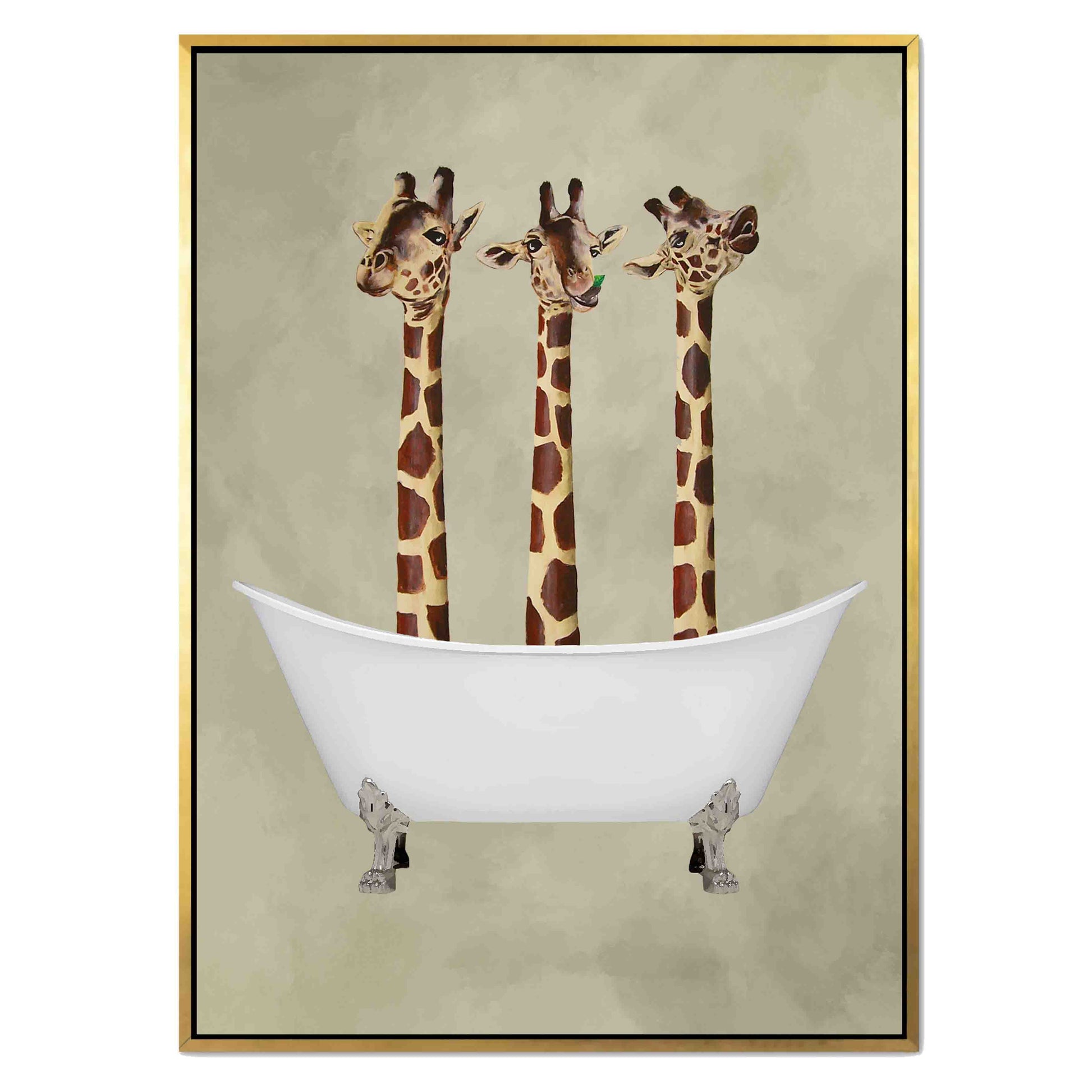 Quirky canvas print of three playful GIRAFFES IN BATHTUB. A surreal and humorous wall art piece perfect for bathrooms, laundry rooms, or quirky home decor.