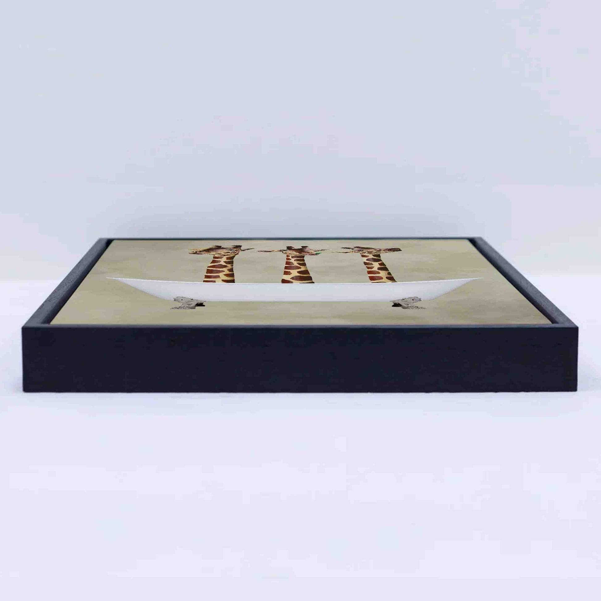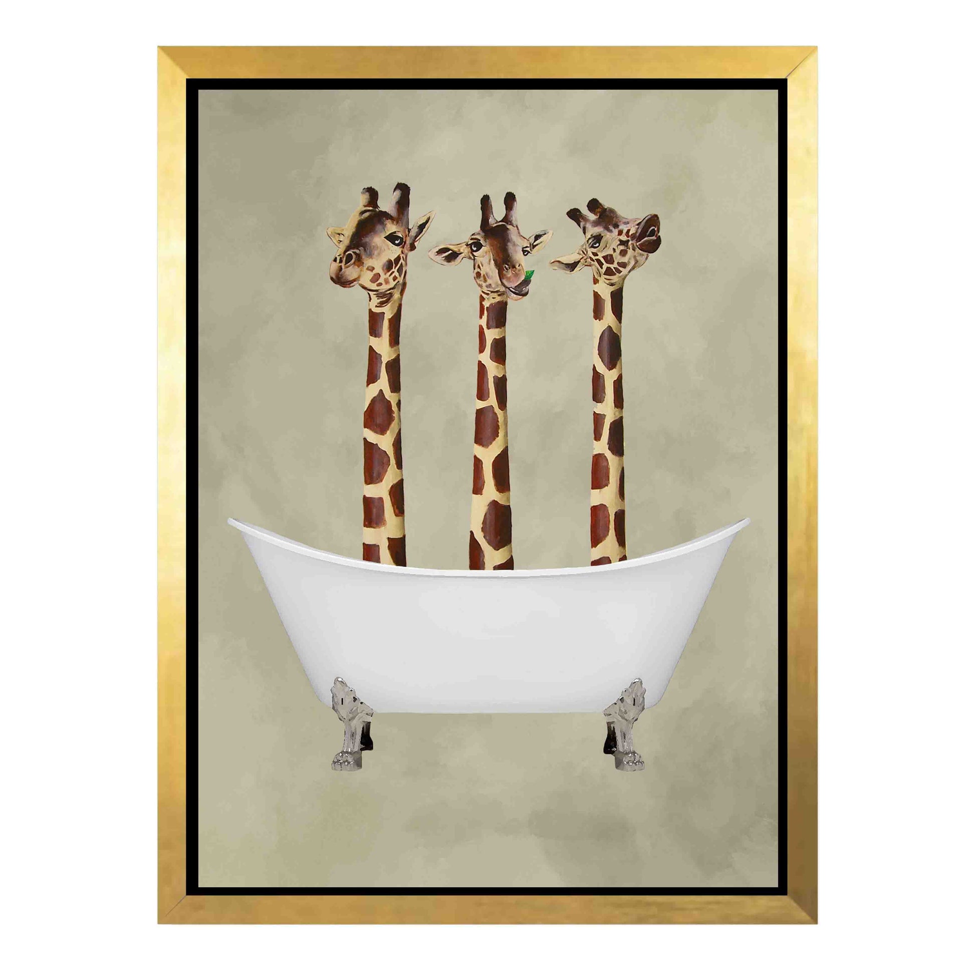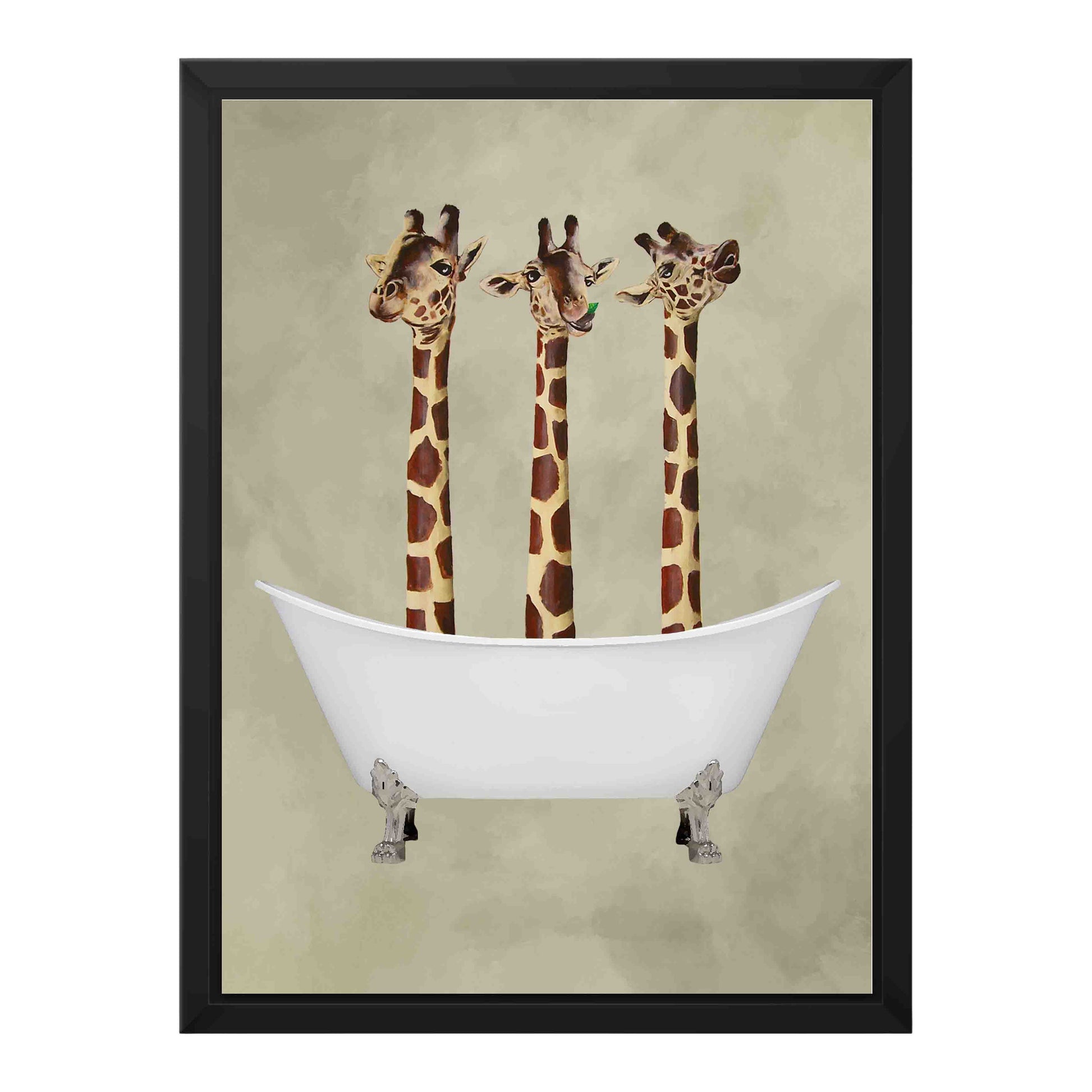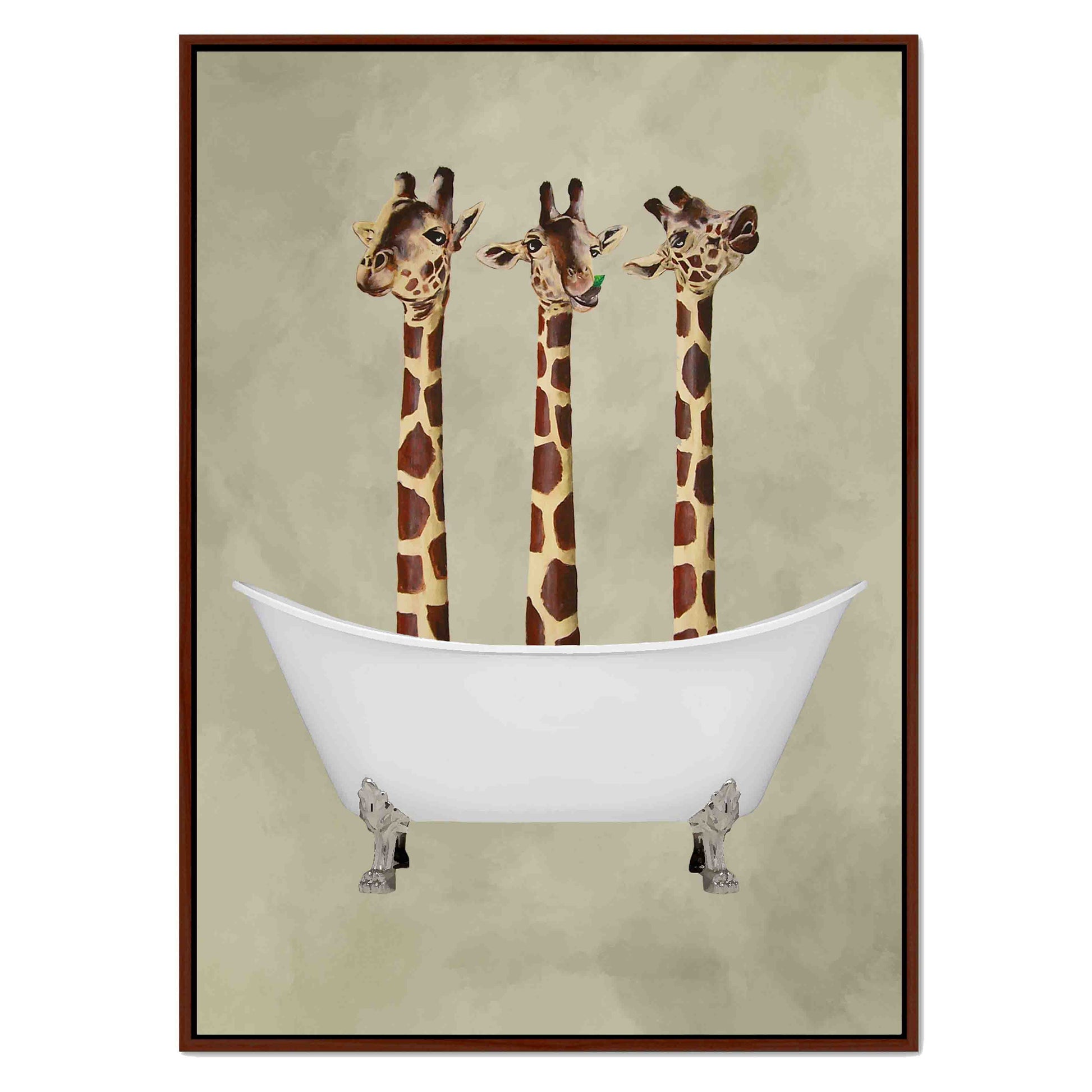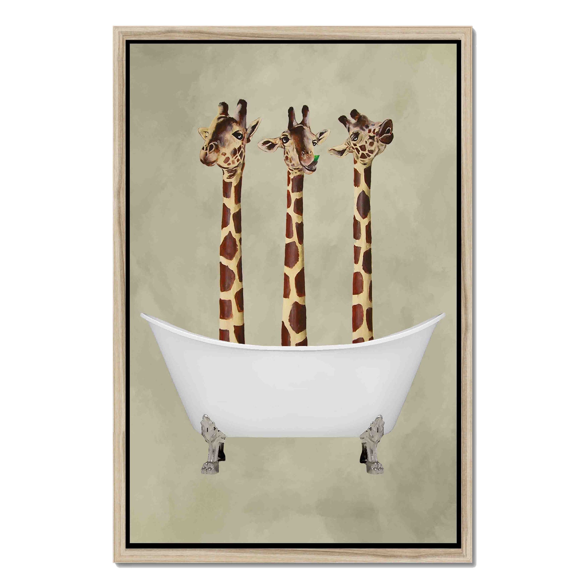 Quirky canvas print of three playful GIRAFFES IN BATHTUB. A surreal and humorous wall art piece perfect for bathrooms, laundry rooms, or quirky home decor.