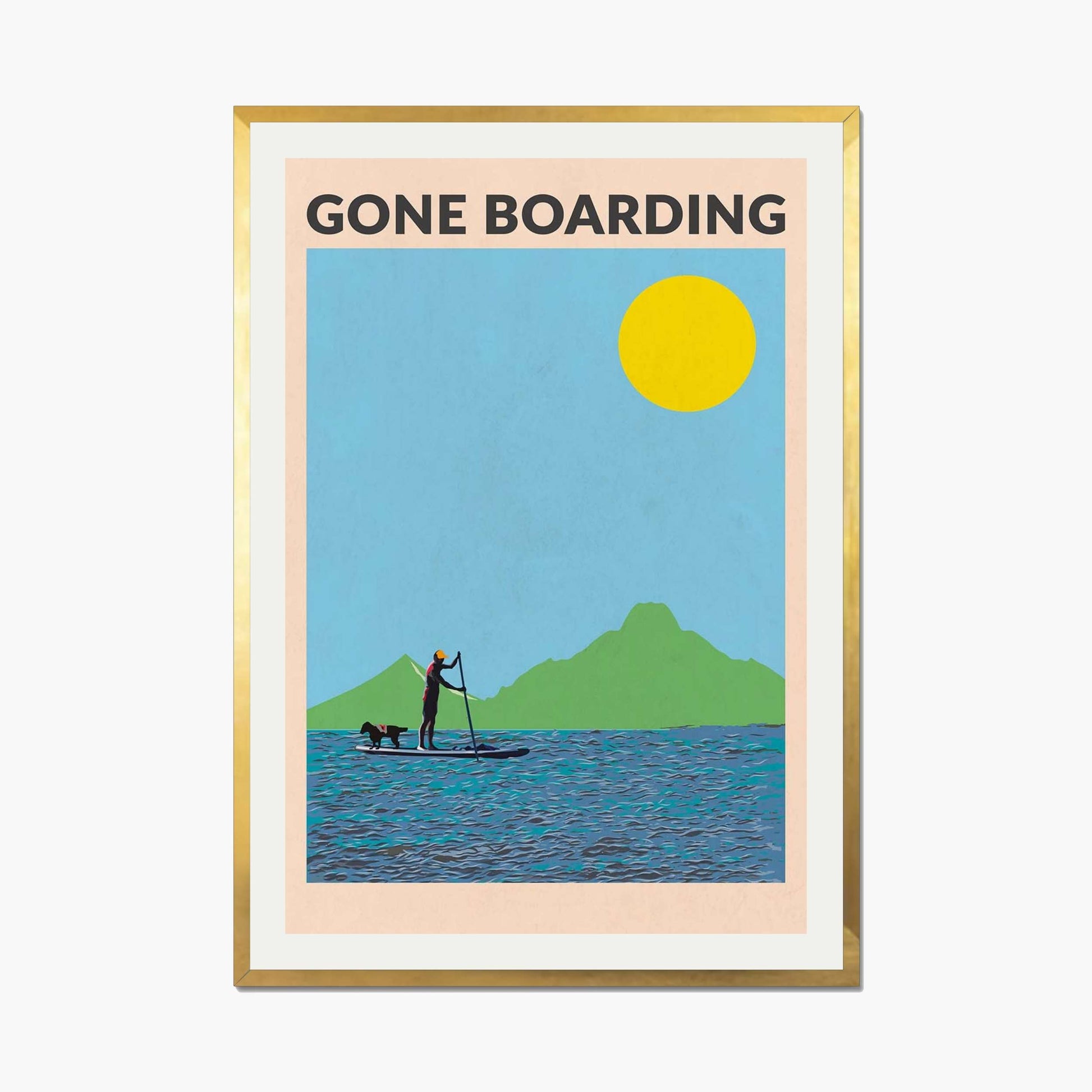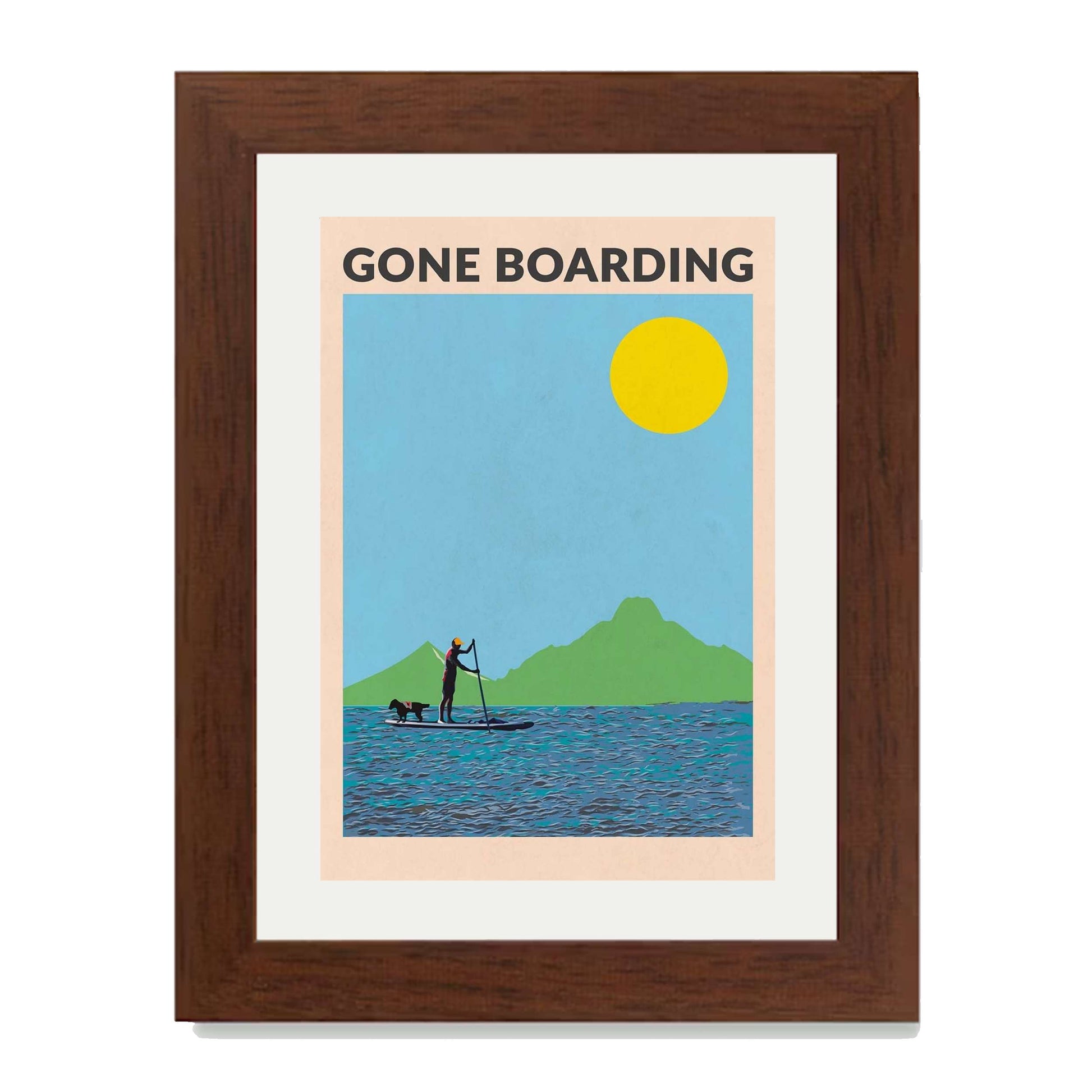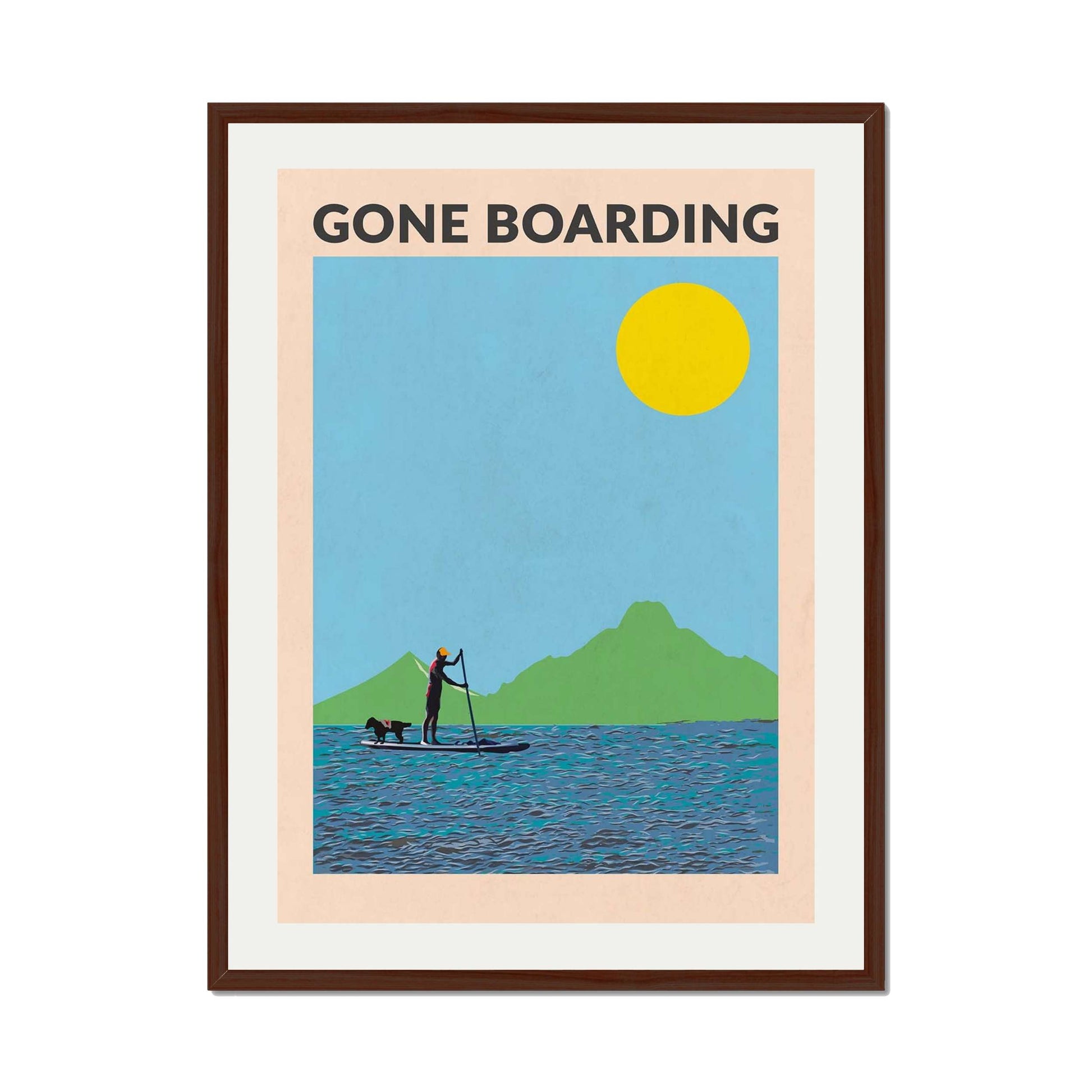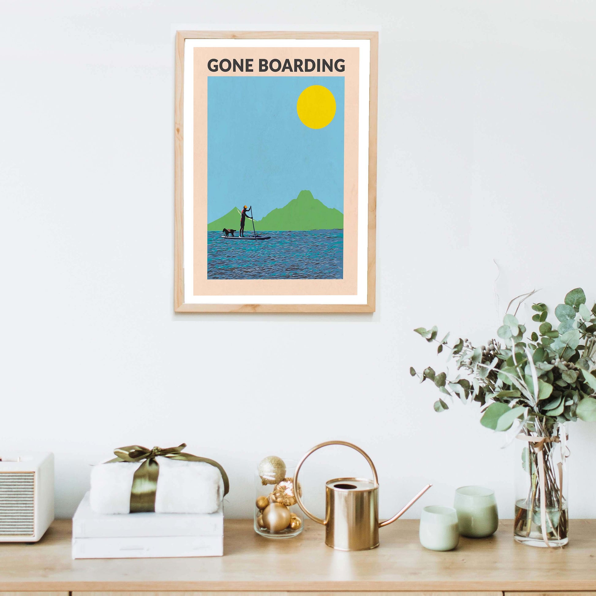 GONE BOARDING is a retro-style paddleboarding art print featuring a figure and their dog on calm waters with mountain and sun backdrop—perfect for adding coastal charm and adventurous spirit to any space.