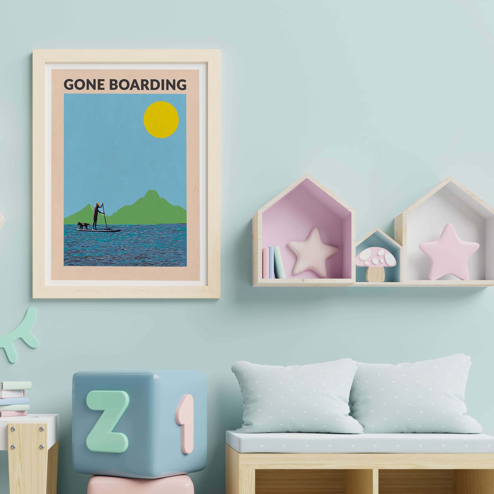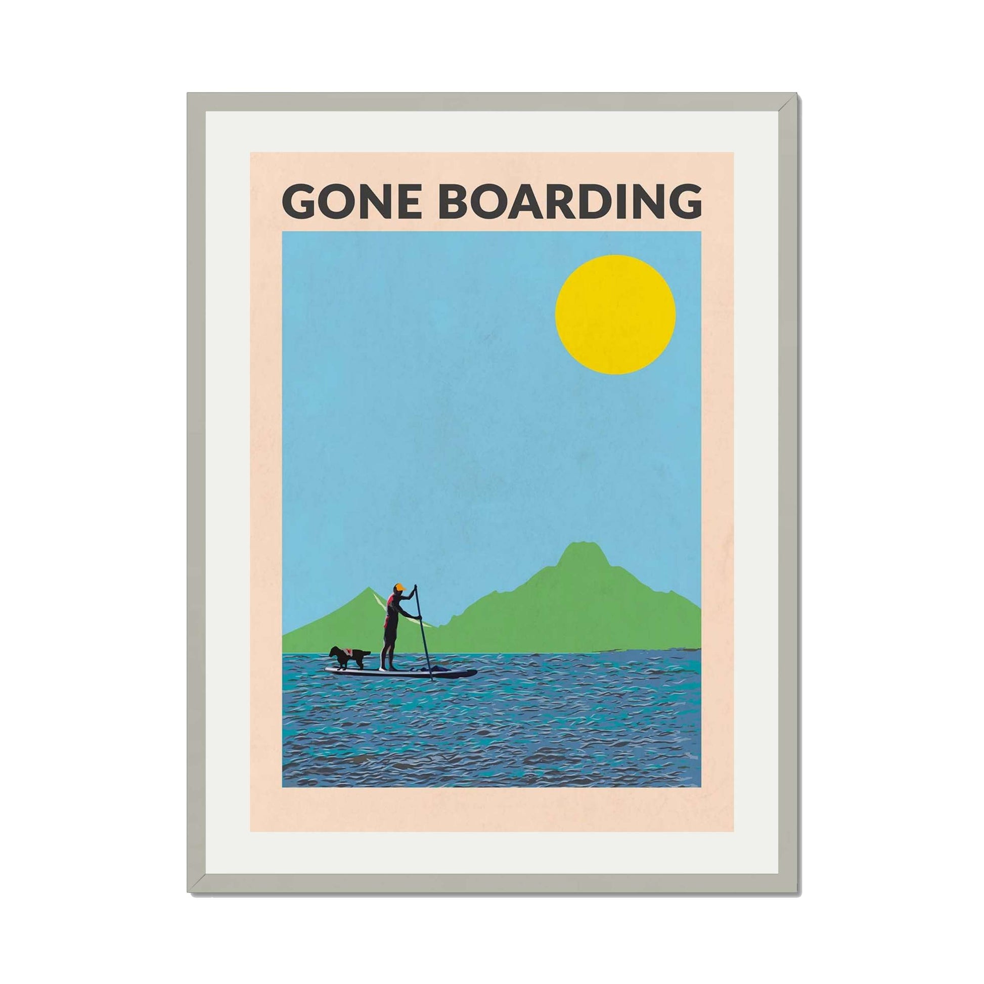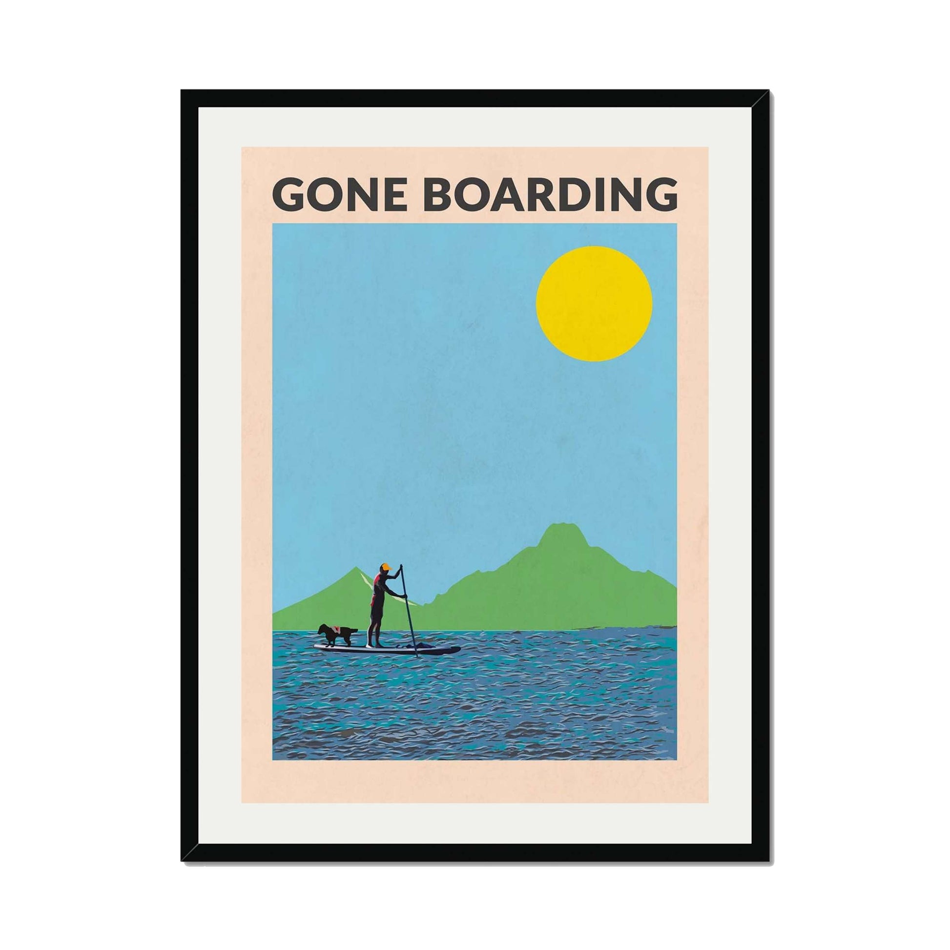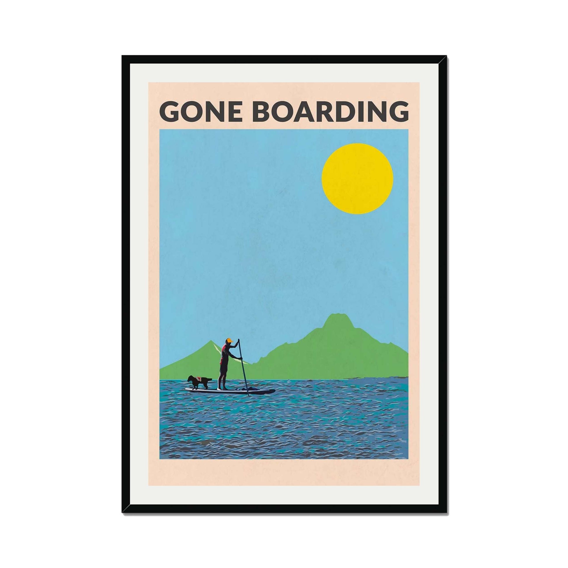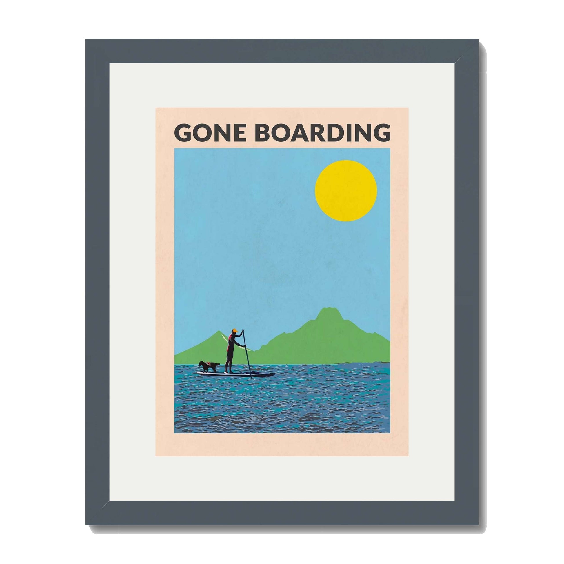 GONE BOARDING is a retro-style paddleboarding art print featuring a figure and their dog on calm waters with mountain and sun backdrop—perfect for adding coastal charm and adventurous spirit to any space.