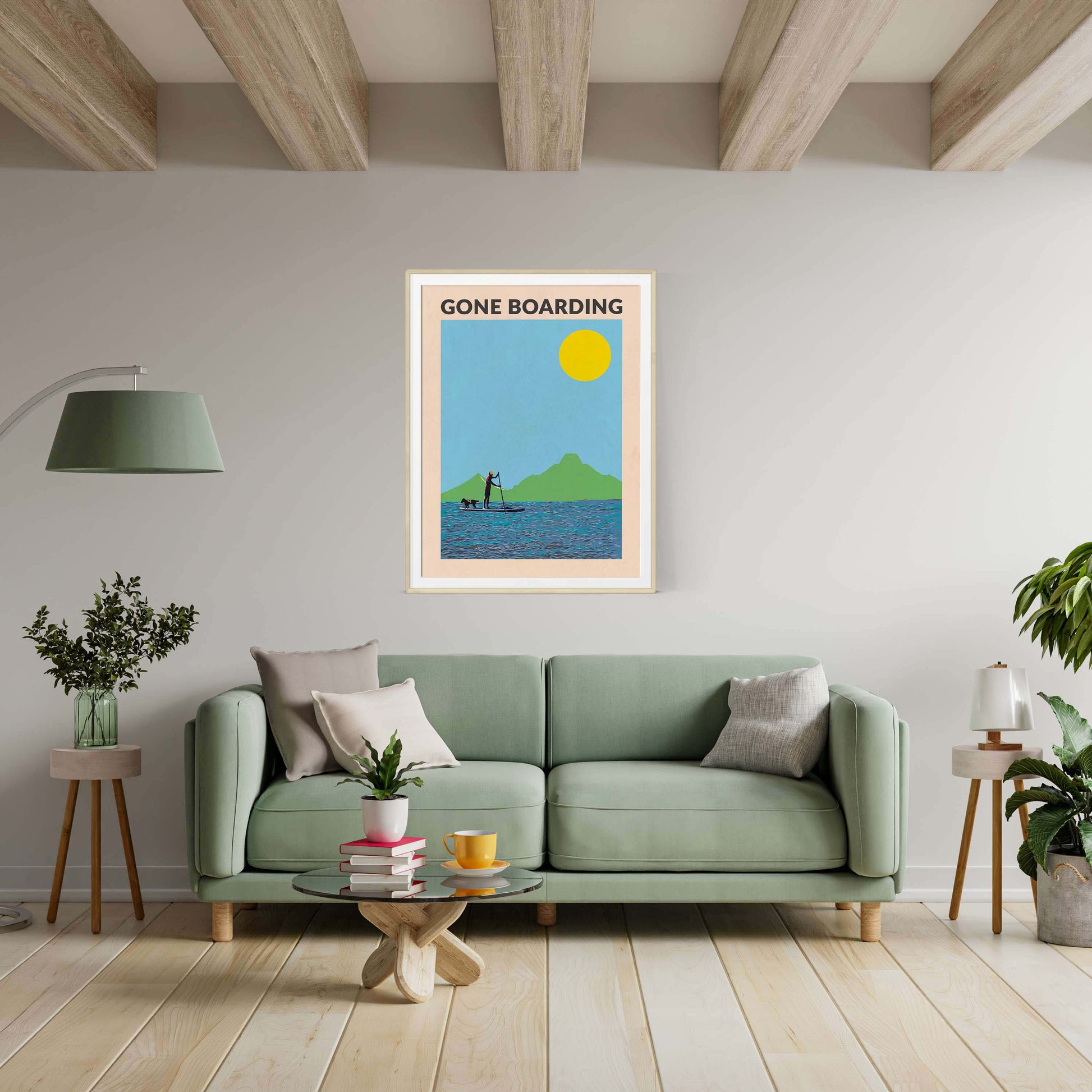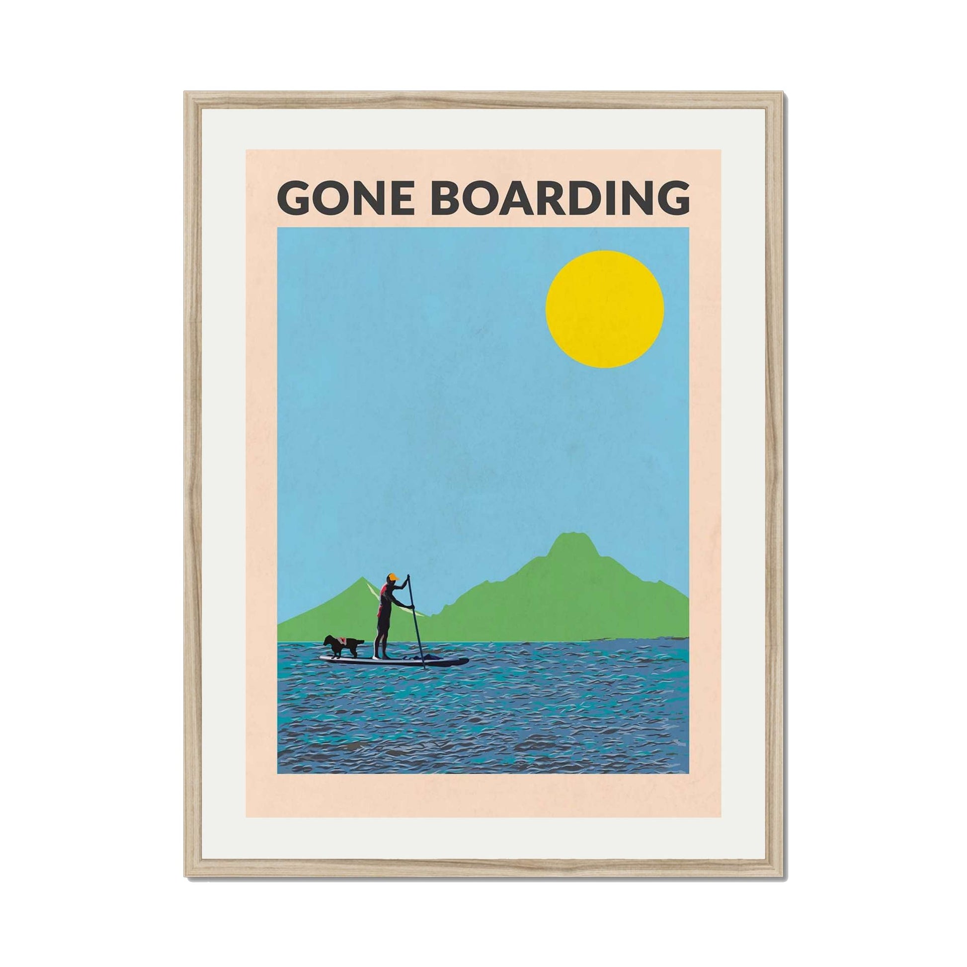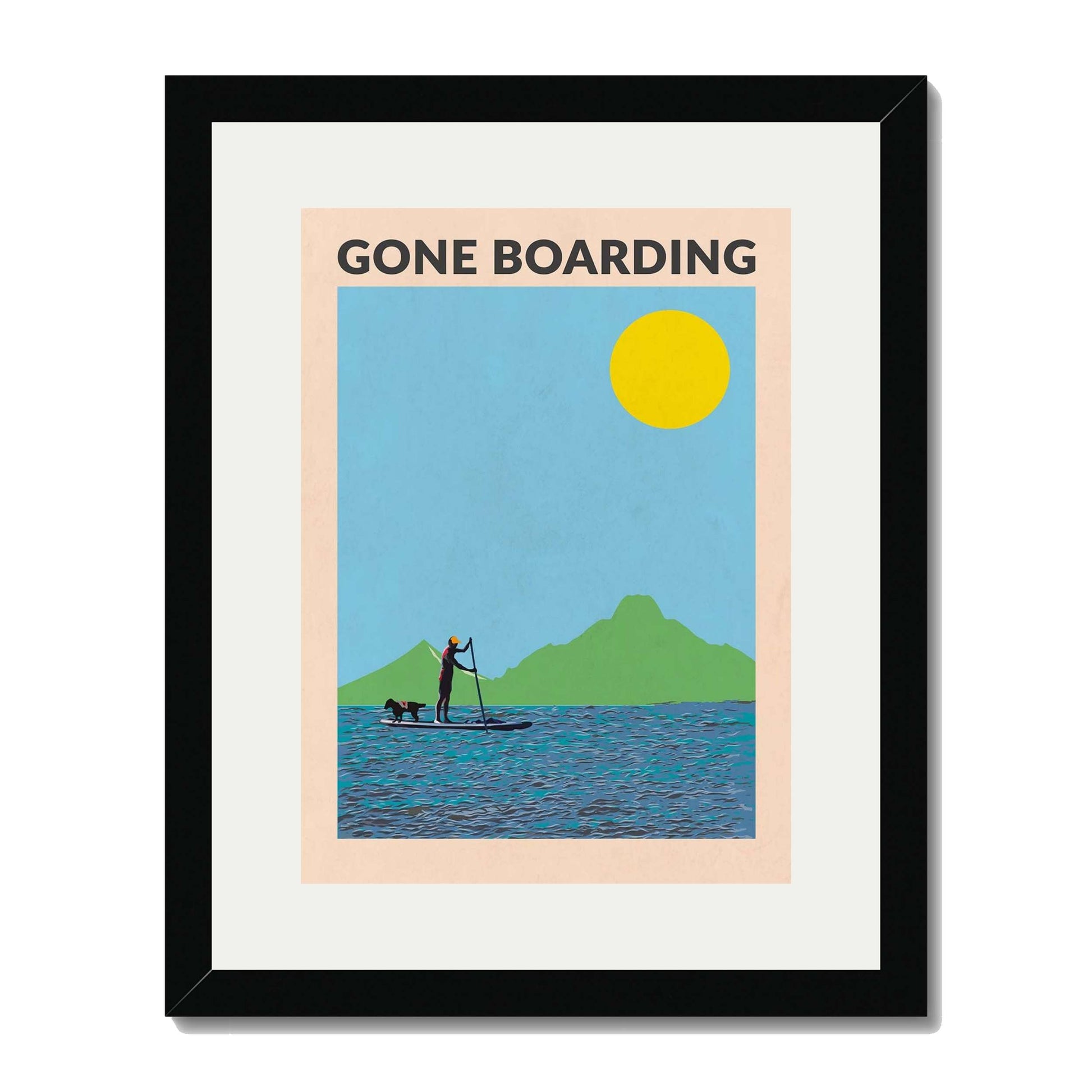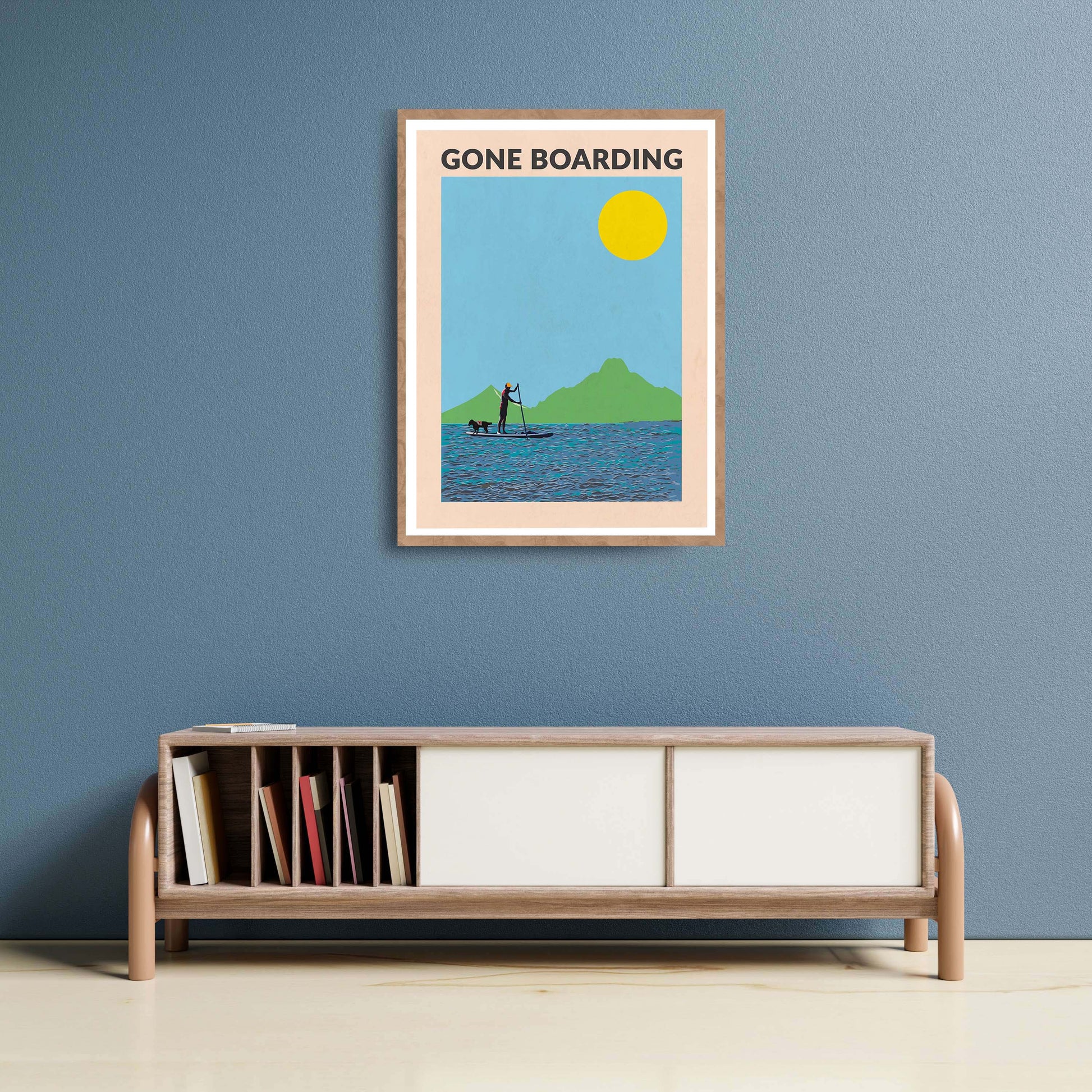 GONE BOARDING is a retro-style paddleboarding art print featuring a figure and their dog on calm waters with mountain and sun backdrop—perfect for adding coastal charm and adventurous spirit to any space.