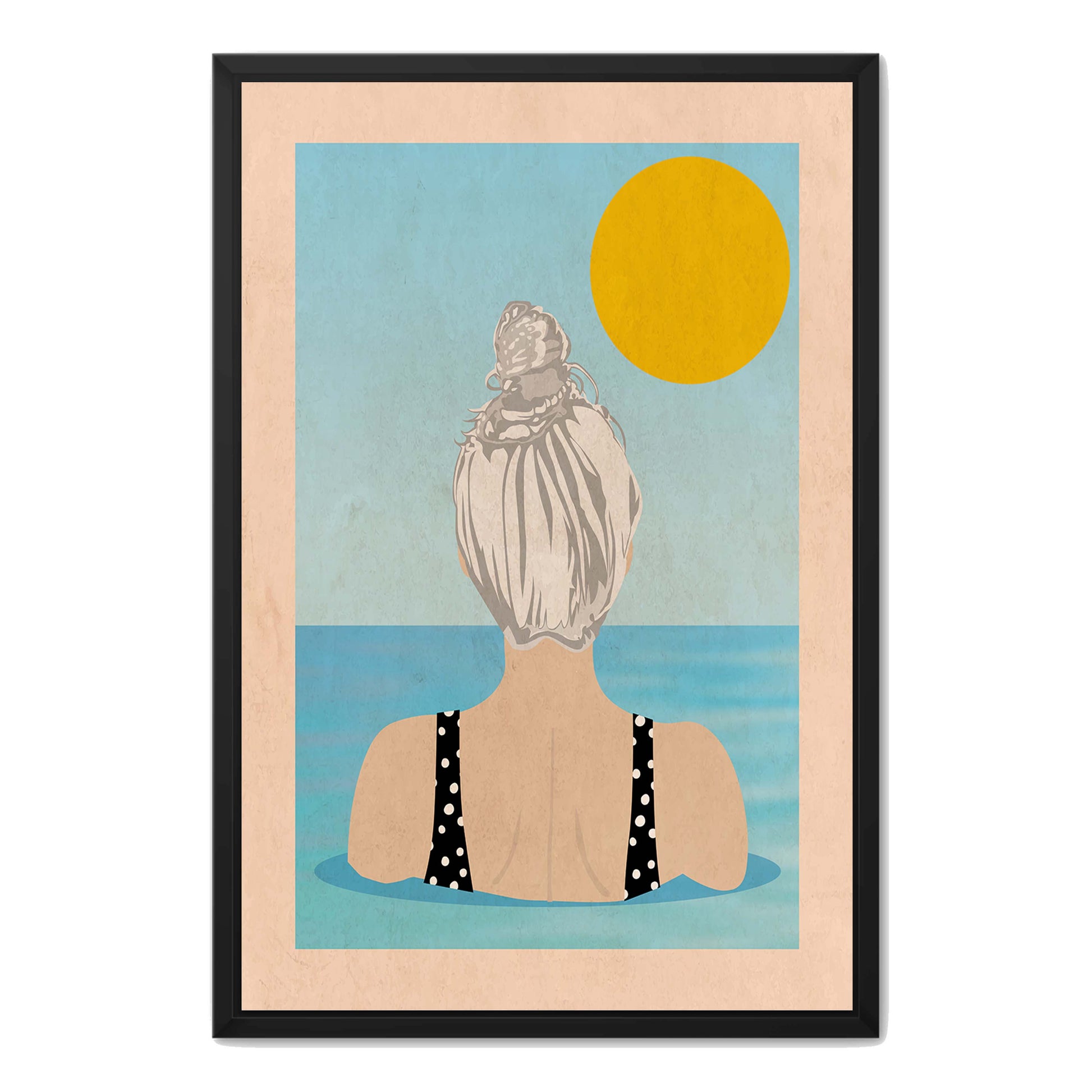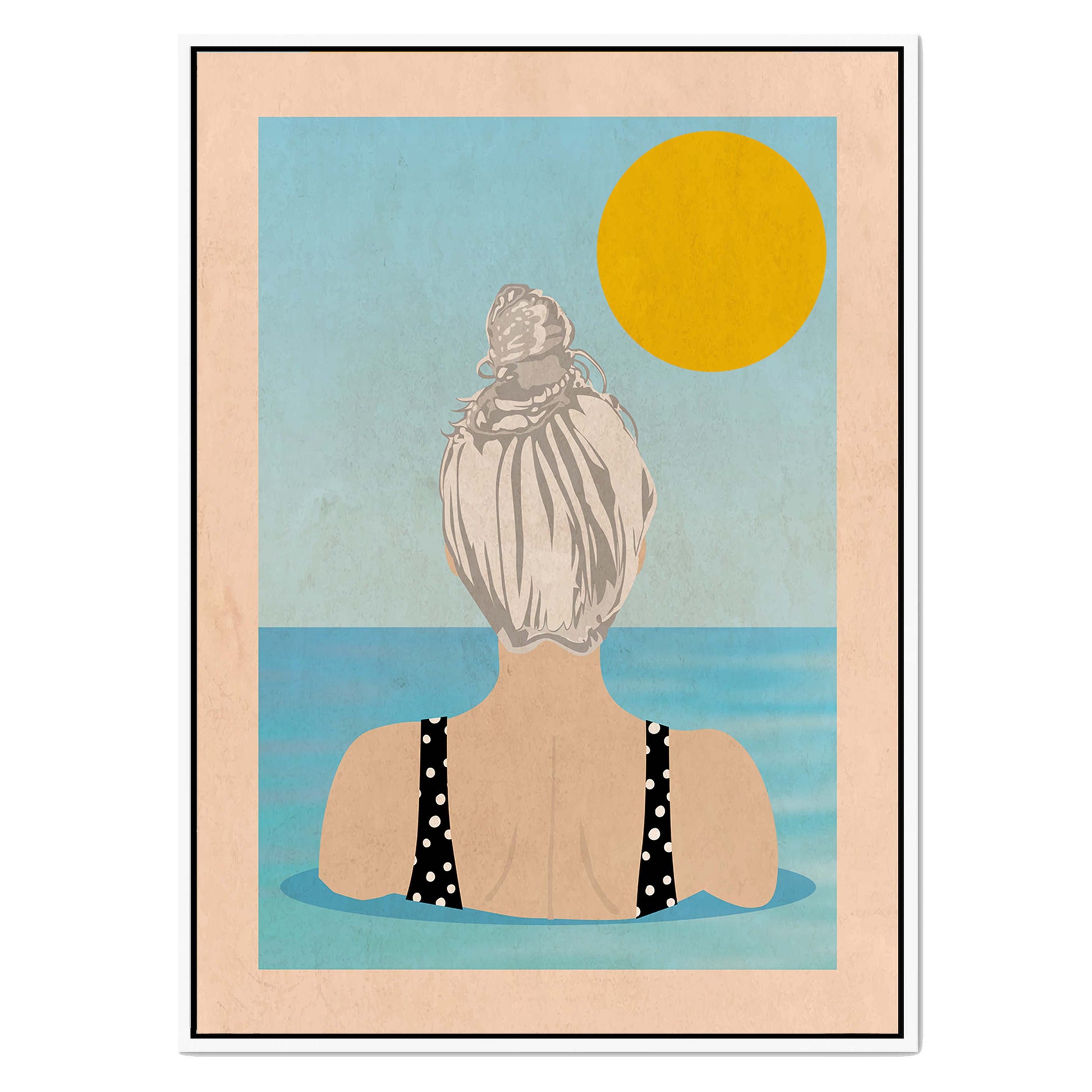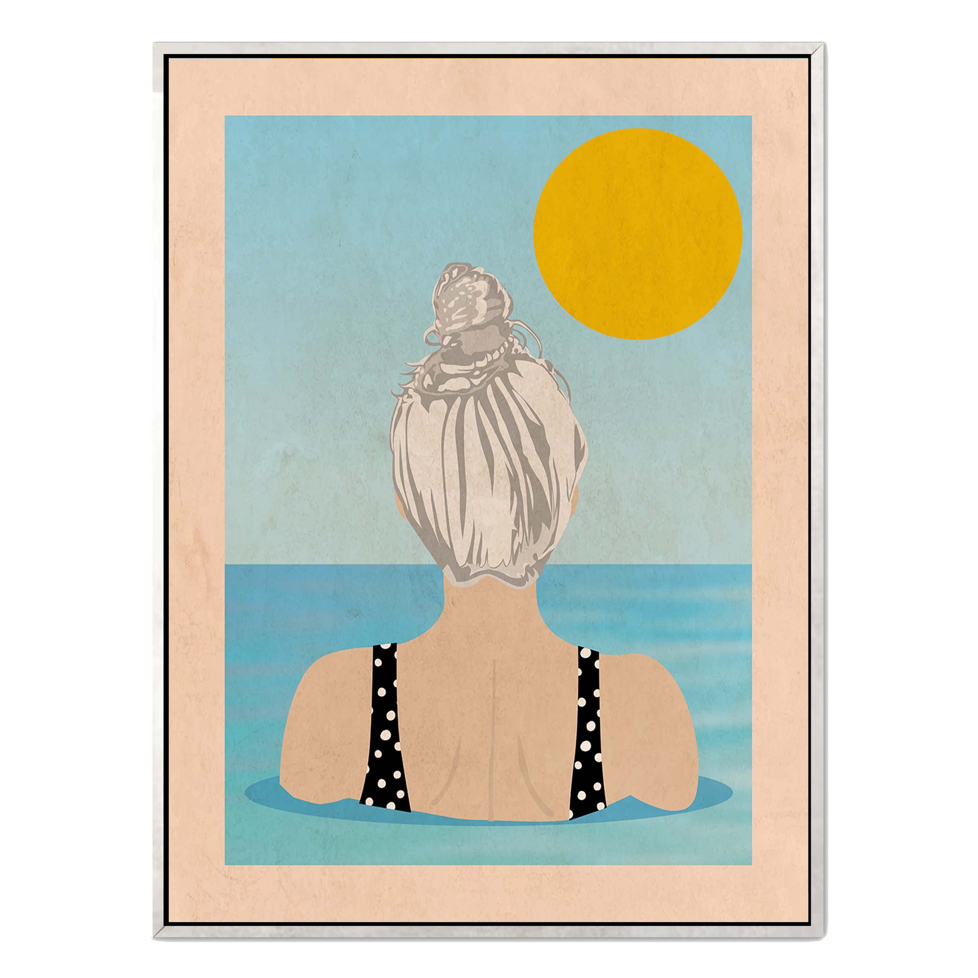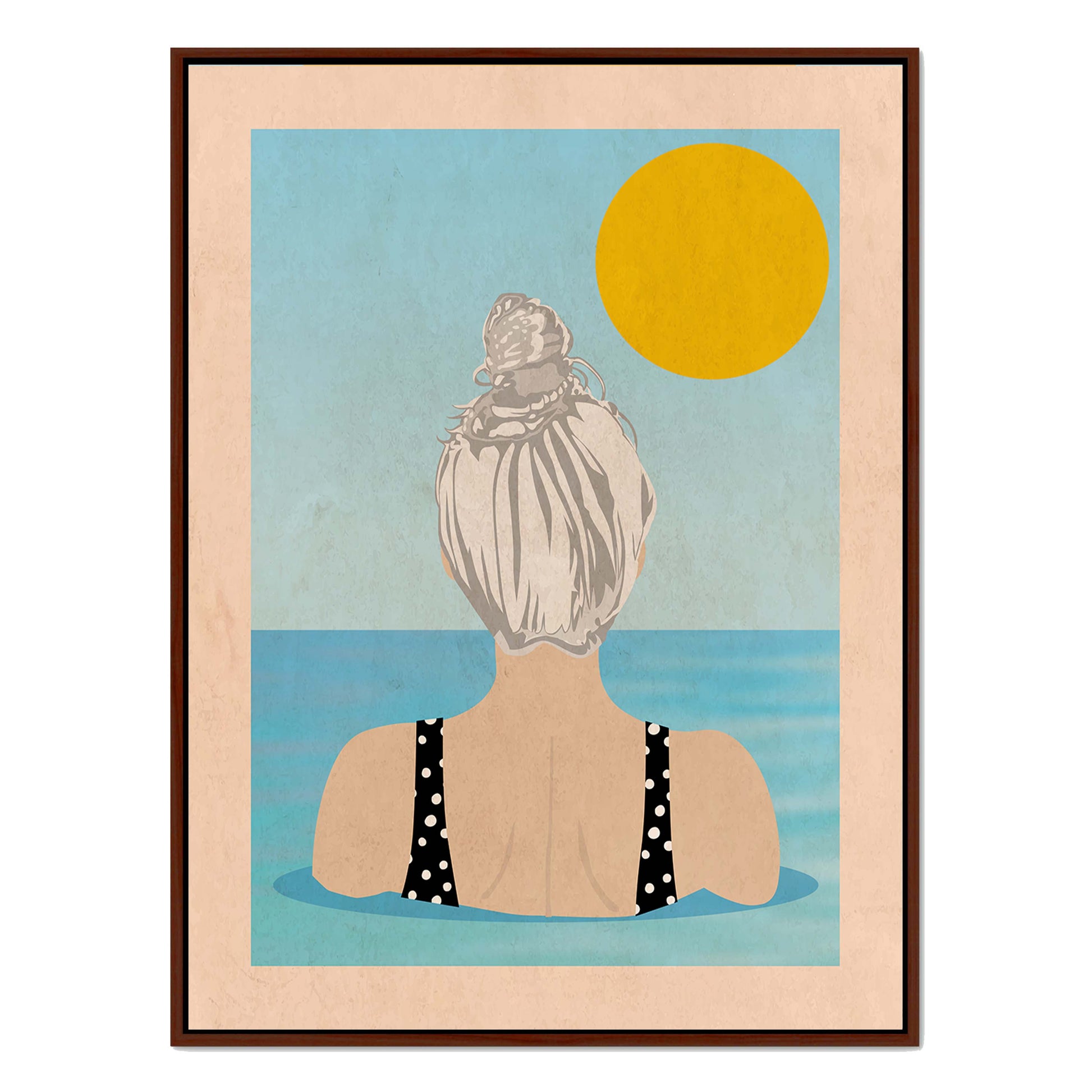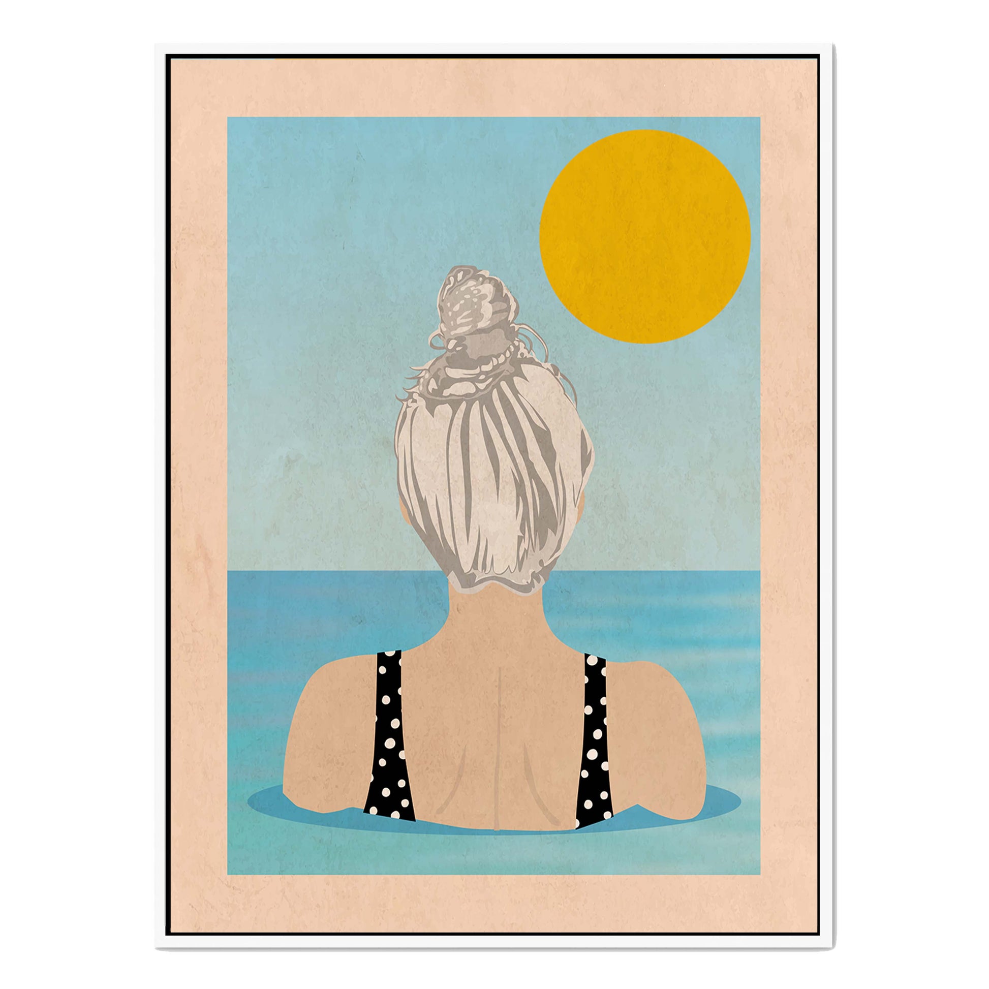 Vintage-style canvas print of a woman with a bun relaxing in the water under a bright yellow sun. A serene, minimalist piece perfect for swimmers, beach lovers, and peaceful home decor.