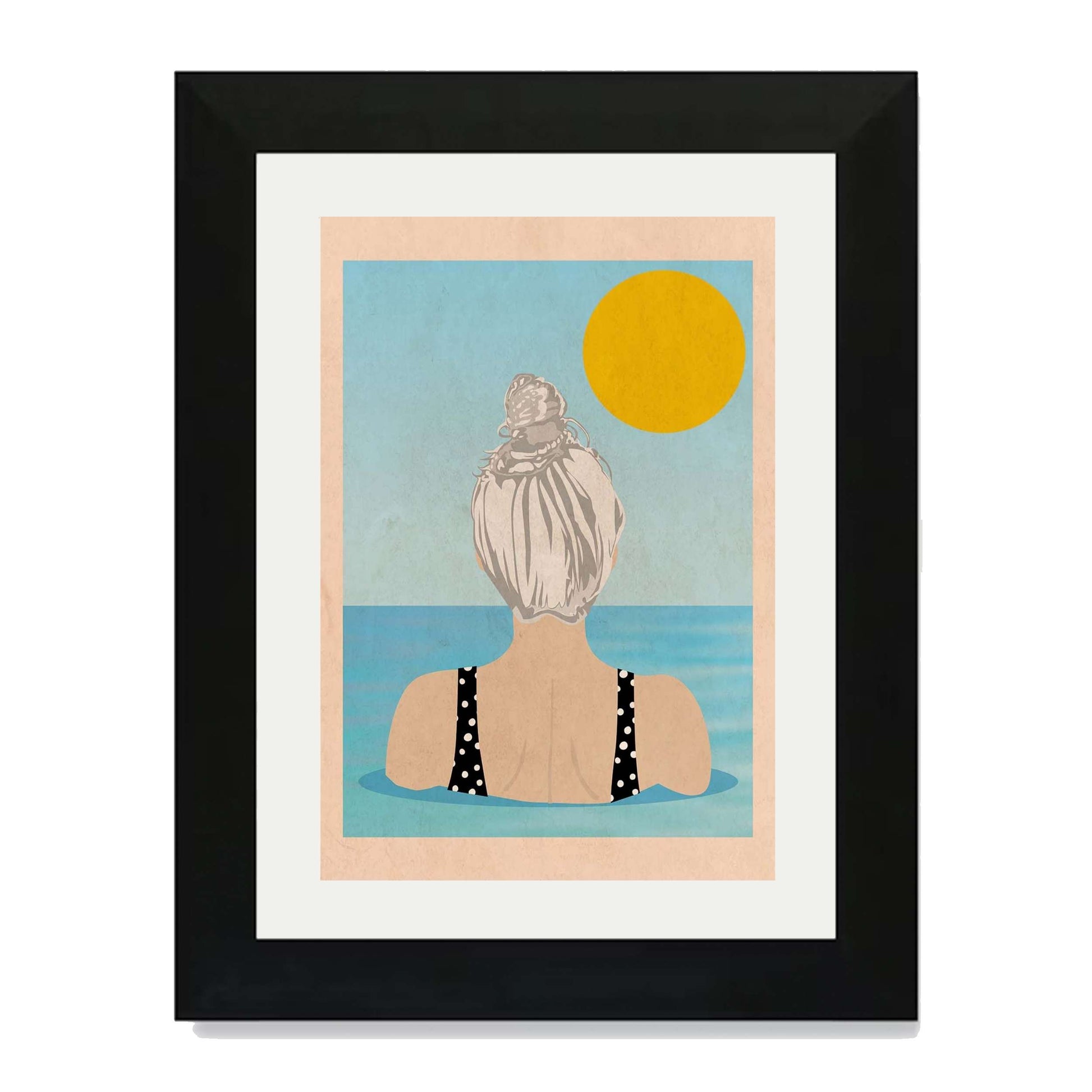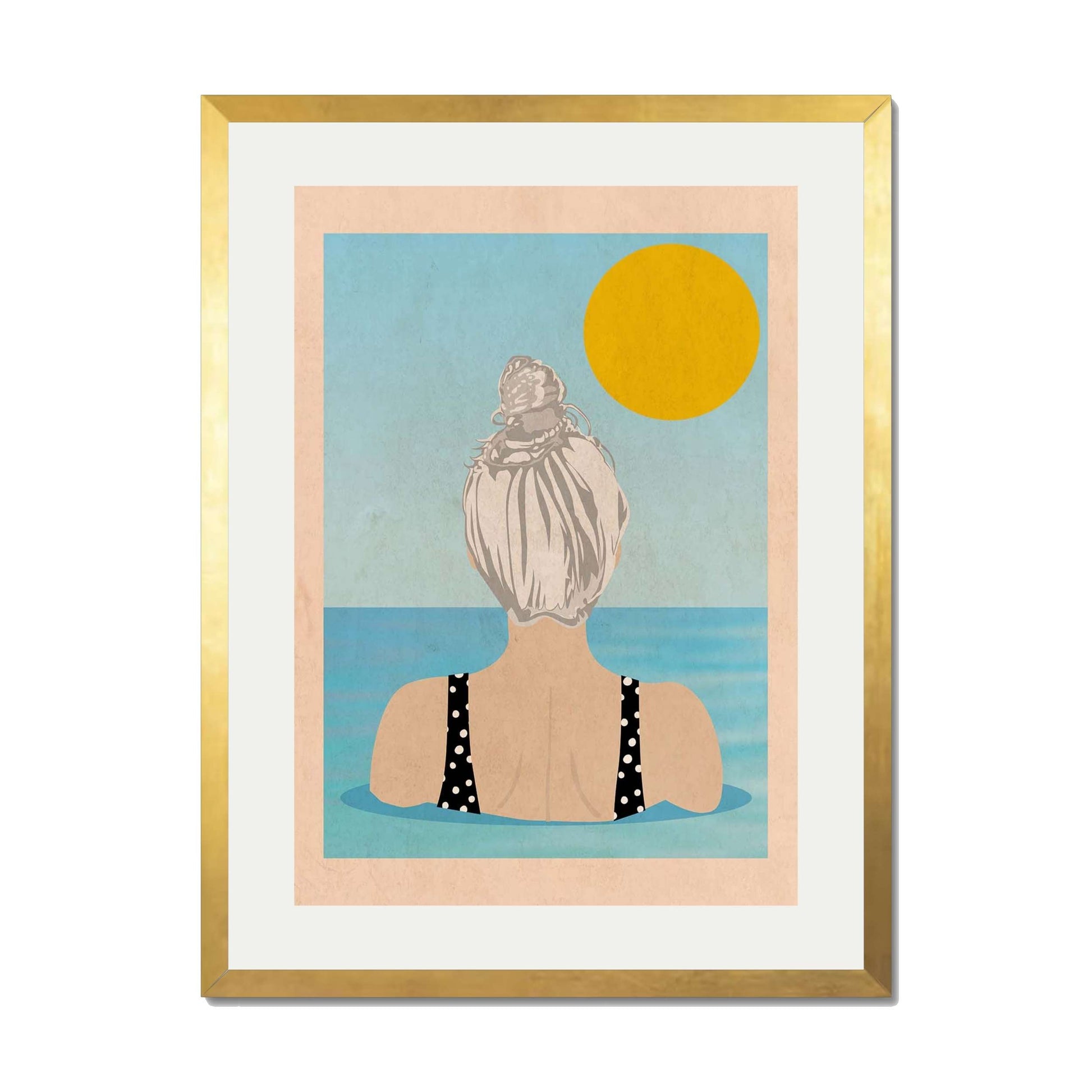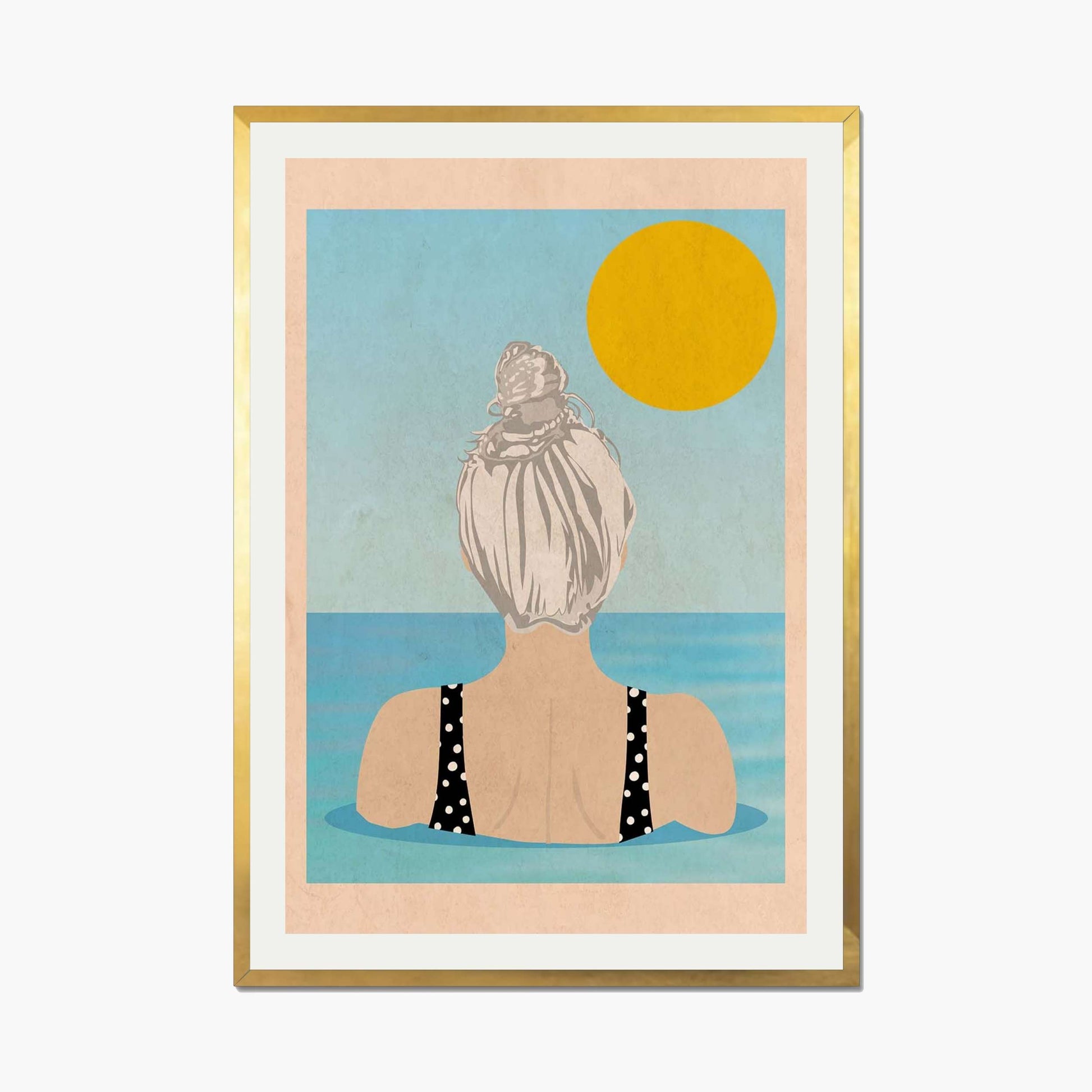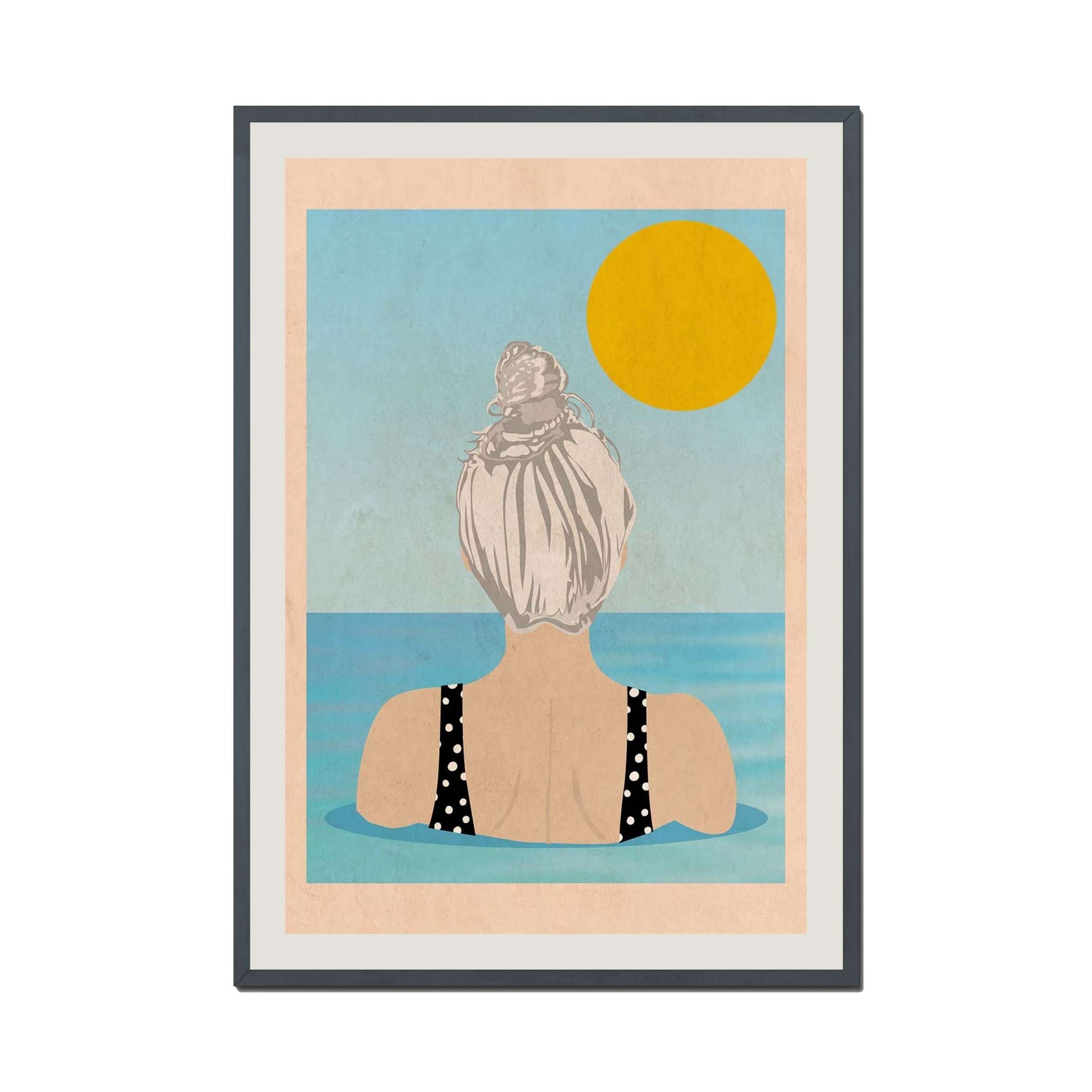 INTO THE SUNNY WATER I GO is a retro-style art print featuring a serene woman in polka dots relaxing in sunlit blue water beneath a golden sun, perfect for adding nostalgic, tranquil charm to any space.