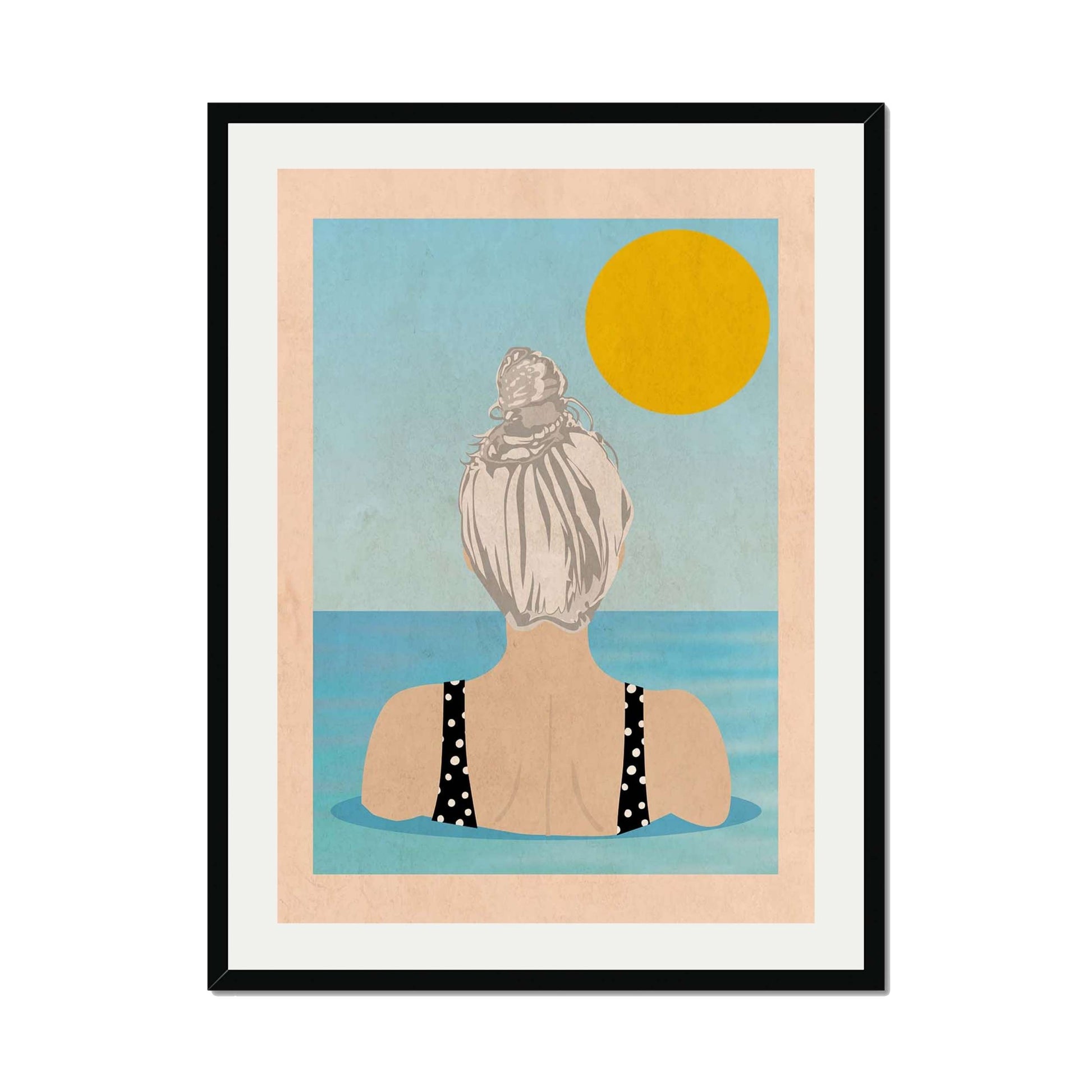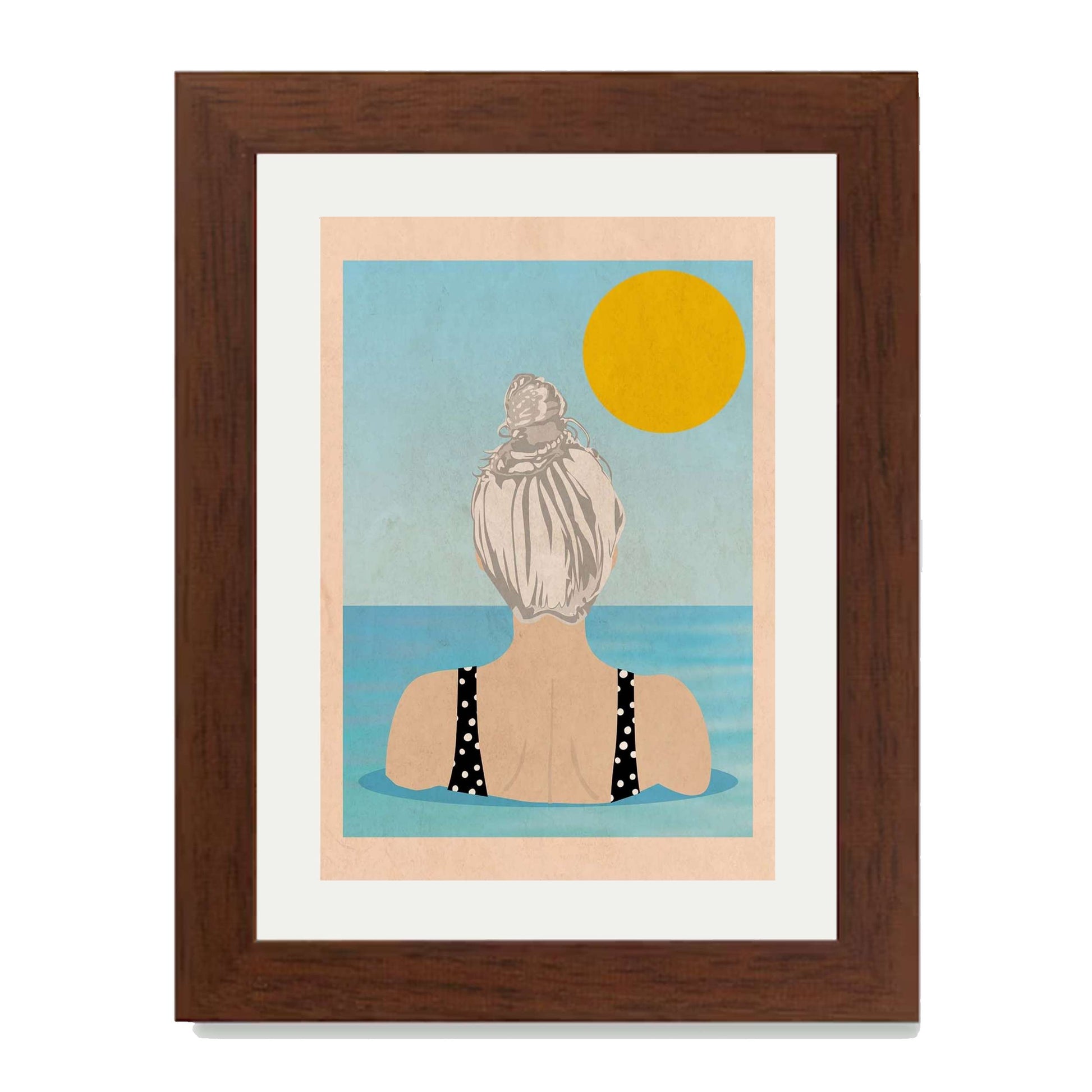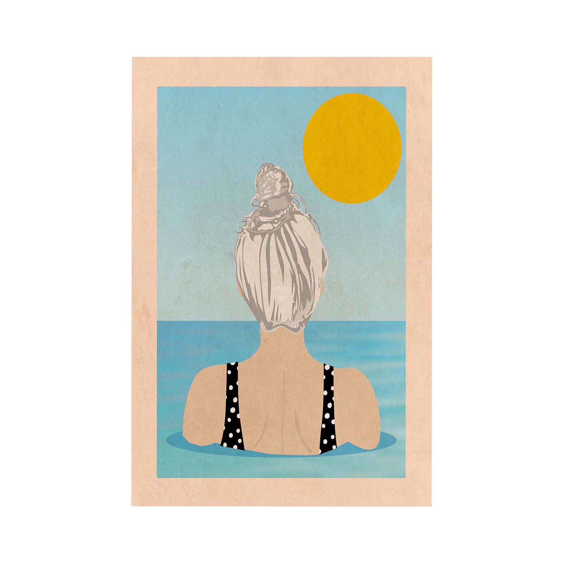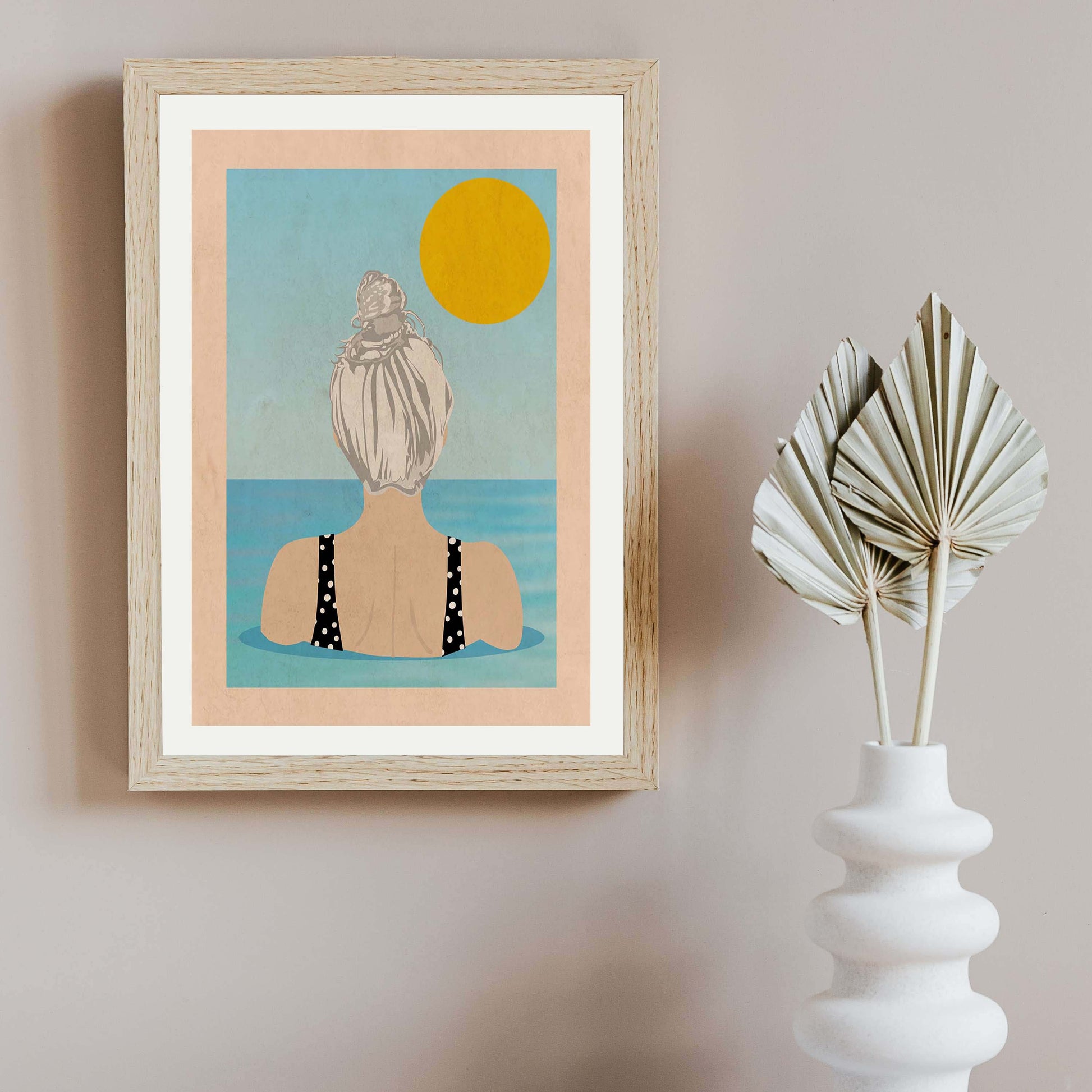 INTO THE SUNNY WATER I GO is a retro-style art print featuring a serene woman in polka dots relaxing in sunlit blue water beneath a golden sun, perfect for adding nostalgic, tranquil charm to any space.