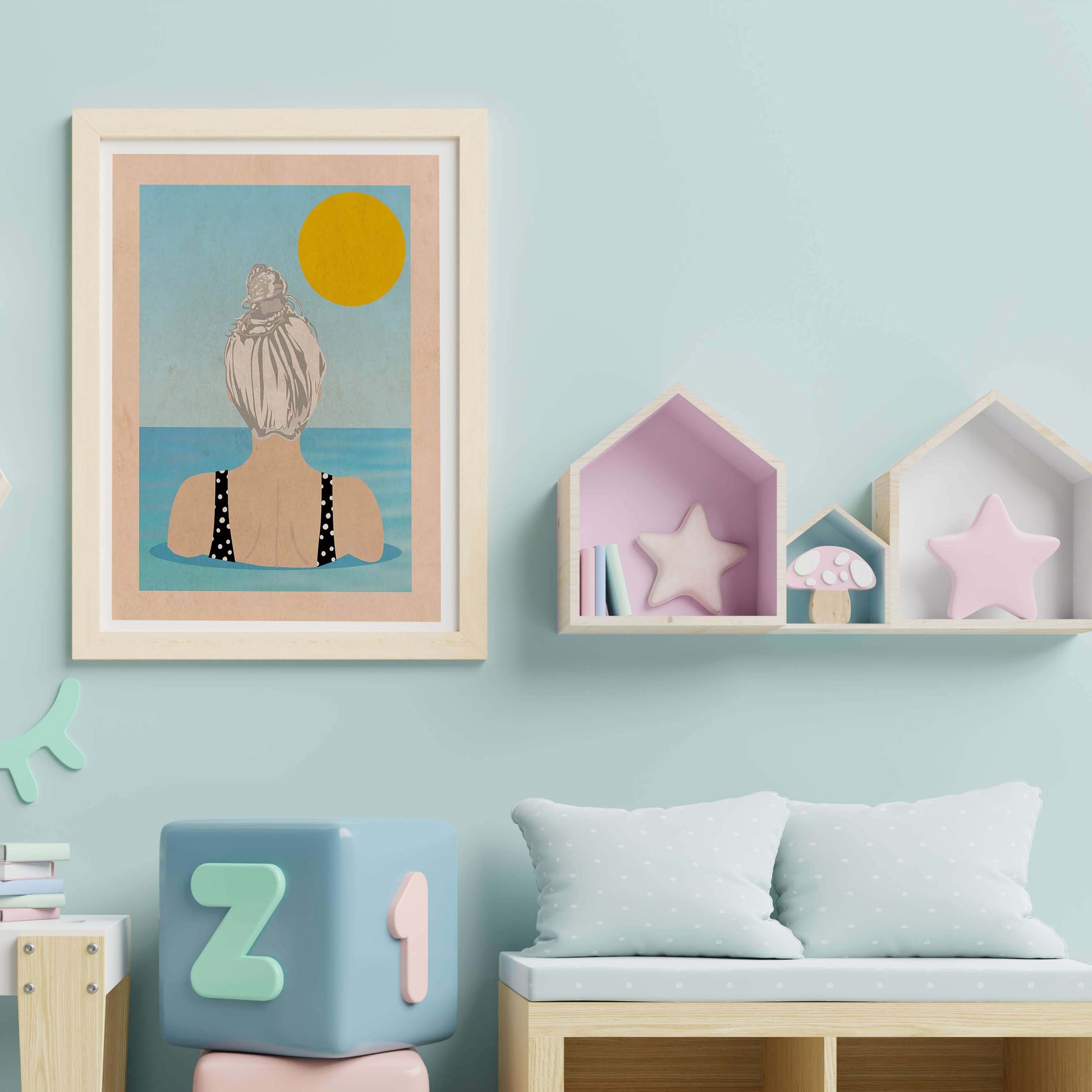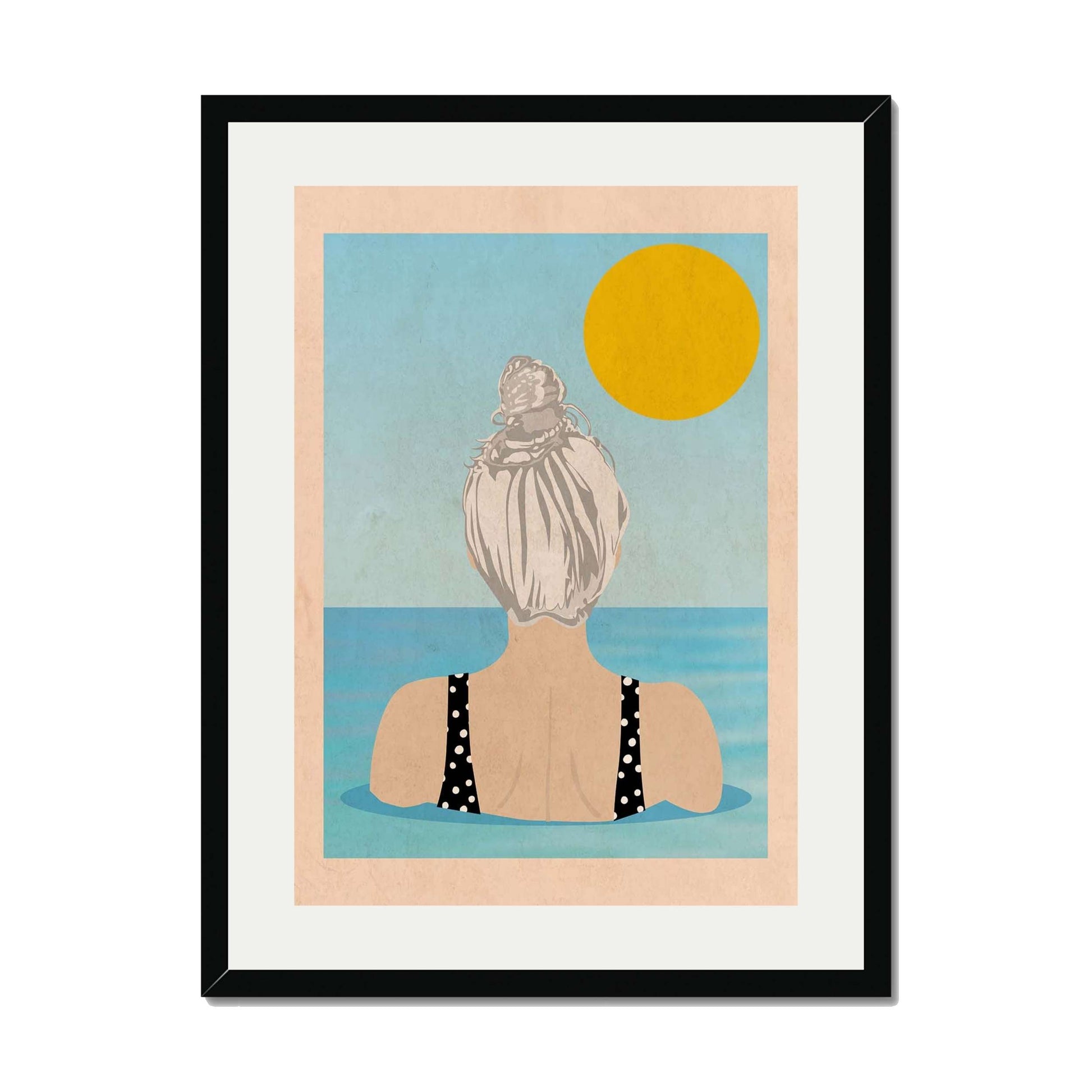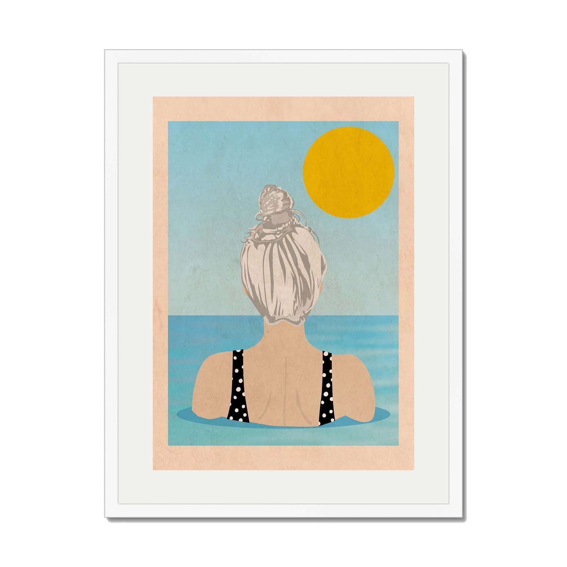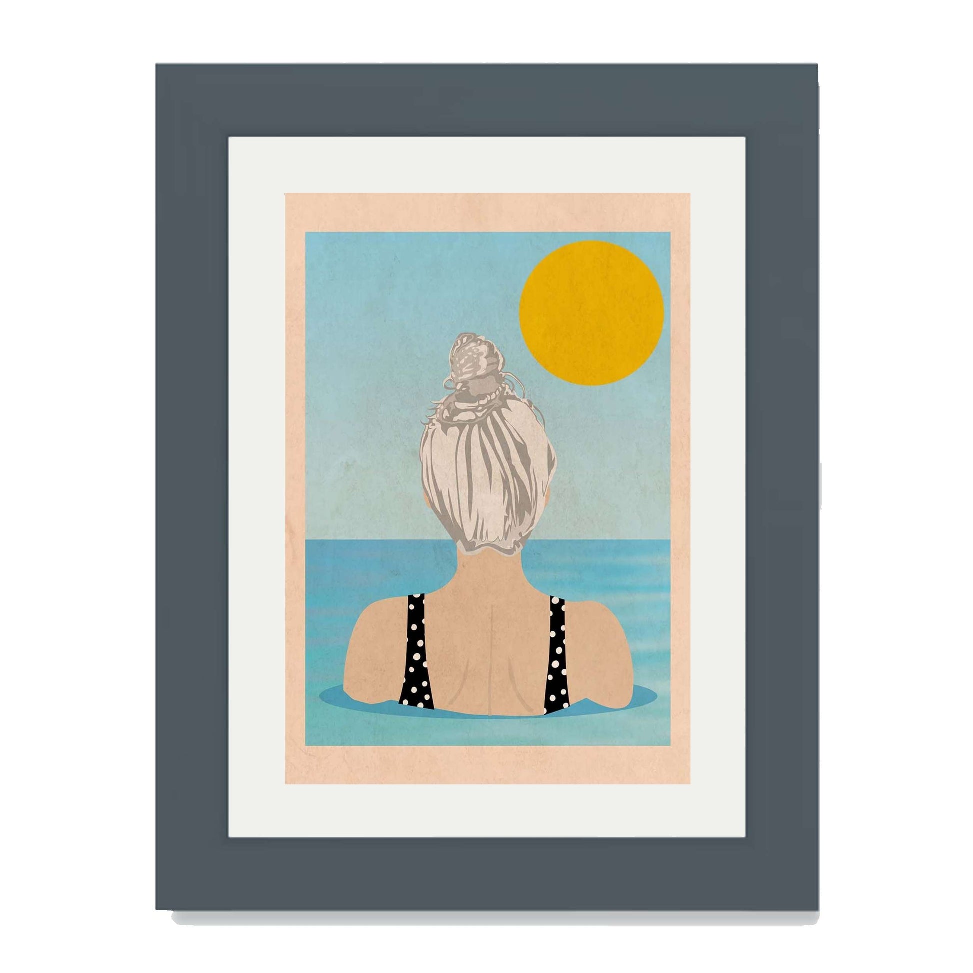 INTO THE SUNNY WATER I GO is a retro-style art print featuring a serene woman in polka dots relaxing in sunlit blue water beneath a golden sun, perfect for adding nostalgic, tranquil charm to any space.