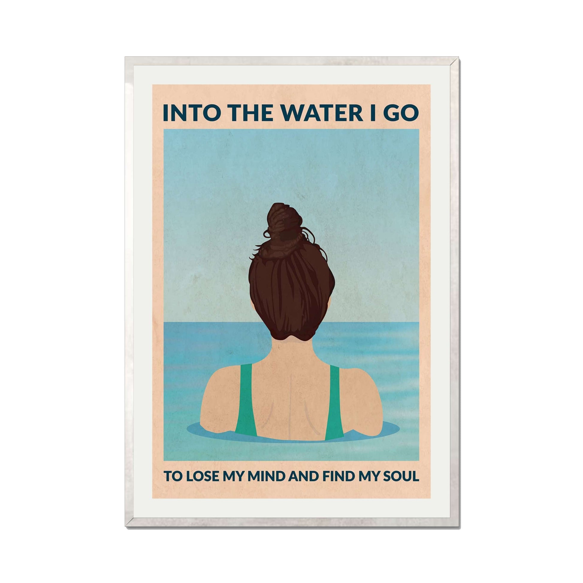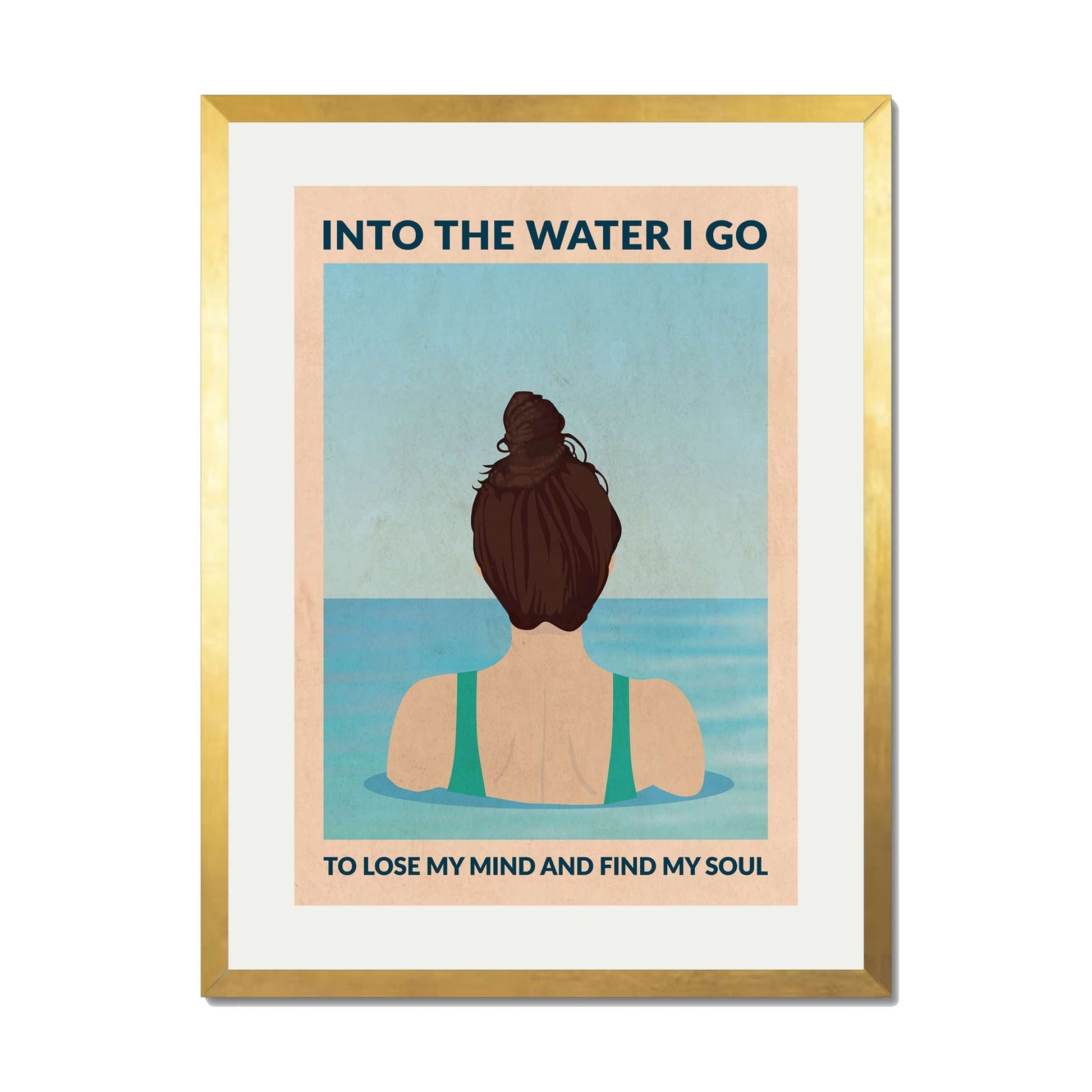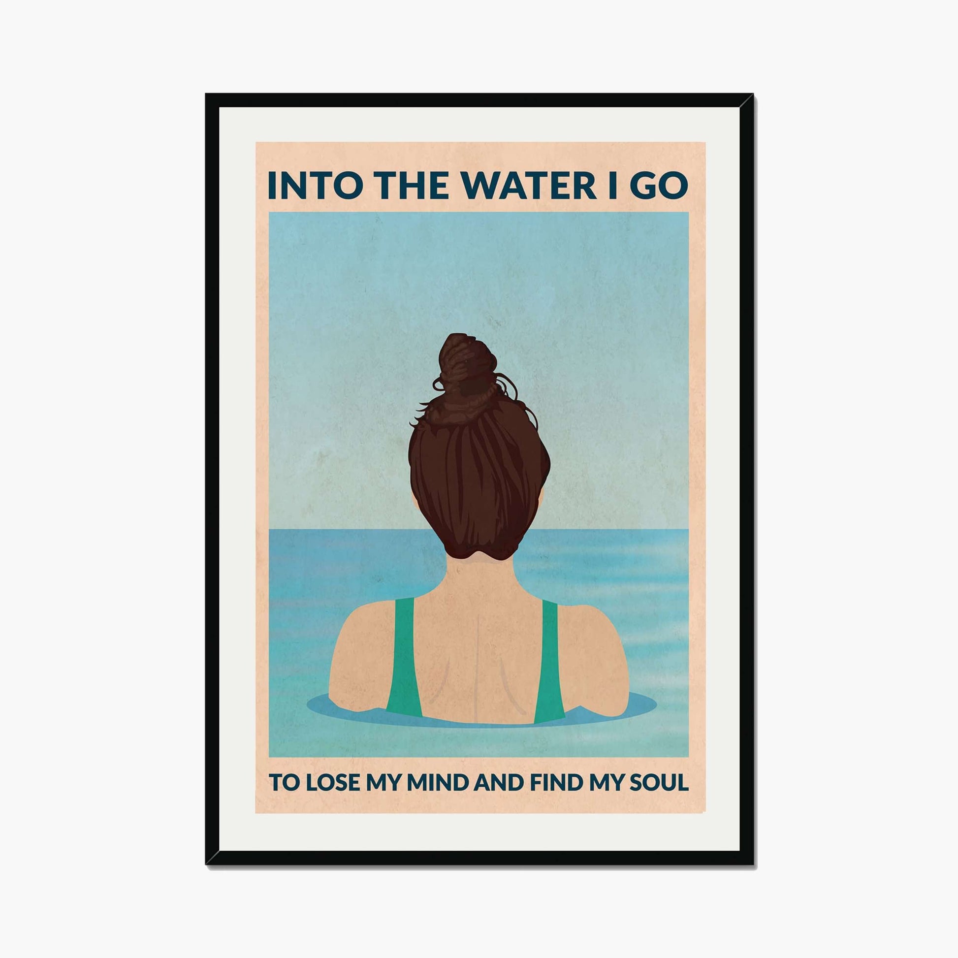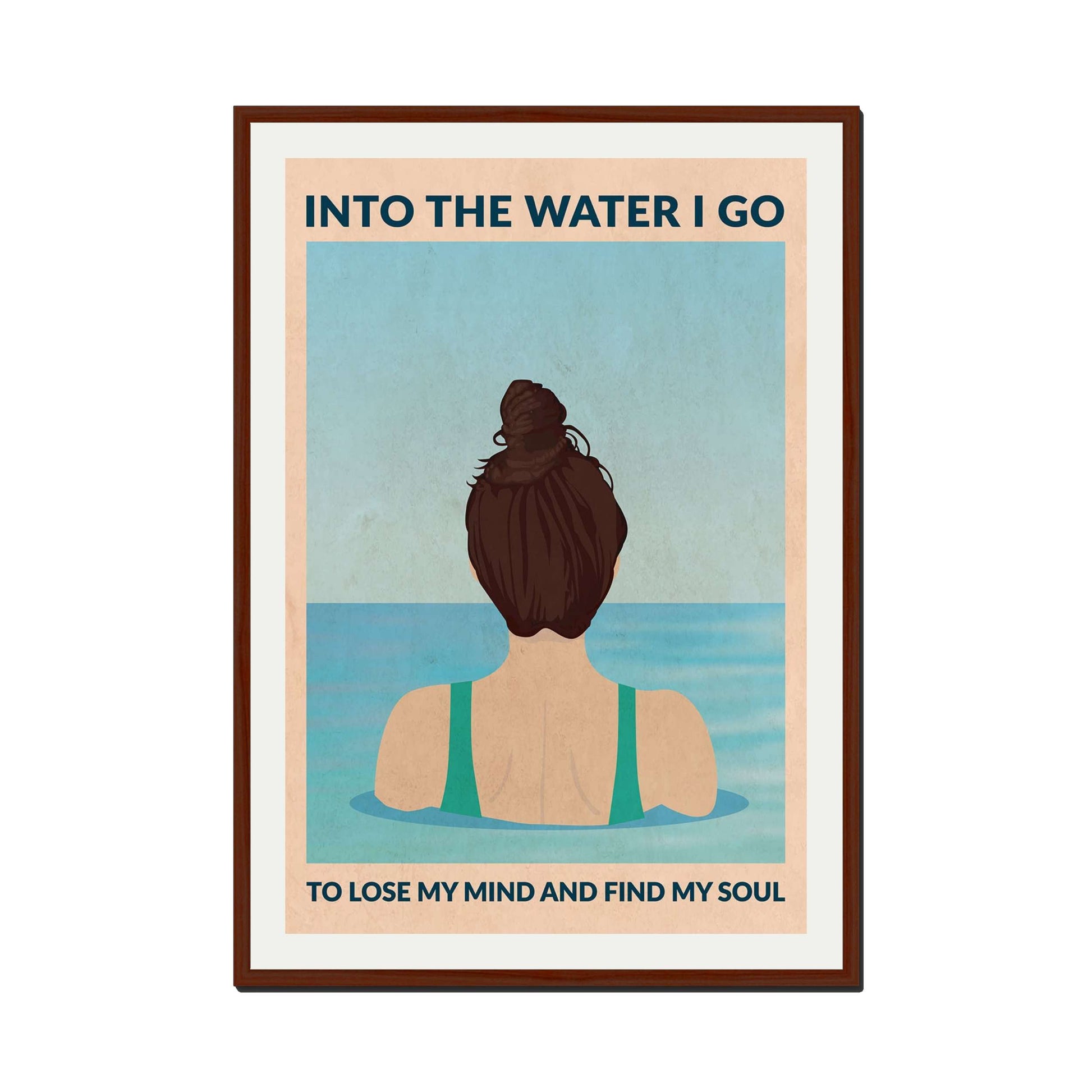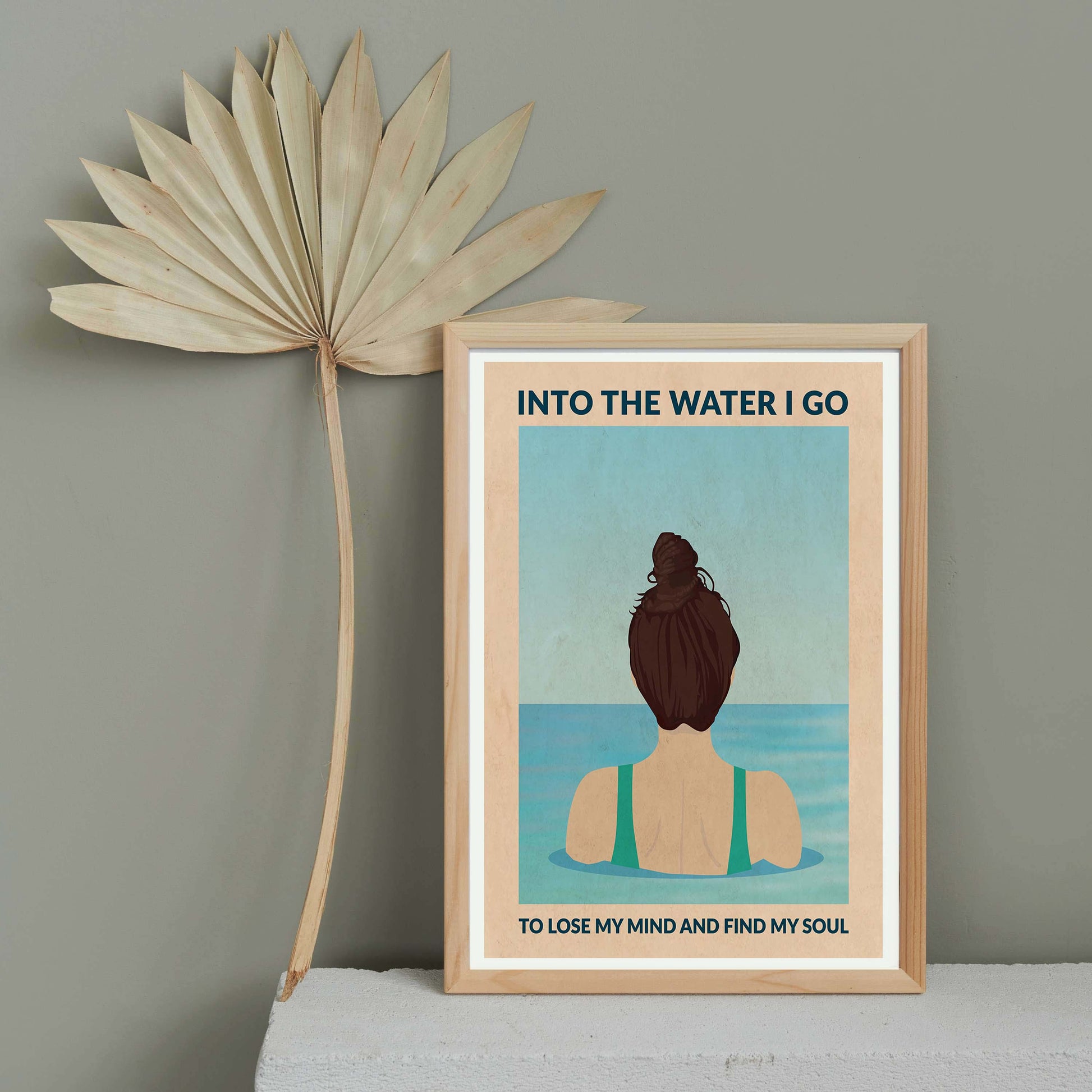 INTO THE WATER I GO is a vintage-style art print of a serene woman relaxing in calm blue water, framed by an inspiring quote, perfect for adding peaceful, nostalgic coastal charm to any space.