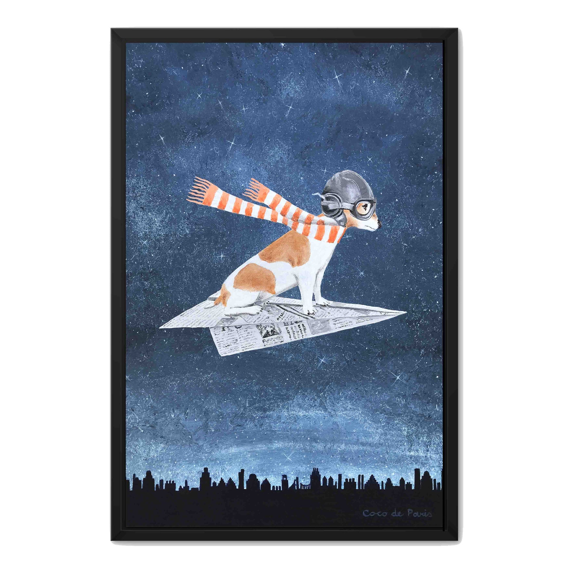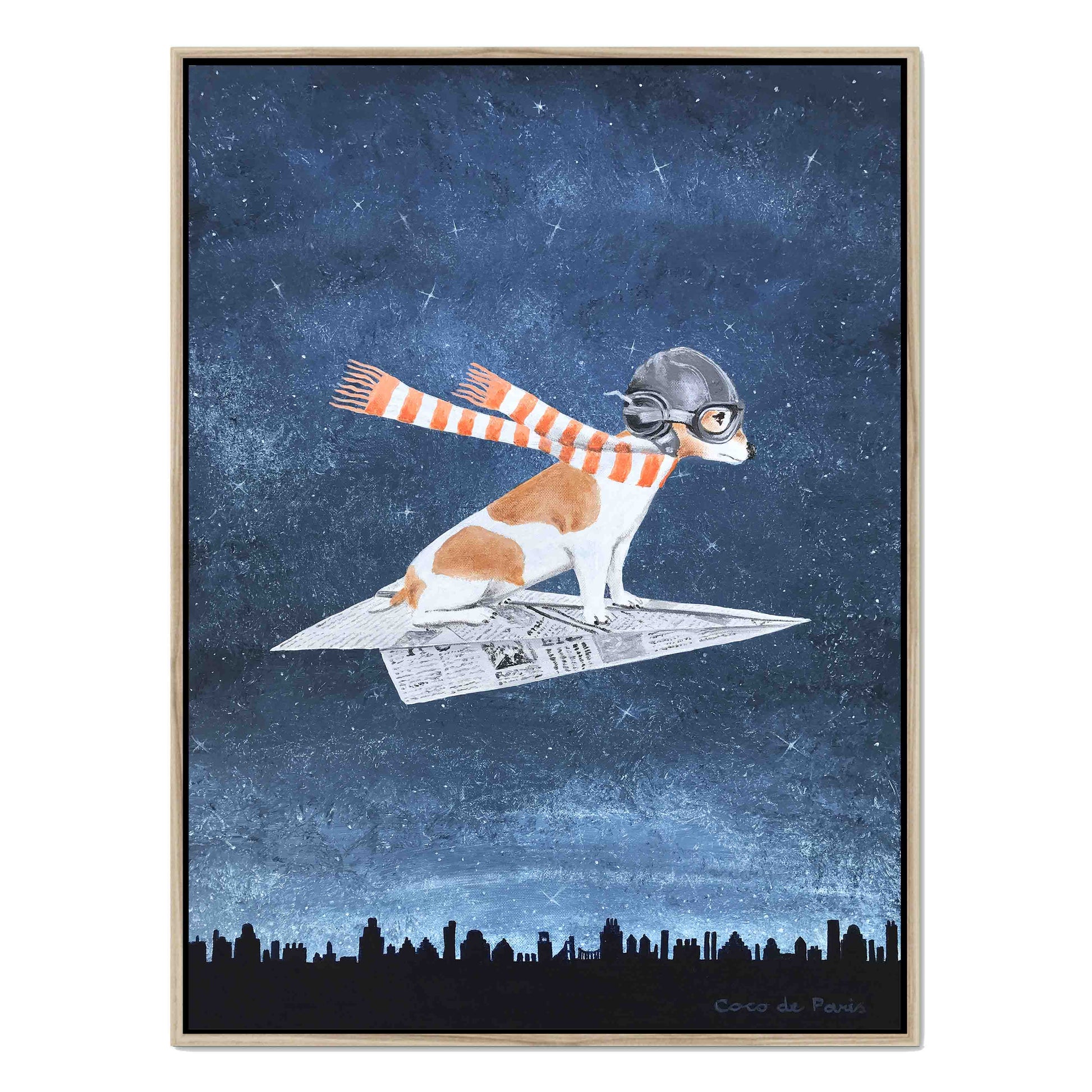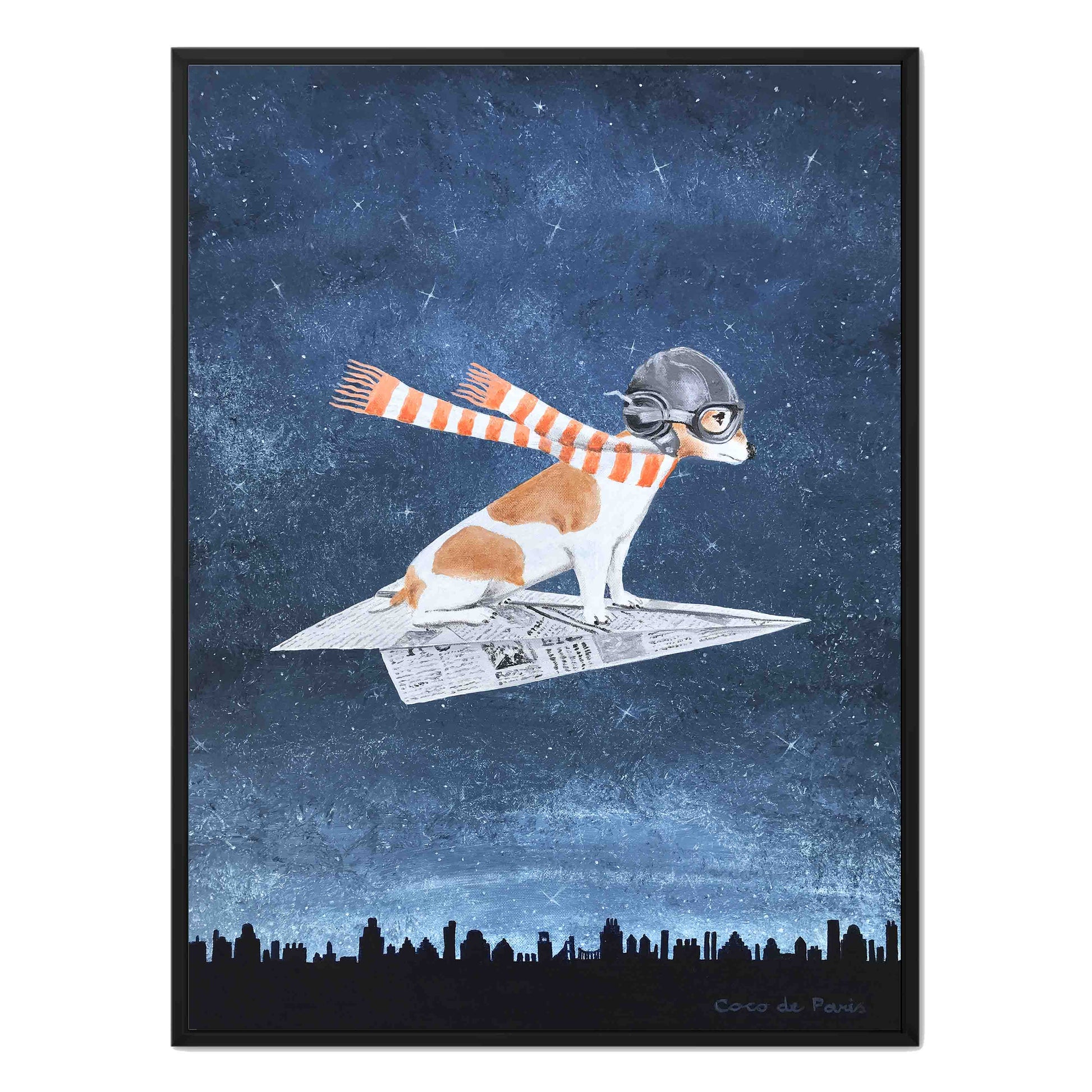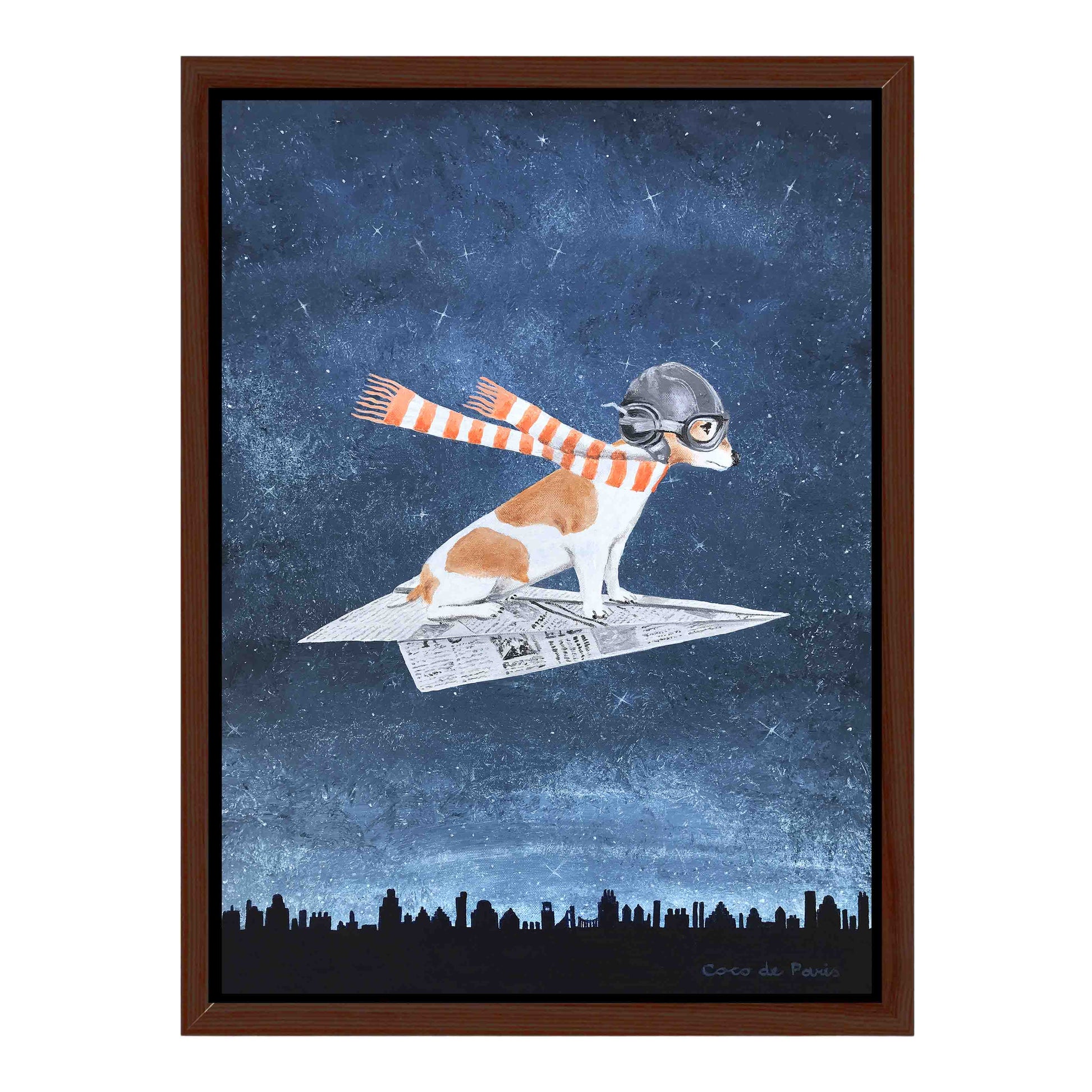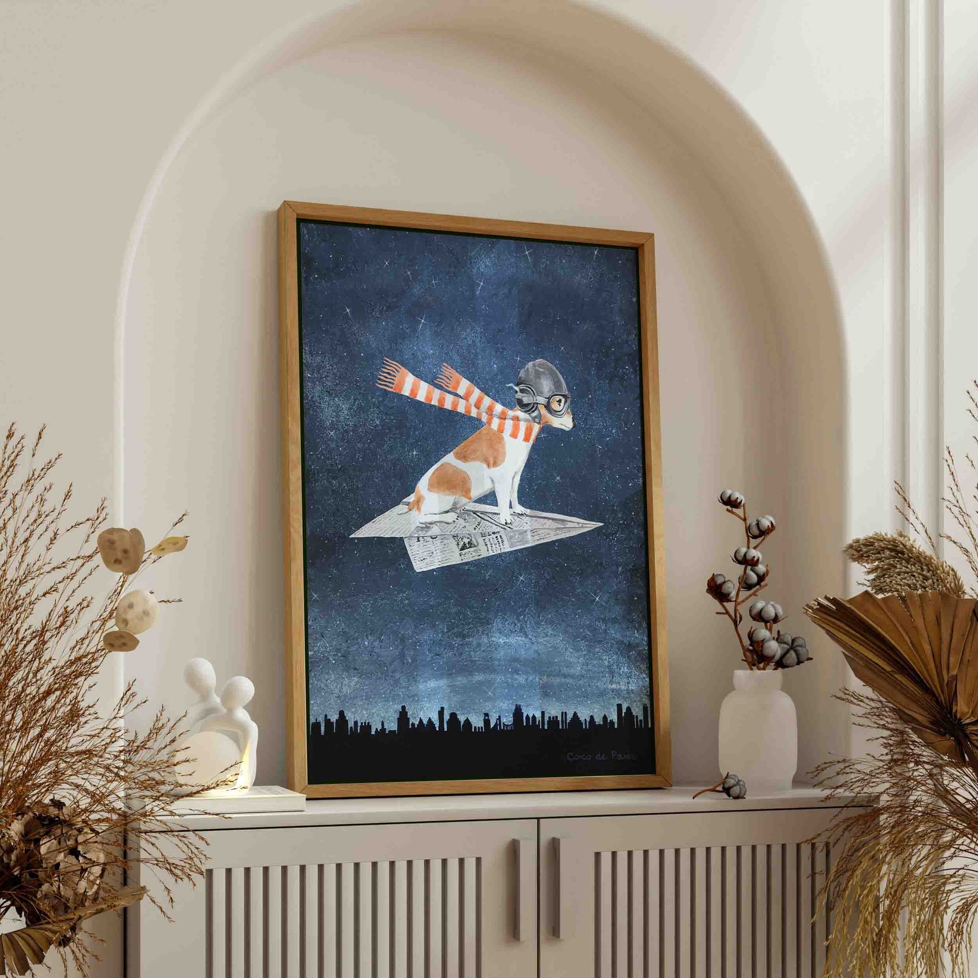 Whimsical canvas print of a Jack Russell Terrier in a flight helmet and scarf, flying on a paper airplane through a starry night sky. Playful and imaginative wall art for dog lovers and dreamers.