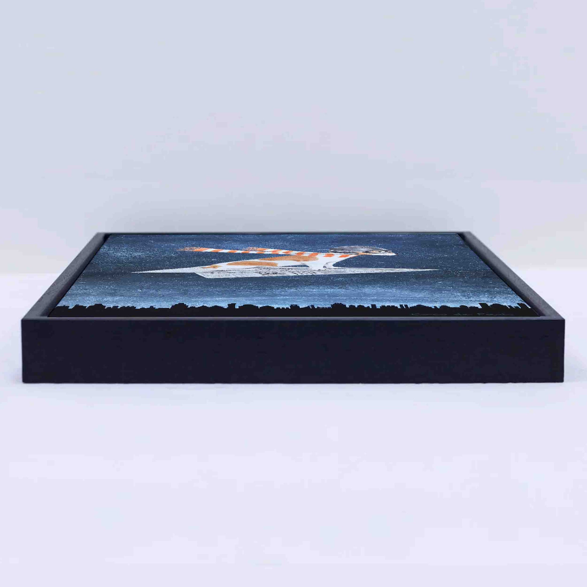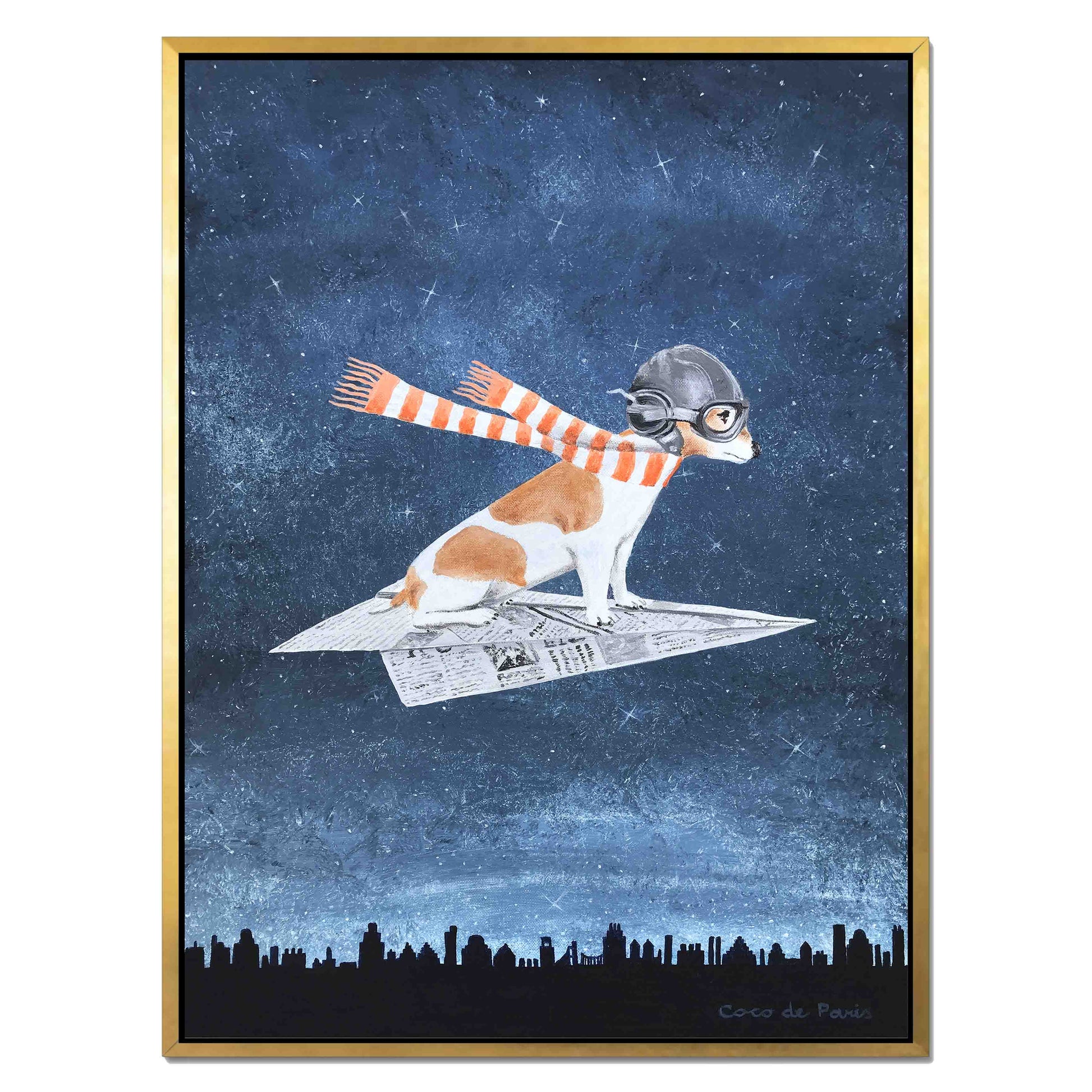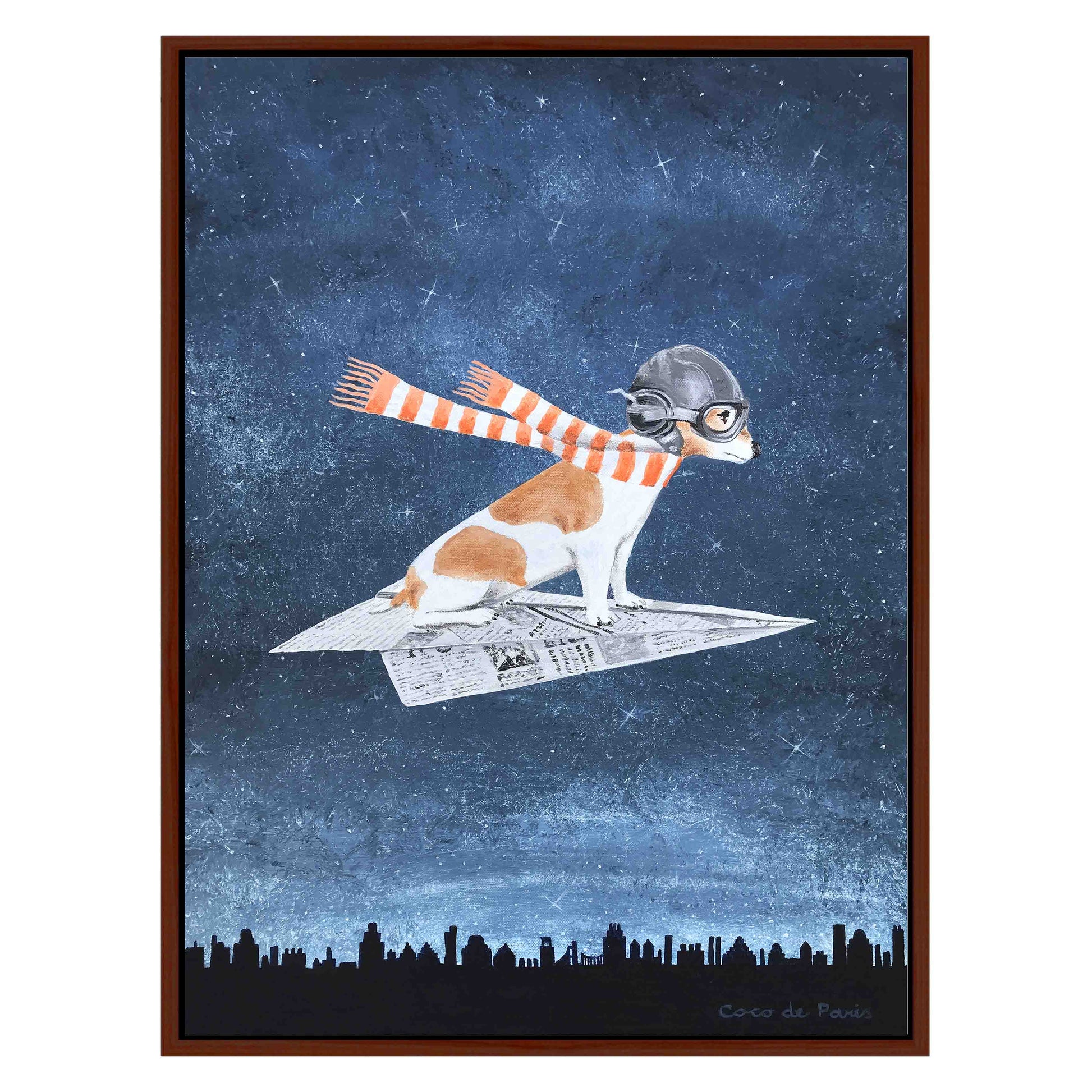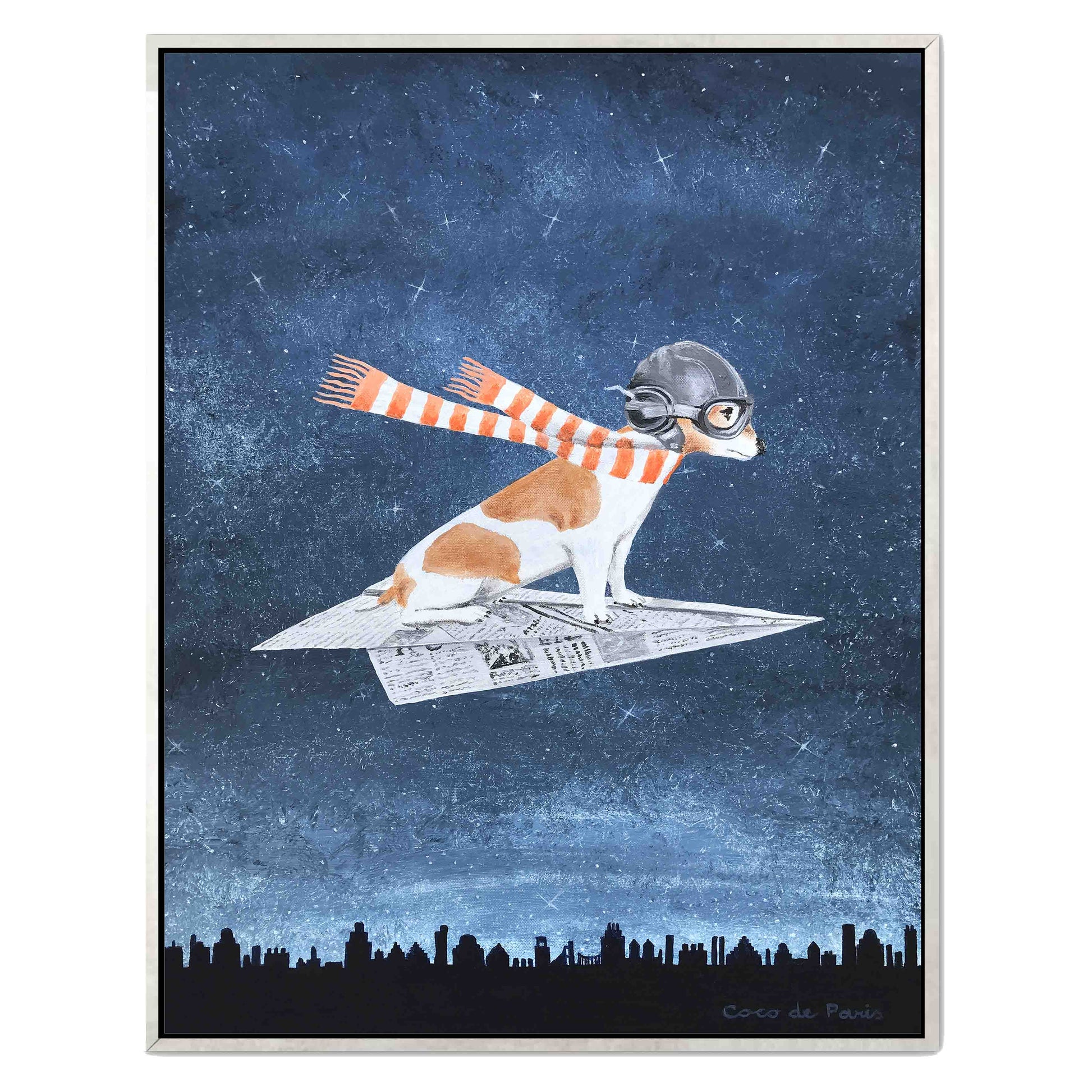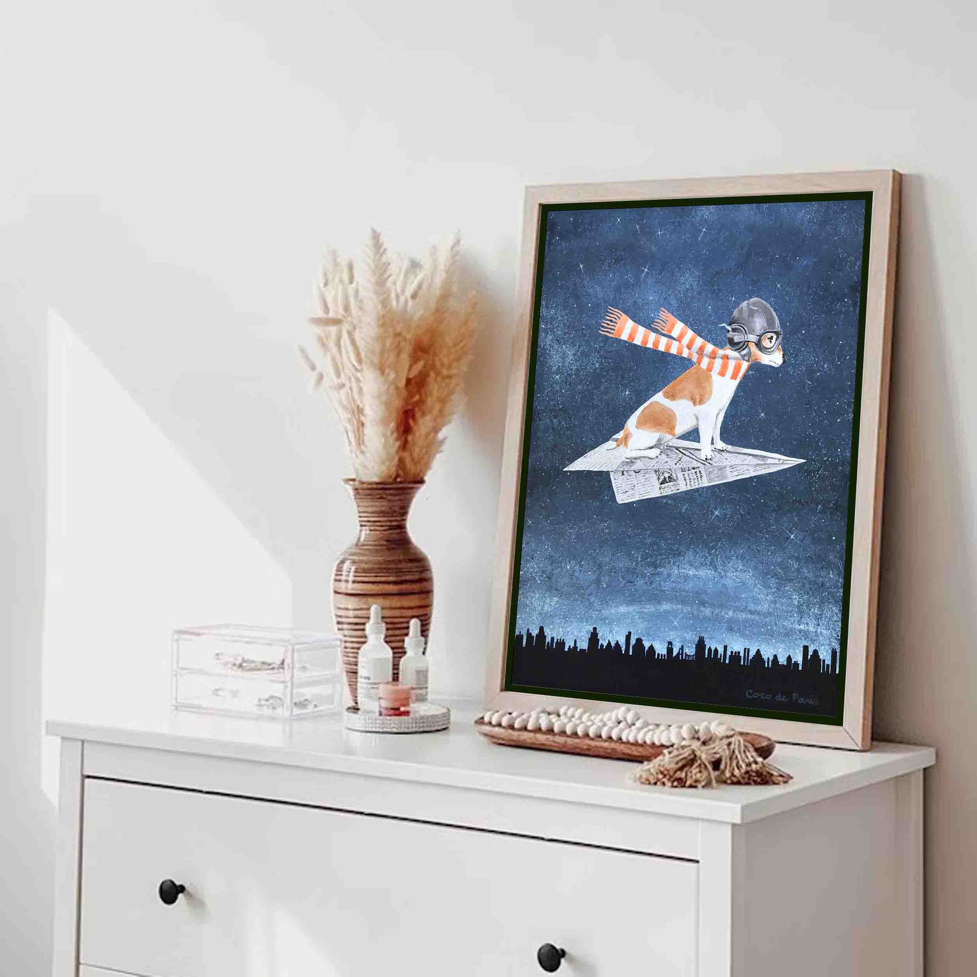Whimsical canvas print of a Jack Russell Terrier in a flight helmet and scarf, flying on a paper airplane through a starry night sky. Playful and imaginative wall art for dog lovers and dreamers.