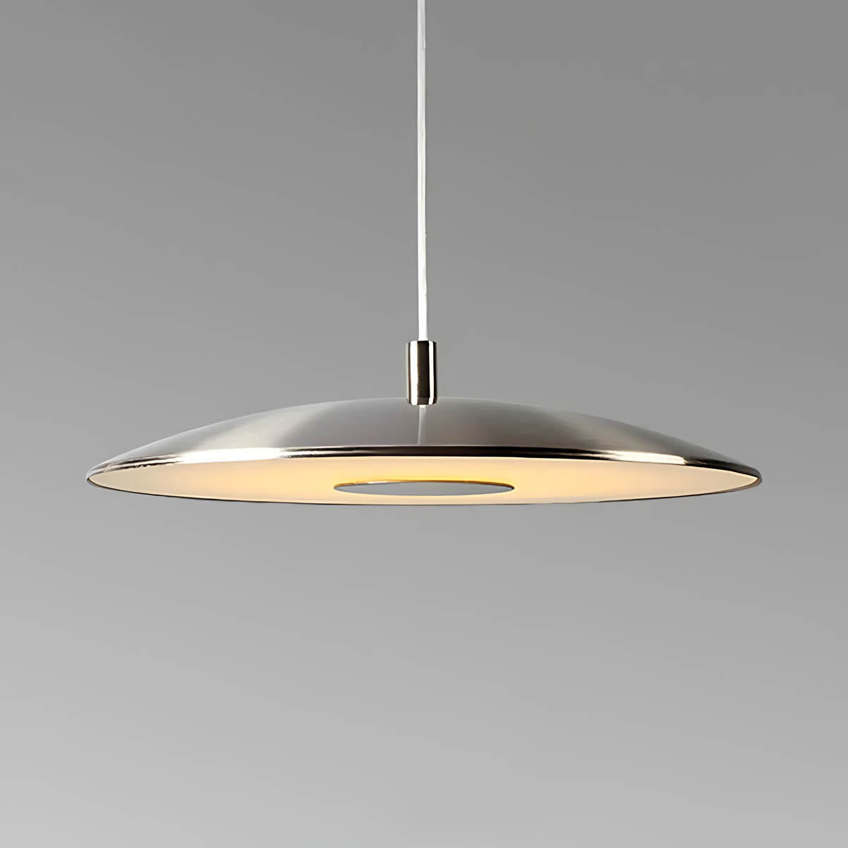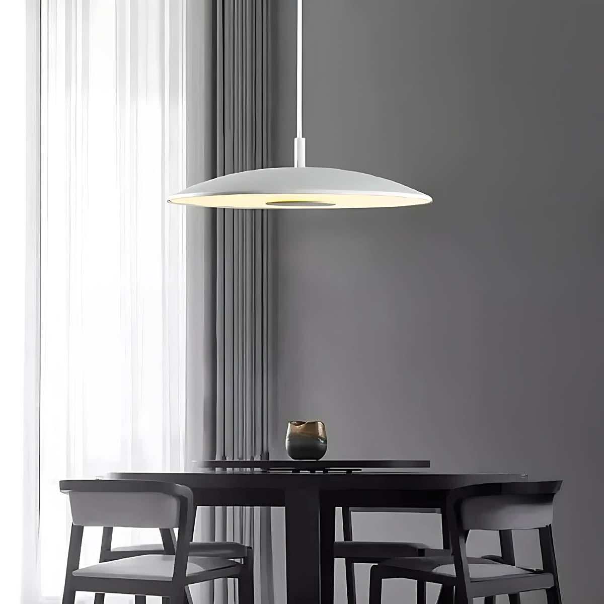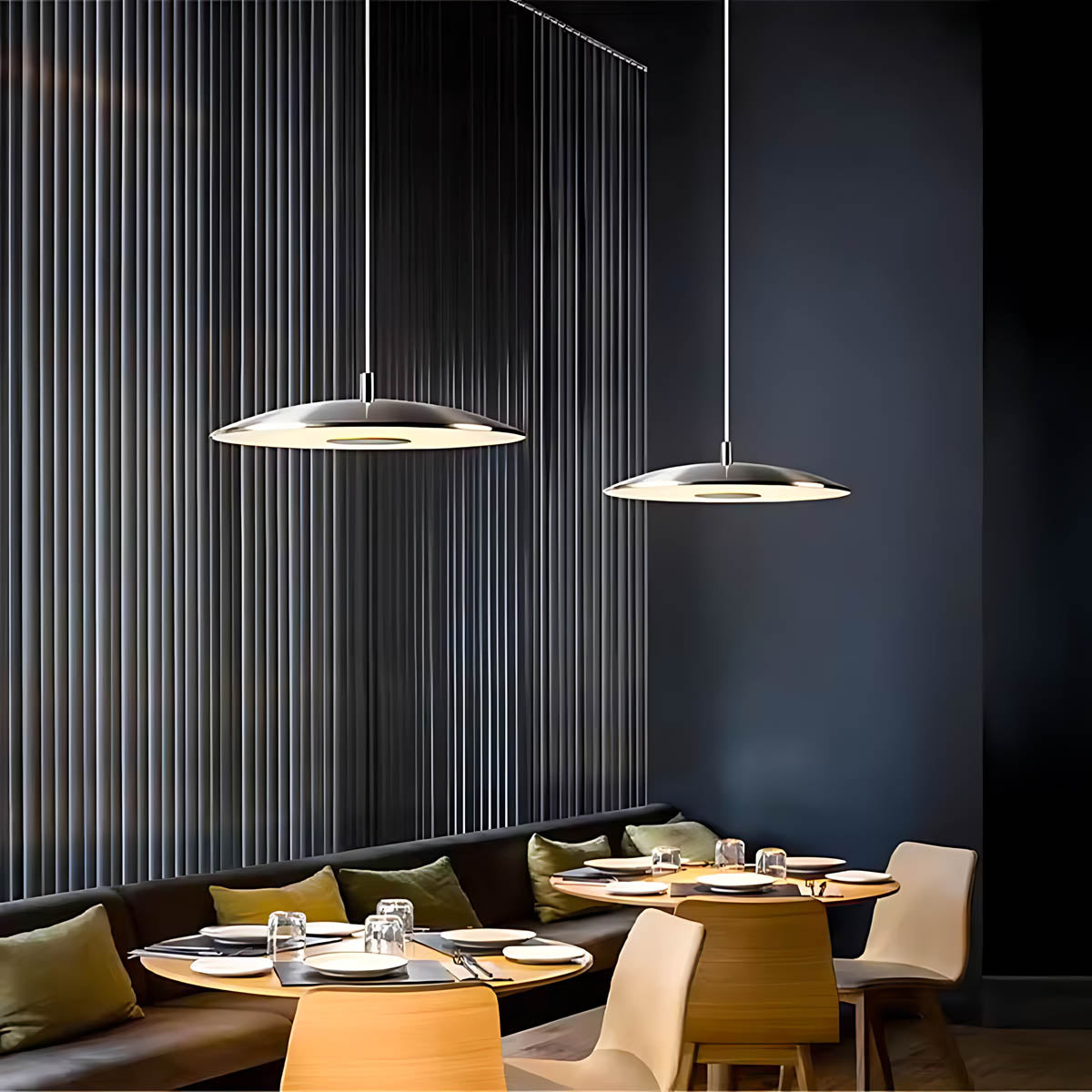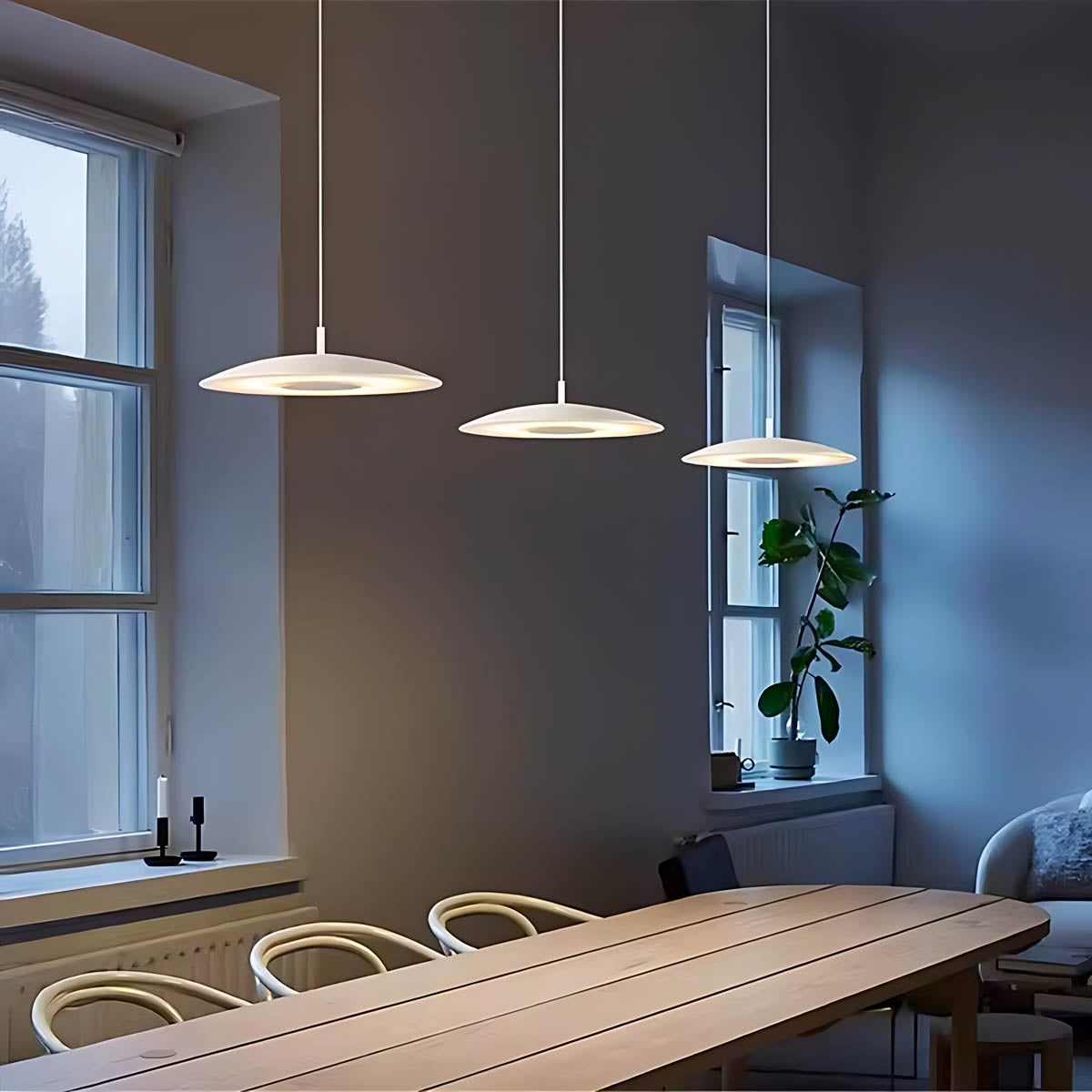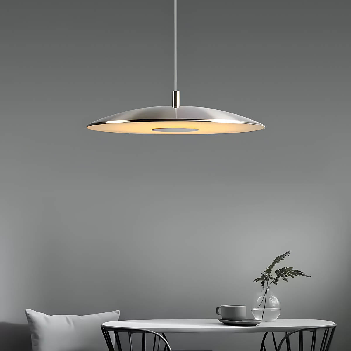 Available in polished chrome or sleek white and offered in three versatile sizes, this pendant lamp enhances dining rooms, kitchens, or lounges with its minimalist disc-shaped design.