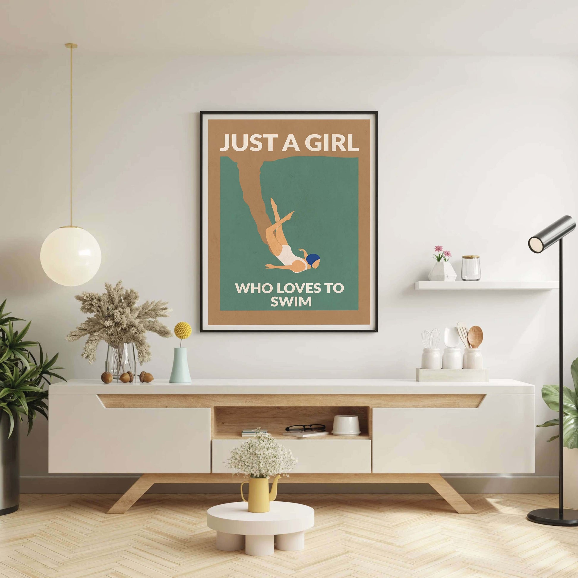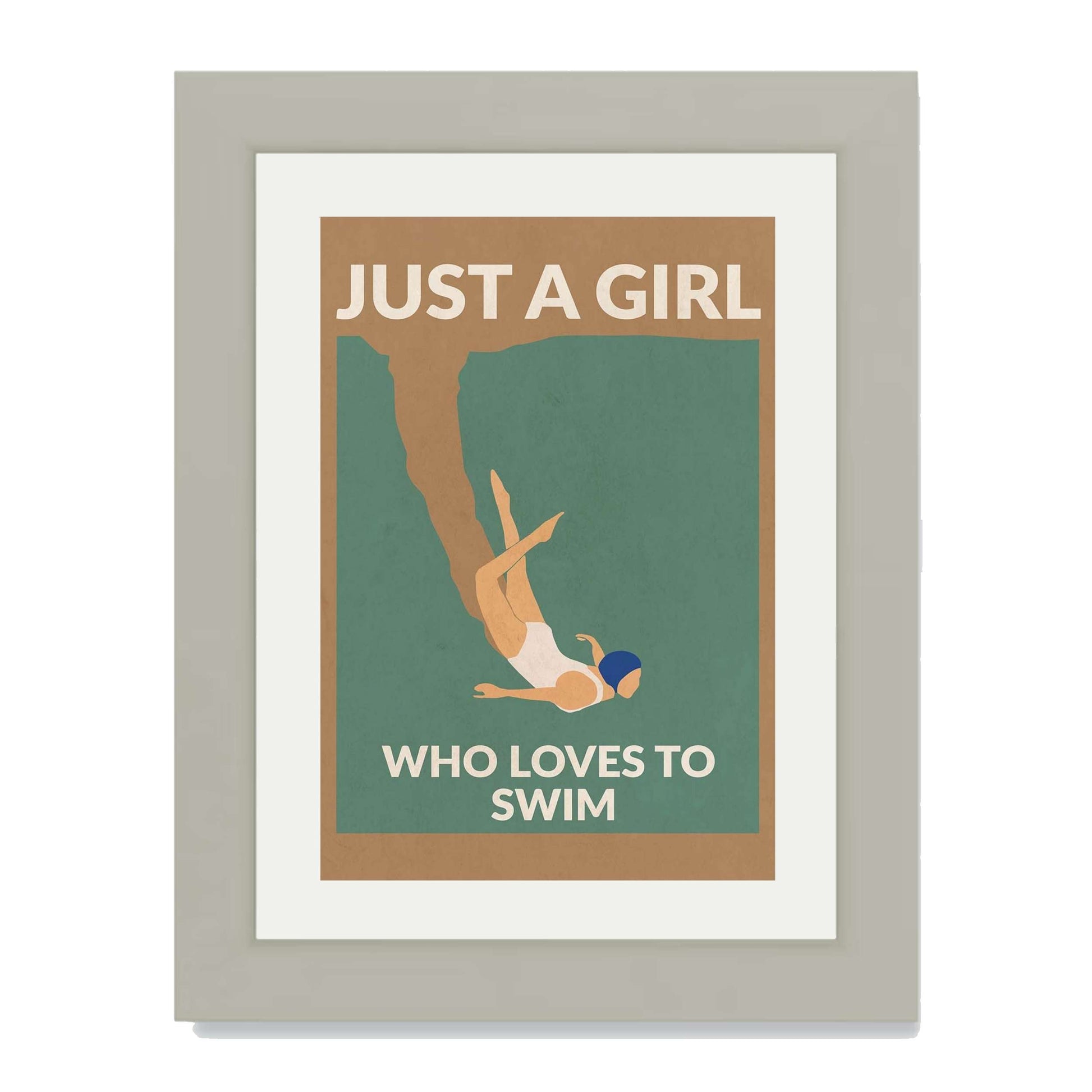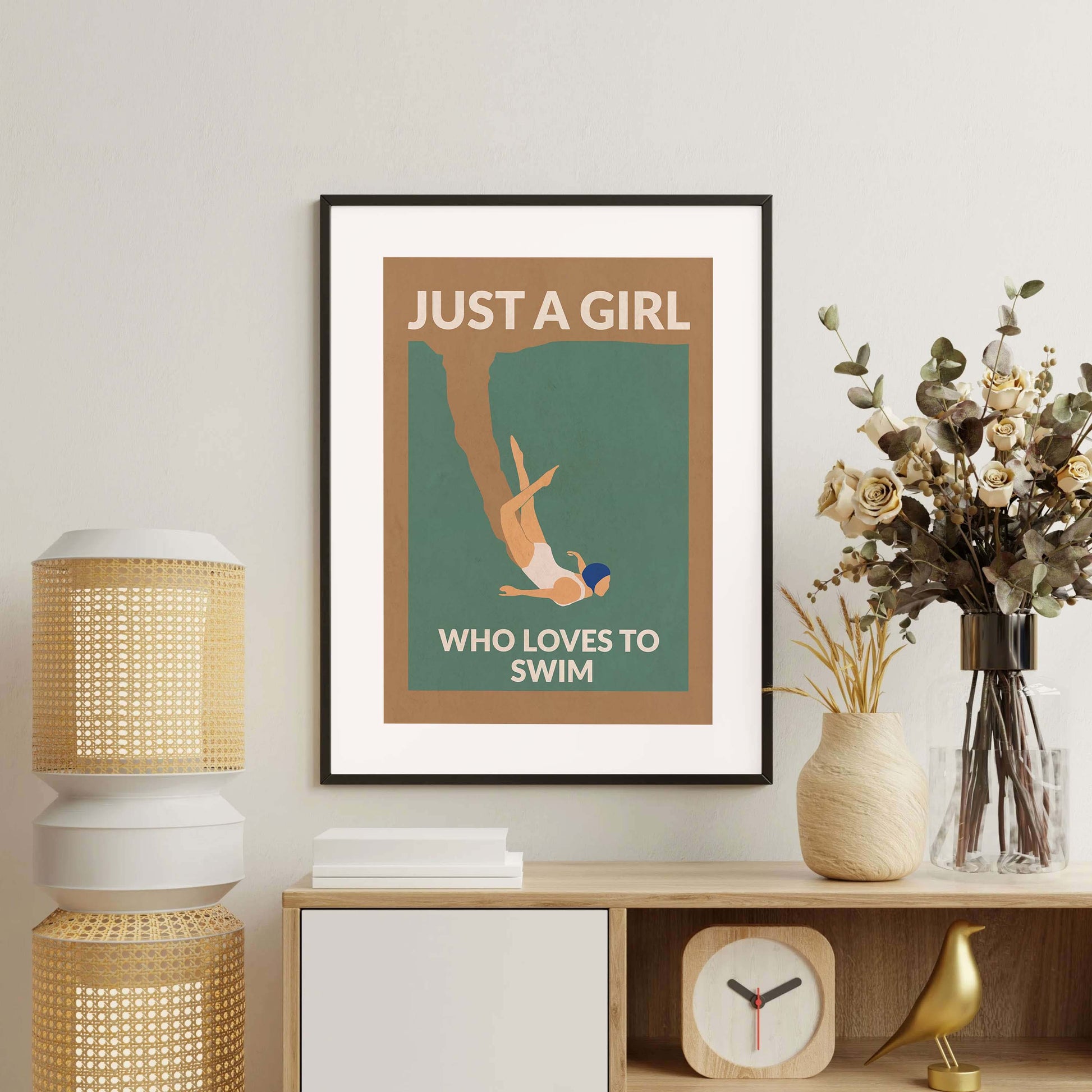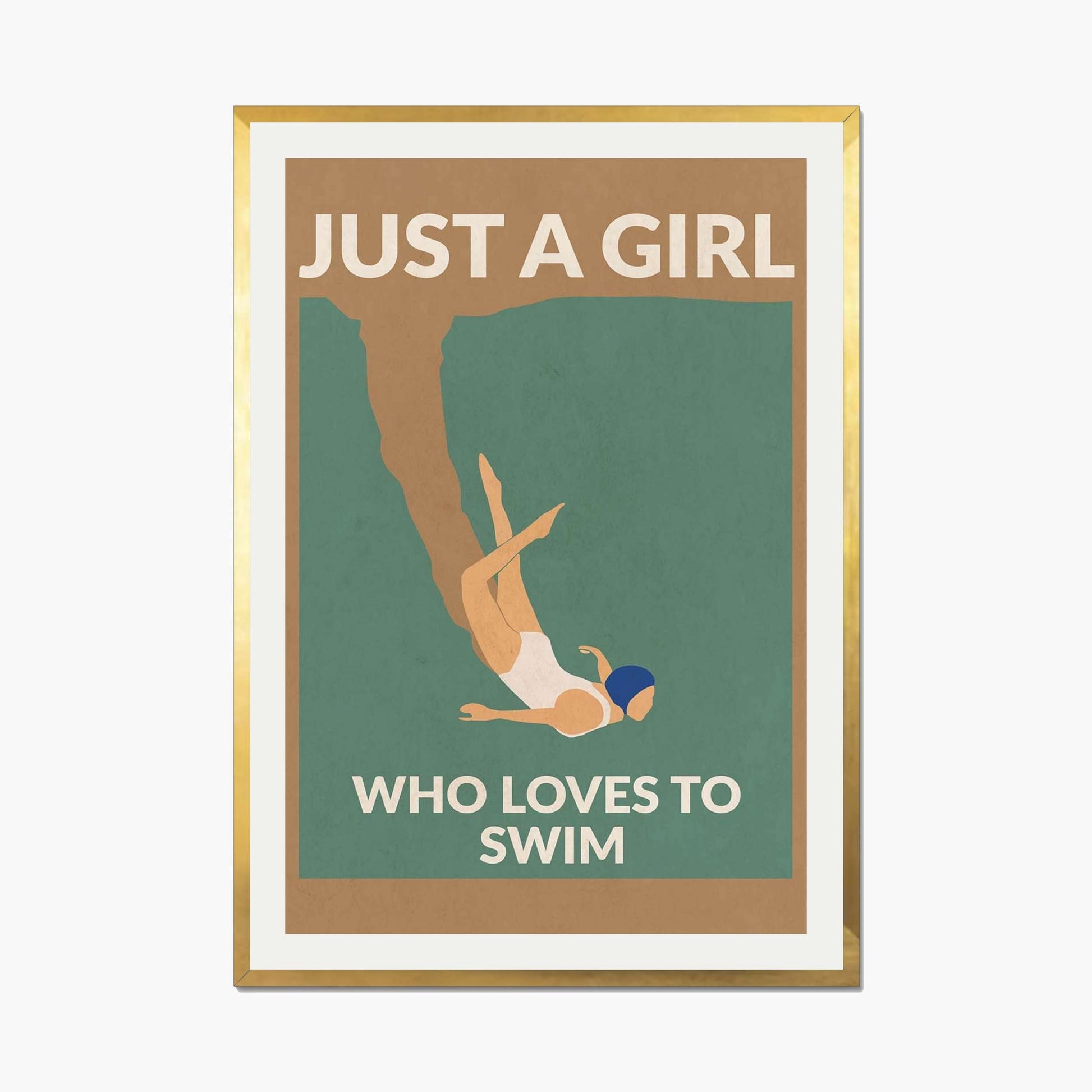 JUST A GIRL WHO LOVES TO SWIM is a vintage-style art print featuring a graceful swimmer in teal waters, framed by empowering text—perfect for adding nostalgic aquatic charm to any space.
