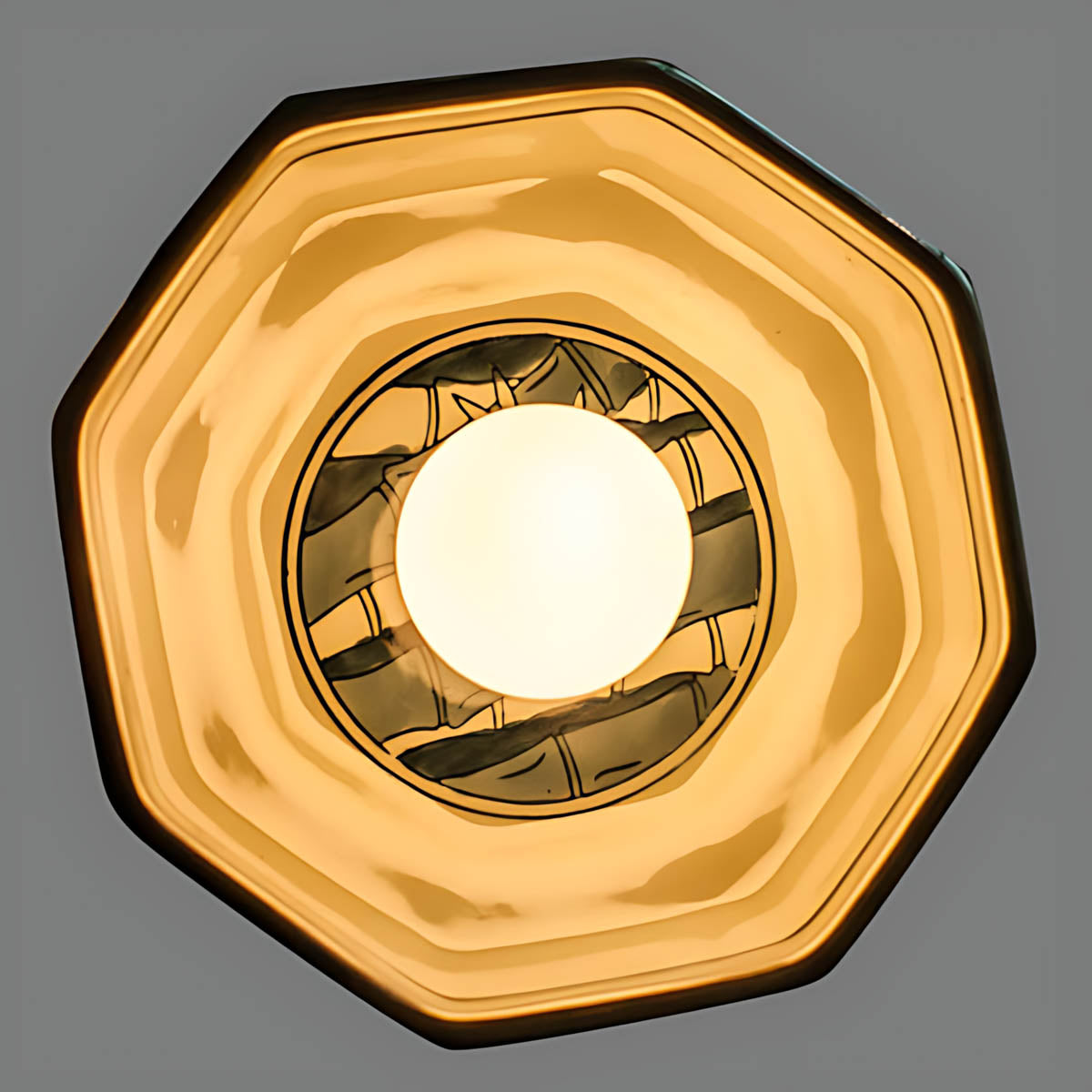 Inspired by Japanese motifs and modern Japandi design, each faceted shade features delicate, graphic patterns and glossy, layered glazes (think indigo, teal, and warm terracotta) that frame a softly reflective interior for a welcoming, down-cast glow.