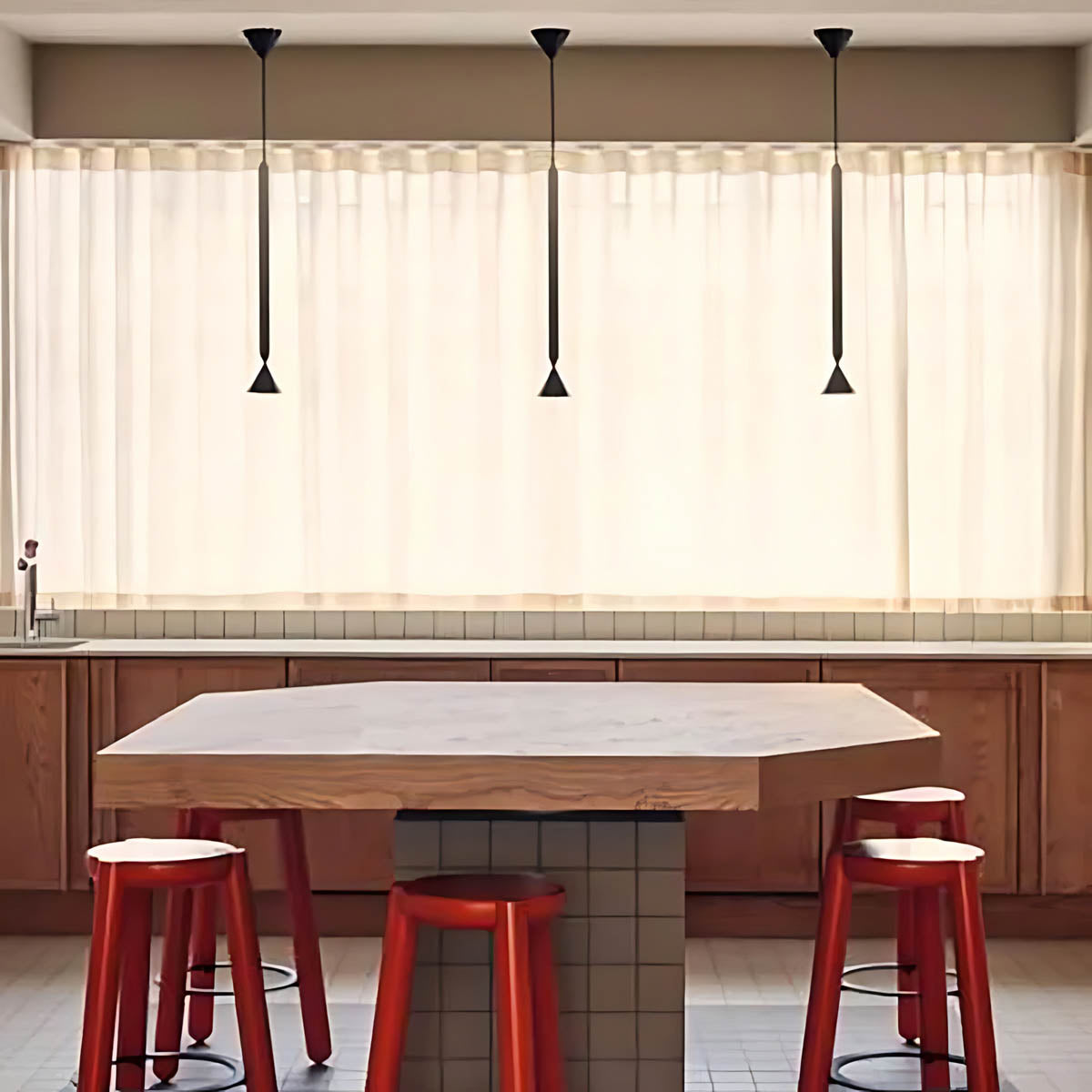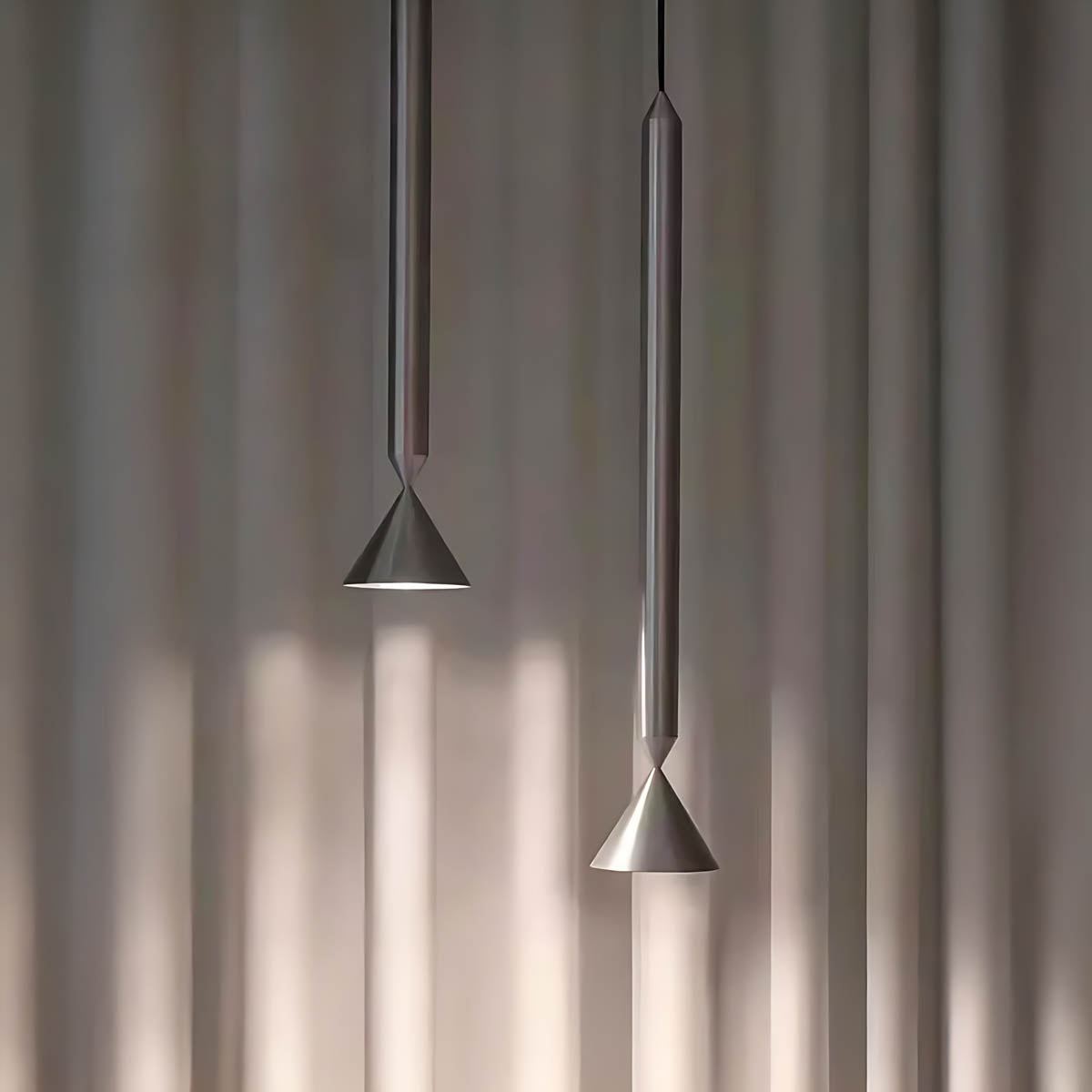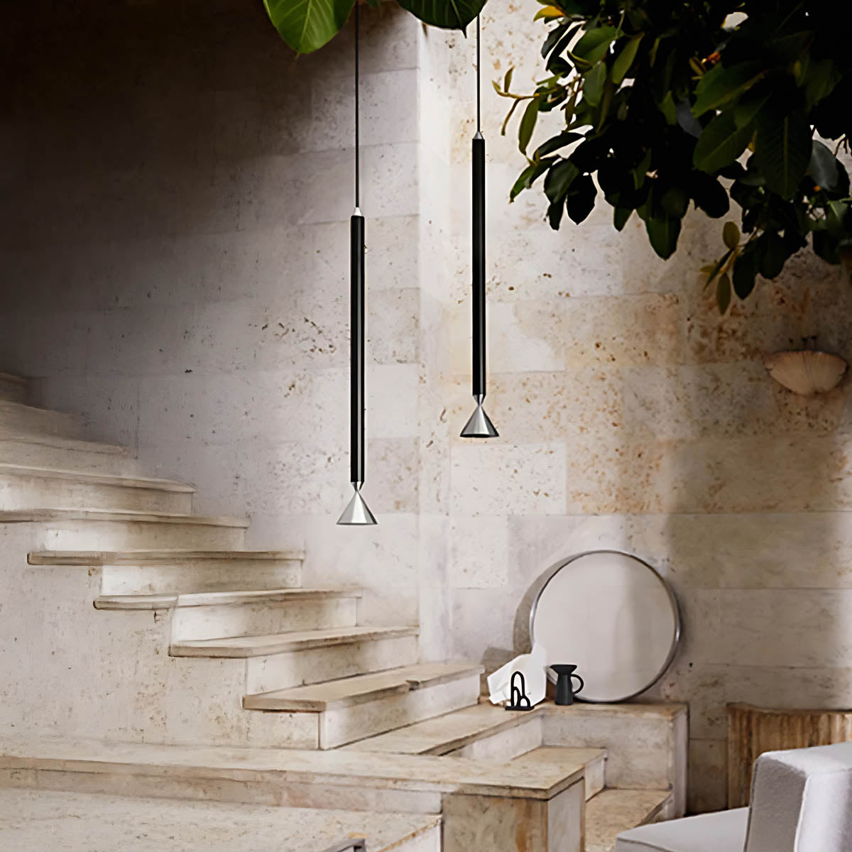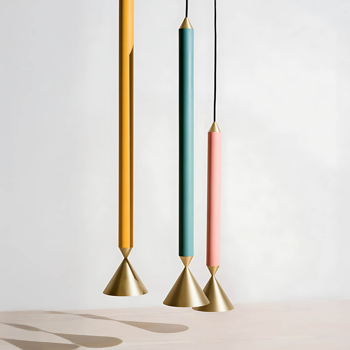 Its elongated rod and sculptural cone tip create a focused downlight that’s perfect for kitchen islands, bars, stairwells, and airy entryways, while the refined finishes (from soft color coats to satin metallics) add subtle luxe.