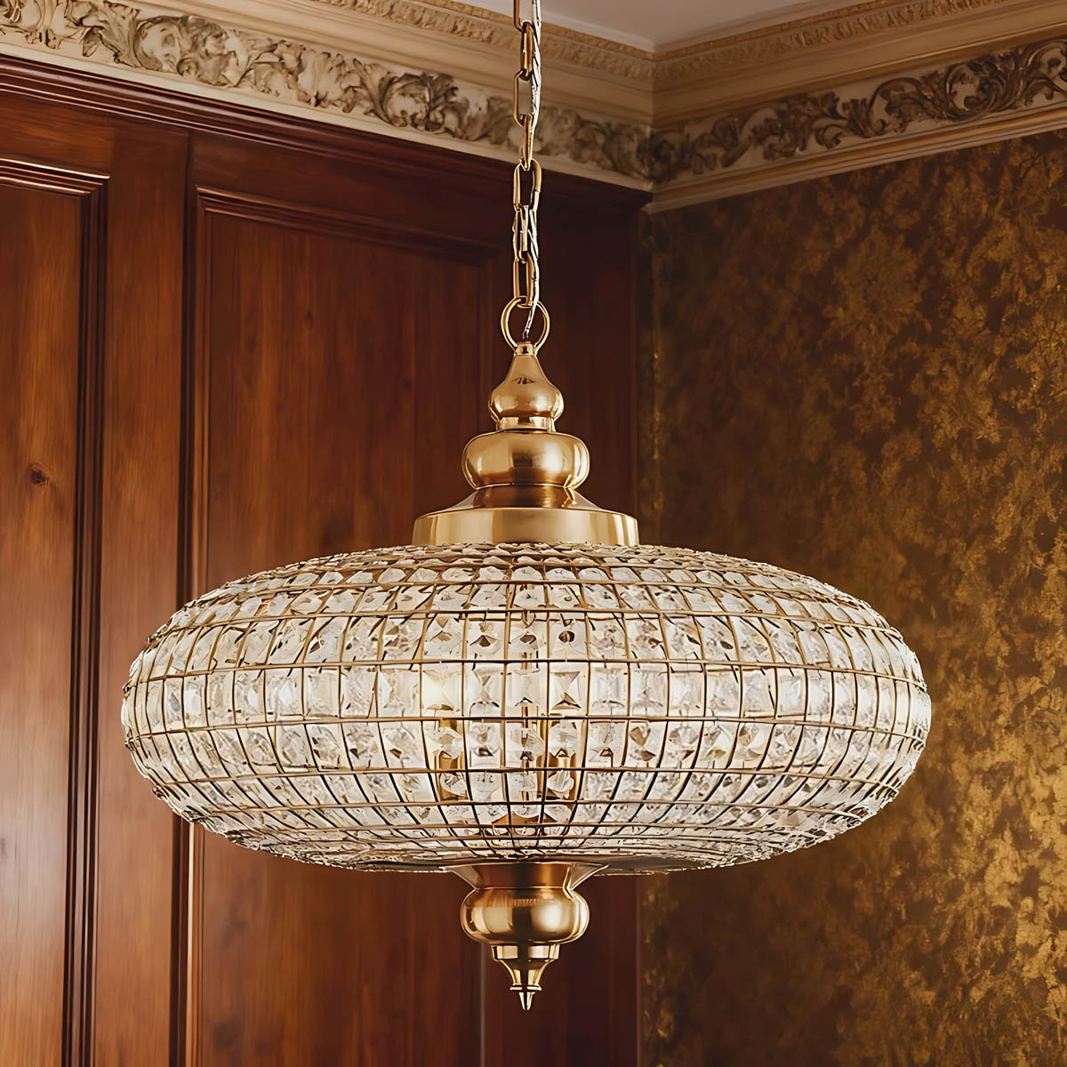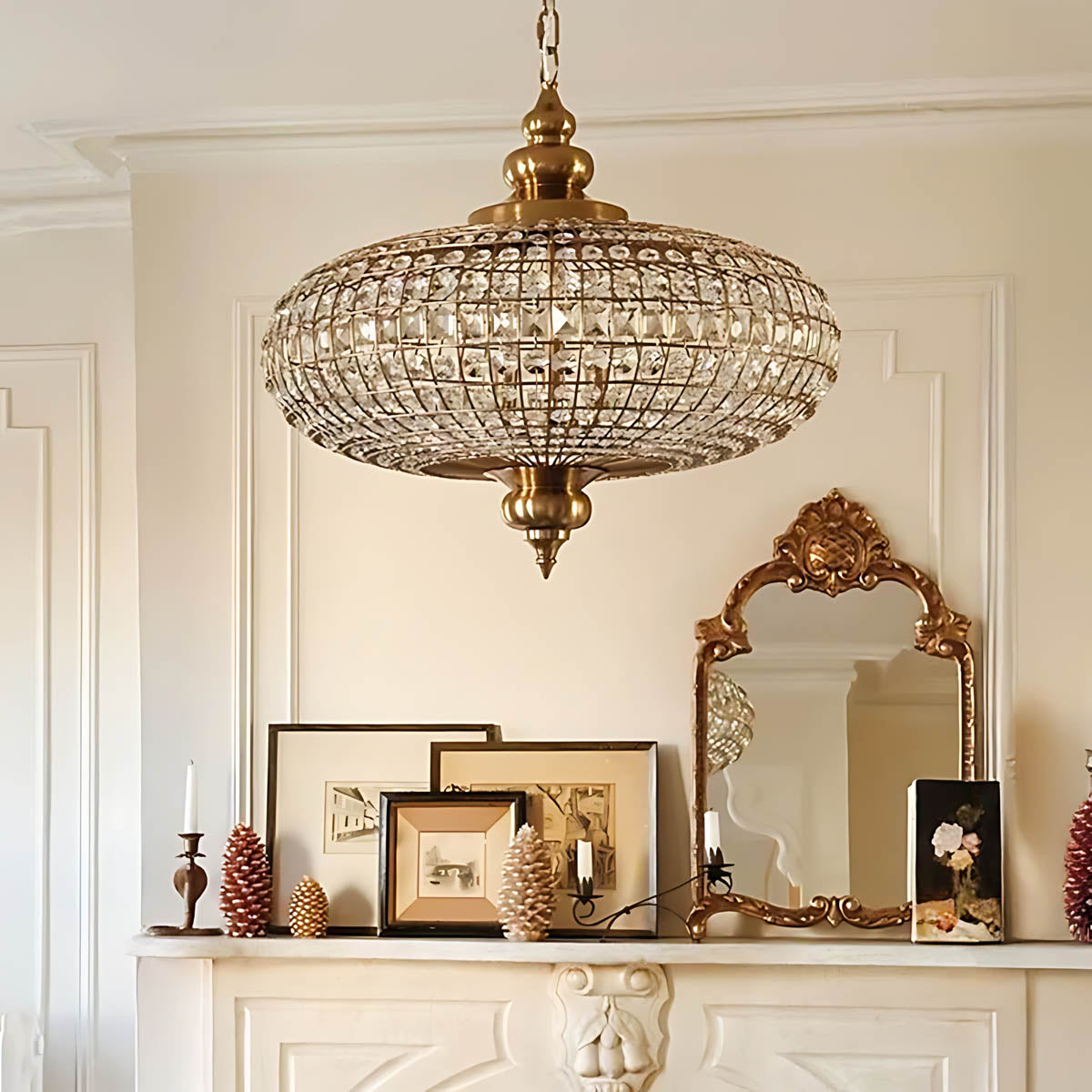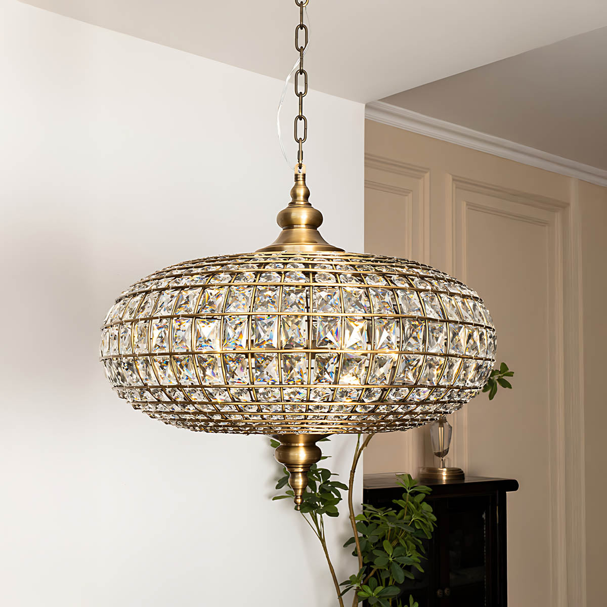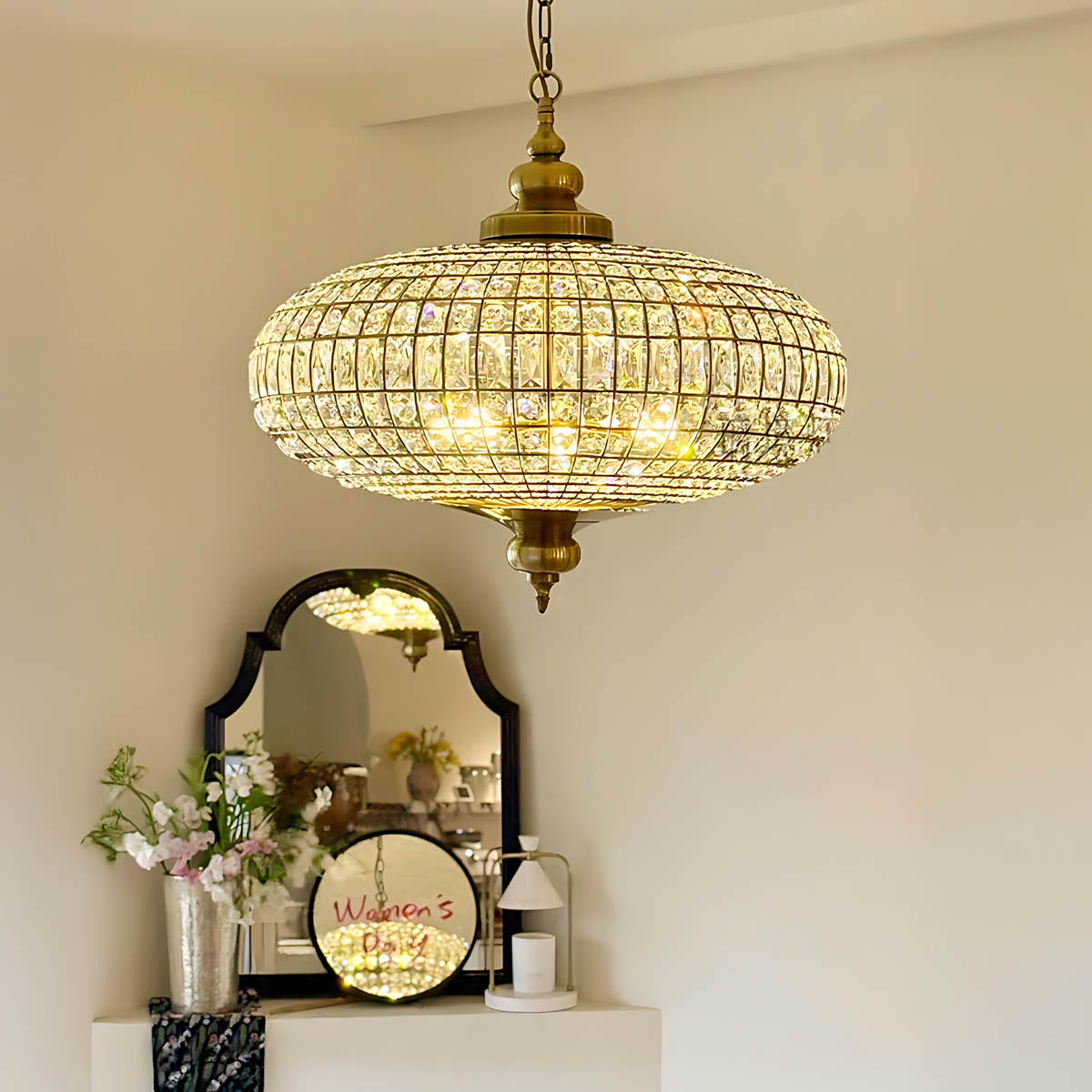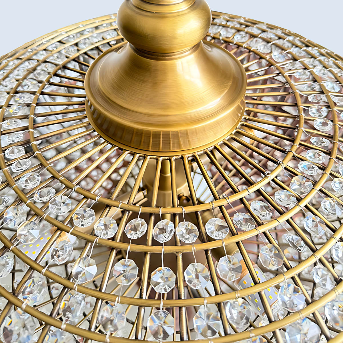 Its elegant, flattened-dome silhouette is wrapped in a geometric lattice that cradles faceted crystals; once illuminated, the gems scatter a glamorous shimmer while the tiered finials and concentric spokes lend heirloom detail.
