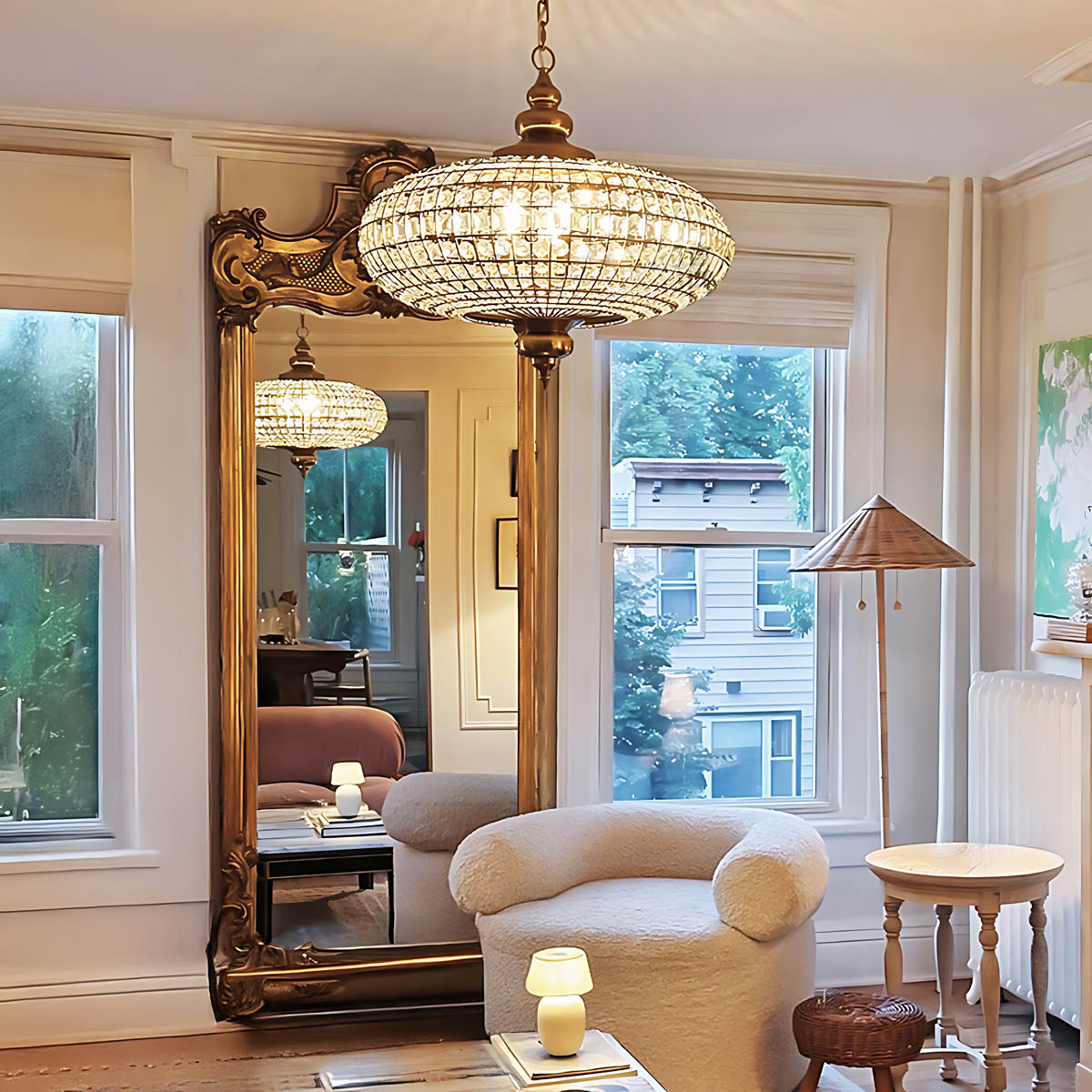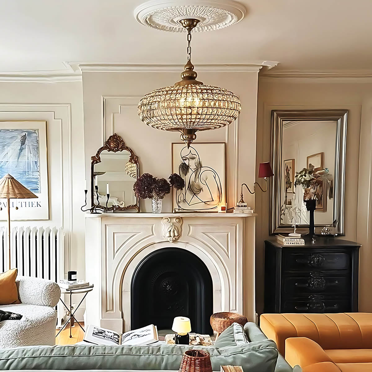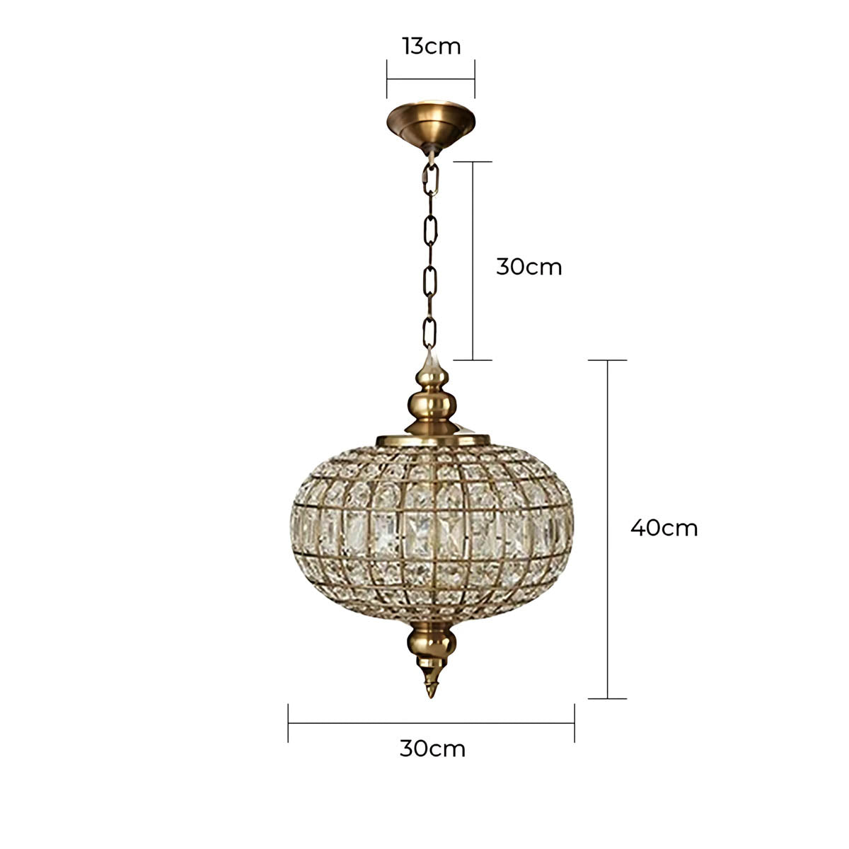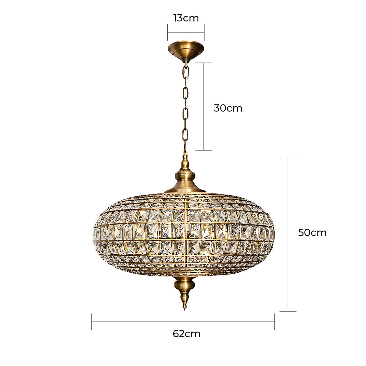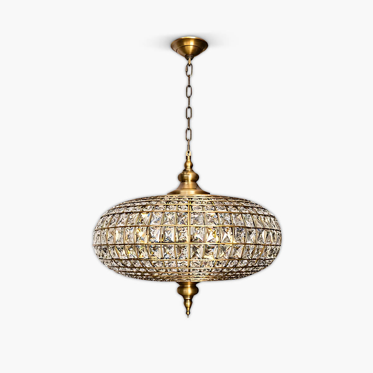 Its elegant, flattened-dome silhouette is wrapped in a geometric lattice that cradles faceted crystals; once illuminated, the gems scatter a glamorous shimmer while the tiered finials and concentric spokes lend heirloom detail.