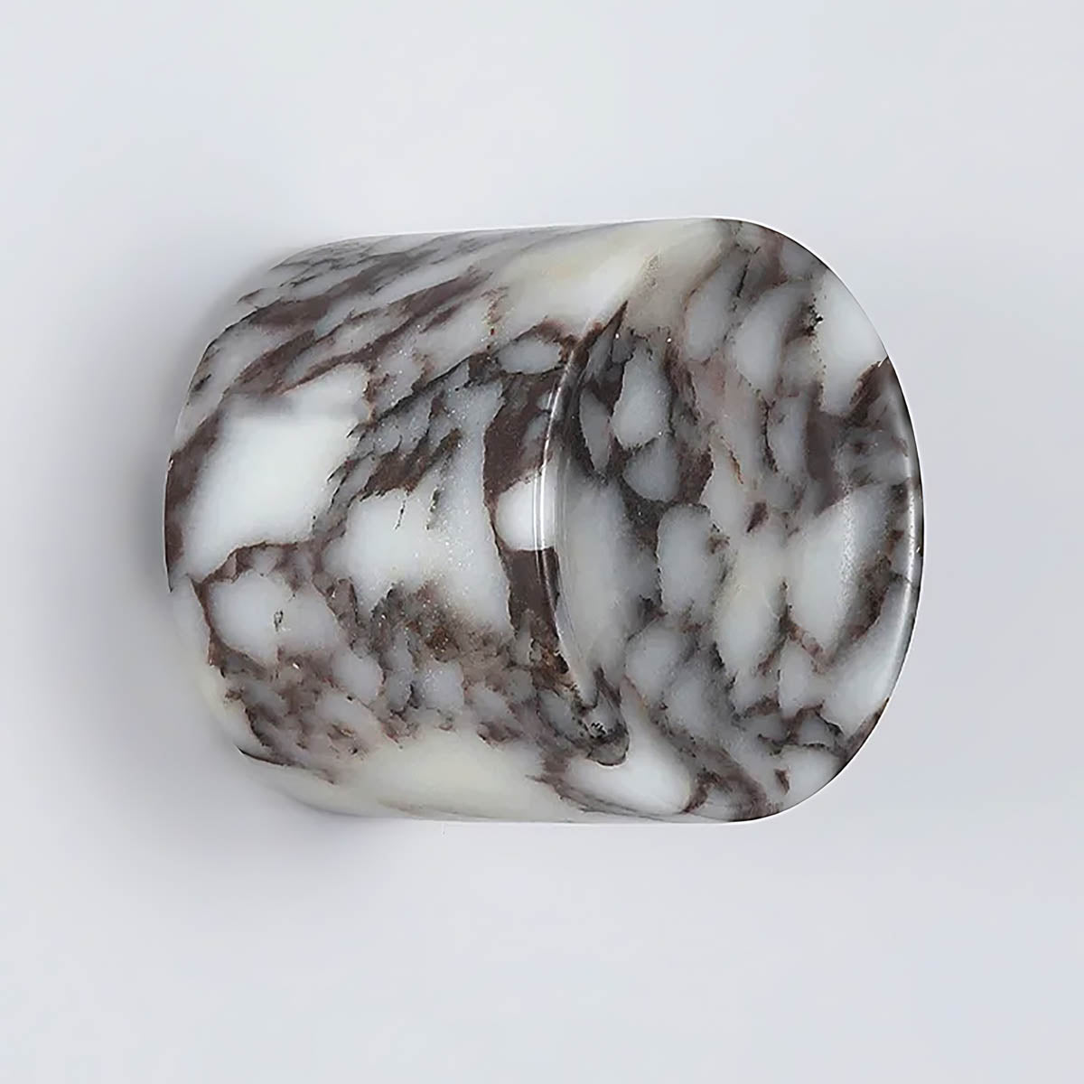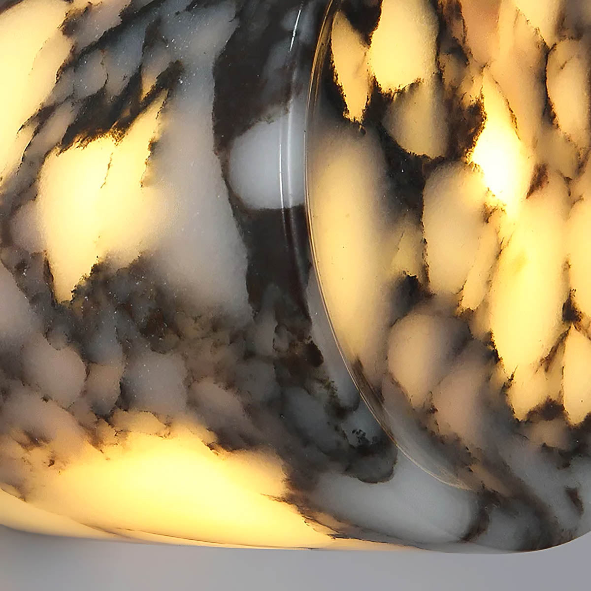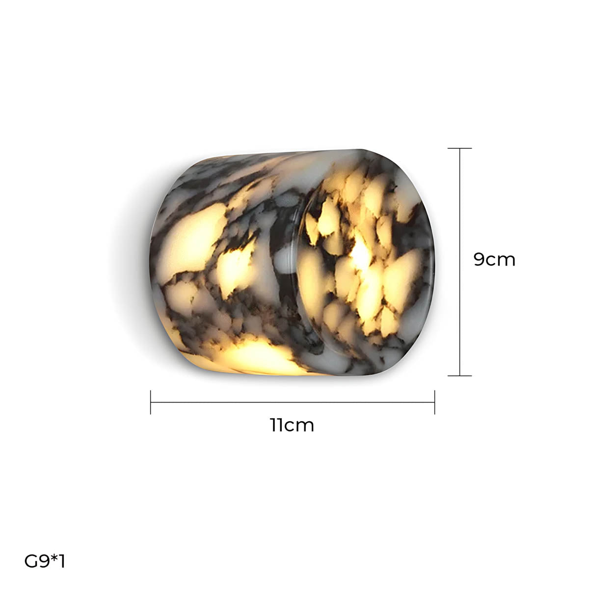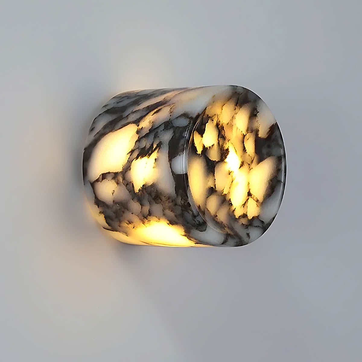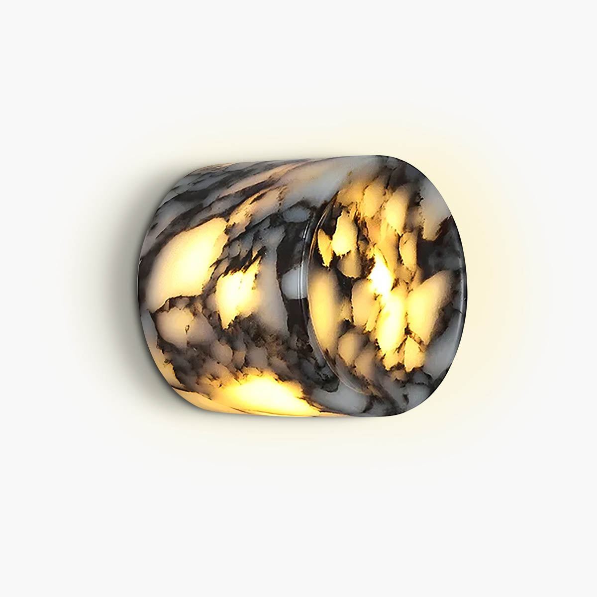 Carved into a compact cylindrical form with a subtle front recess, its semi-translucent marble reveals organic white and charcoal veining; when illuminated, the pattern diffuses light like clouded onyx for rich depth and ambience.