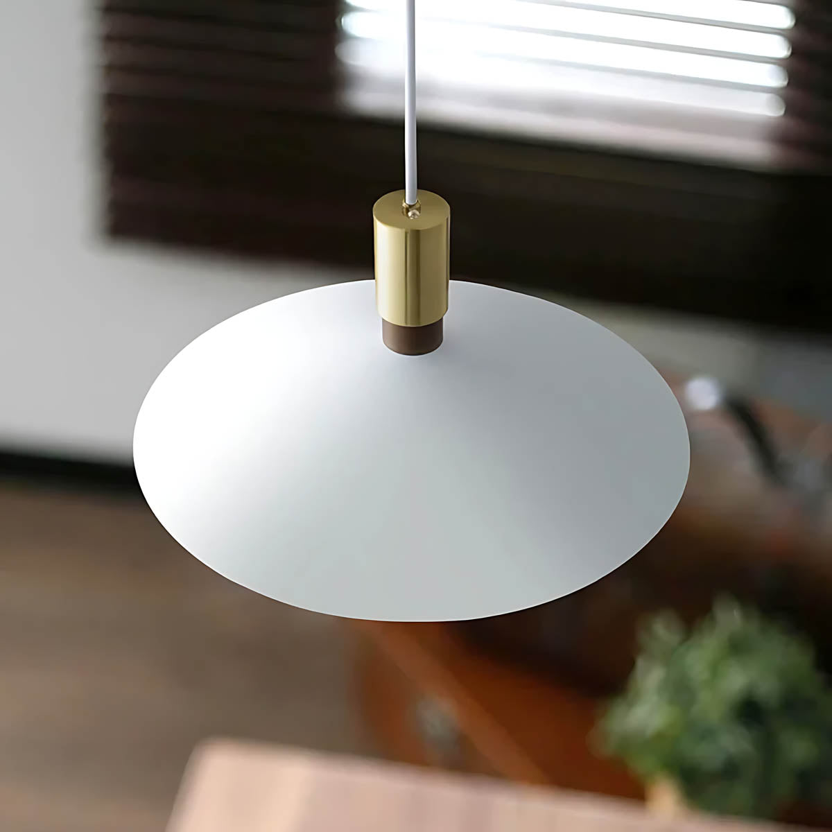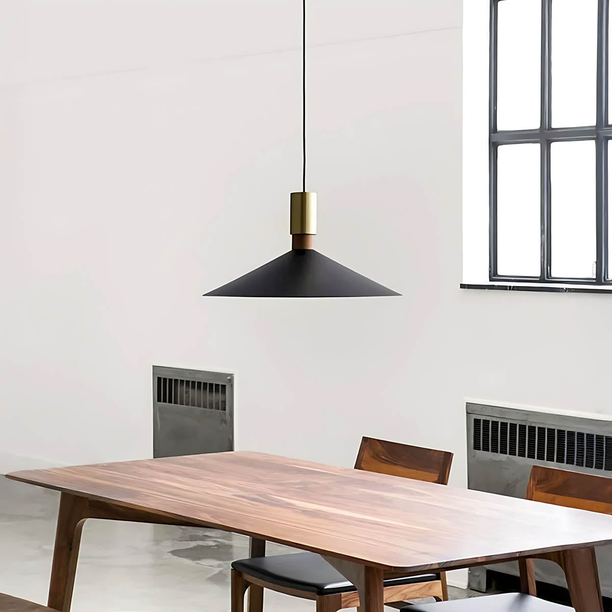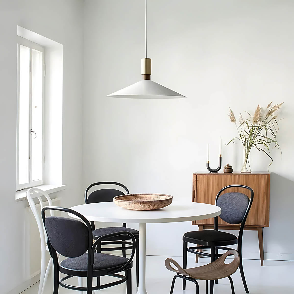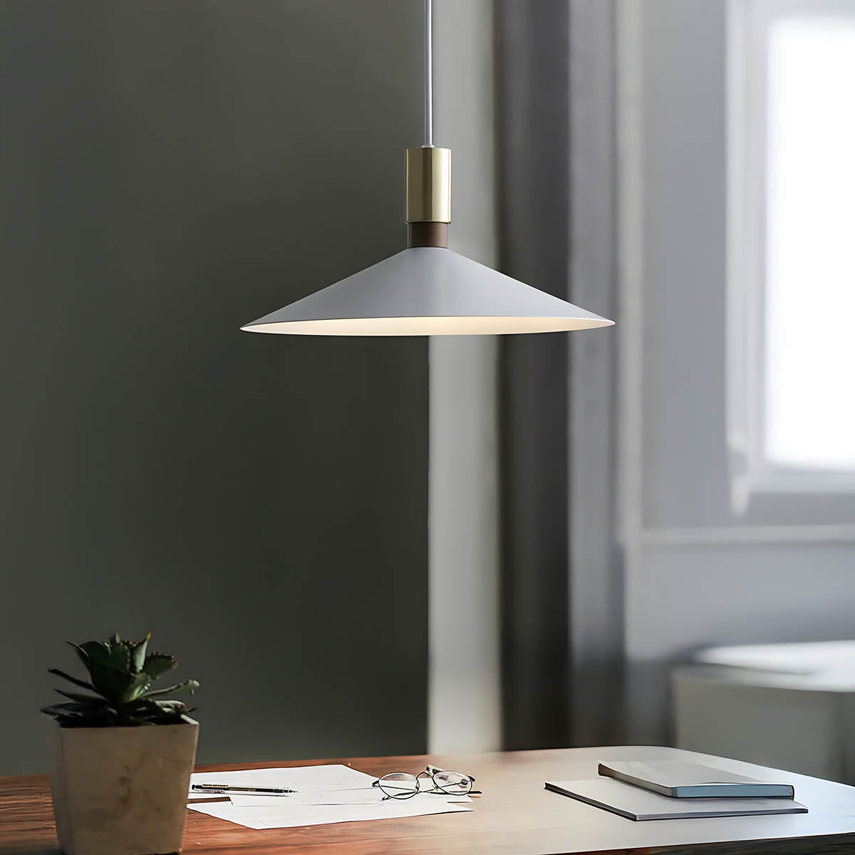 Its wide, shallow conical shade focuses a broad, even pool of light over dining tables, kitchen islands, and breakfast nooks, while the brass-tone cylinder and contrasting collar add a refined architectural accent.