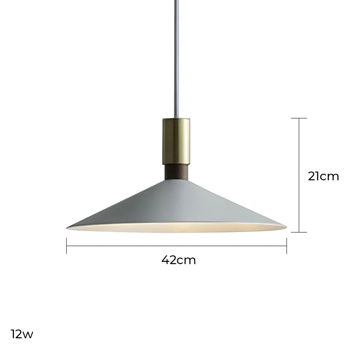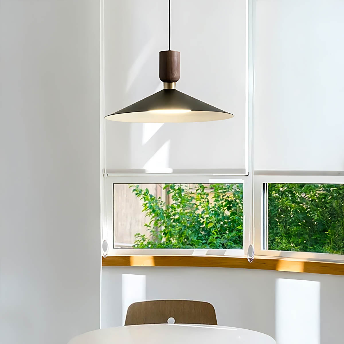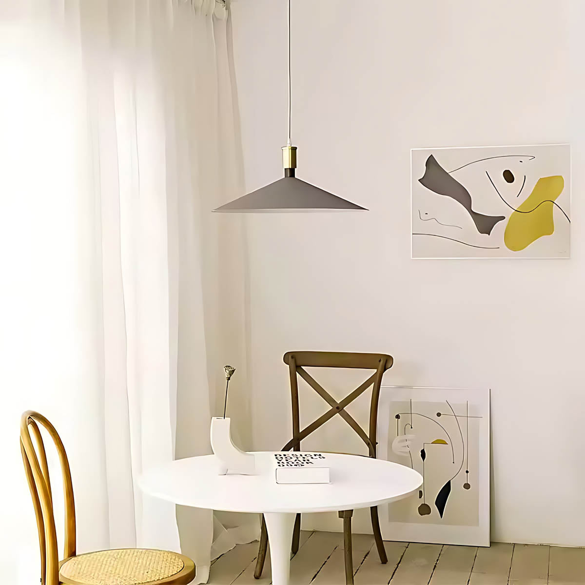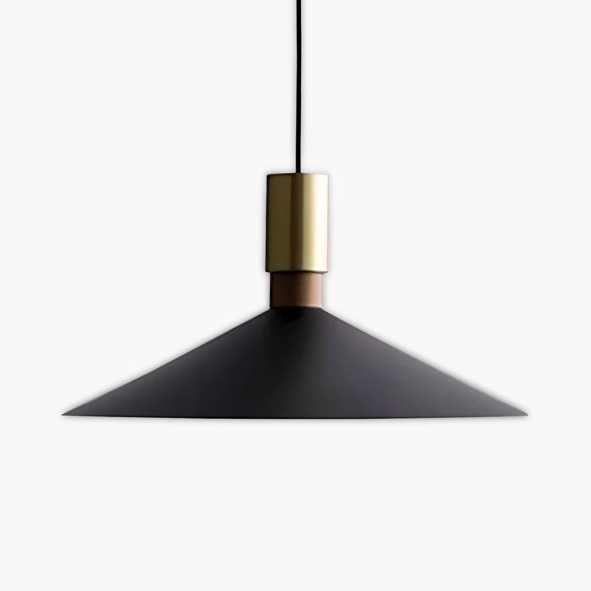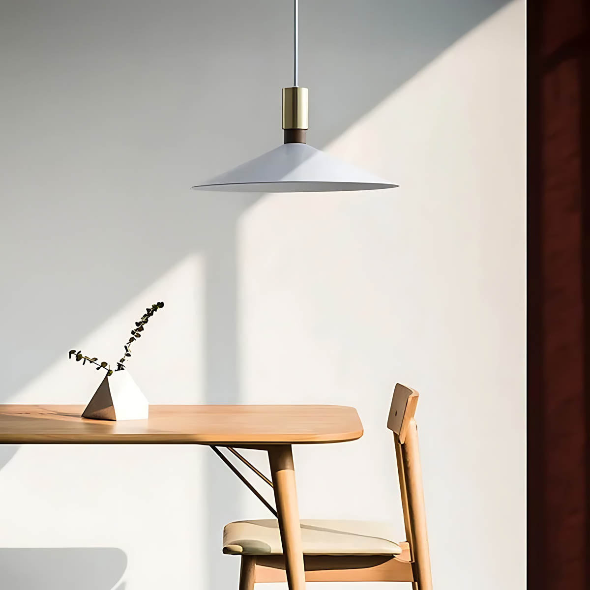Its wide, shallow conical shade focuses a broad, even pool of light over dining tables, kitchen islands, and breakfast nooks, while the brass-tone cylinder and contrasting collar add a refined architectural accent.