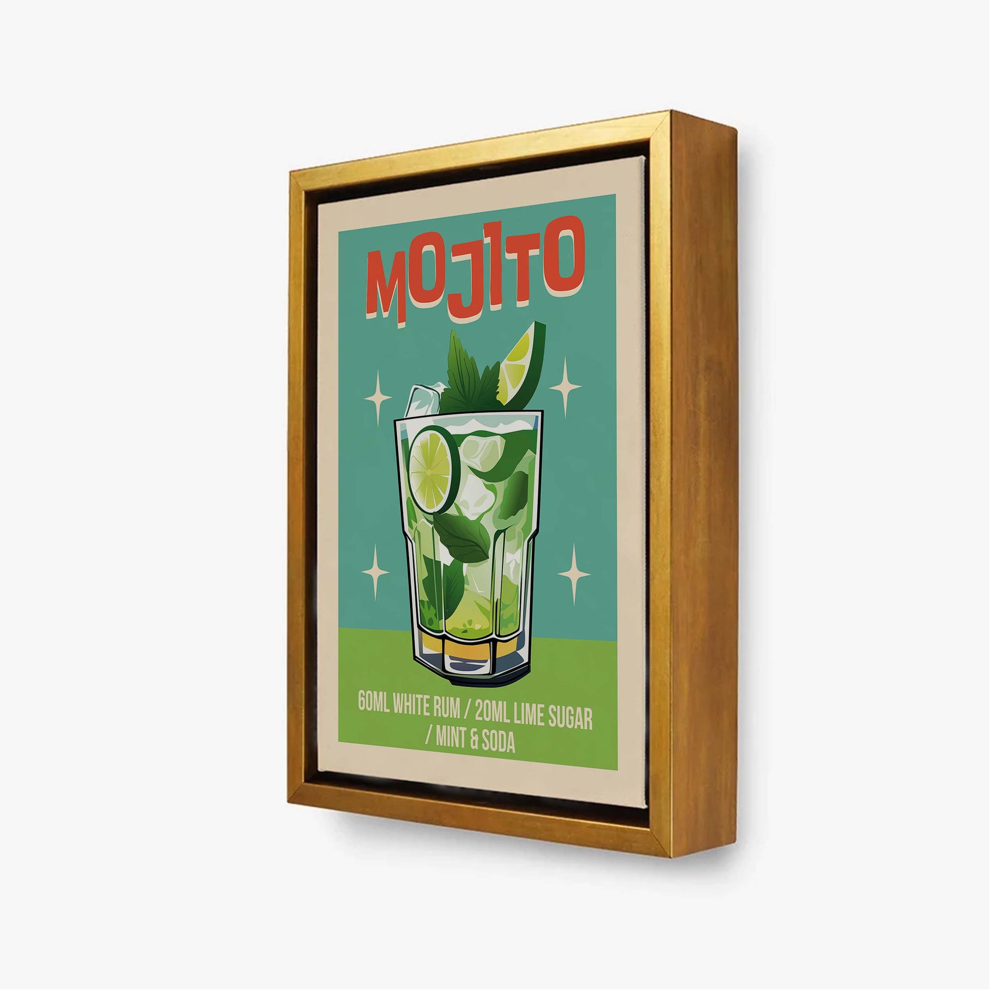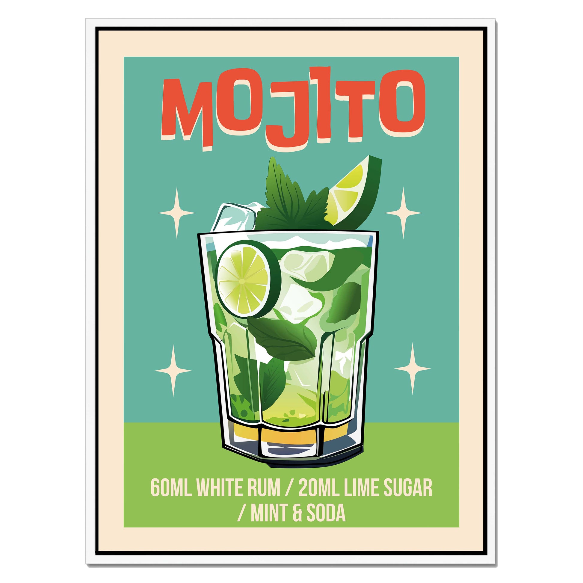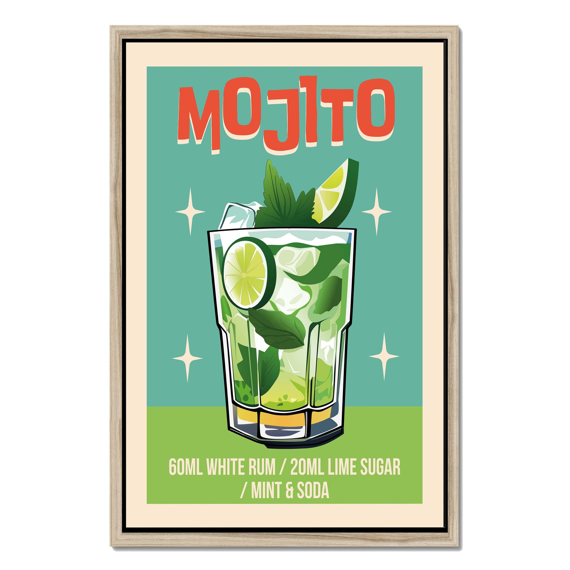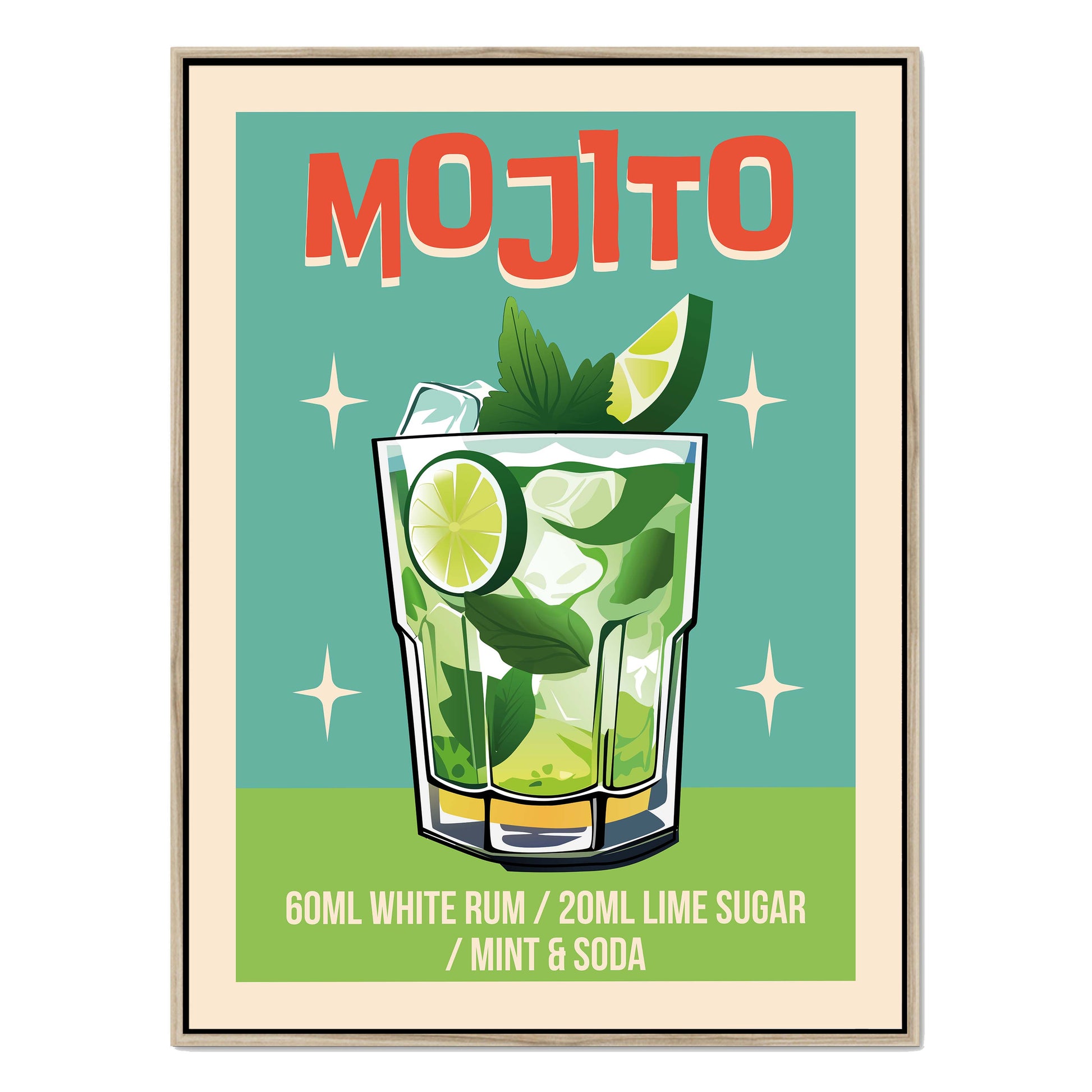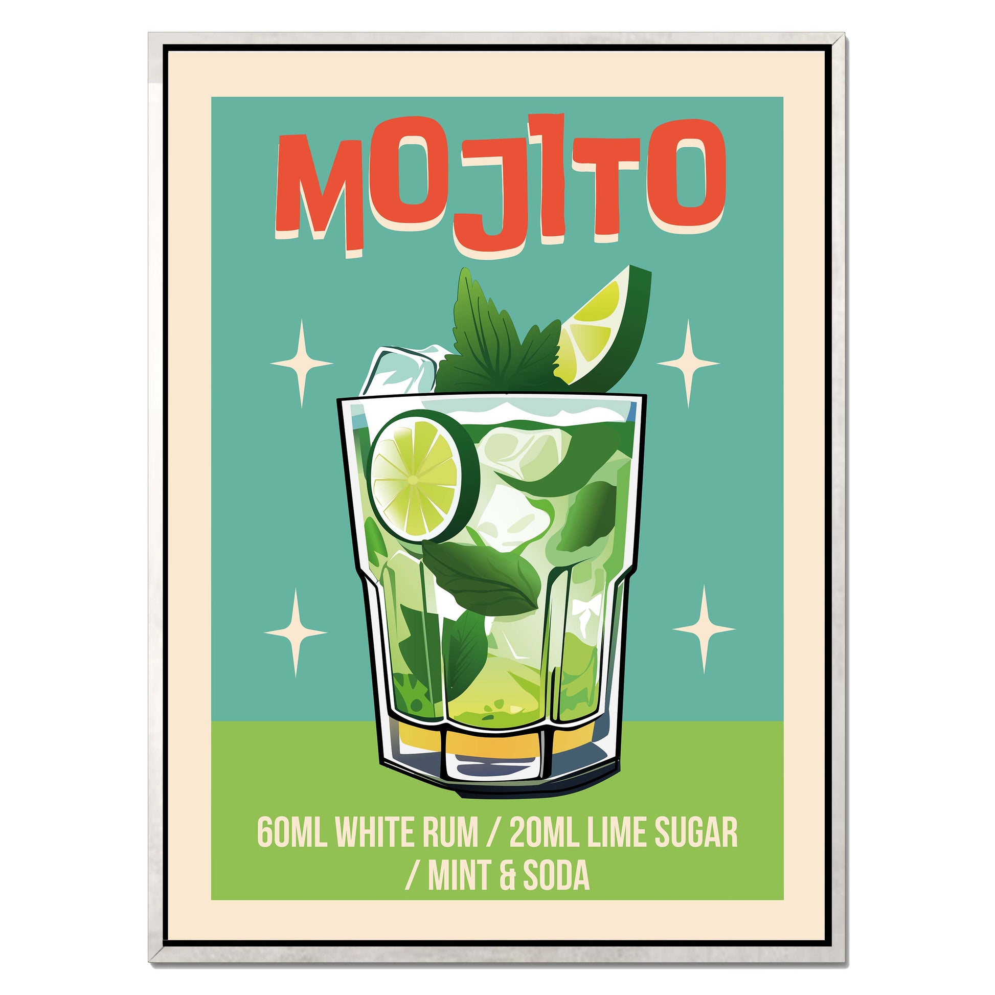 Retro-style canvas print featuring a vibrant illustrated MOJITO recipe. A nostalgic and refreshing design, perfect for cocktail lovers and vintage bar decor.