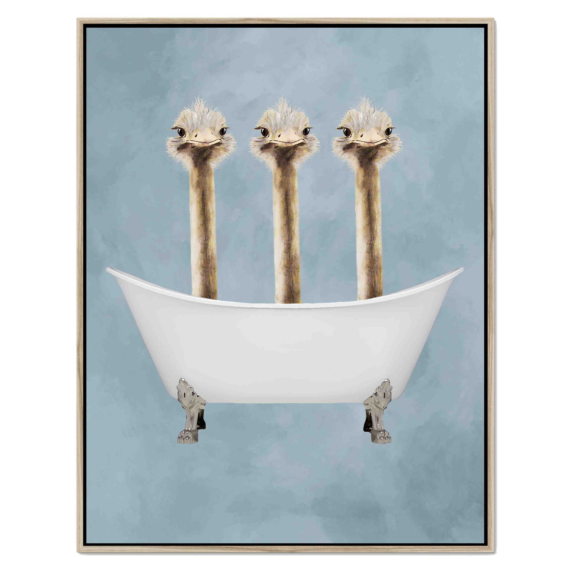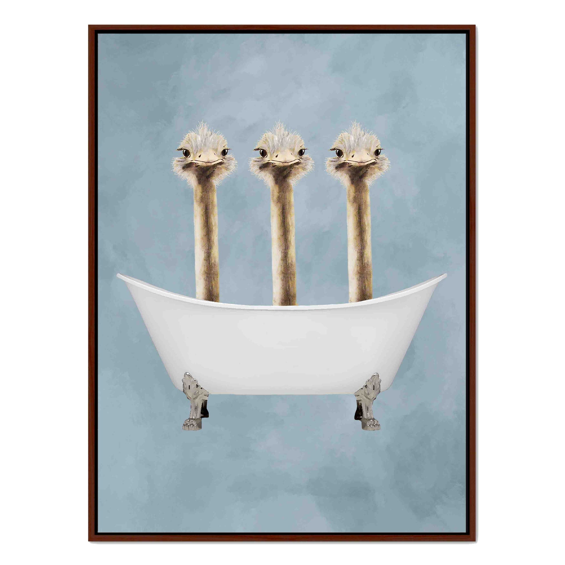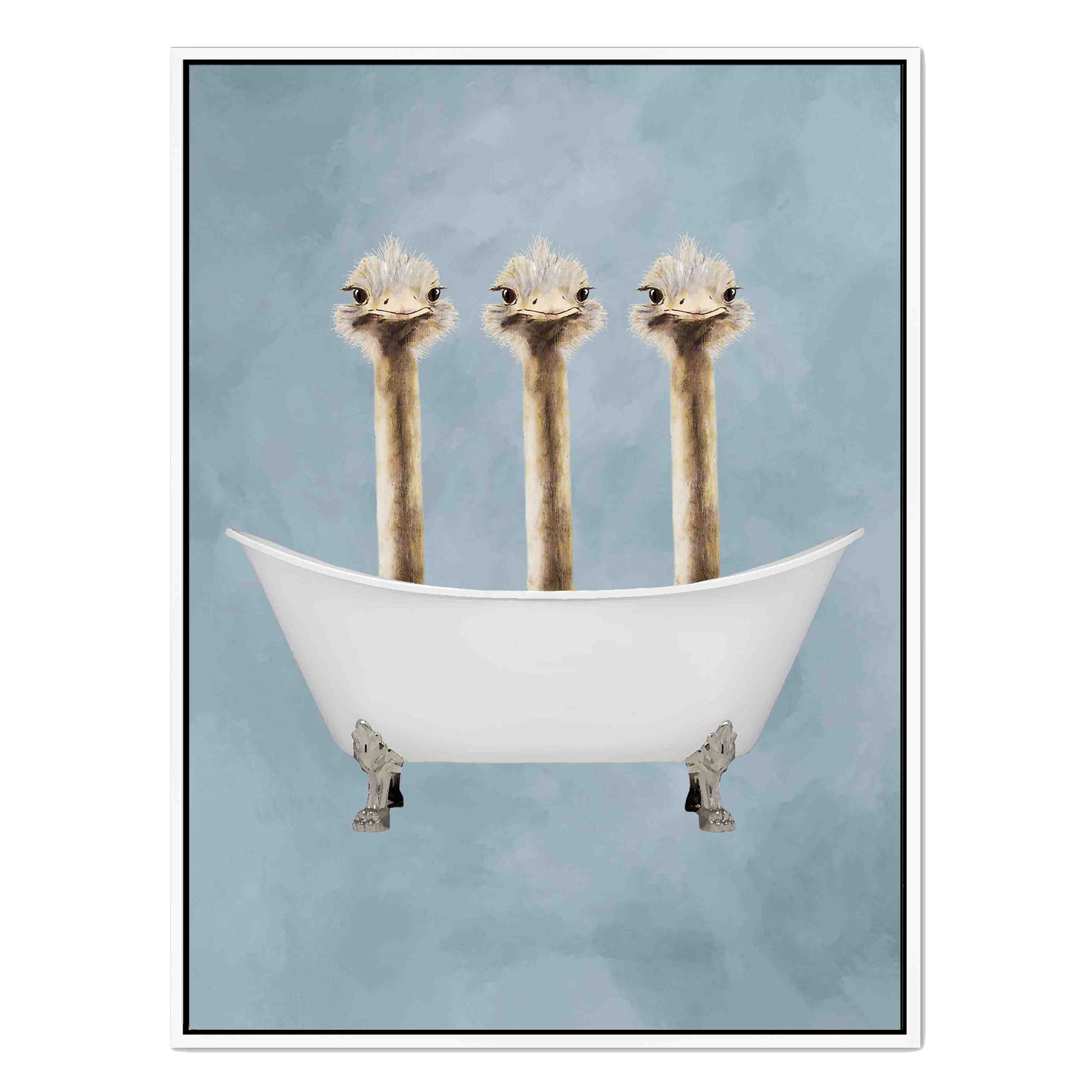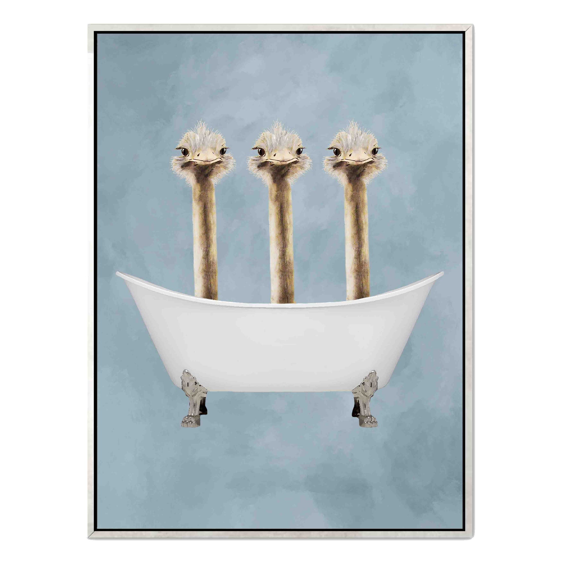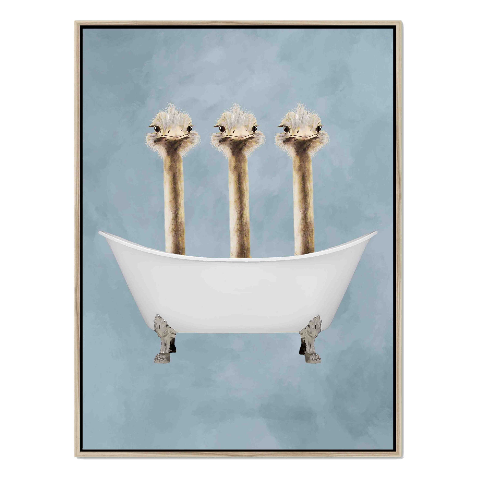 Whimsical canvas print of three OSTRICHES IN BATHTUB. A humorous and surreal wall art piece perfect for bathrooms, laundry rooms, or quirky home decor.