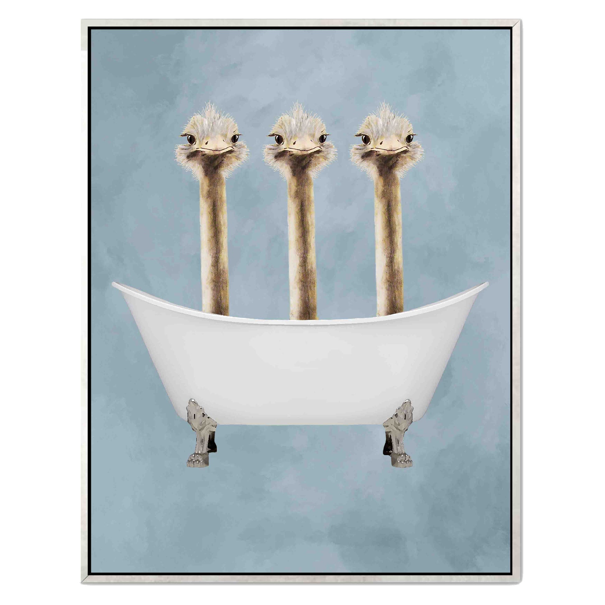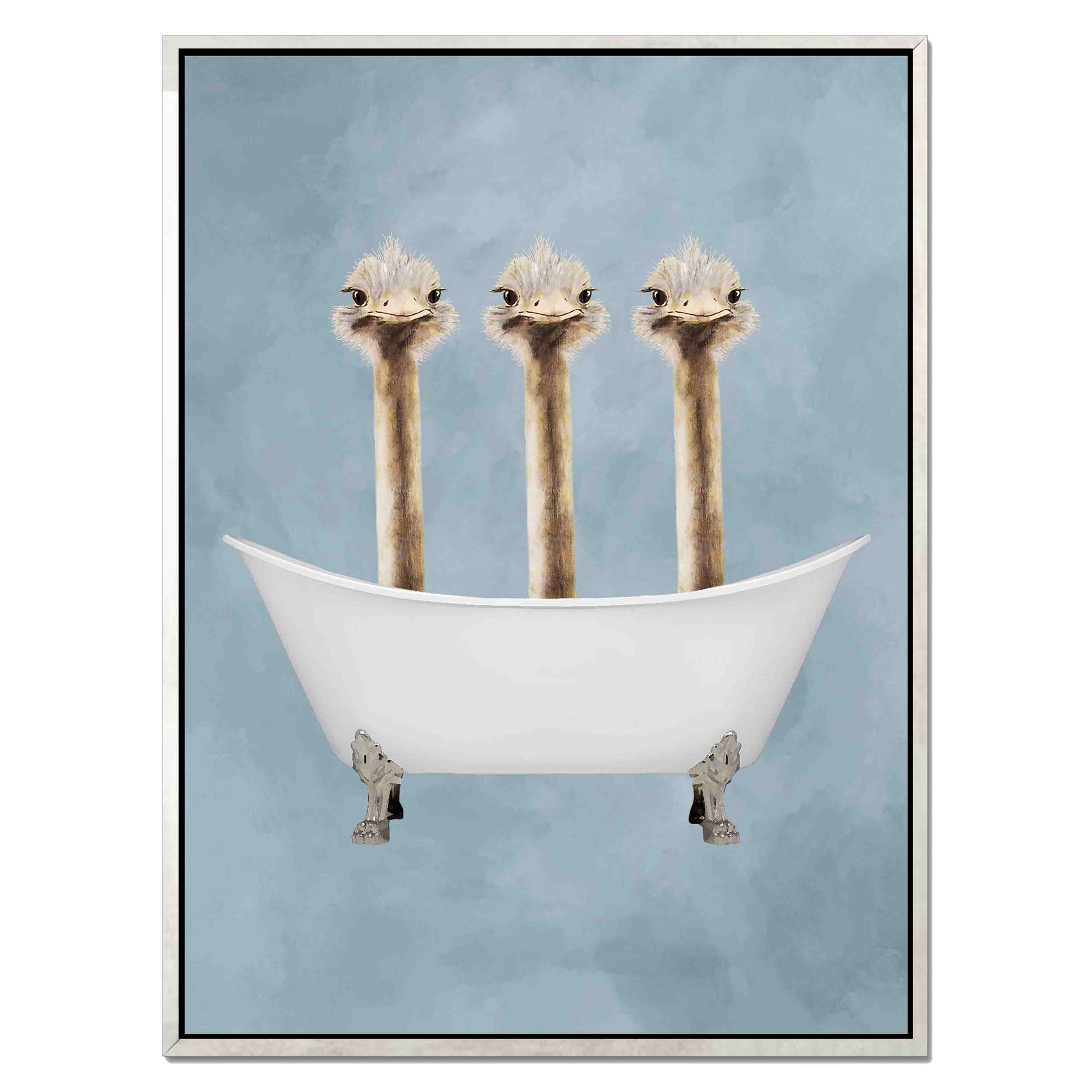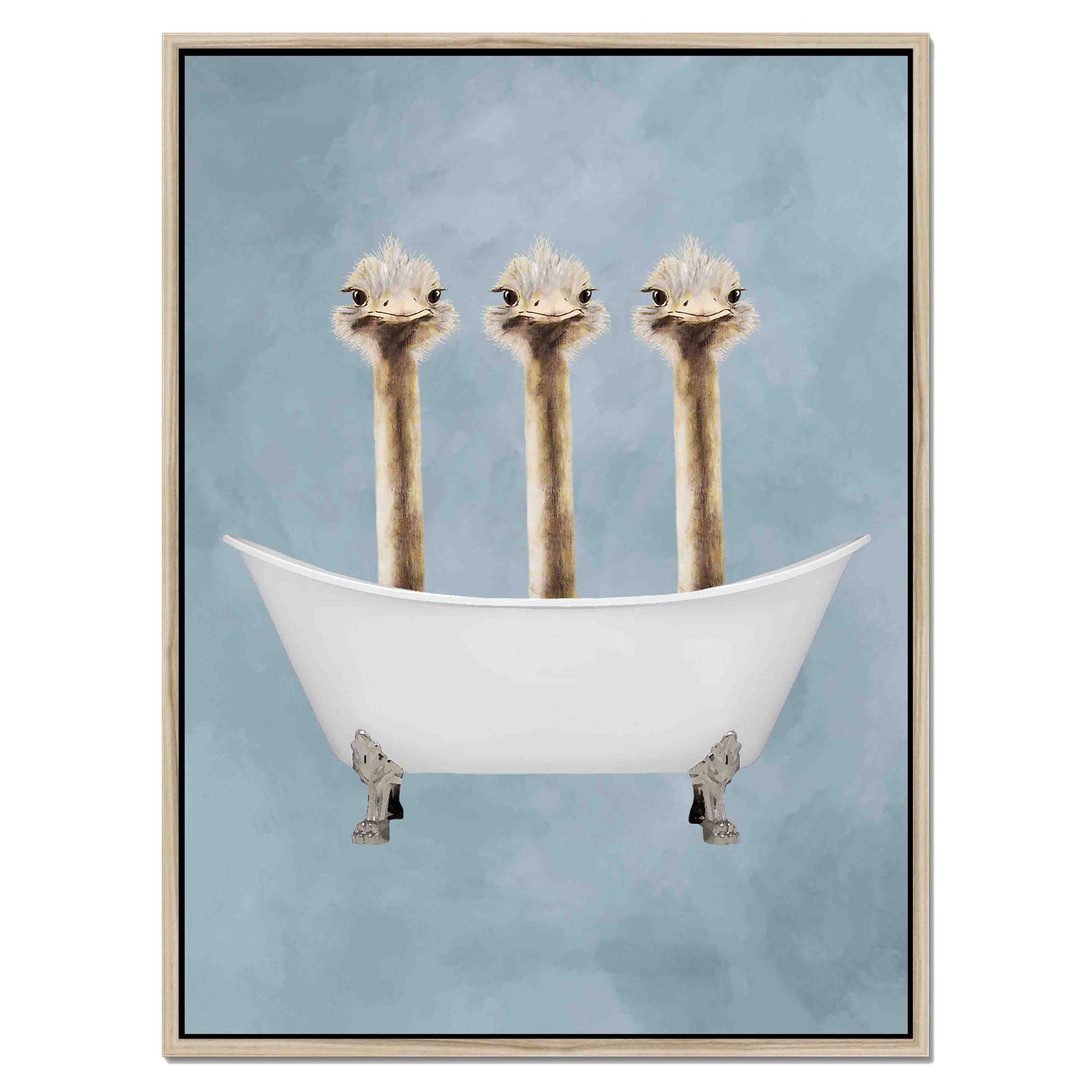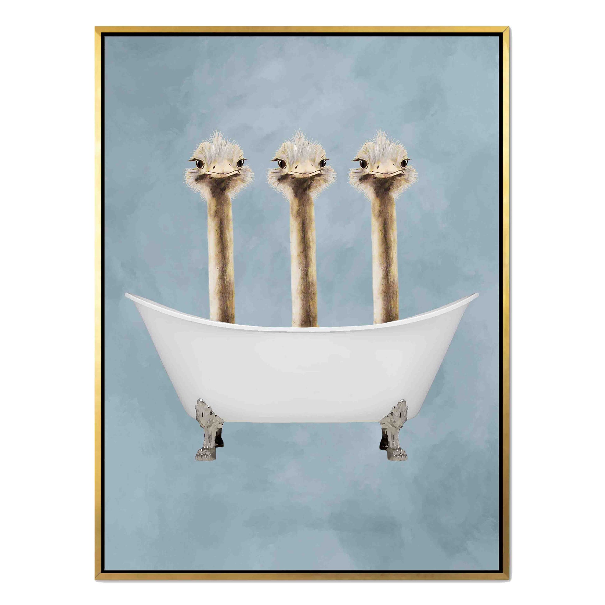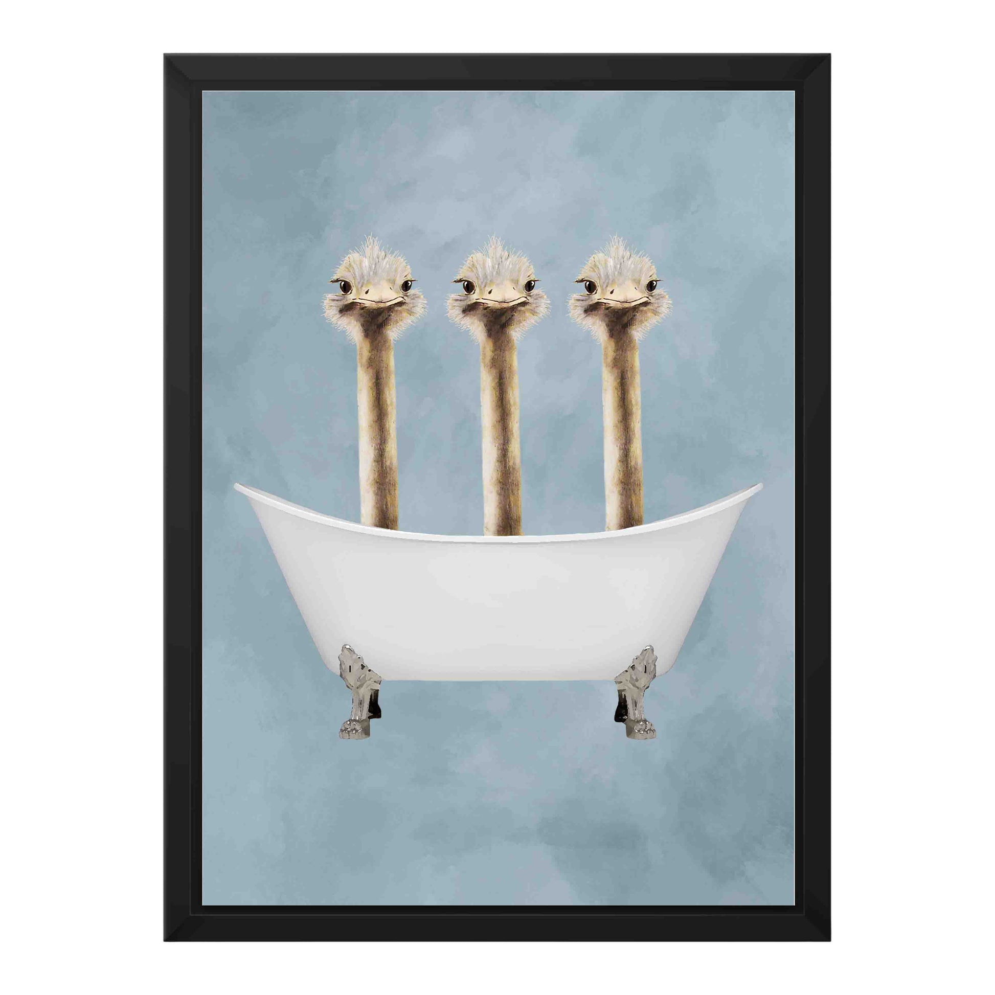 Whimsical canvas print of three OSTRICHES IN BATHTUB. A humorous and surreal wall art piece perfect for bathrooms, laundry rooms, or quirky home decor.