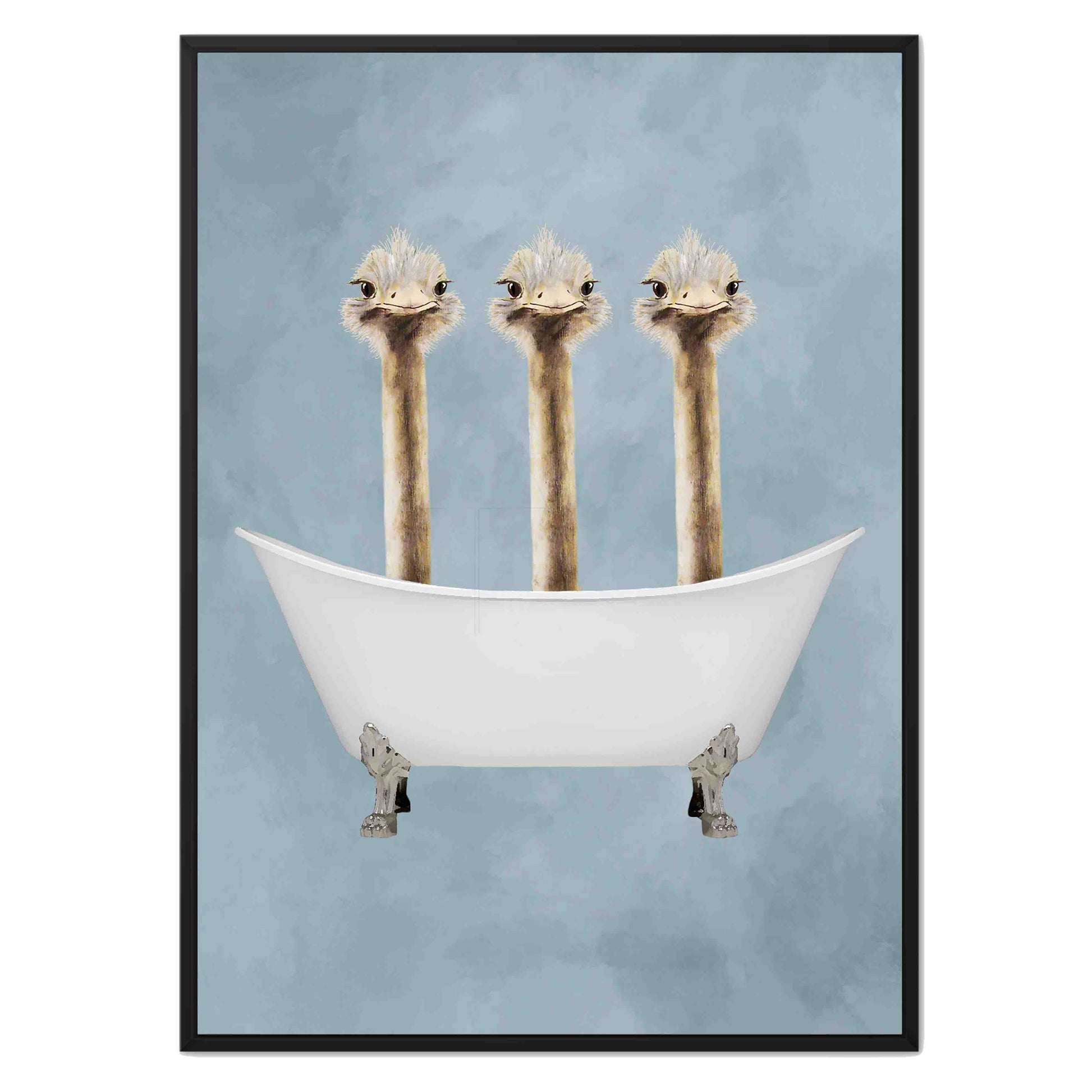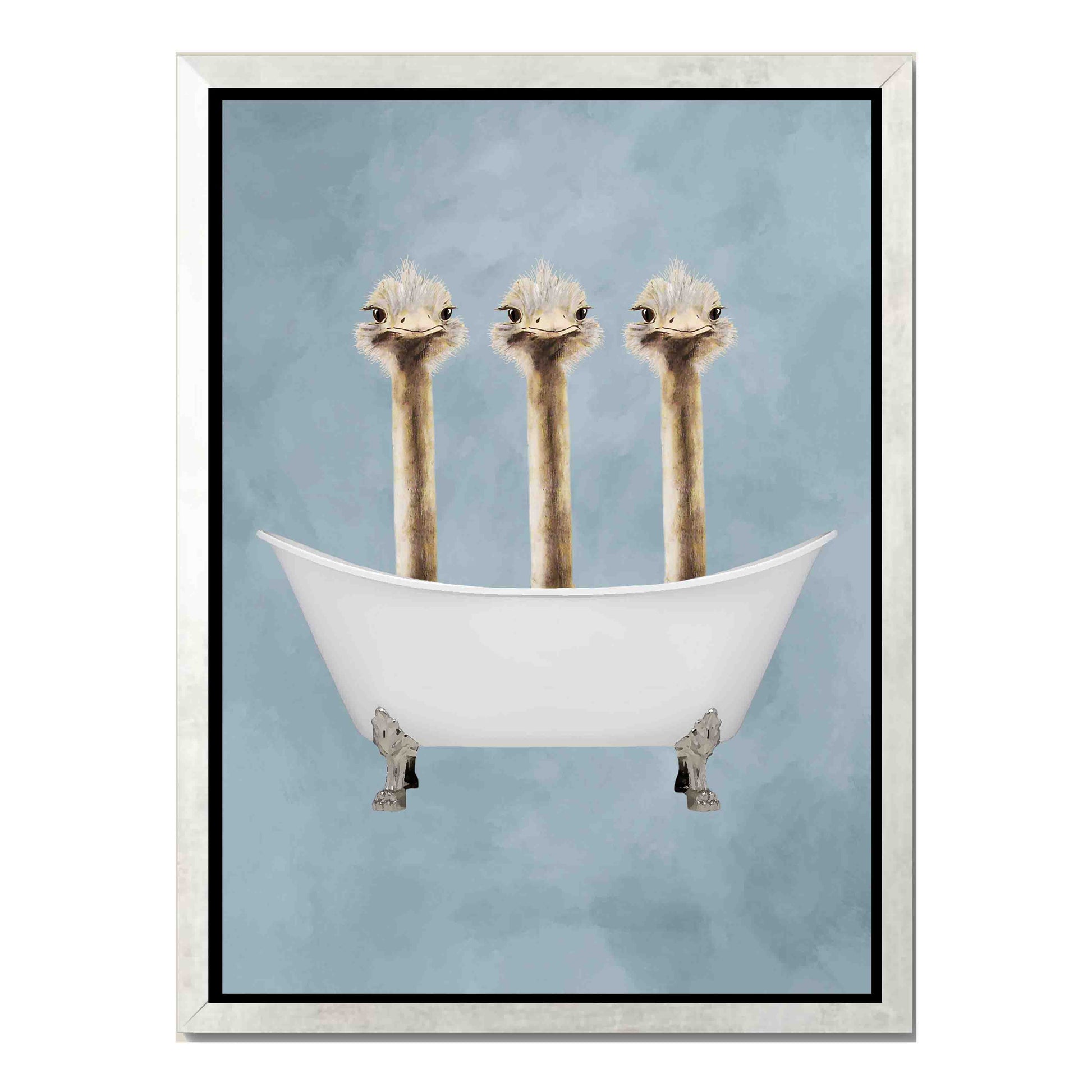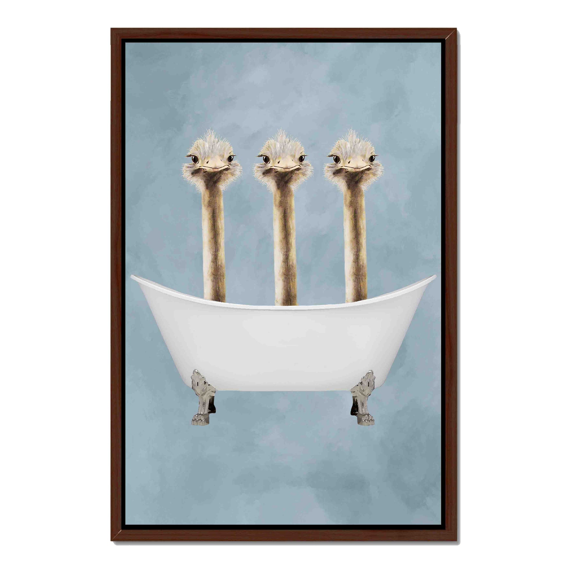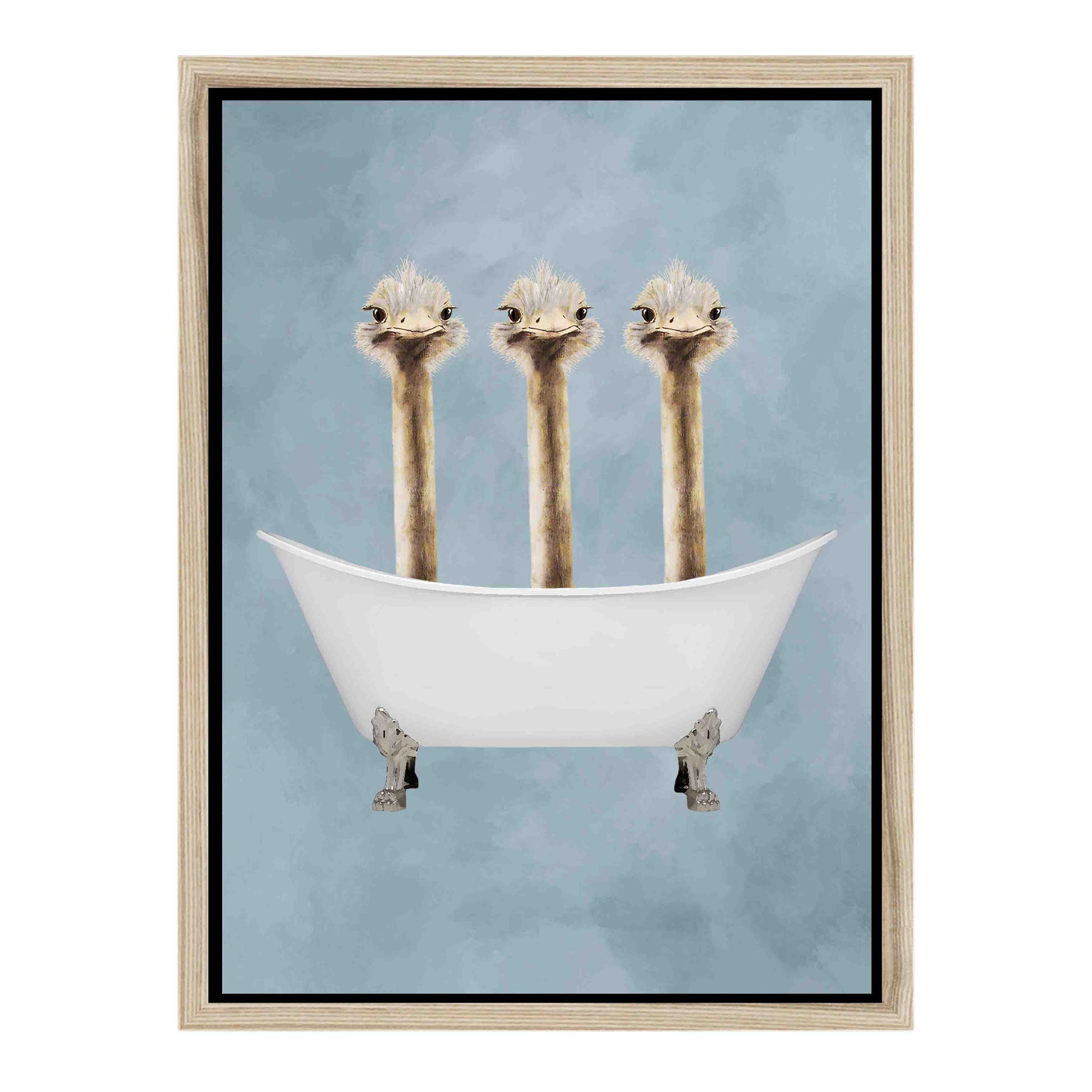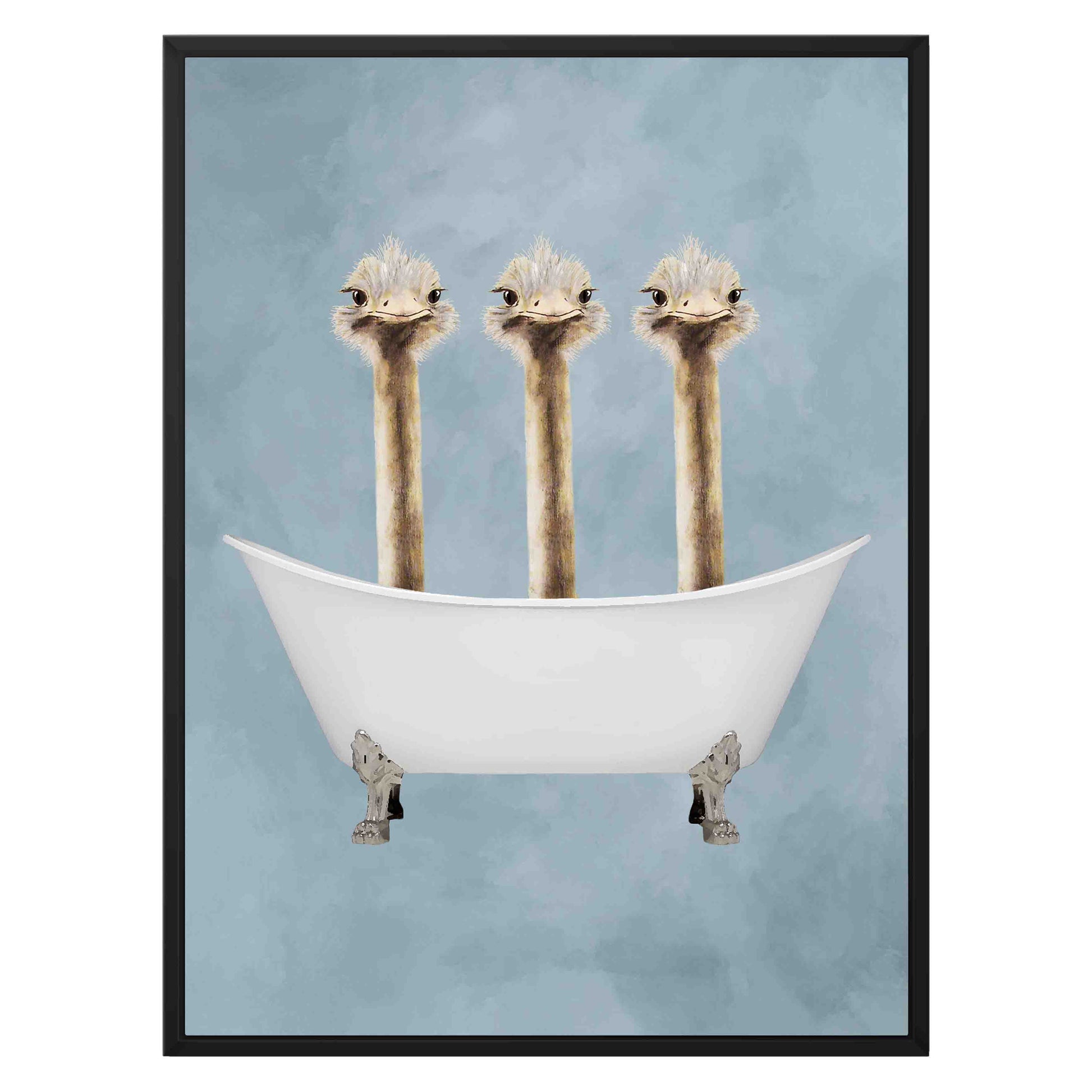 Whimsical canvas print of three OSTRICHES IN BATHTUB. A humorous and surreal wall art piece perfect for bathrooms, laundry rooms, or quirky home decor.