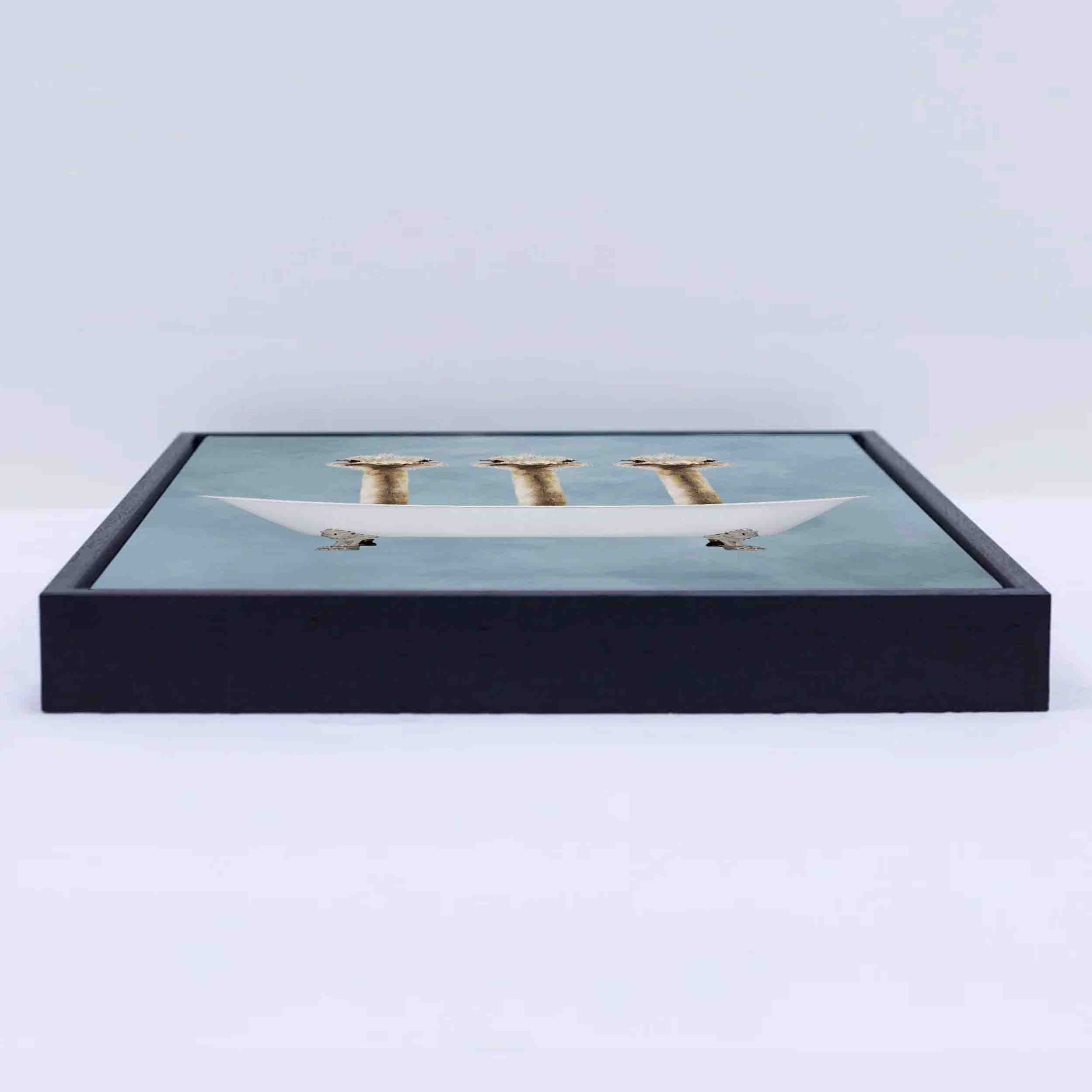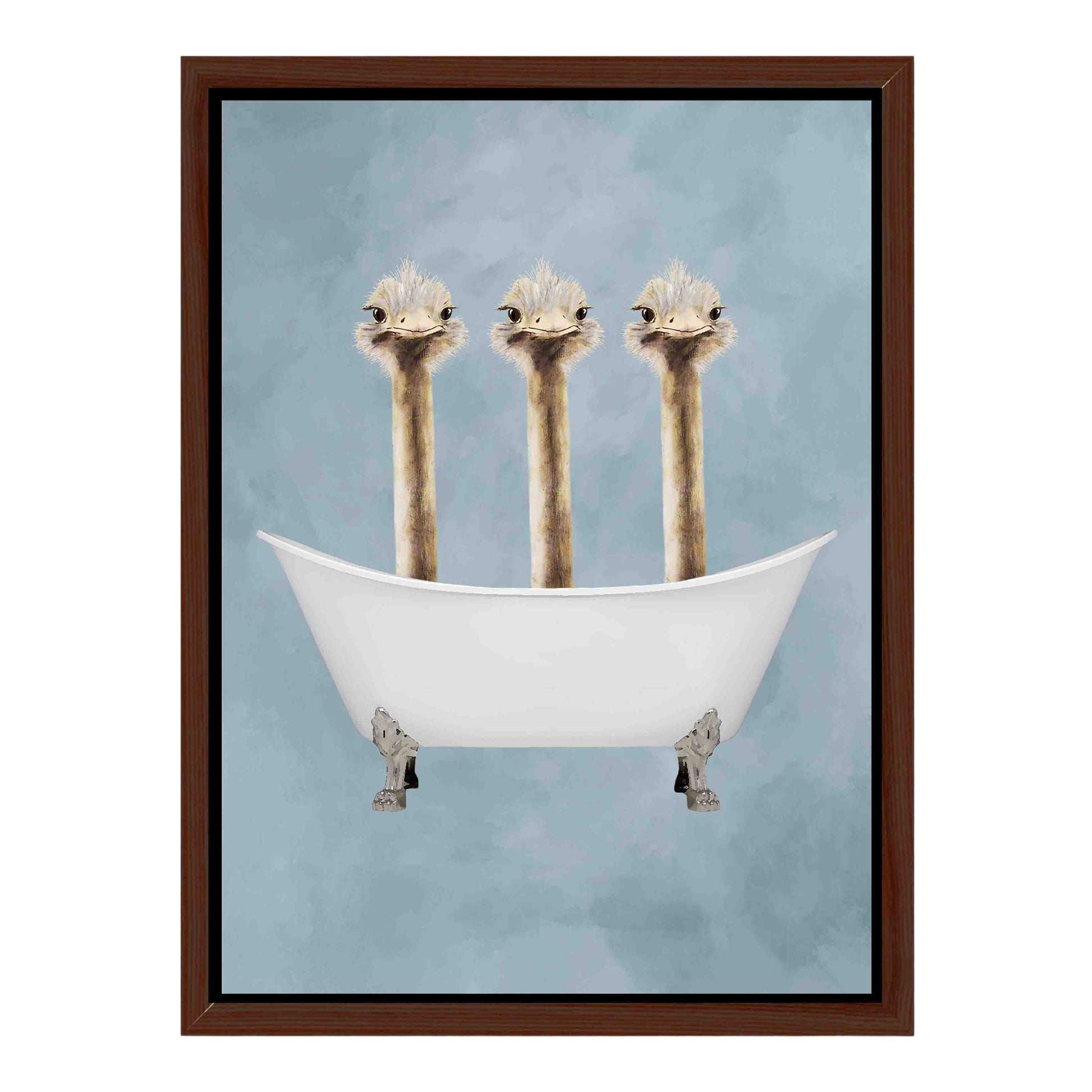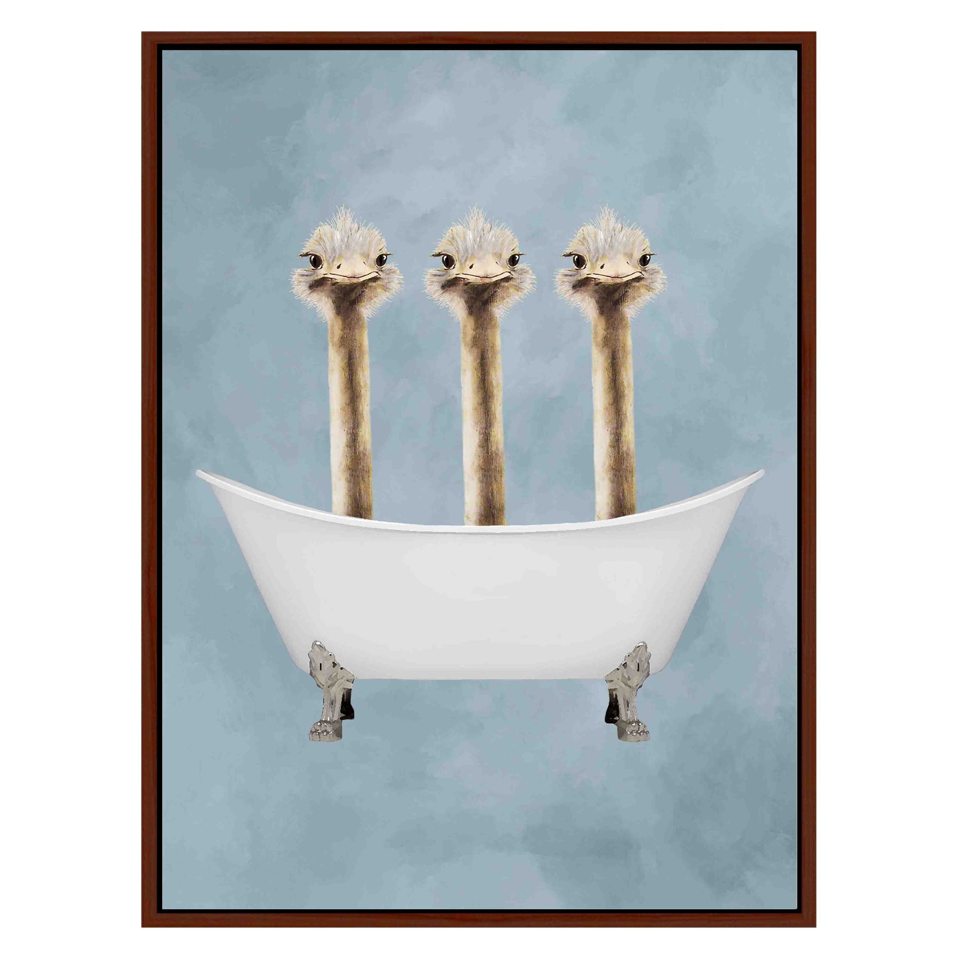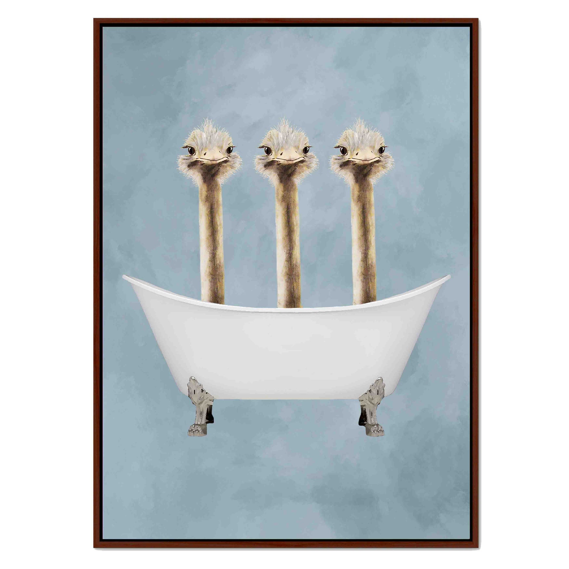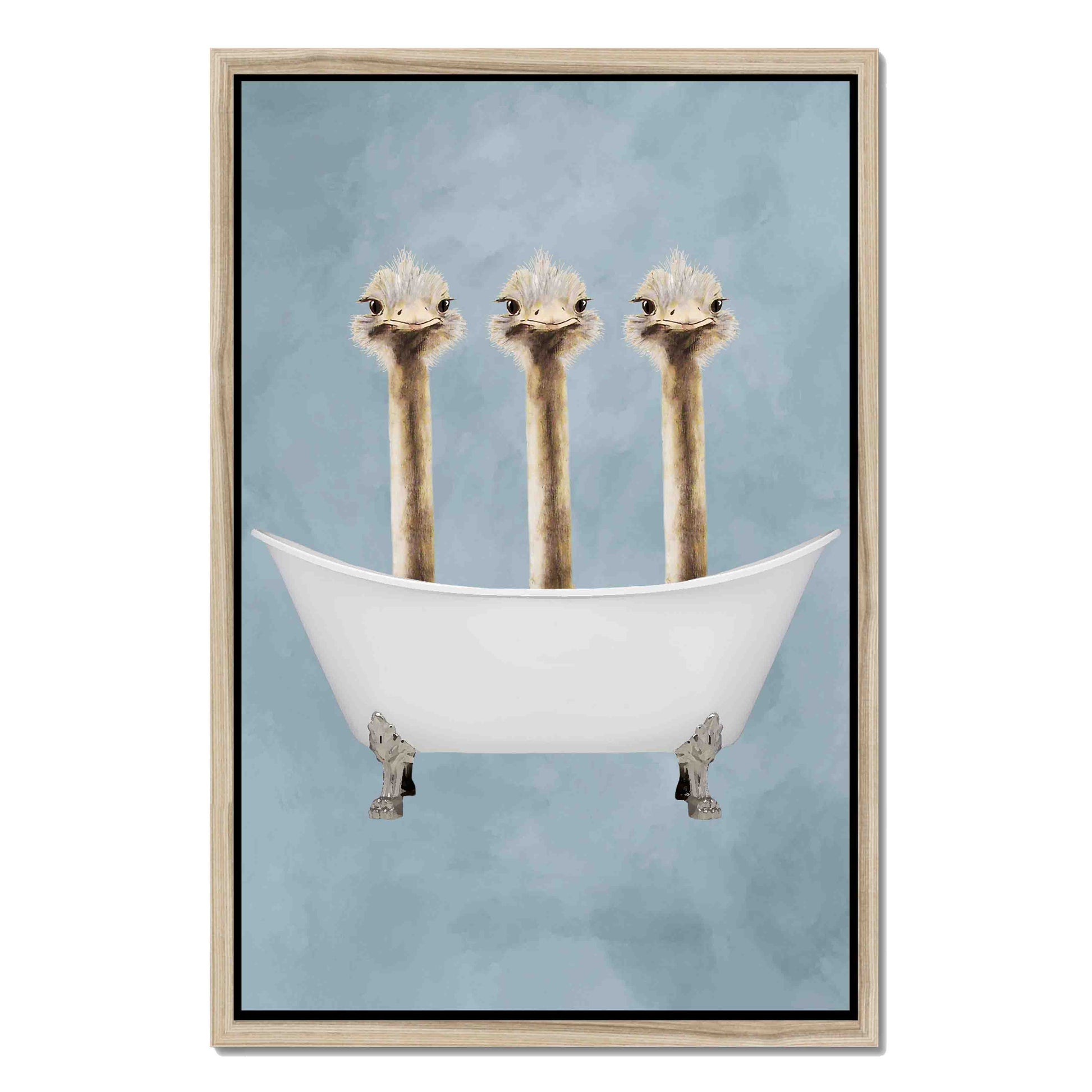 Whimsical canvas print of three OSTRICHES IN BATHTUB. A humorous and surreal wall art piece perfect for bathrooms, laundry rooms, or quirky home decor.