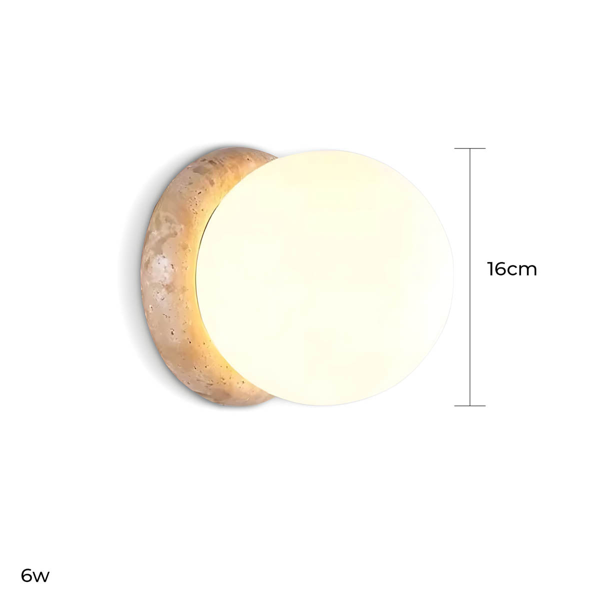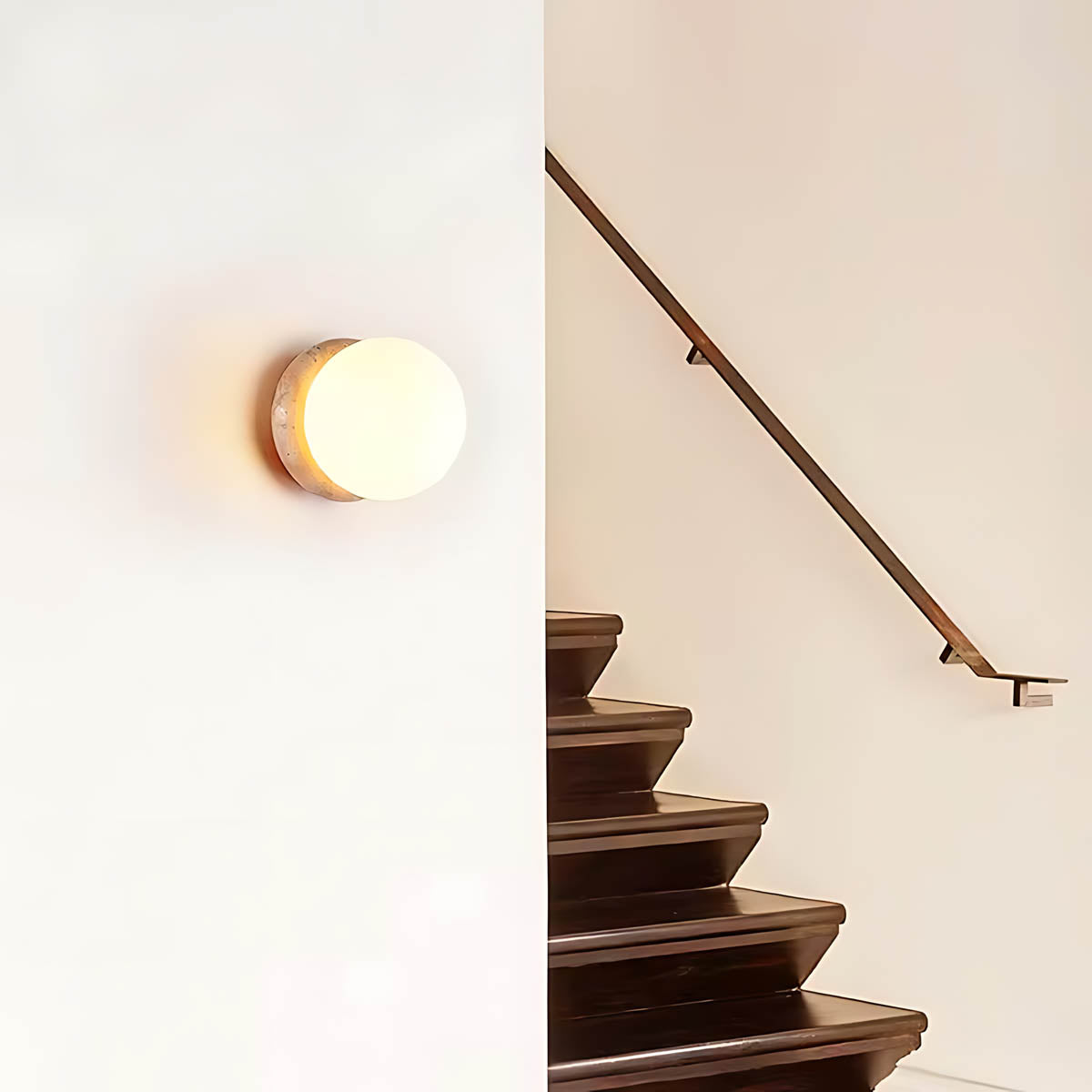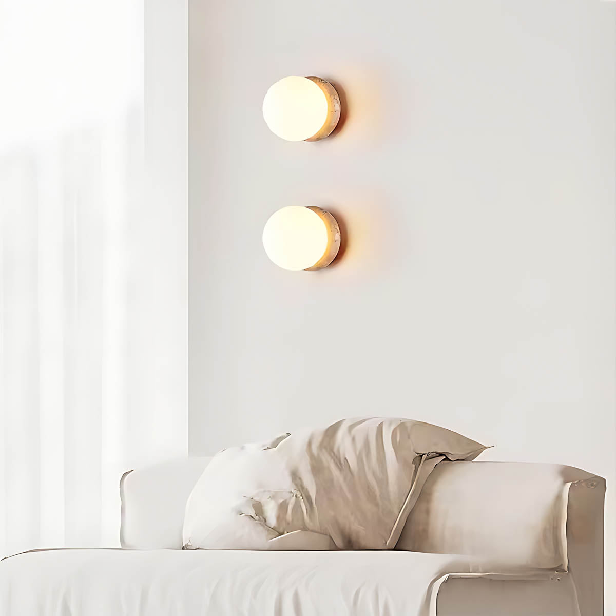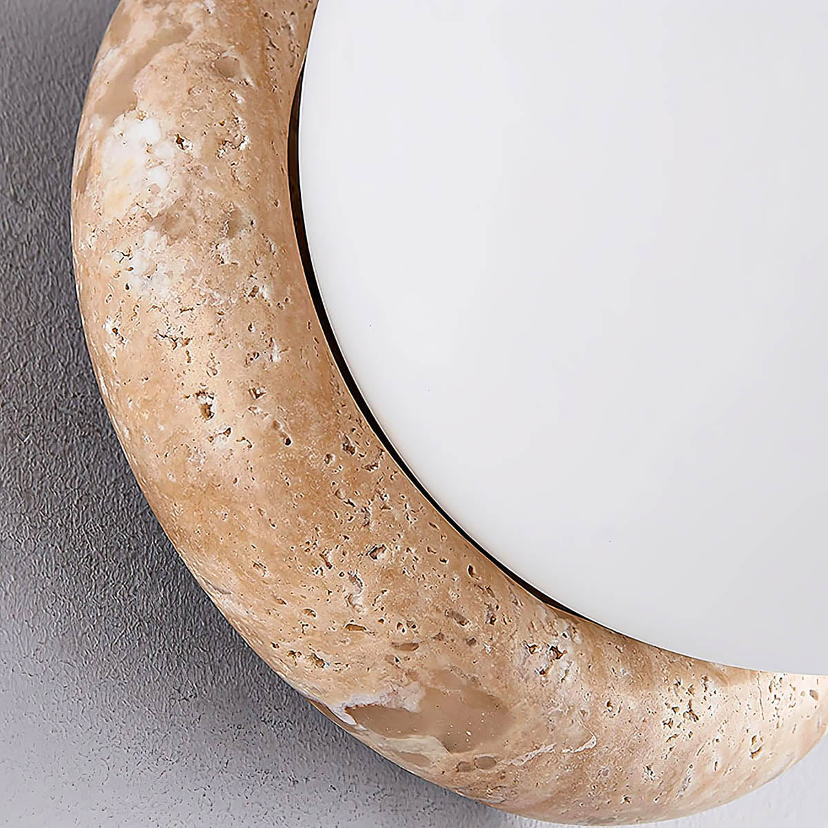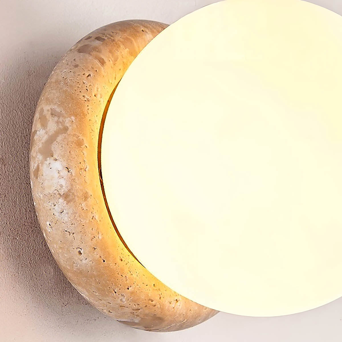 A smooth, rounded travertine ring frames a softly curved glass diffuser, creating a refined, circular silhouette that throws a gentle halo across walls and facades.