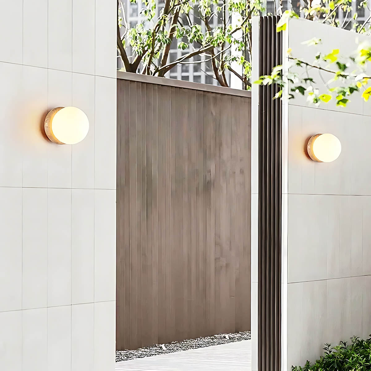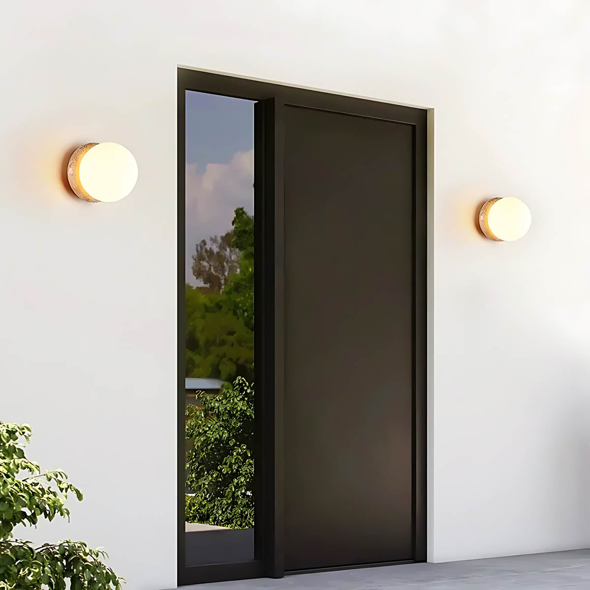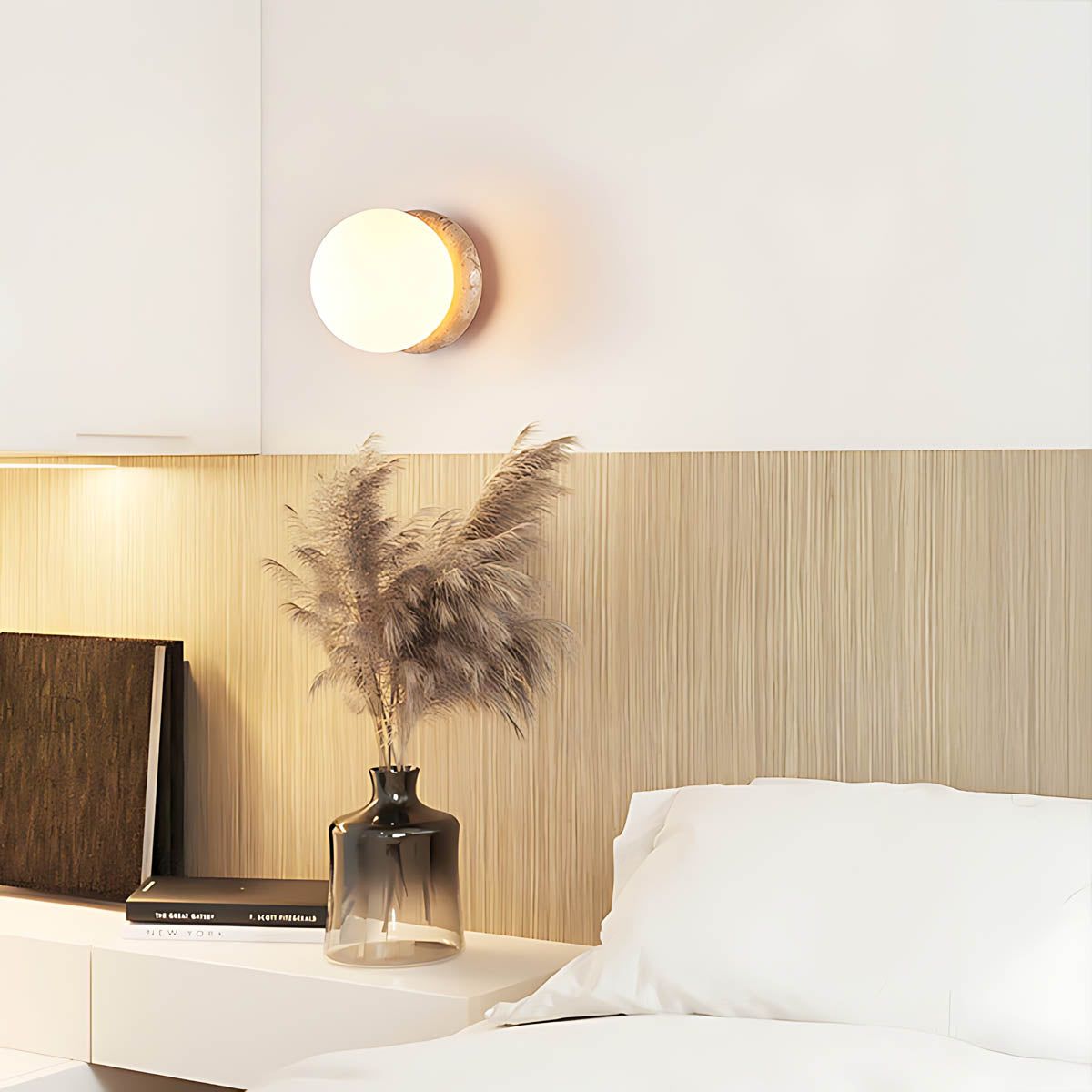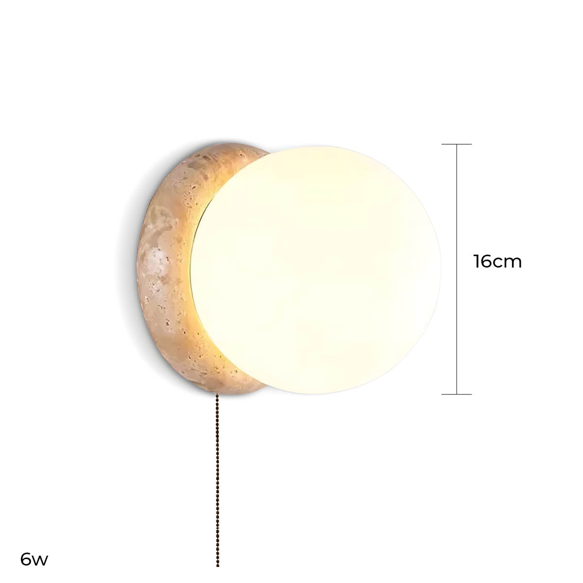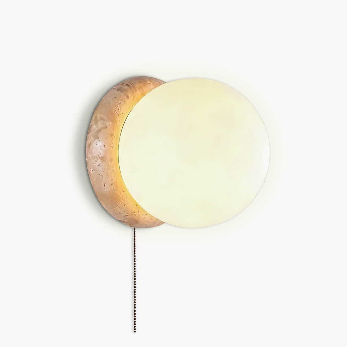 A smooth, rounded travertine ring frames a softly curved glass diffuser, creating a refined, circular silhouette that throws a gentle halo across walls and facades.