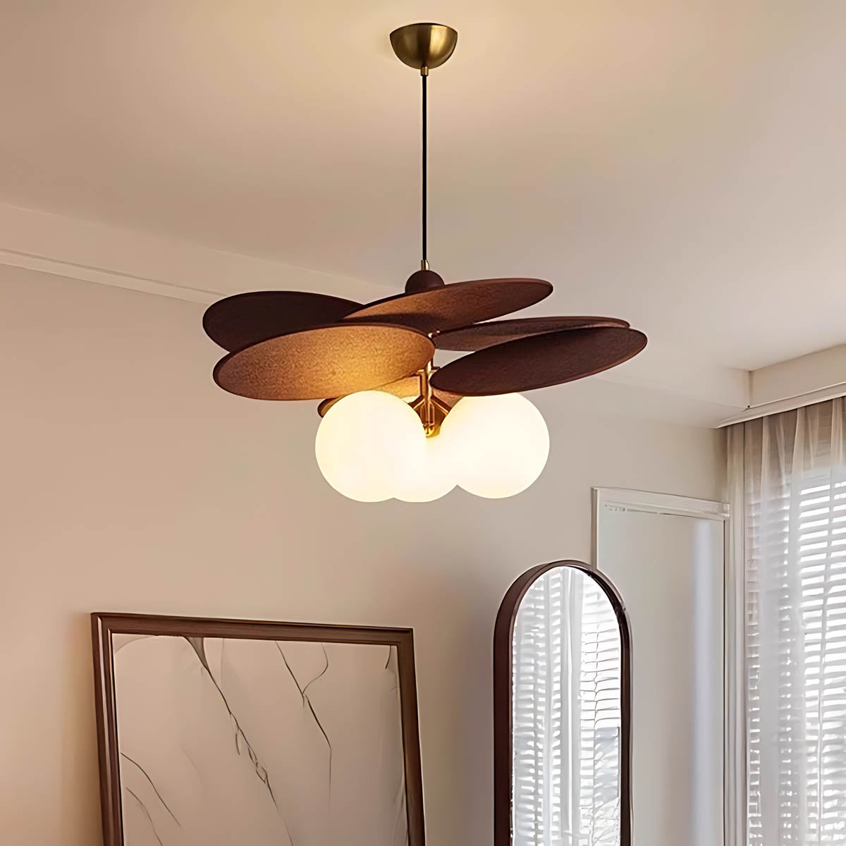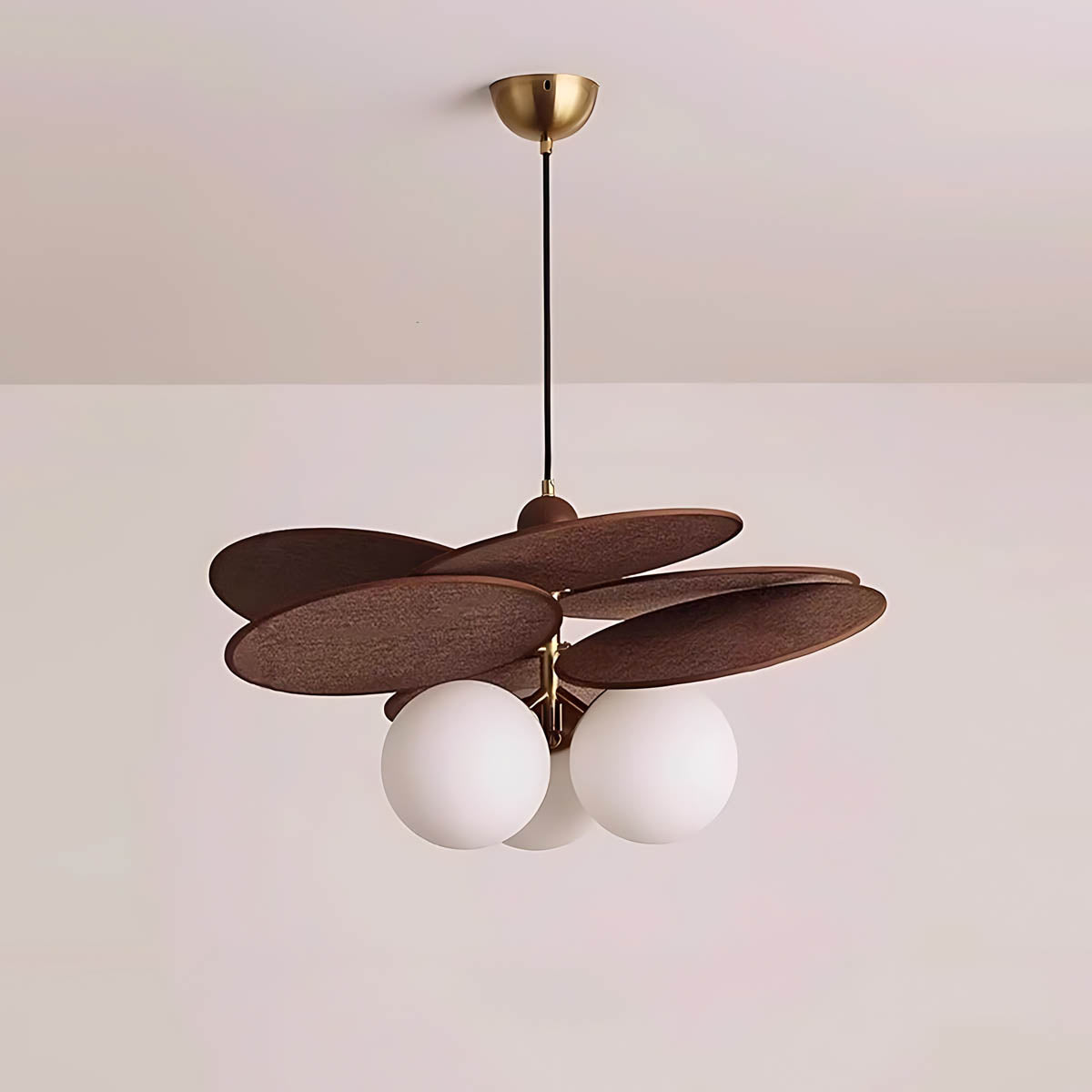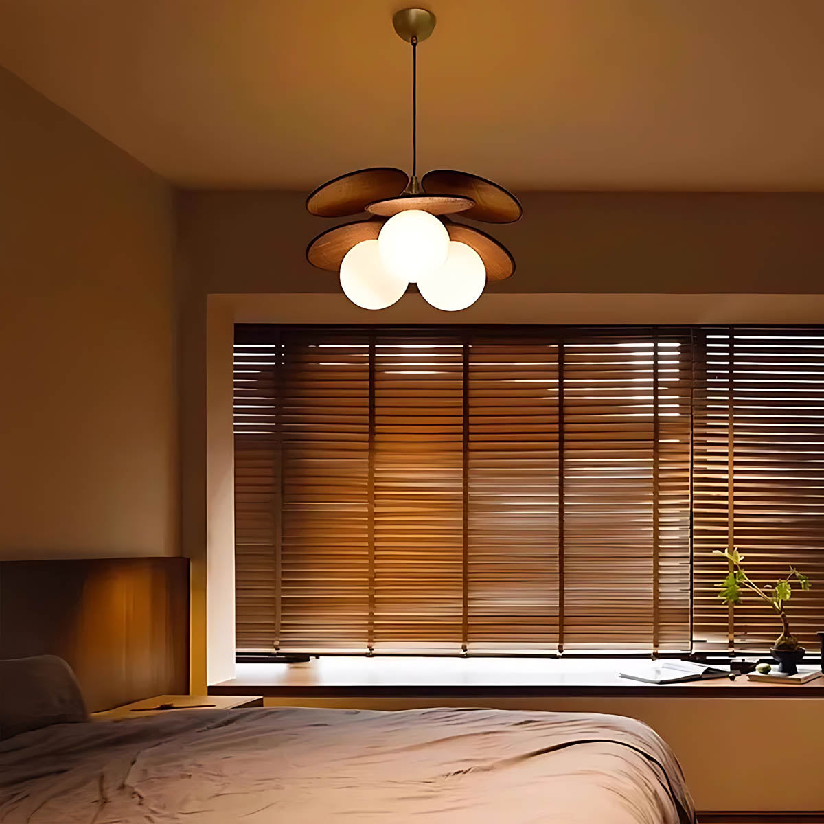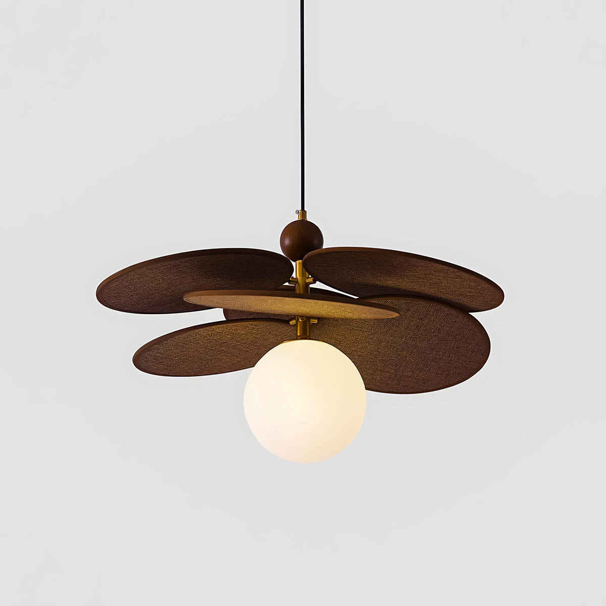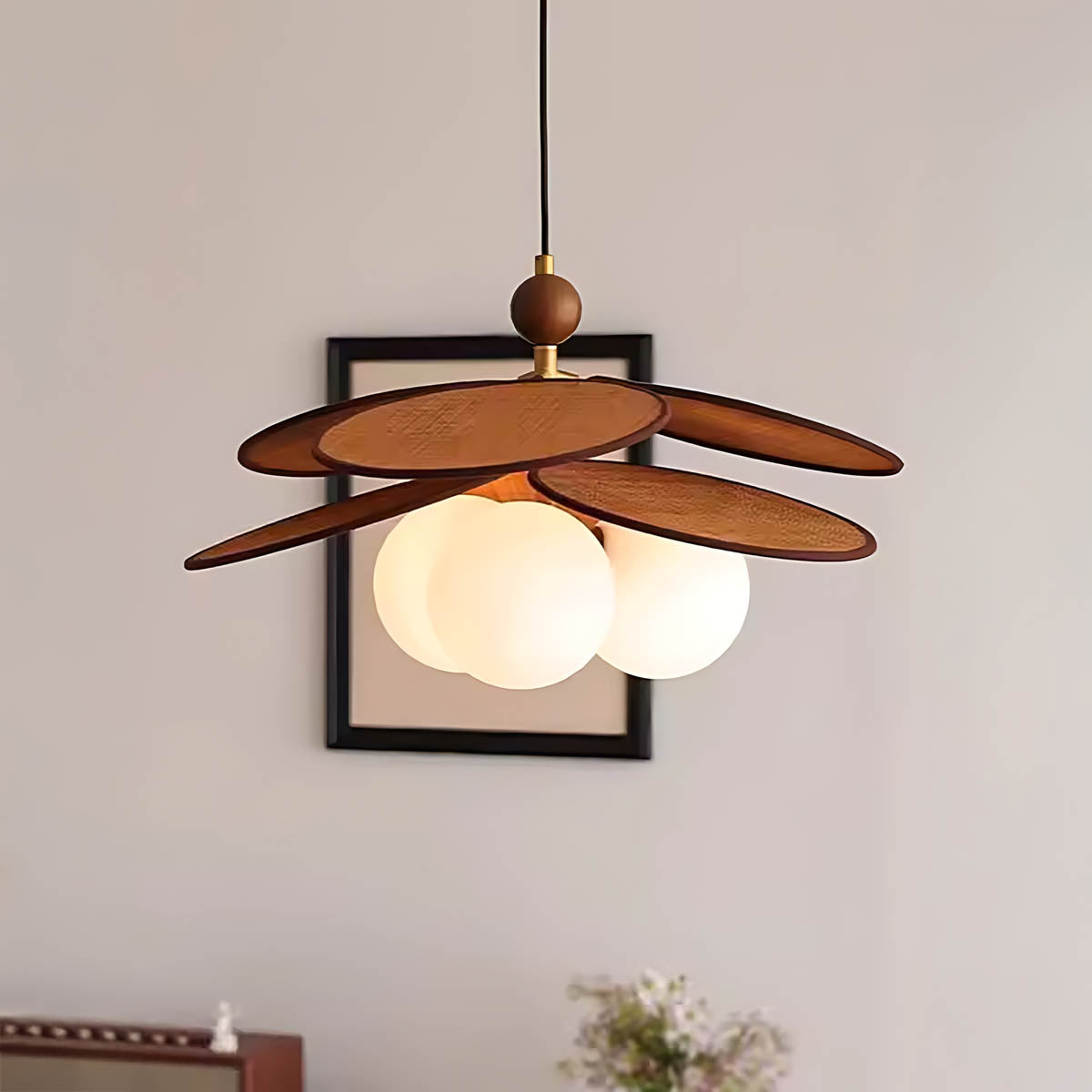 Its layered raffia panels create a petal-like silhouette that surrounds a glowing glass globe, casting a warm, inviting light that transforms any space into a cozy retreat.