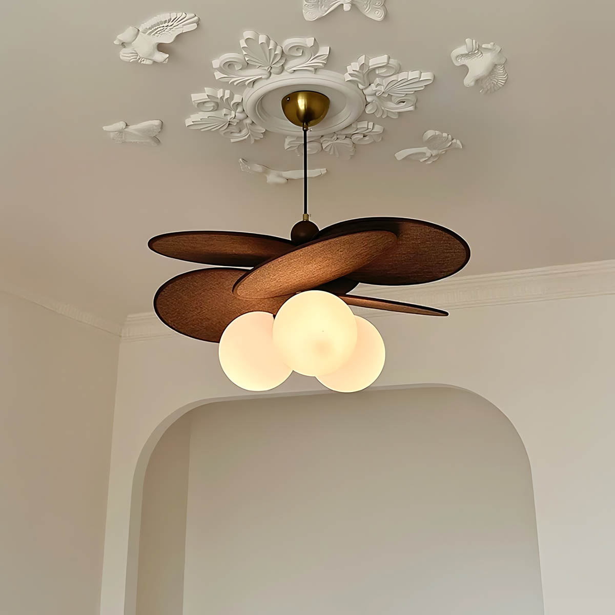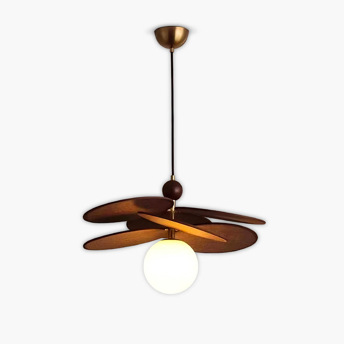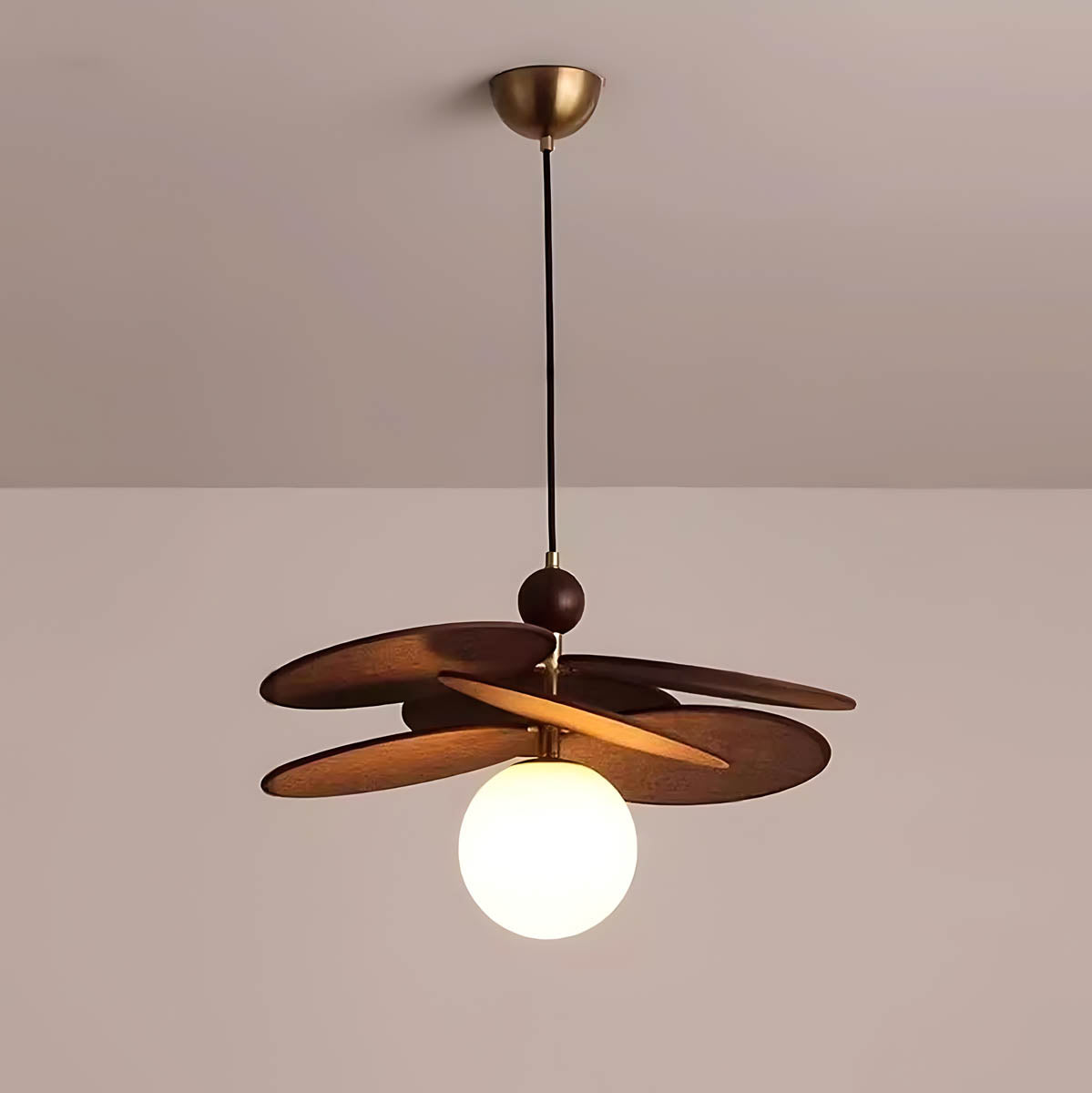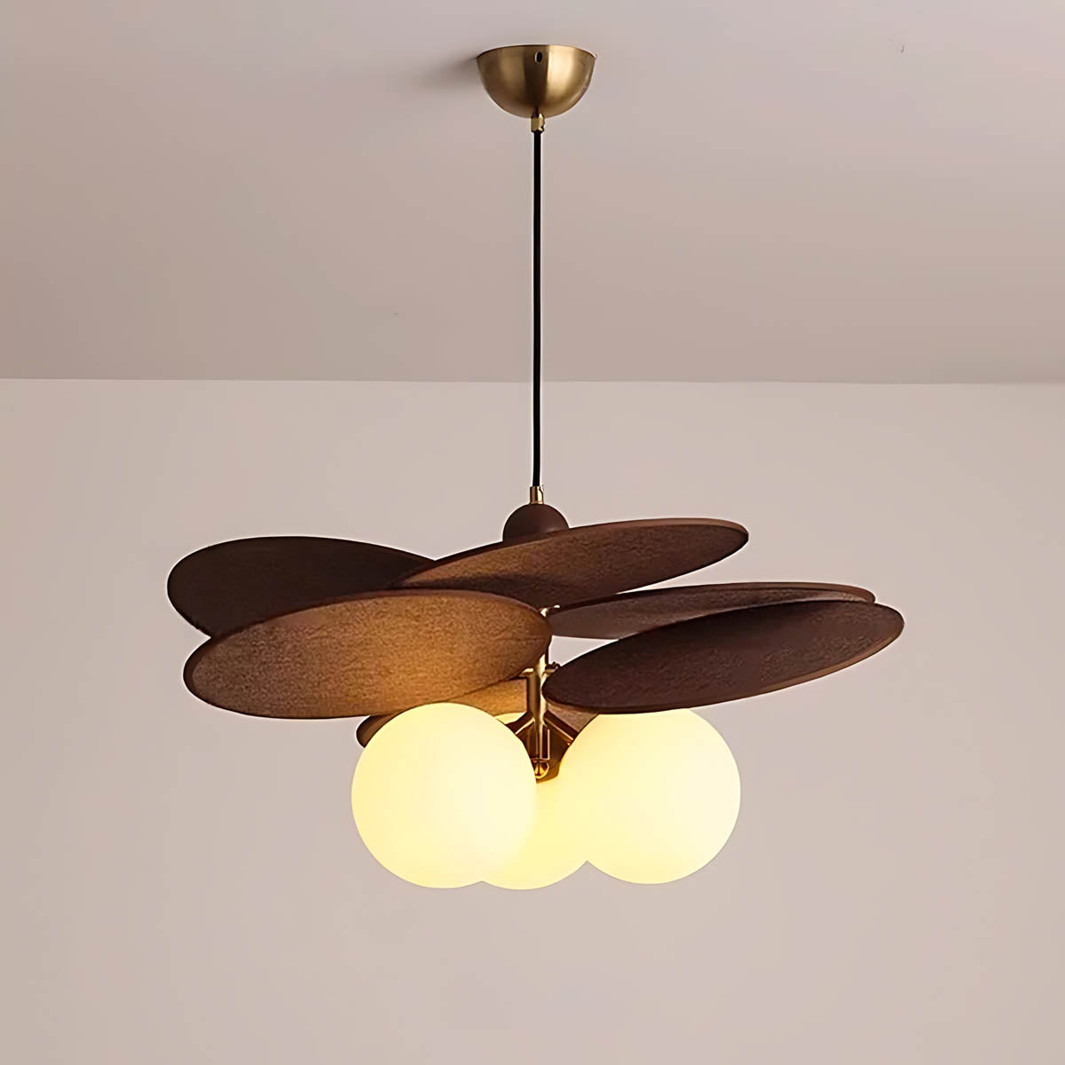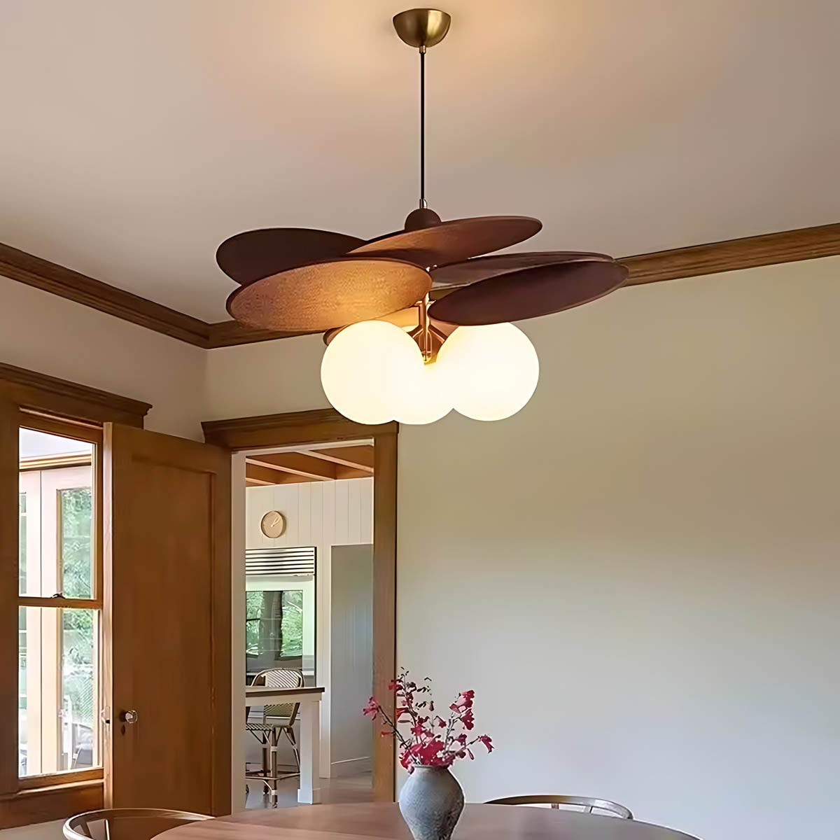 Its layered raffia panels create a petal-like silhouette that surrounds a glowing glass globe, casting a warm, inviting light that transforms any space into a cozy retreat.
