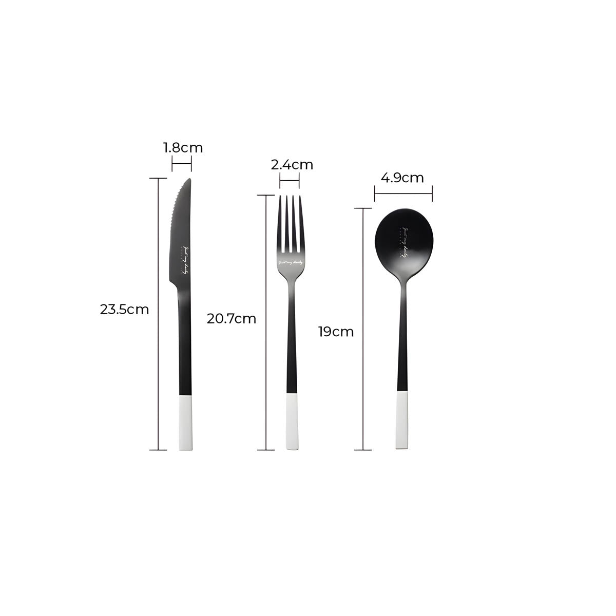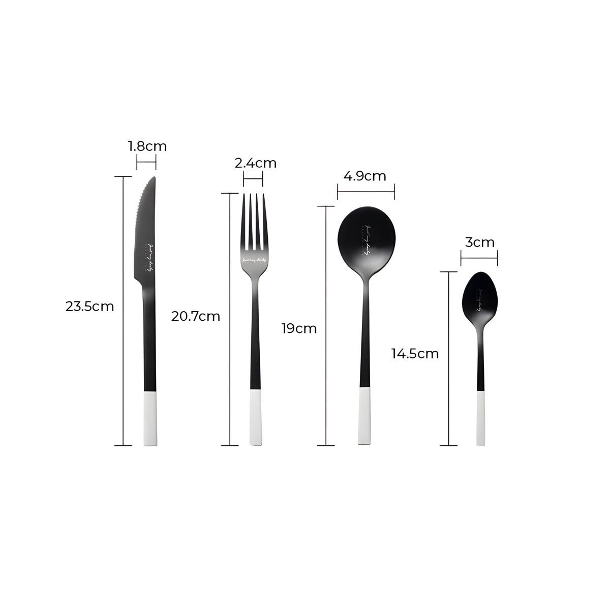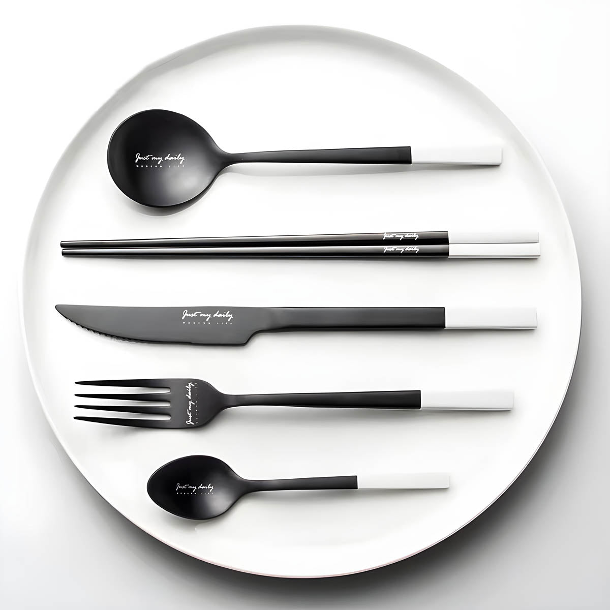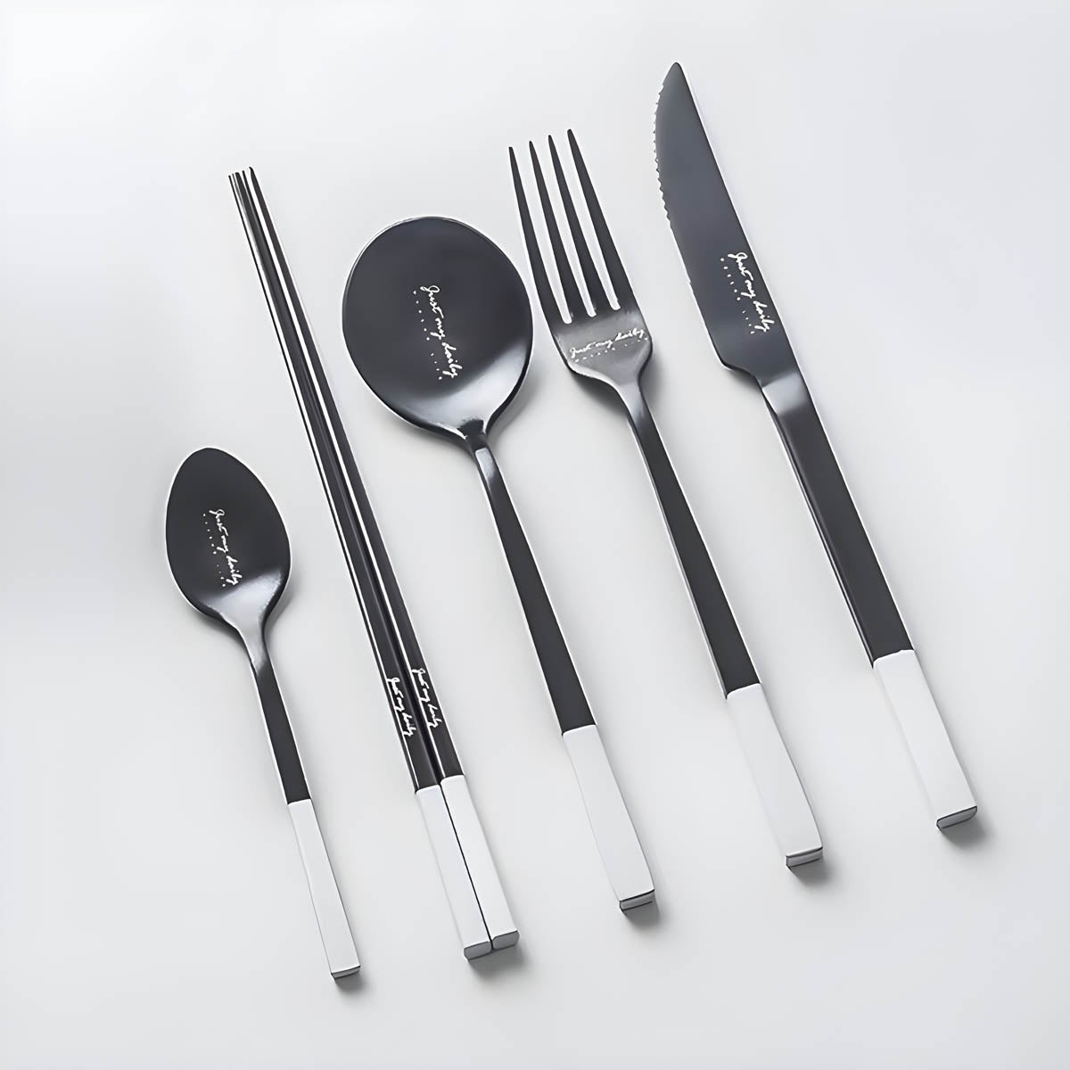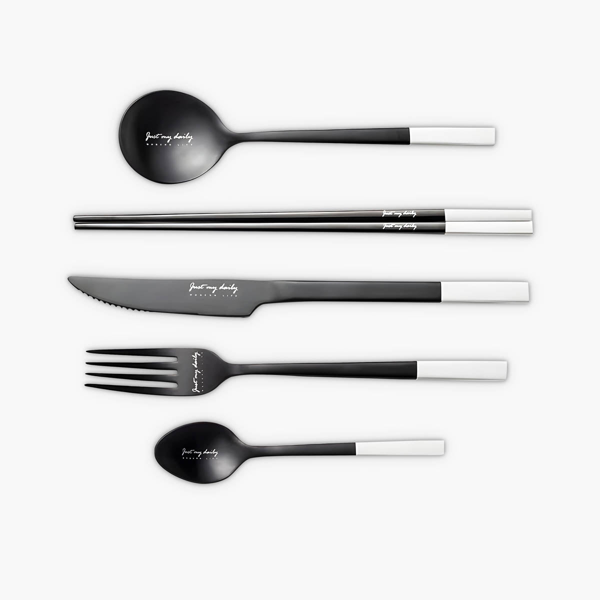 Each piece — from the pointed dinner knife and fork to the deep-bowl soup spoon, petite teaspoon and matching chopsticks — features a matte black upper half seamlessly transitioning to a crisp white, square-edged handle for a contemporary, sculptural silhouette.