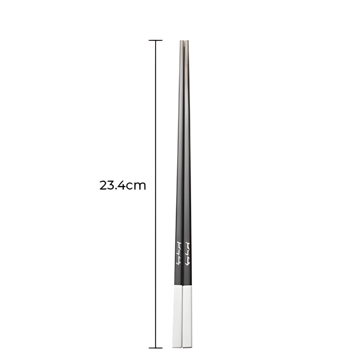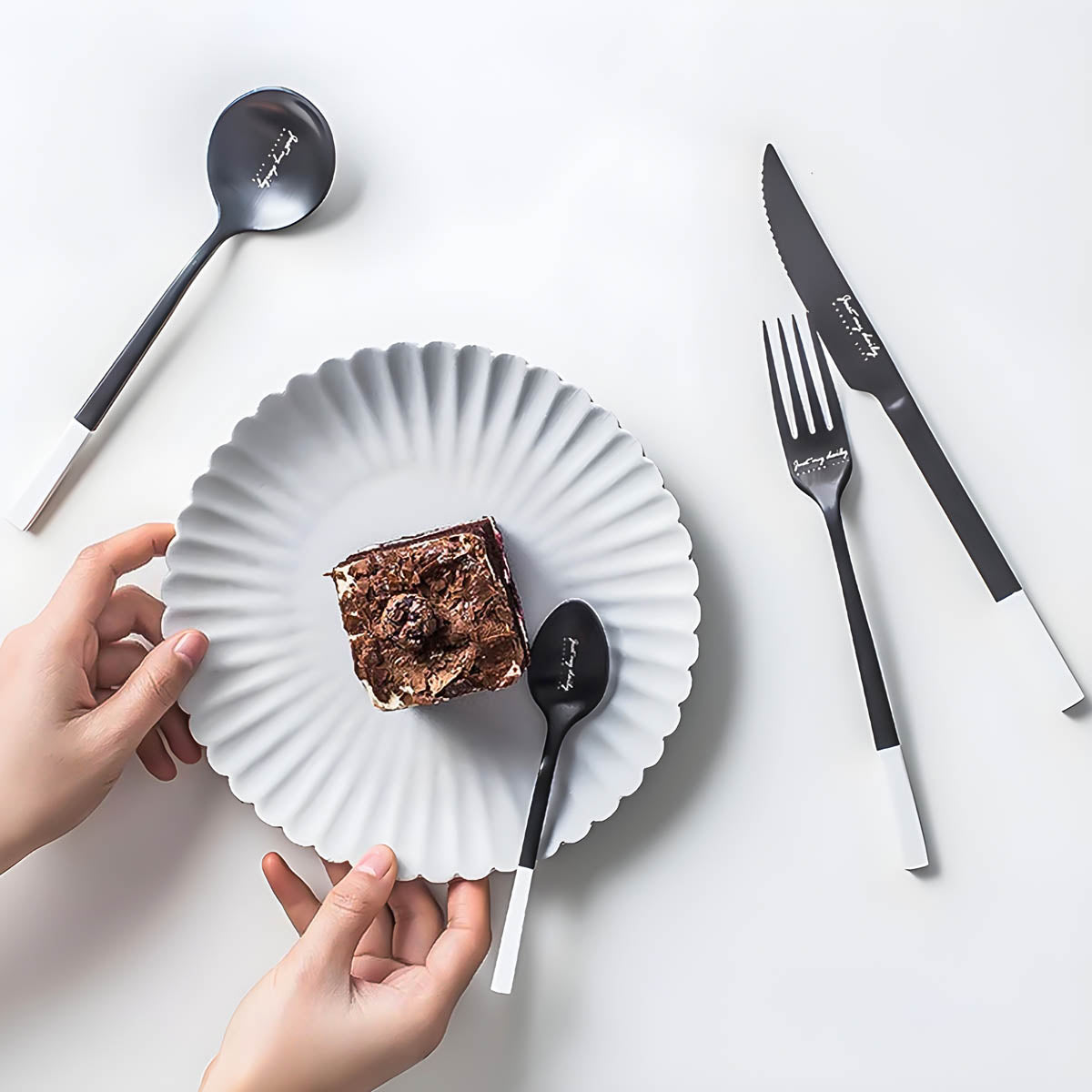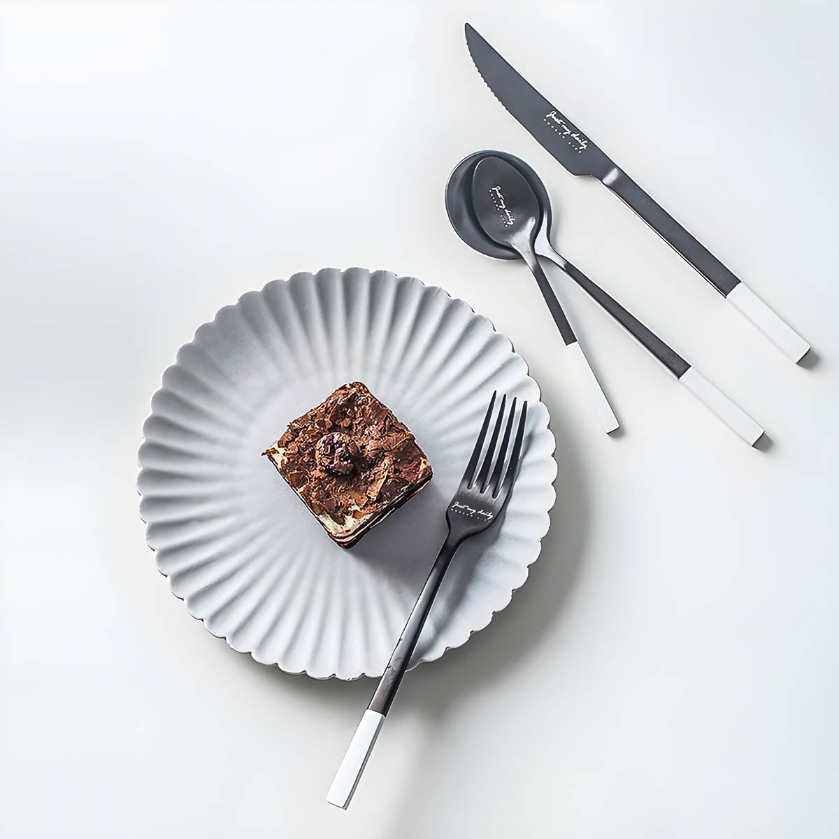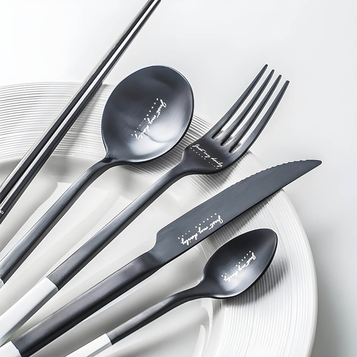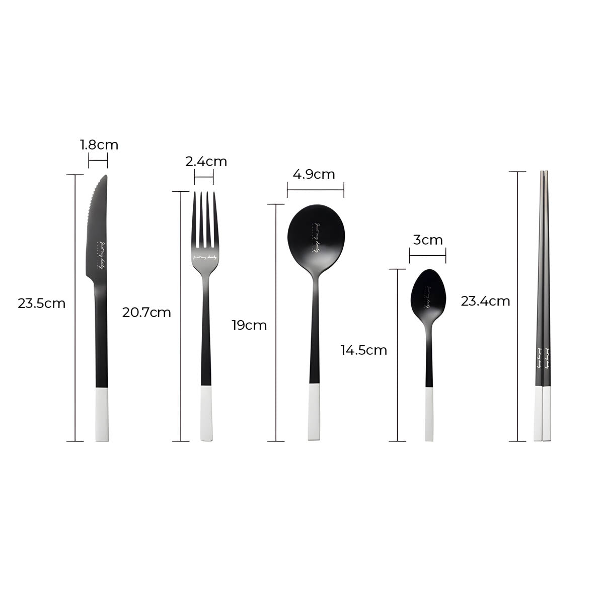 Each piece — from the pointed dinner knife and fork to the deep-bowl soup spoon, petite teaspoon and matching chopsticks — features a matte black upper half seamlessly transitioning to a crisp white, square-edged handle for a contemporary, sculptural silhouette.