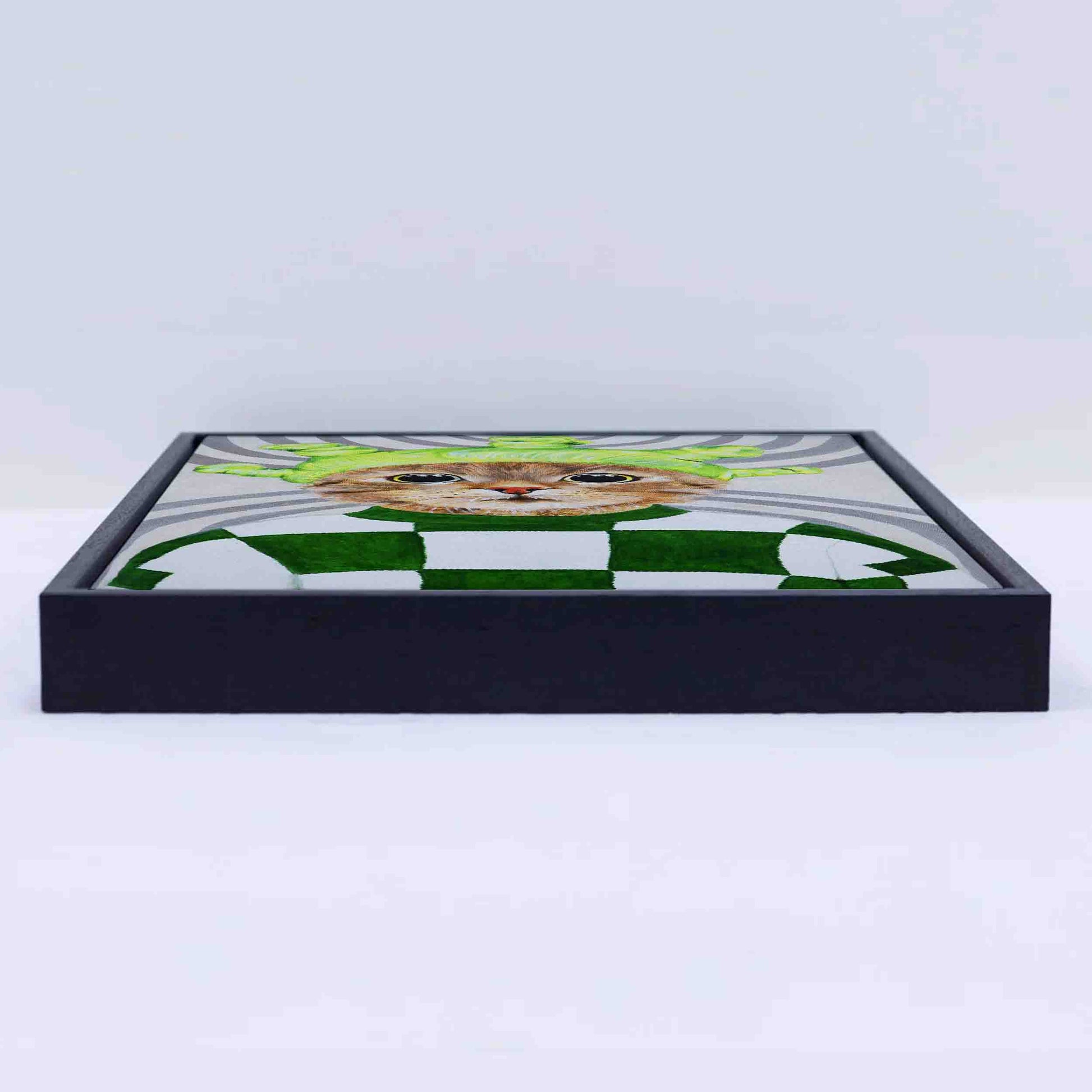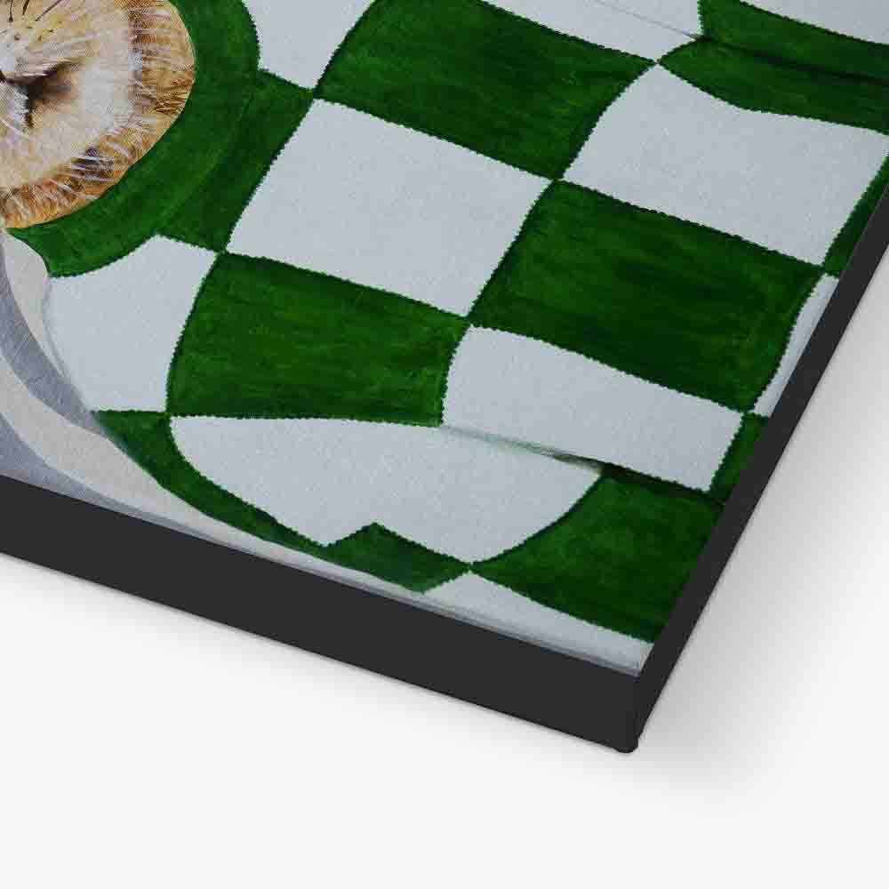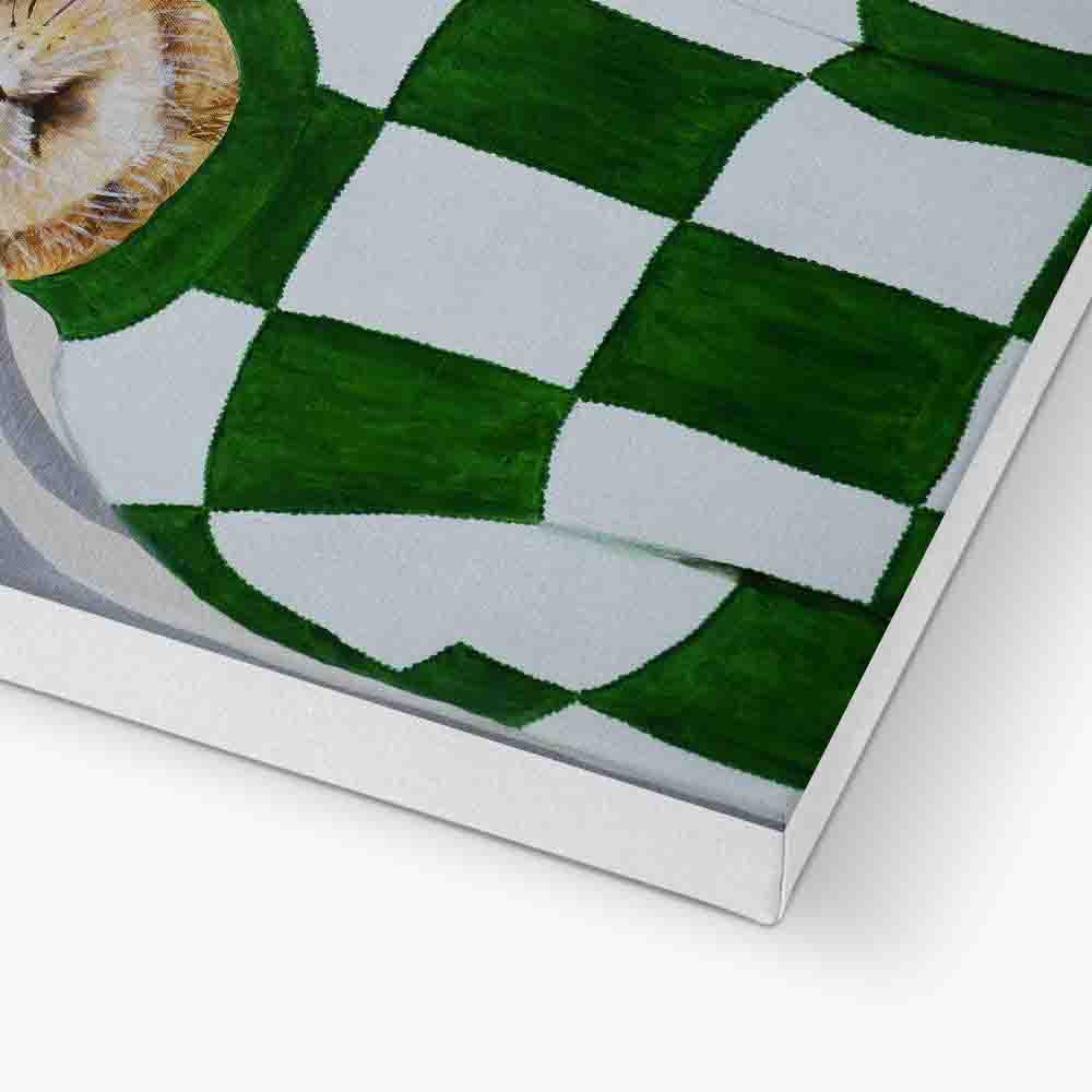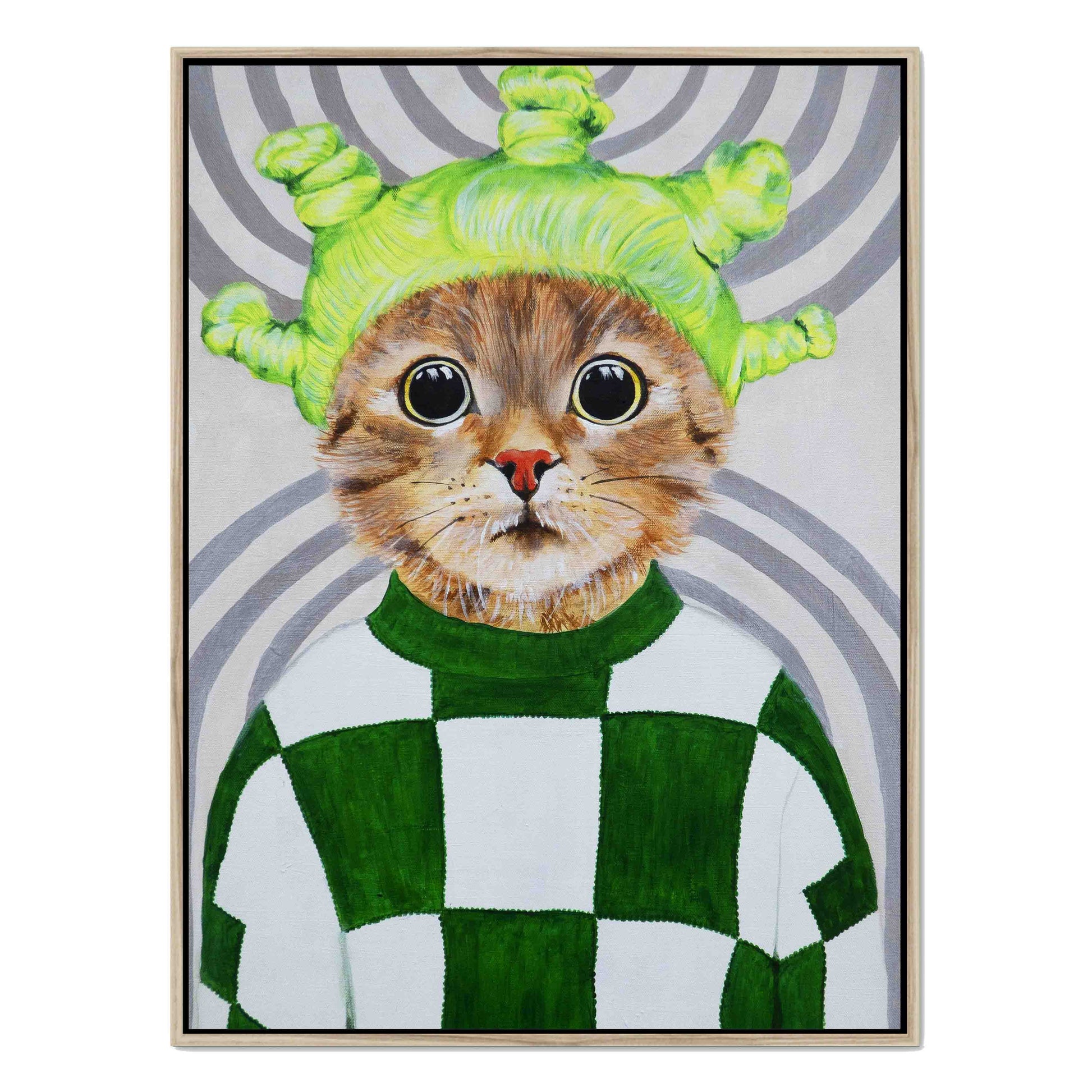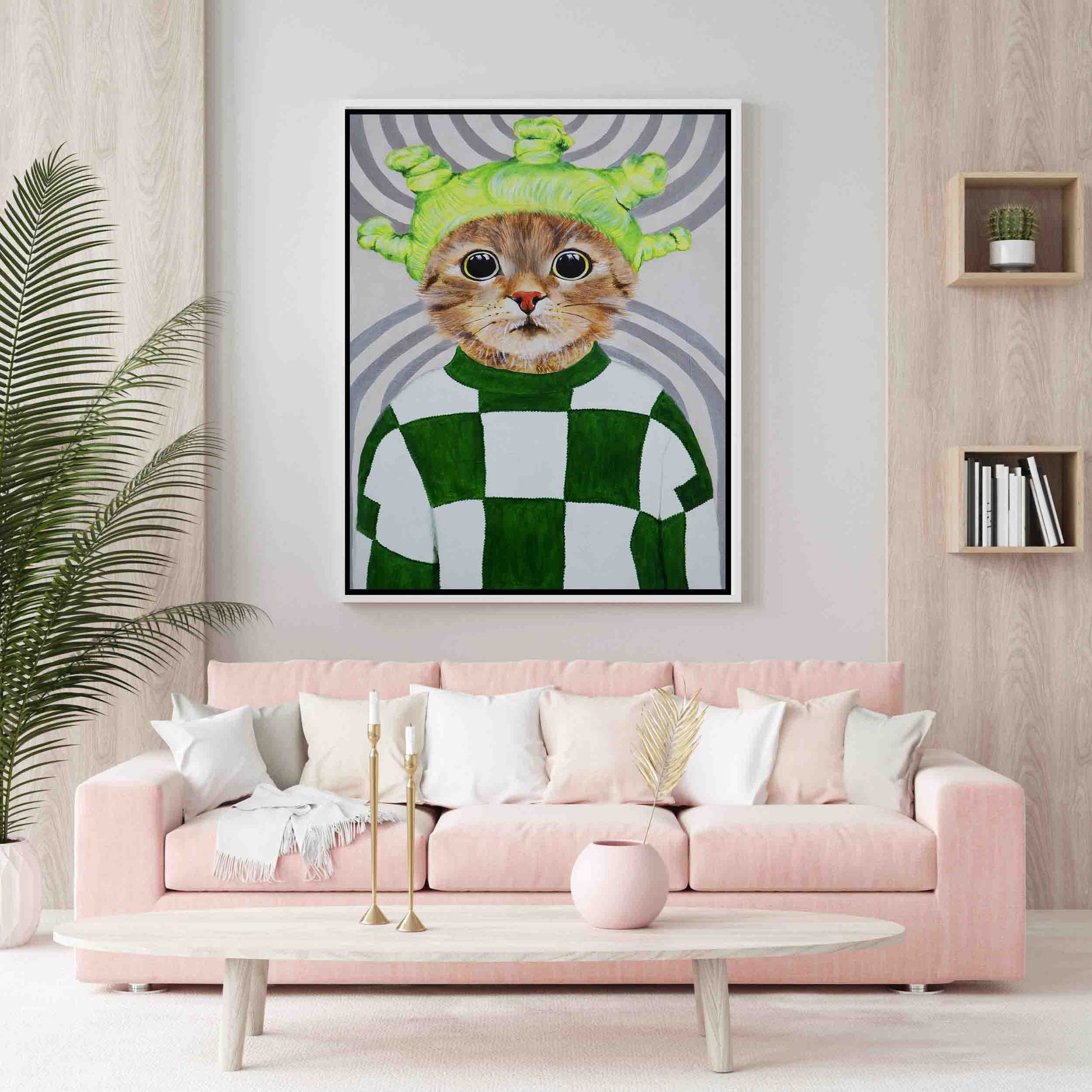 Whimsical canvas print of a cat in a retro green checkered sweater and quirky hat. A playful, surreal wall art piece perfect for cat lovers and vintage decor fans.