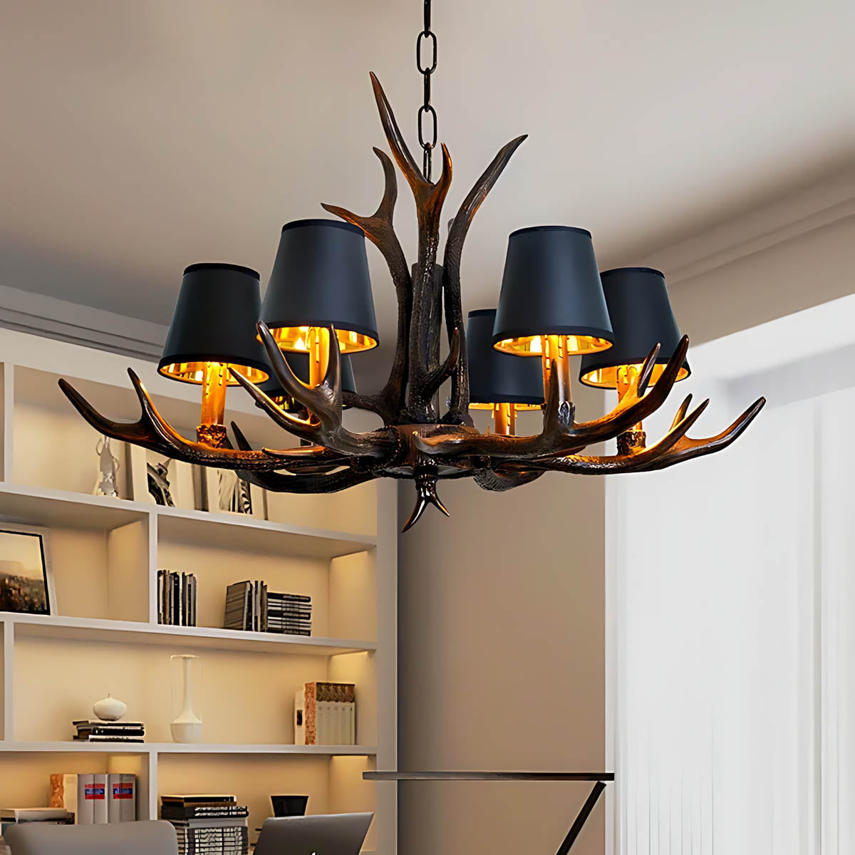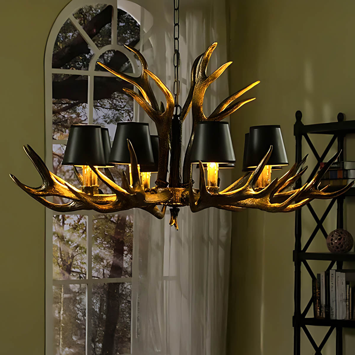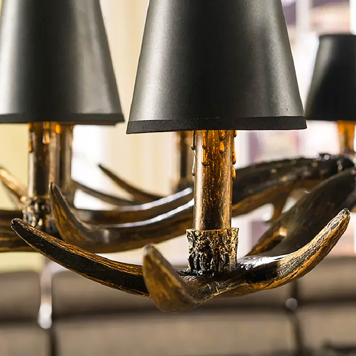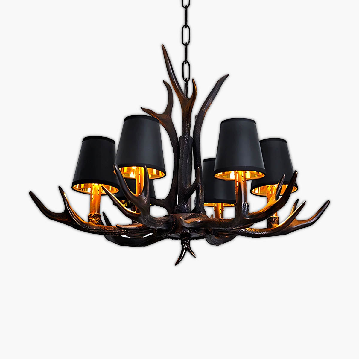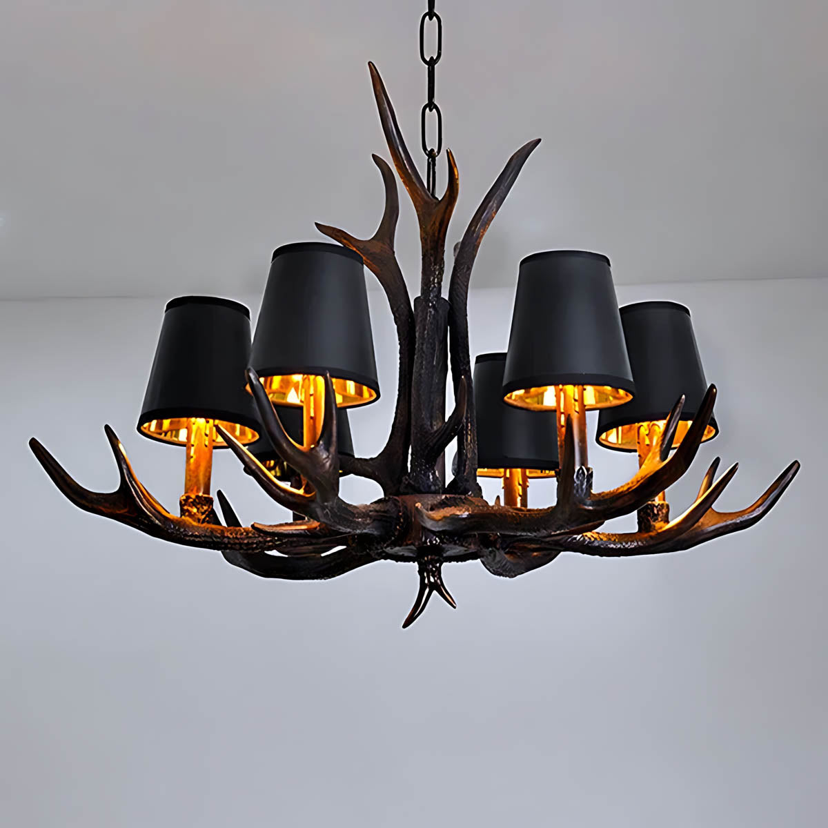 Each of its sculptural arms holds a black lampshade with a warm golden interior, casting a rich, ambient glow that transforms dining rooms, living areas, or entryways into cozy, lodge-like retreats.