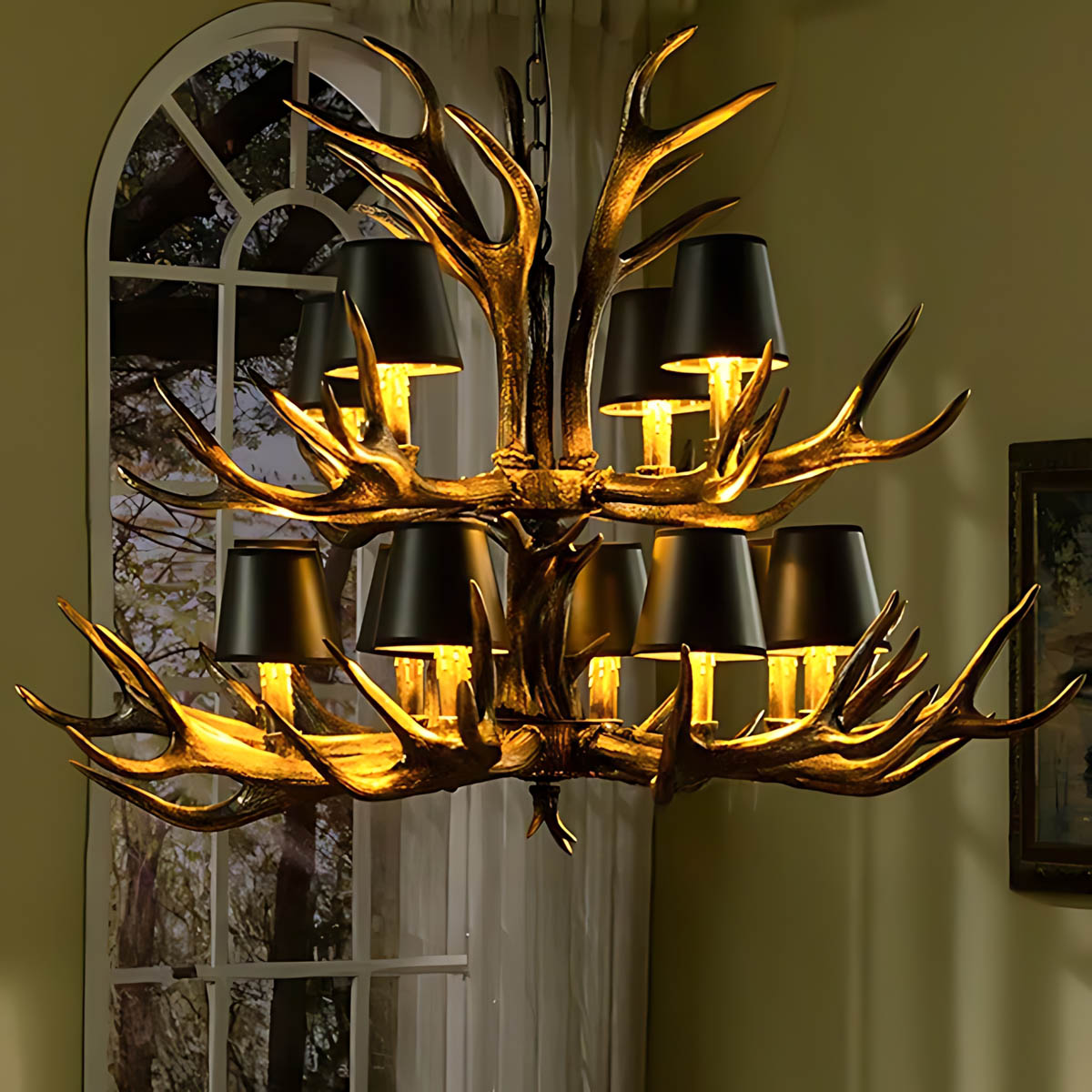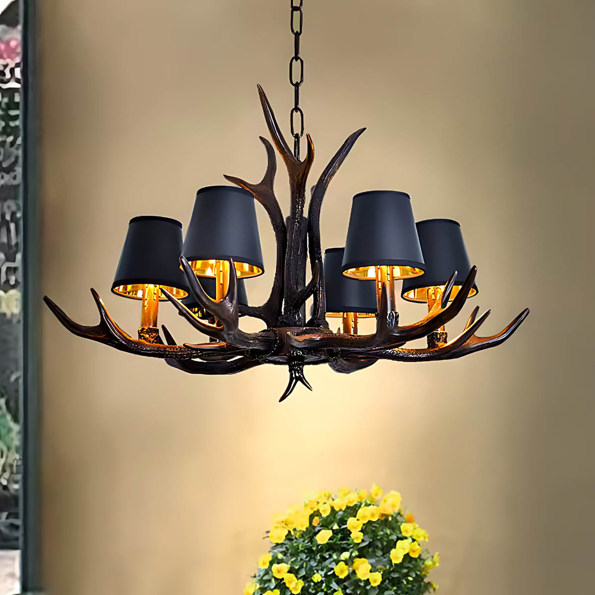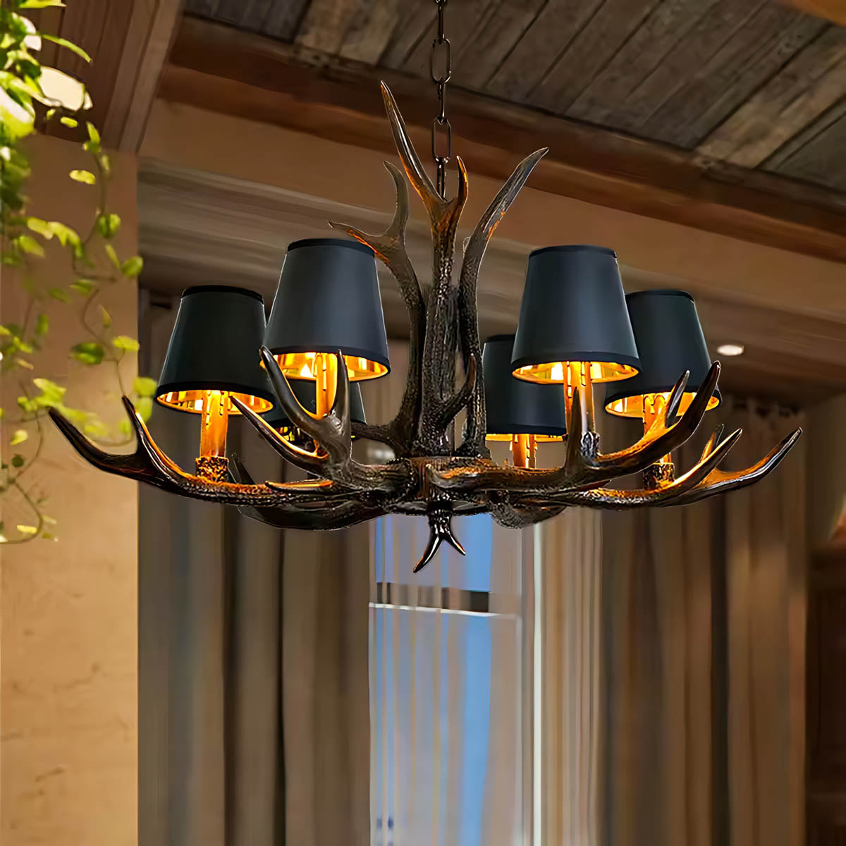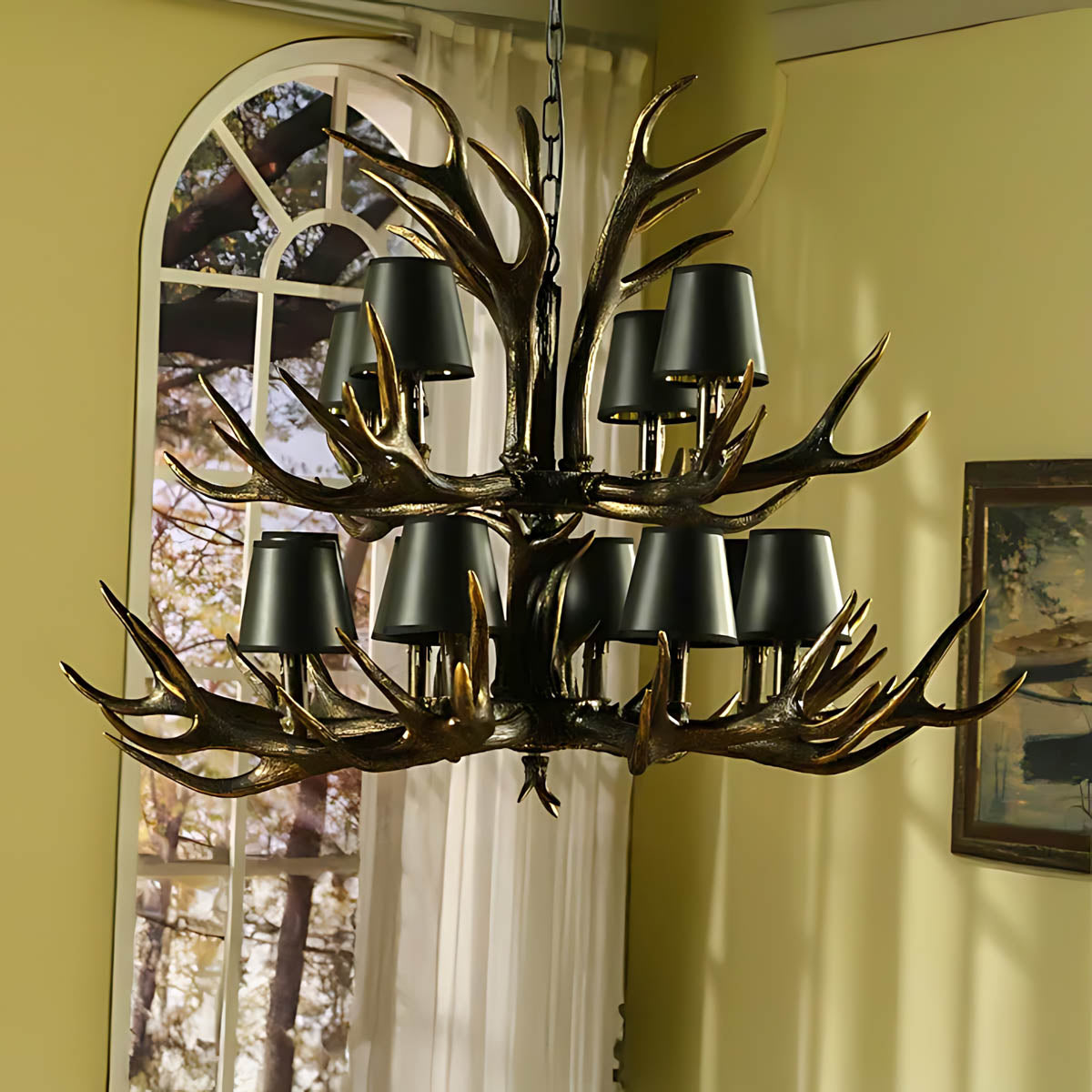 Each of its sculptural arms holds a black lampshade with a warm golden interior, casting a rich, ambient glow that transforms dining rooms, living areas, or entryways into cozy, lodge-like retreats.