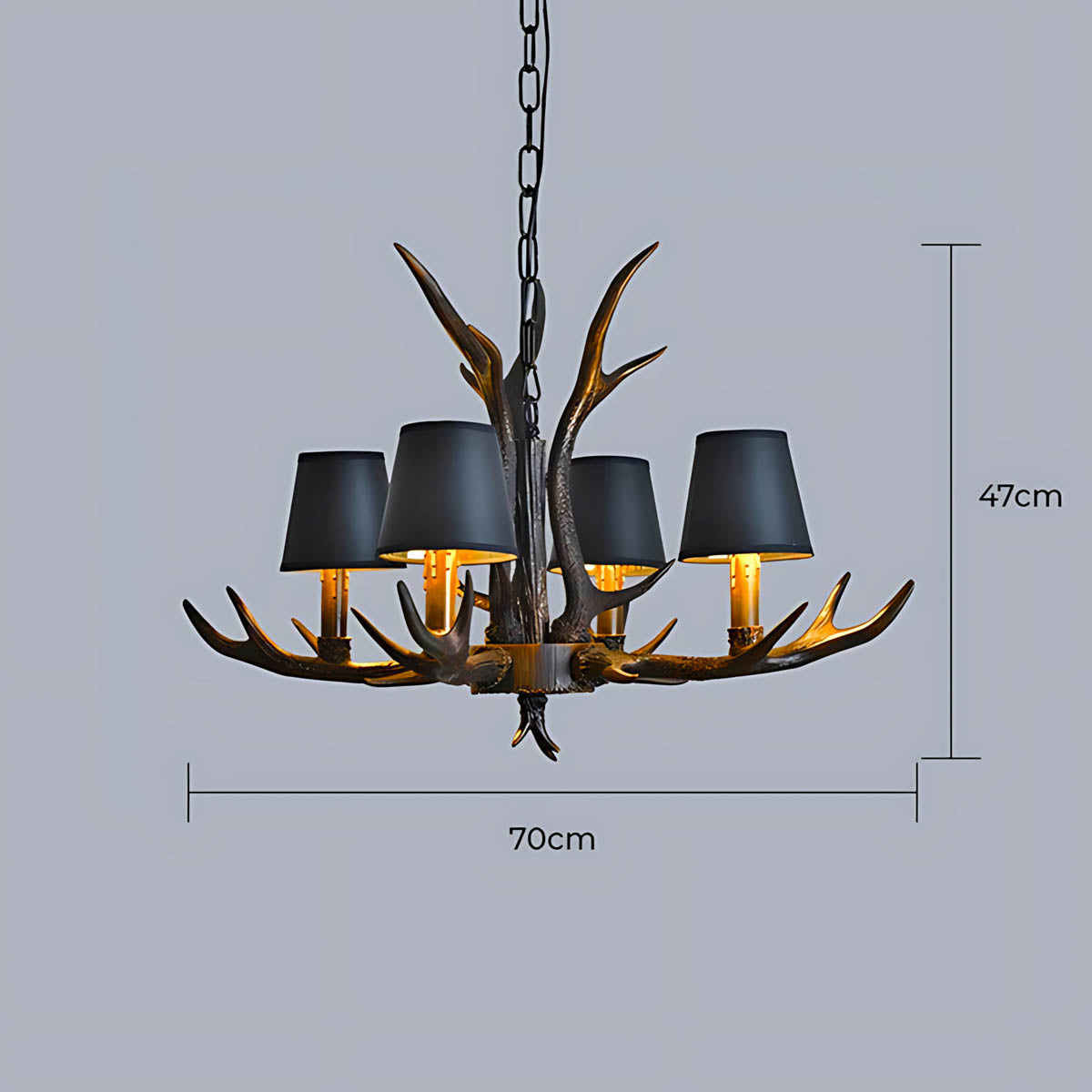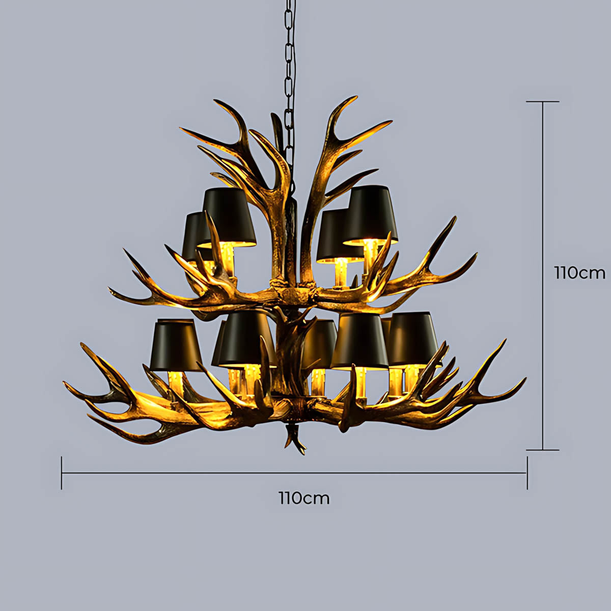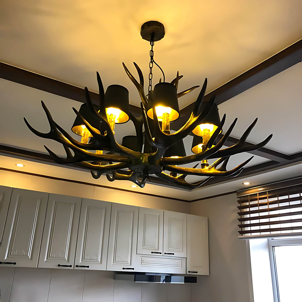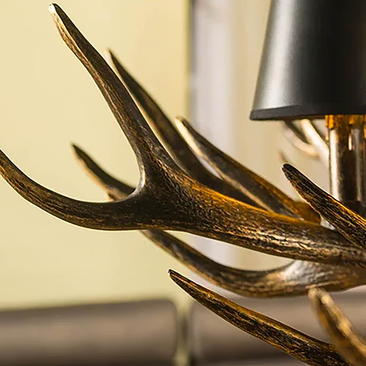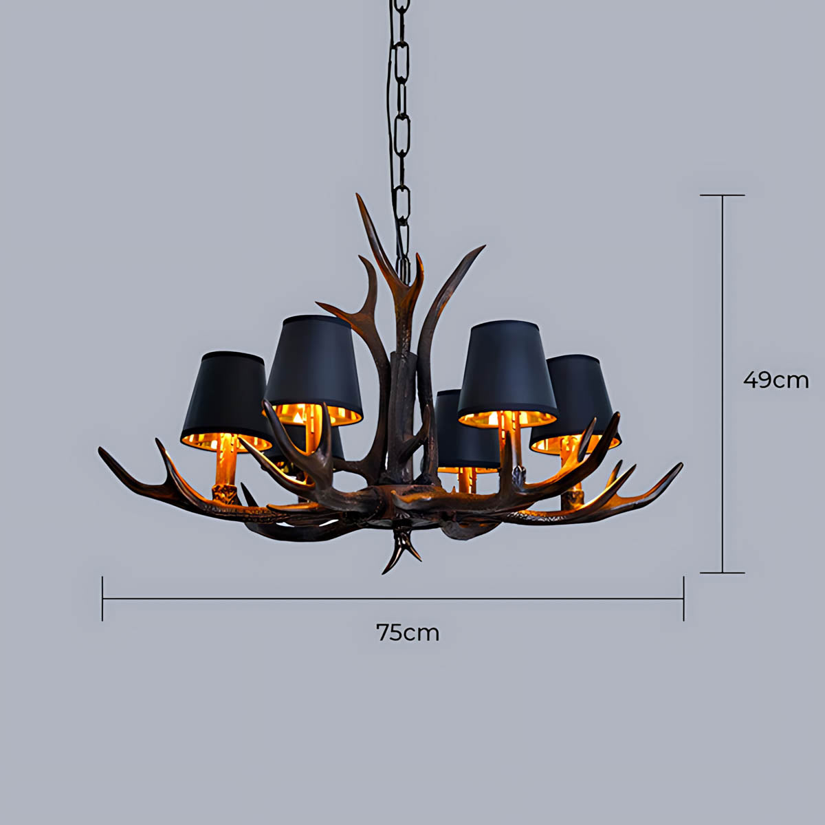 Each of its sculptural arms holds a black lampshade with a warm golden interior, casting a rich, ambient glow that transforms dining rooms, living areas, or entryways into cozy, lodge-like retreats.