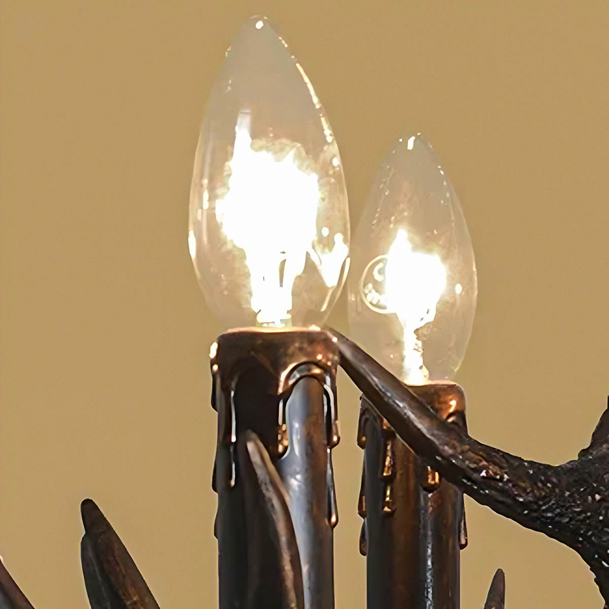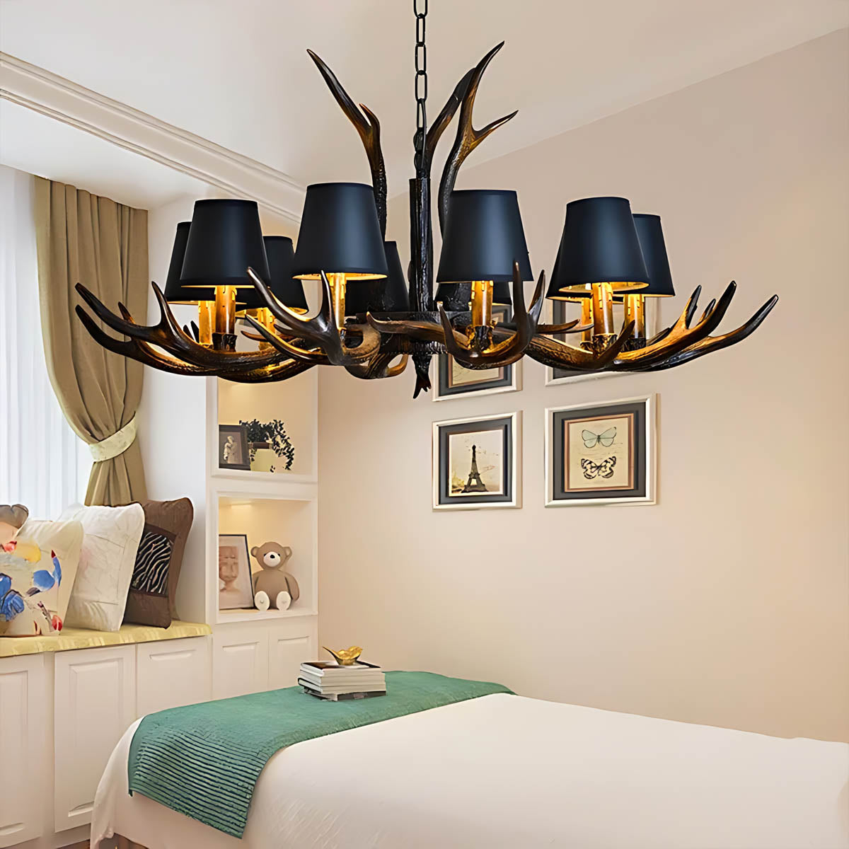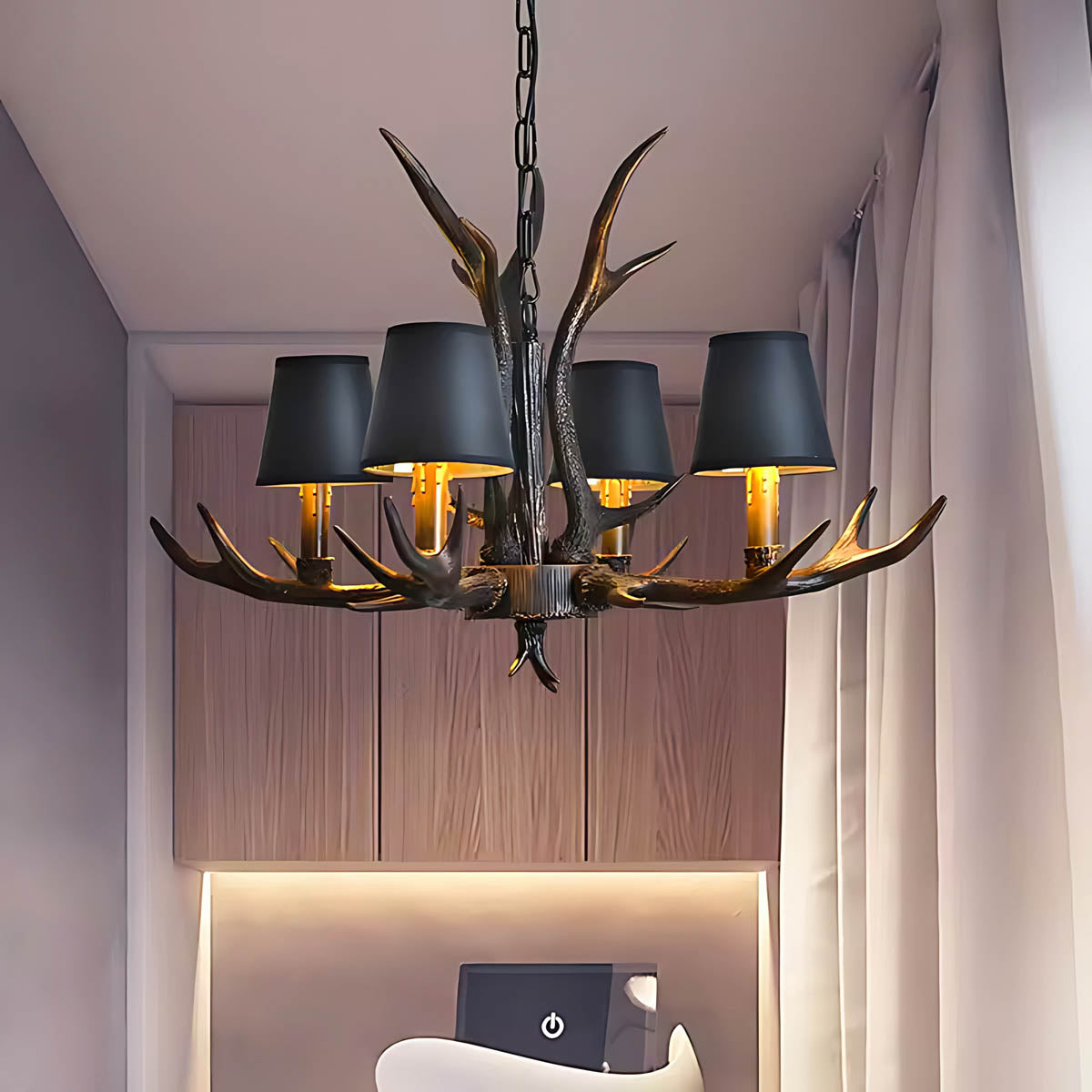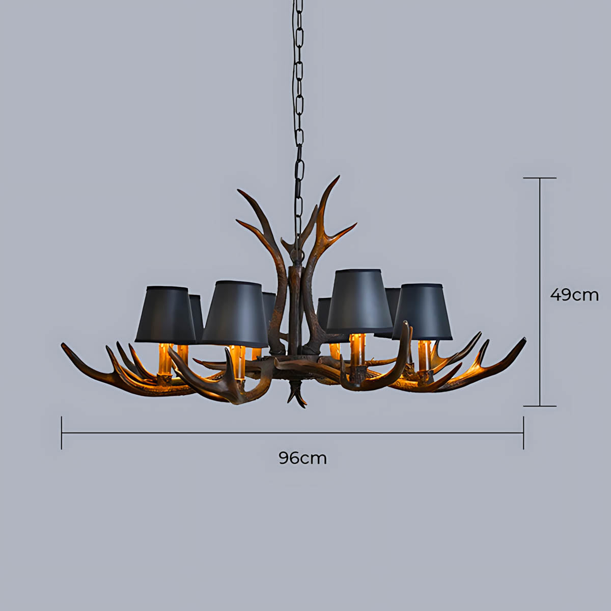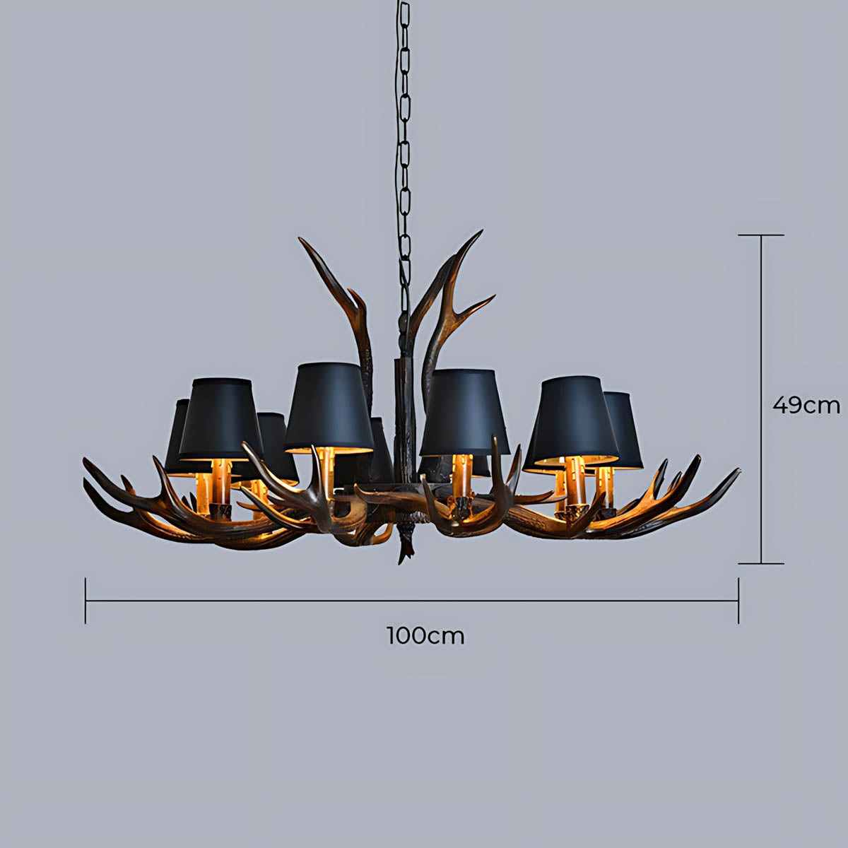Each of its sculptural arms holds a black lampshade with a warm golden interior, casting a rich, ambient glow that transforms dining rooms, living areas, or entryways into cozy, lodge-like retreats.