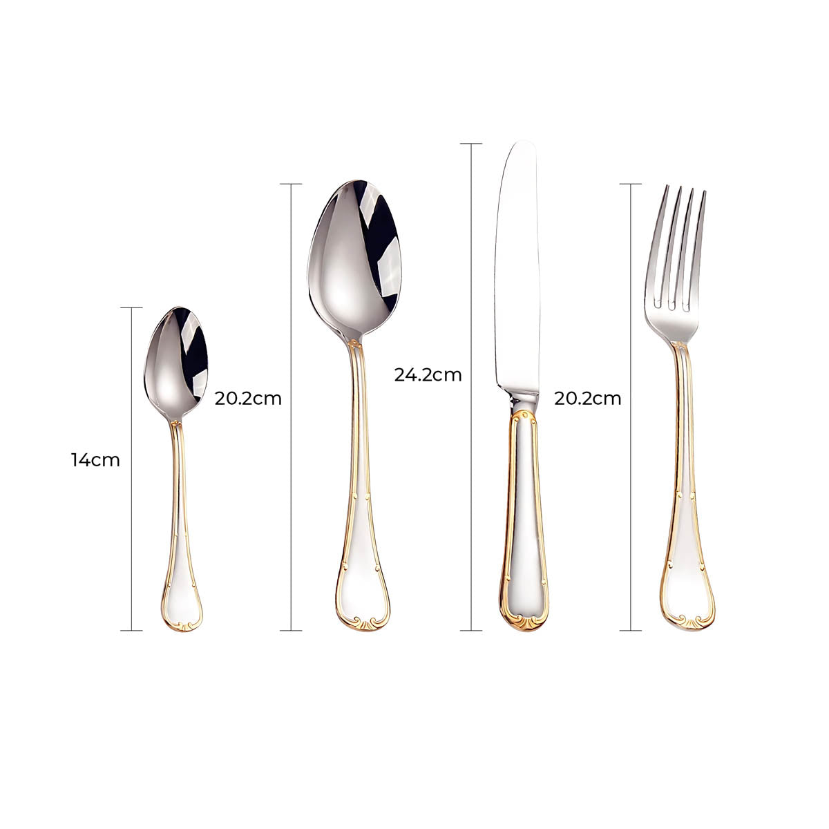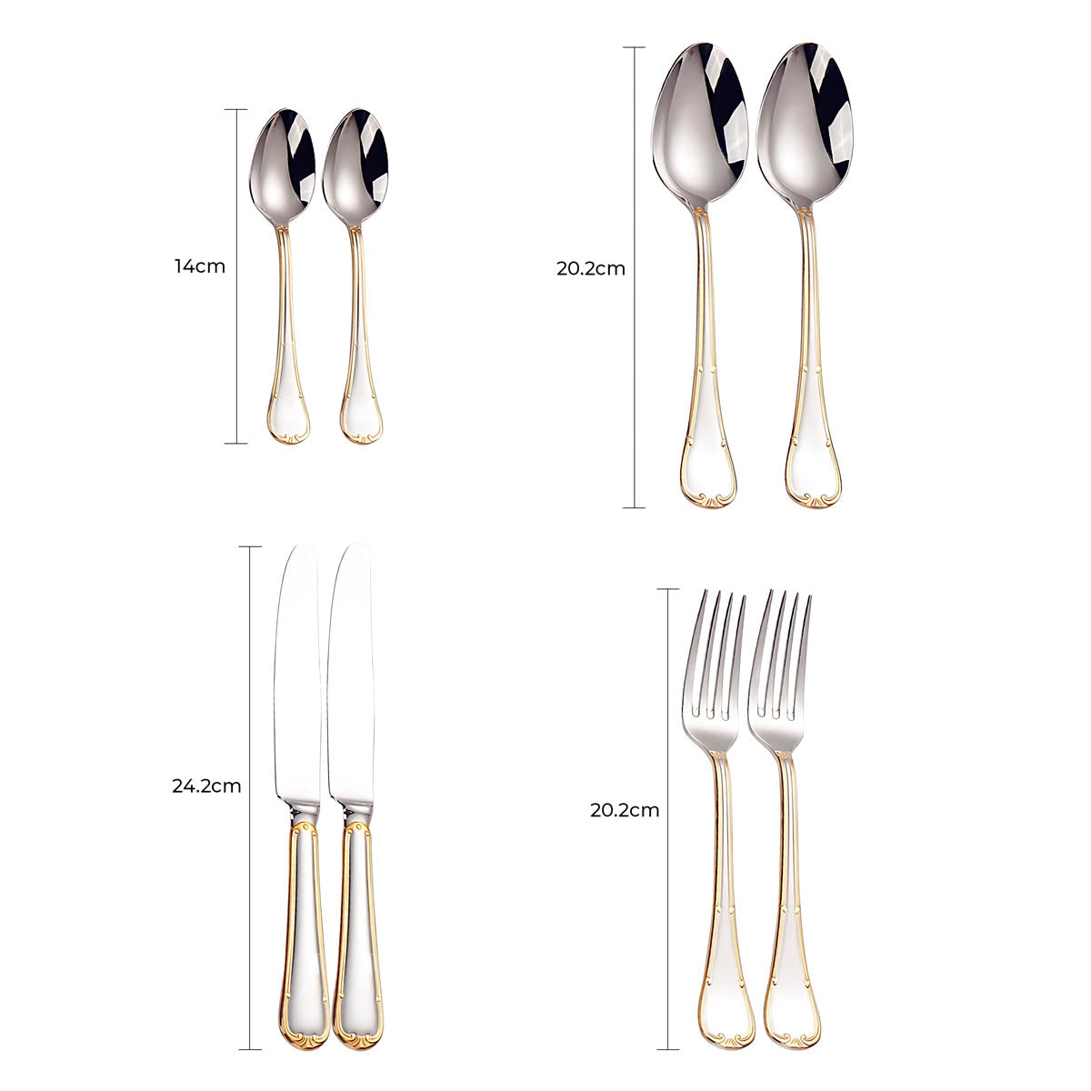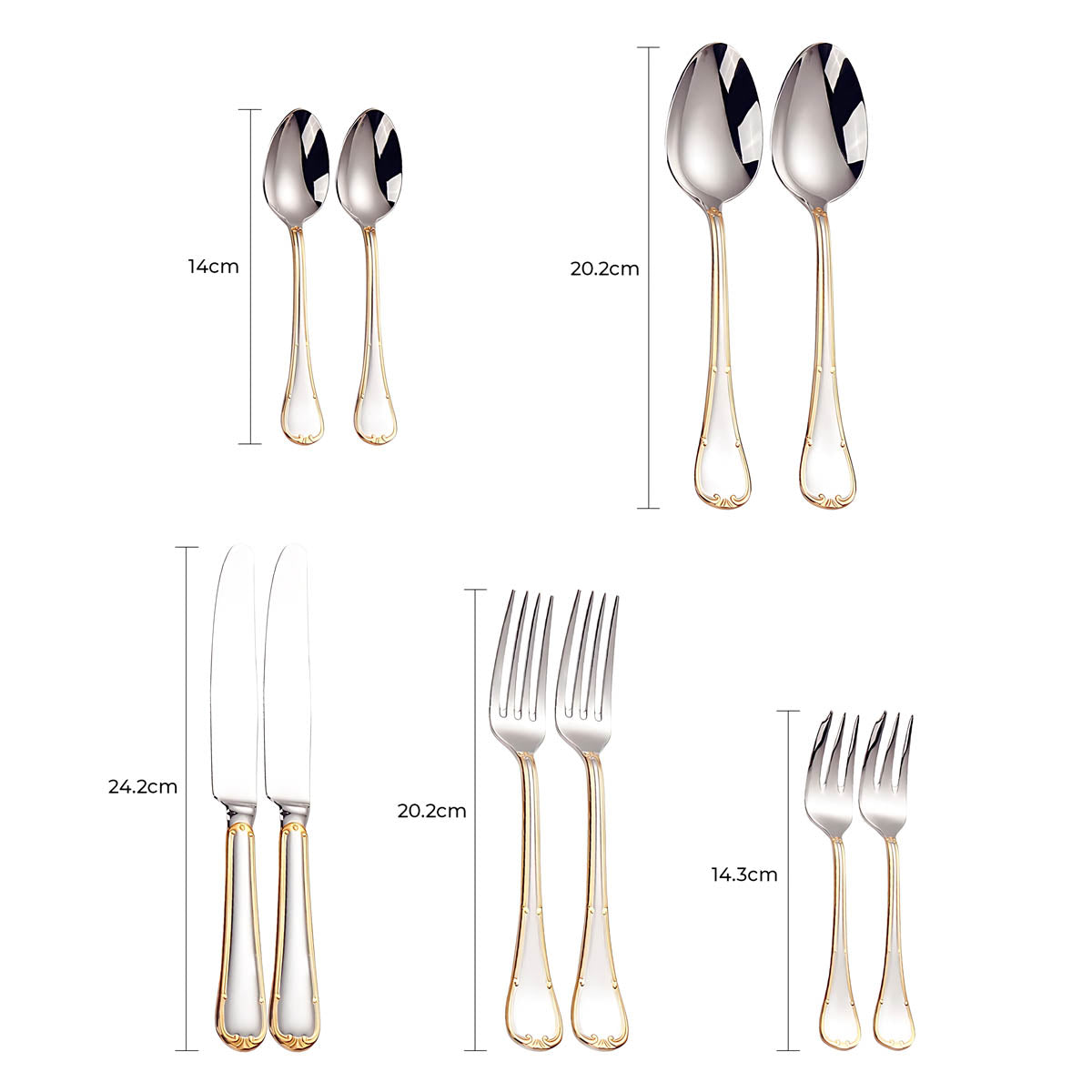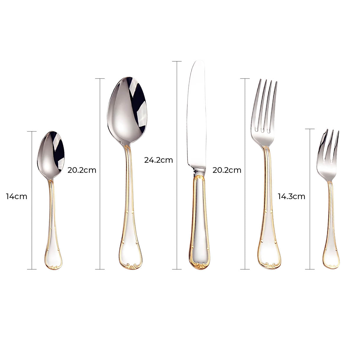 Dishwasher-safe and built to last, this all-silver and gold-accented flatware set transforms any table setting into a refined statement of style and sophistication.