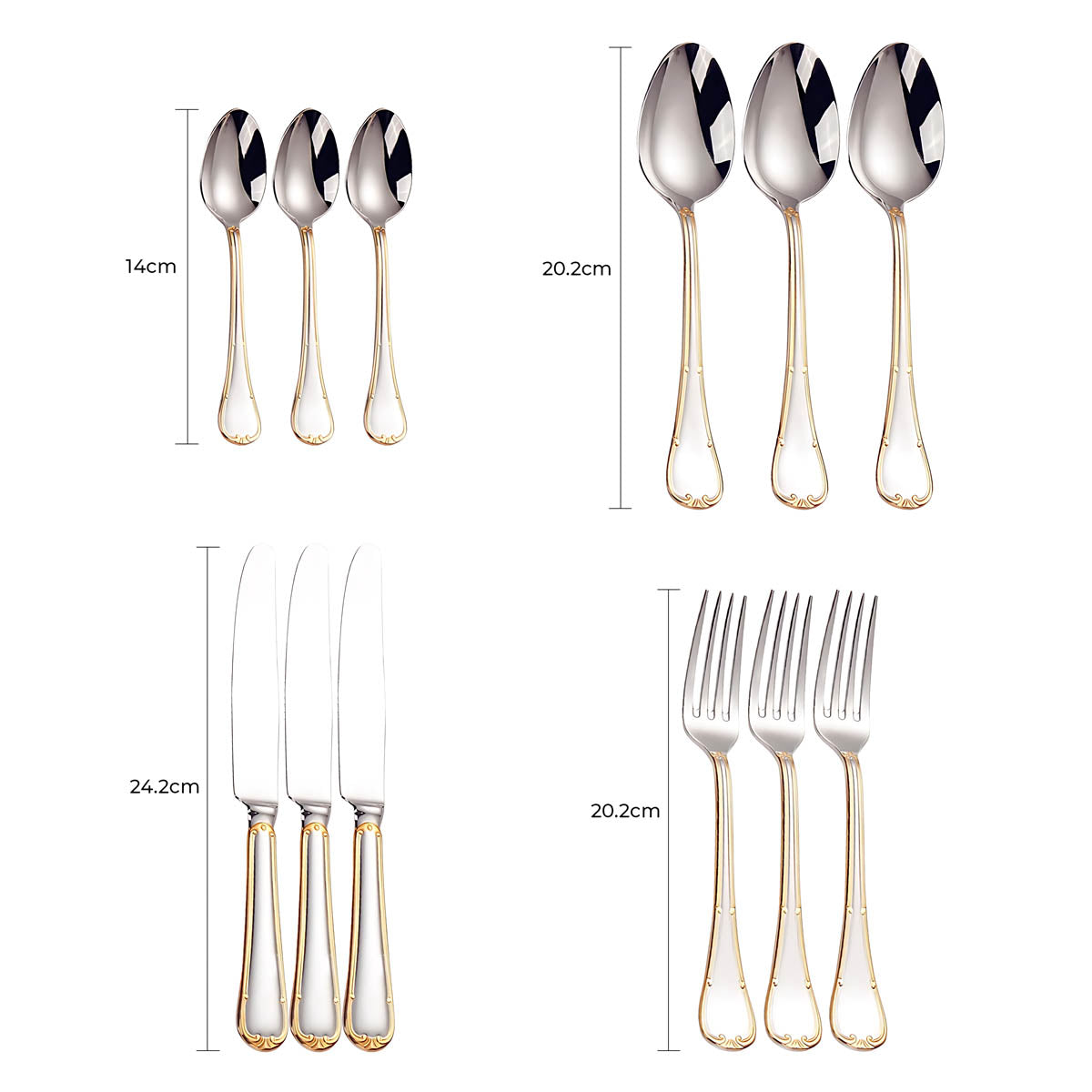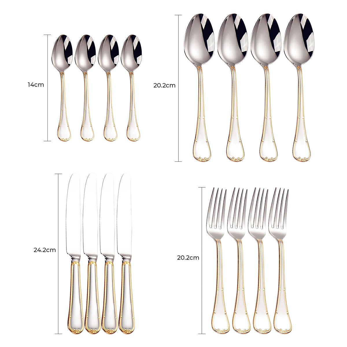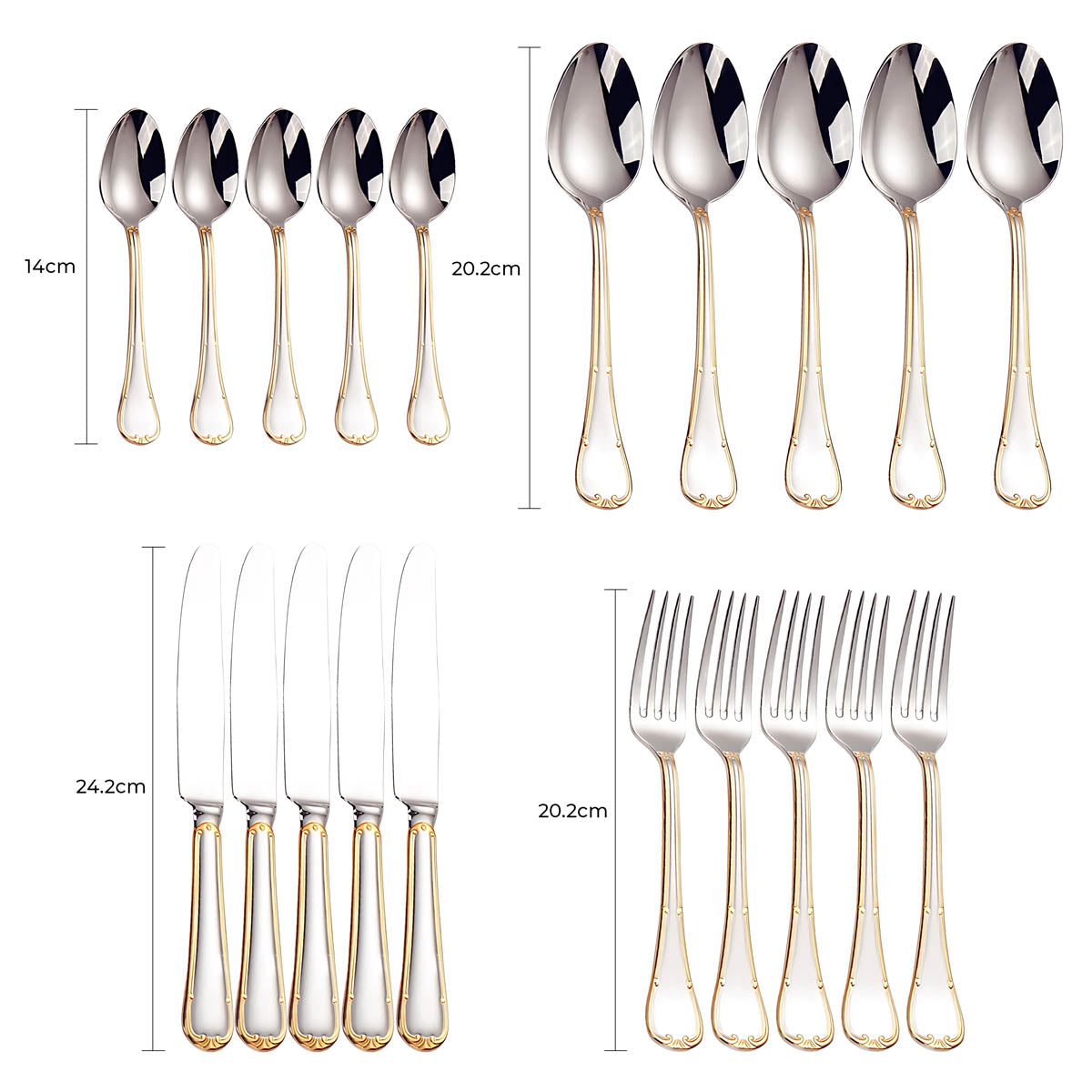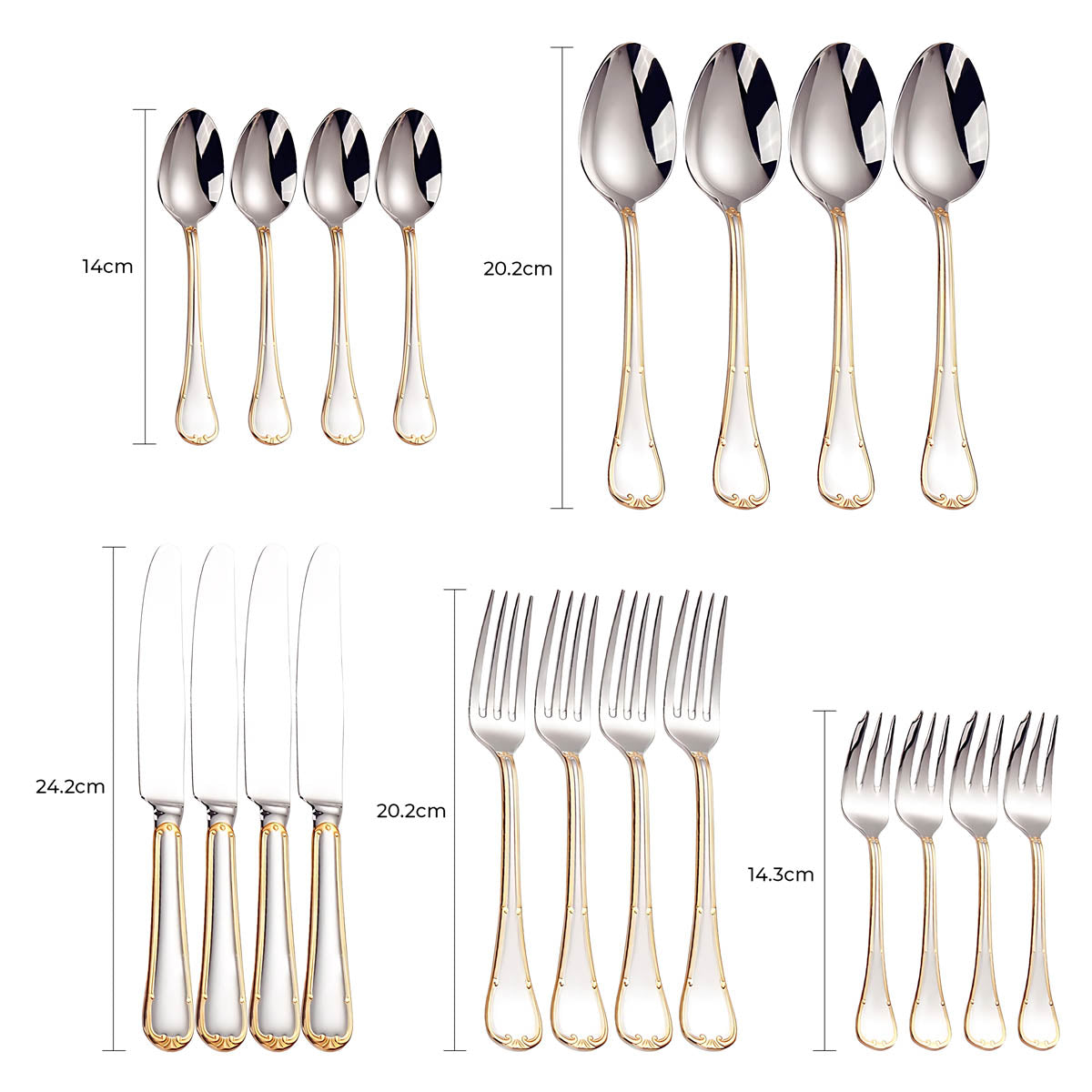 Dishwasher-safe and built to last, this all-silver and gold-accented flatware set transforms any table setting into a refined statement of style and sophistication.