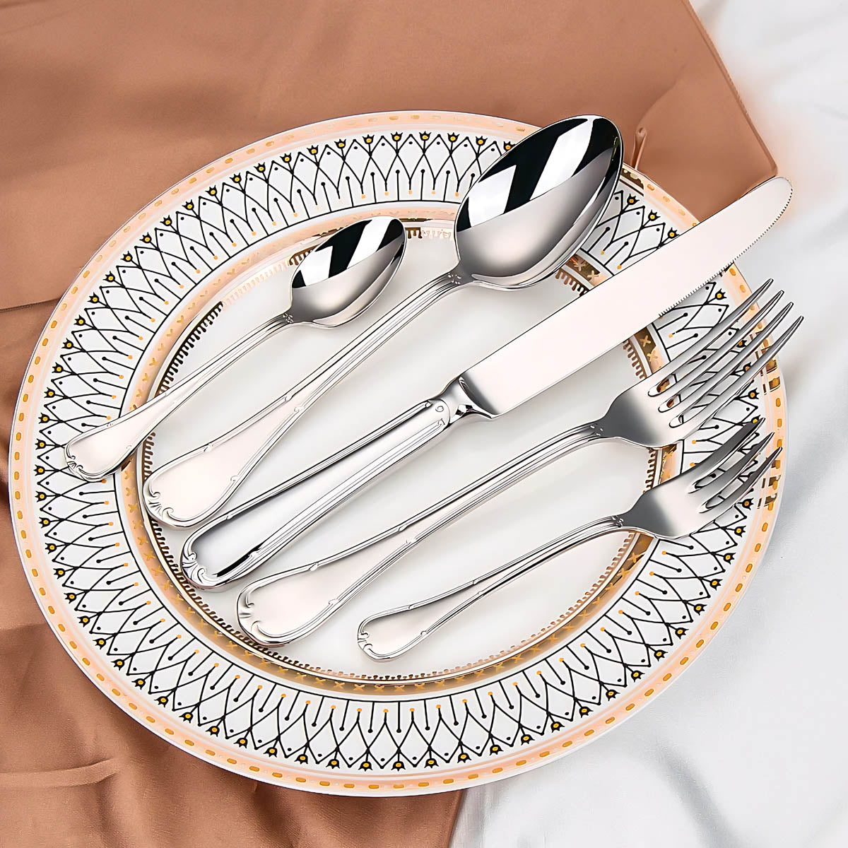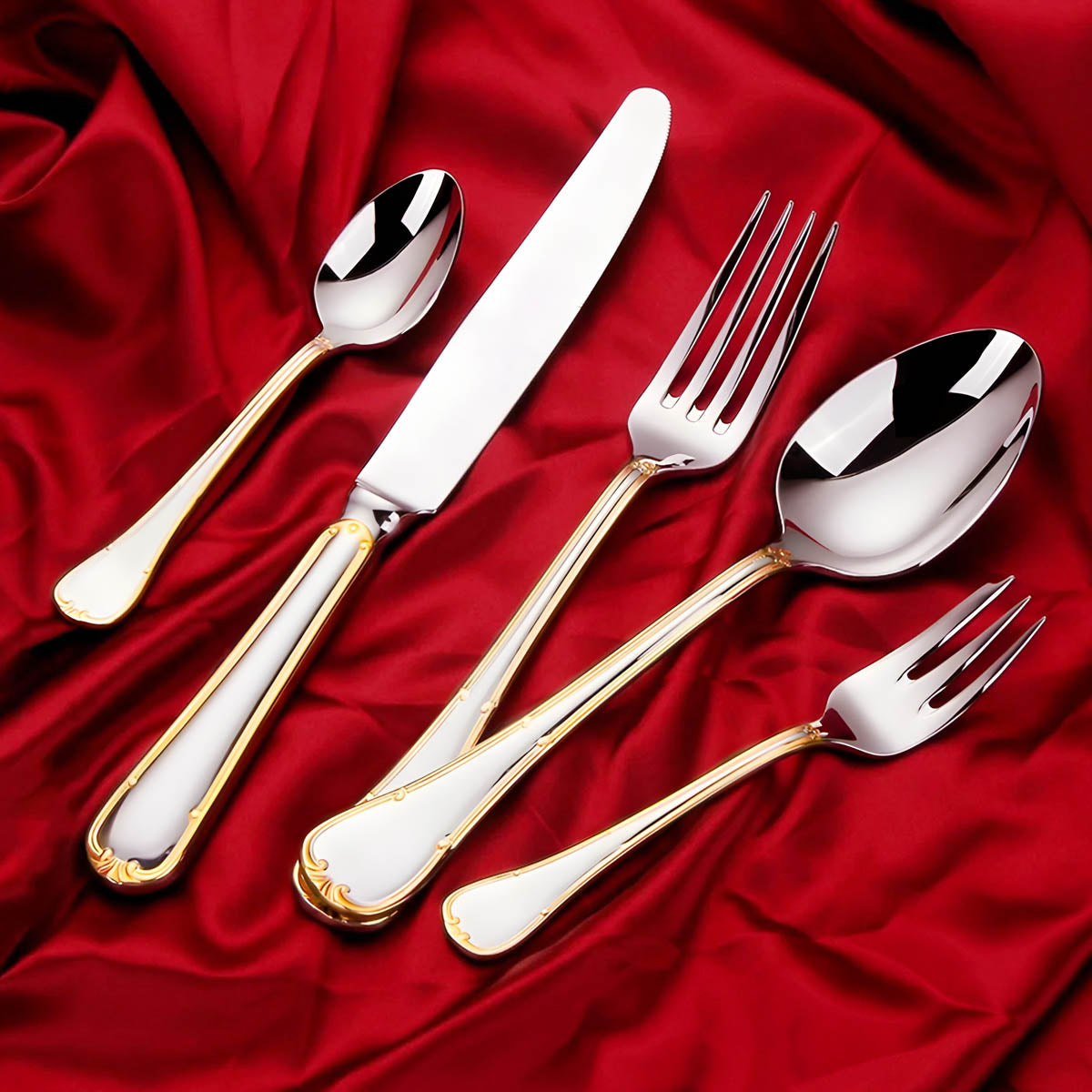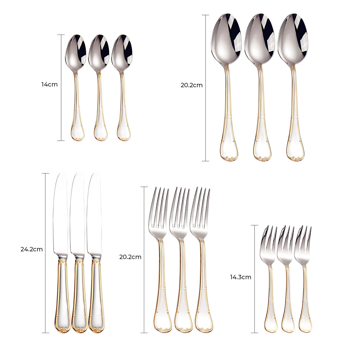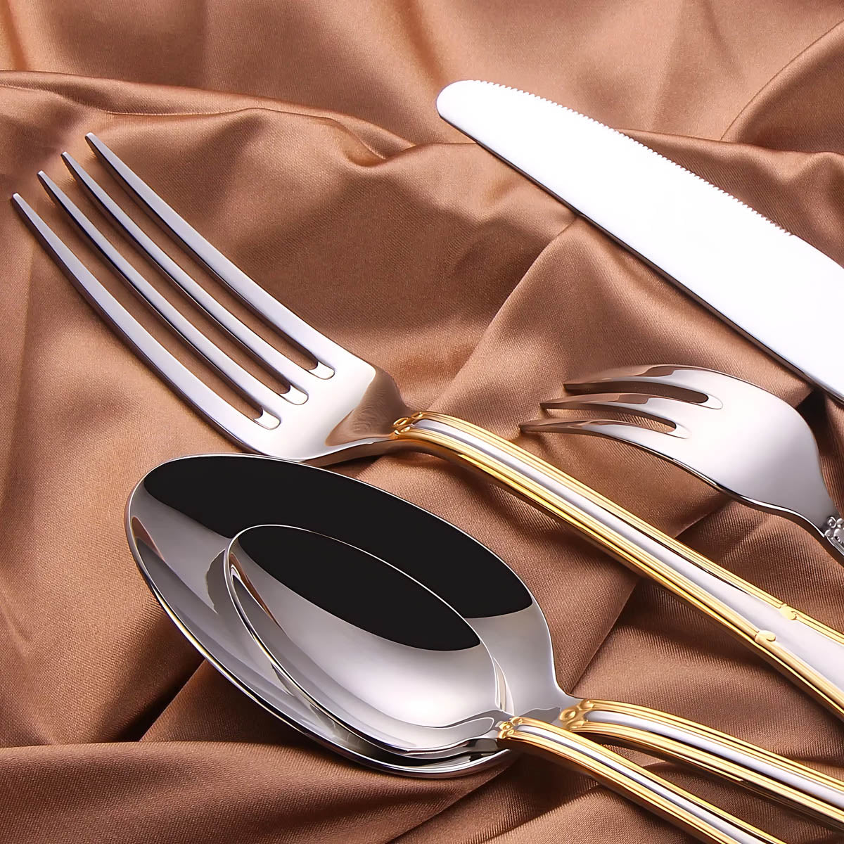 Dishwasher-safe and built to last, this all-silver and gold-accented flatware set transforms any table setting into a refined statement of style and sophistication.
