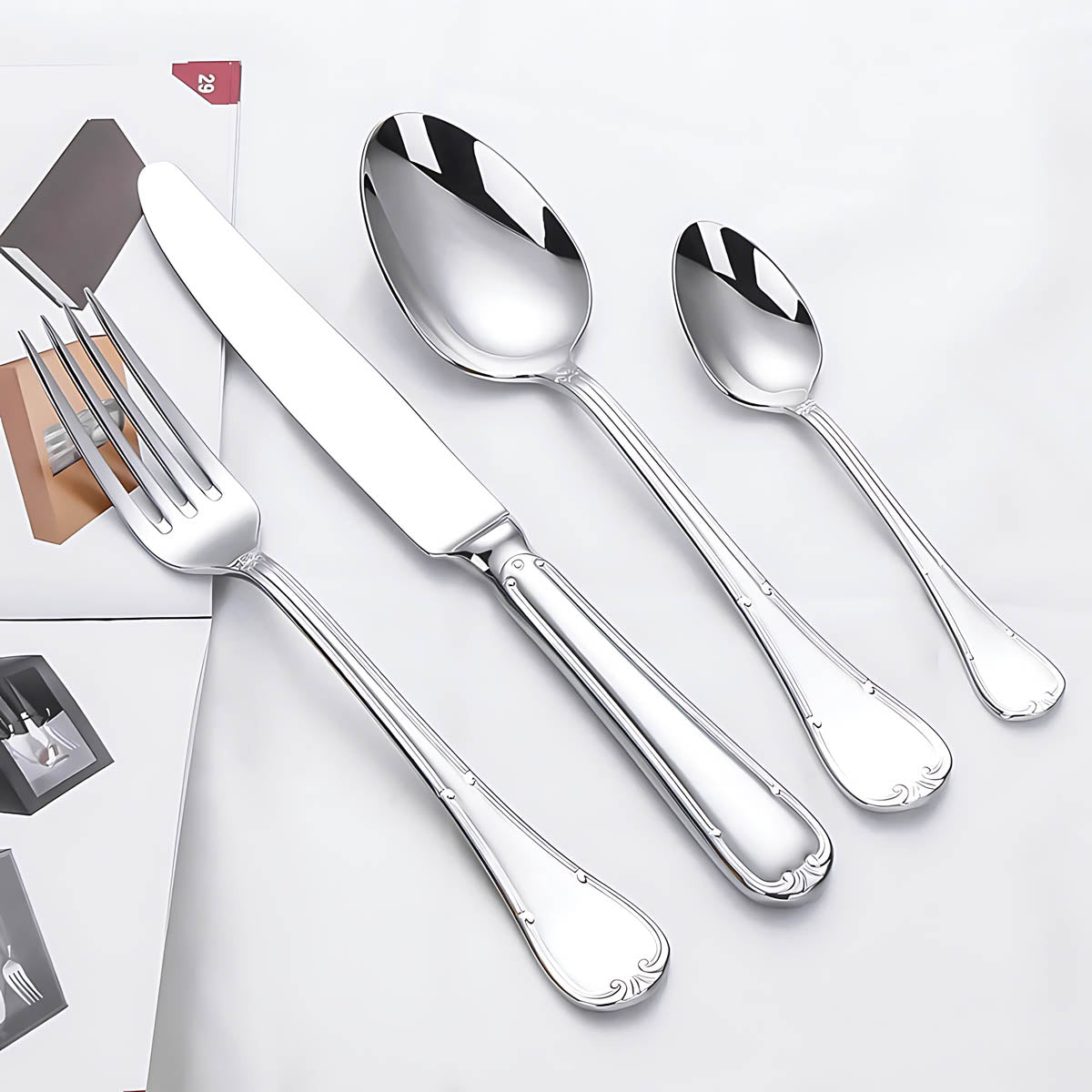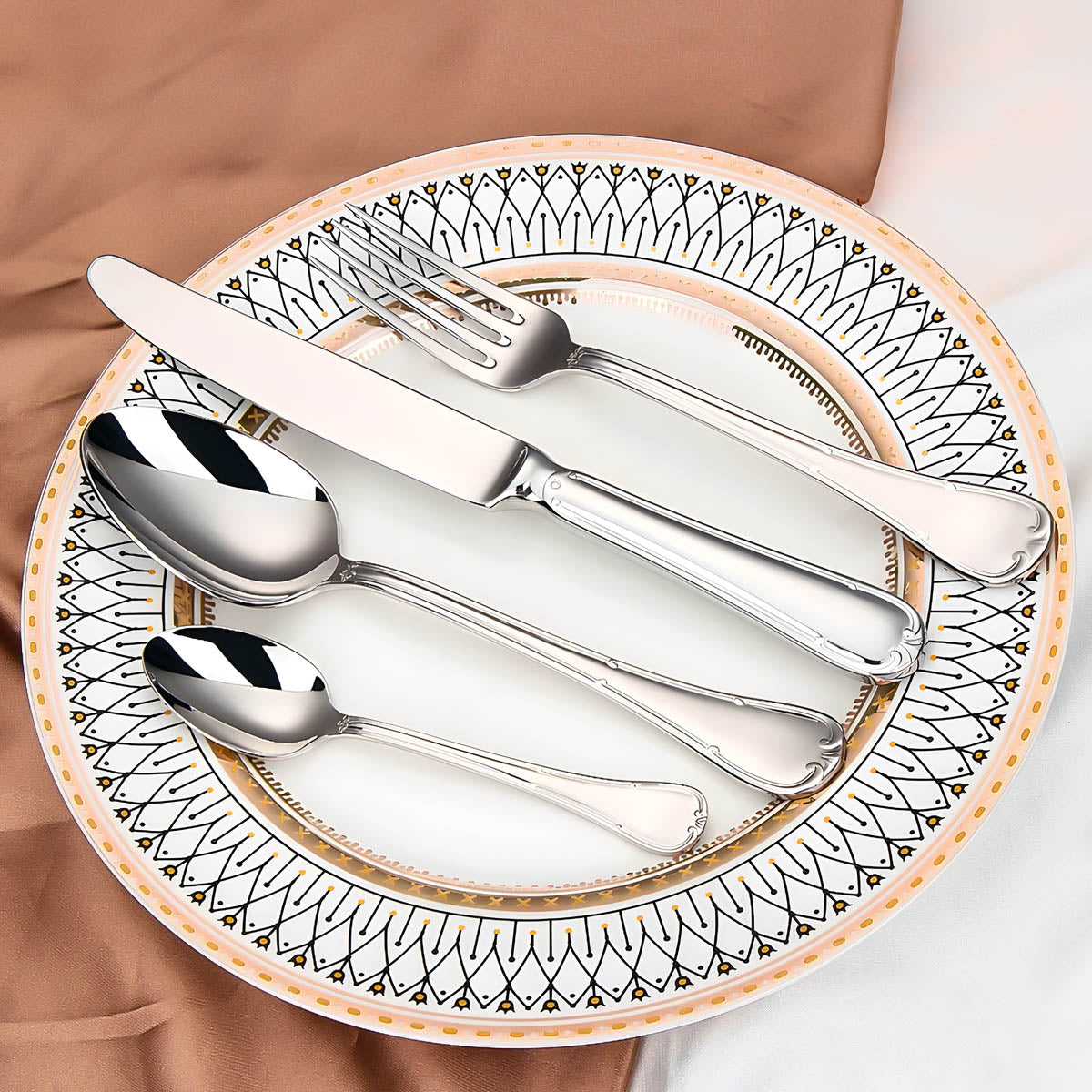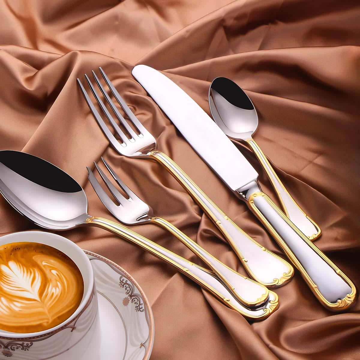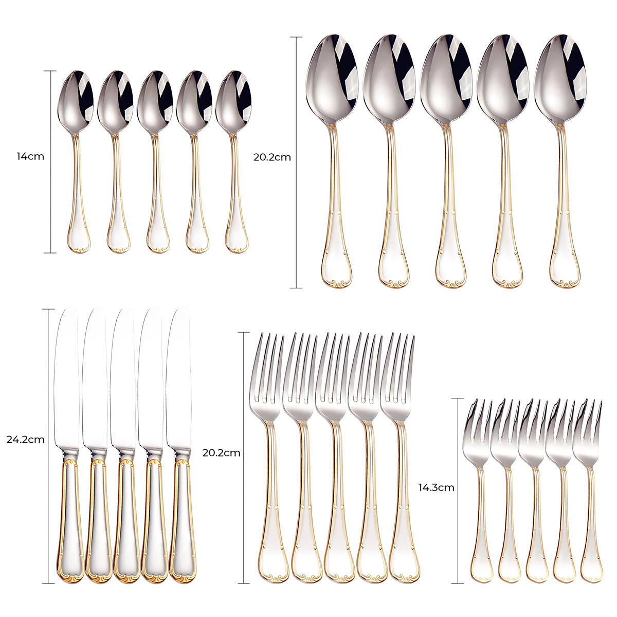 Dishwasher-safe and built to last, this all-silver and gold-accented flatware set transforms any table setting into a refined statement of style and sophistication.
