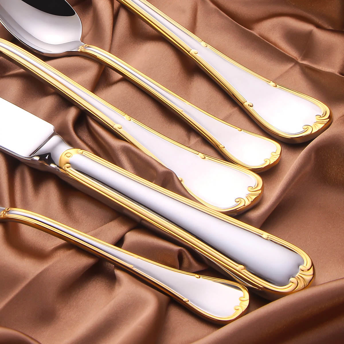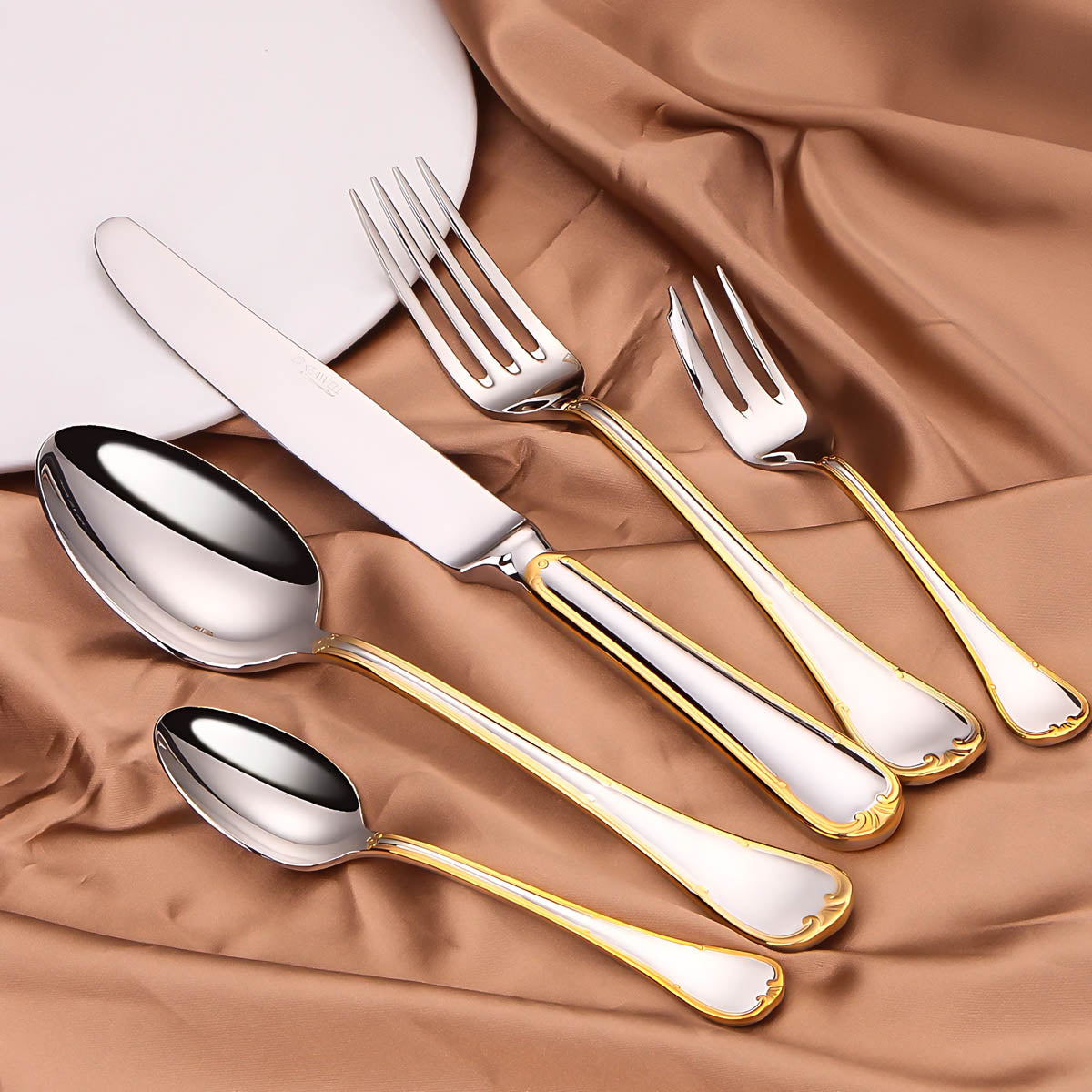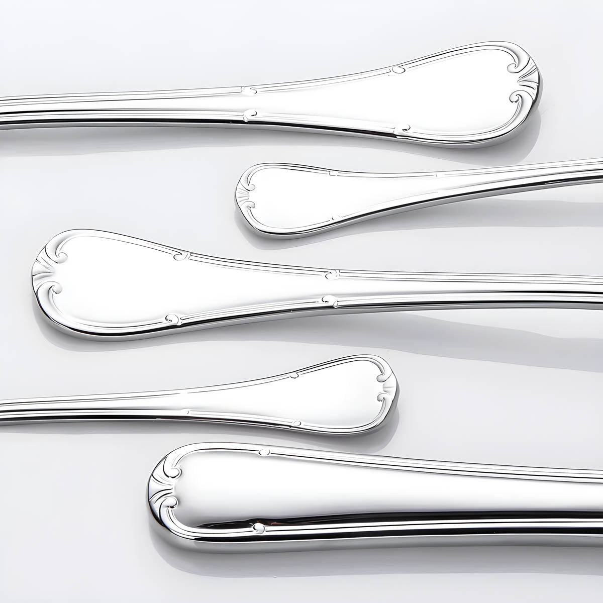 Each piece features a delicately scalloped handle edged in luxurious gold plating, blending timeless baroque-inspired detailing with a streamlined silhouette for a look that’s both ornate and modern.
