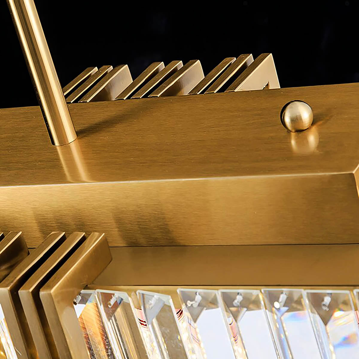 This breathtaking rectangular pendant light features cascading rows of precision-cut crystals framed by sleek, gold-toned stainless steel, creating a mesmerizing play of light and reflection.