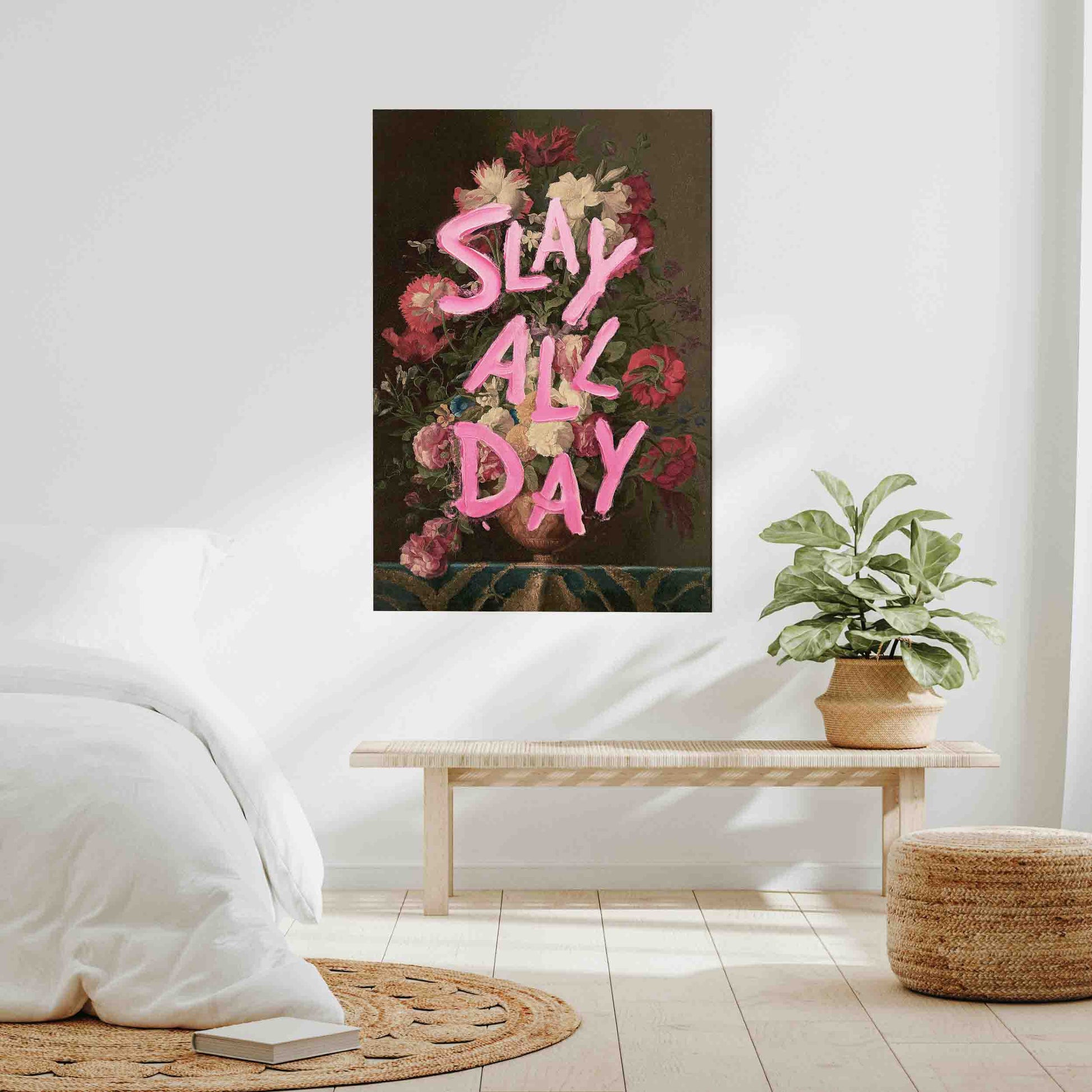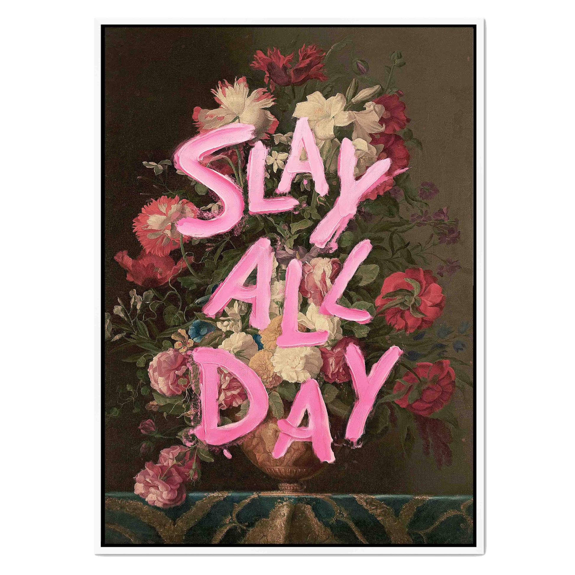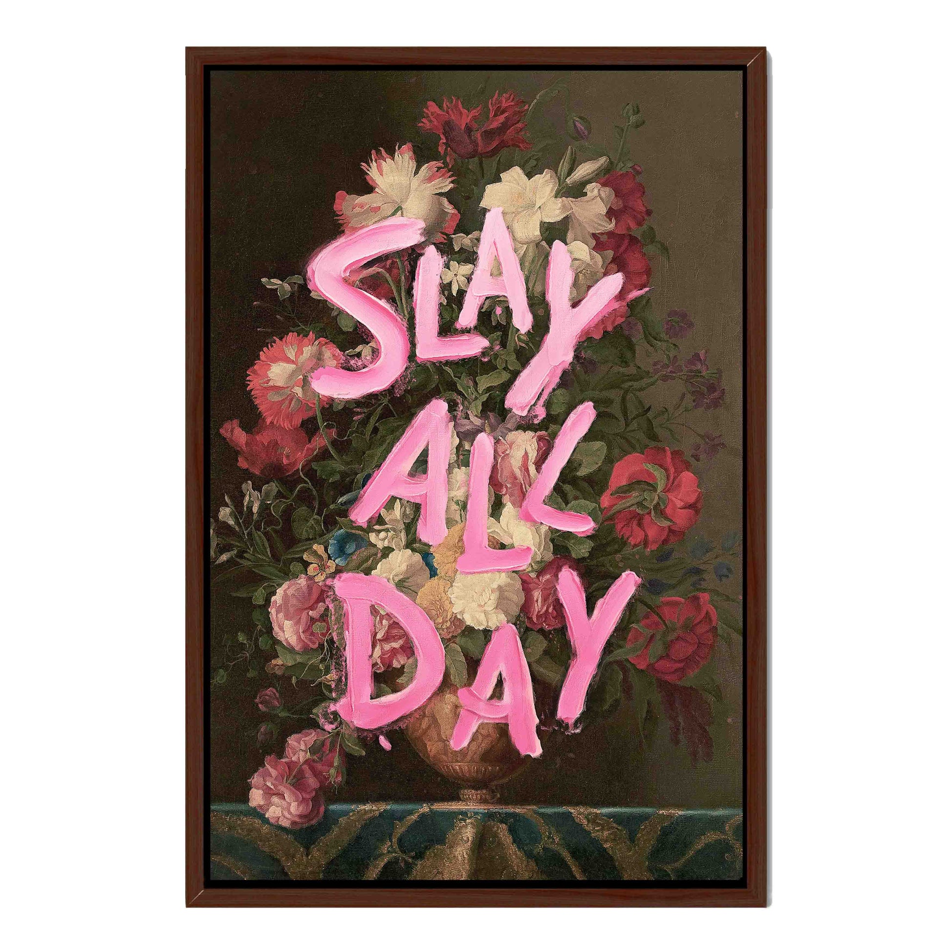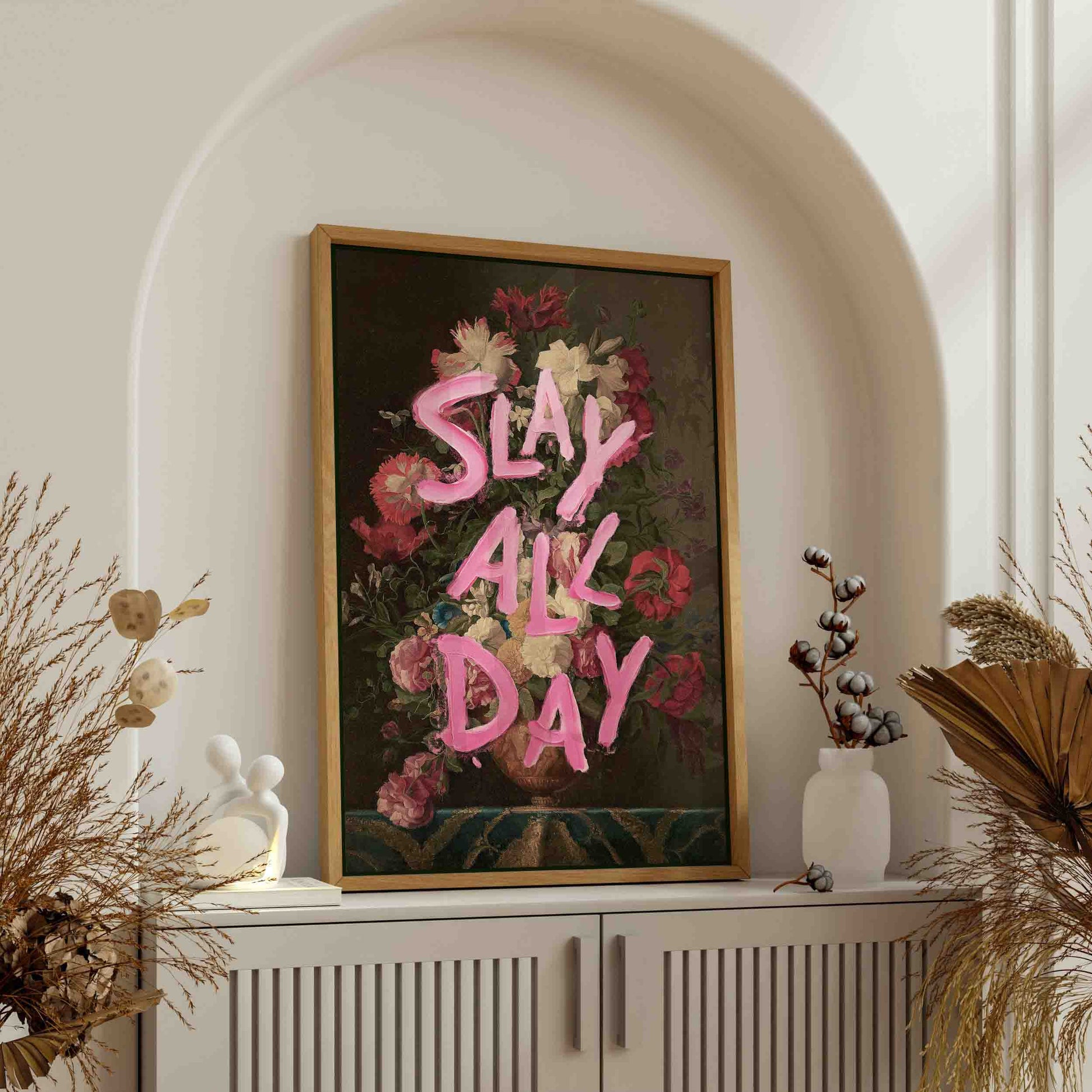 Unique canvas print combining a vintage floral bouquet with bold neon pink text SLAY ALL DAY. A stylish mix of classical elegance and modern motivation.