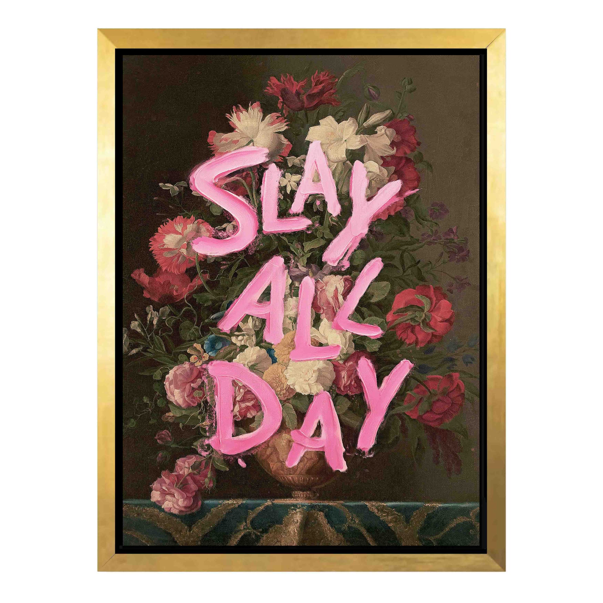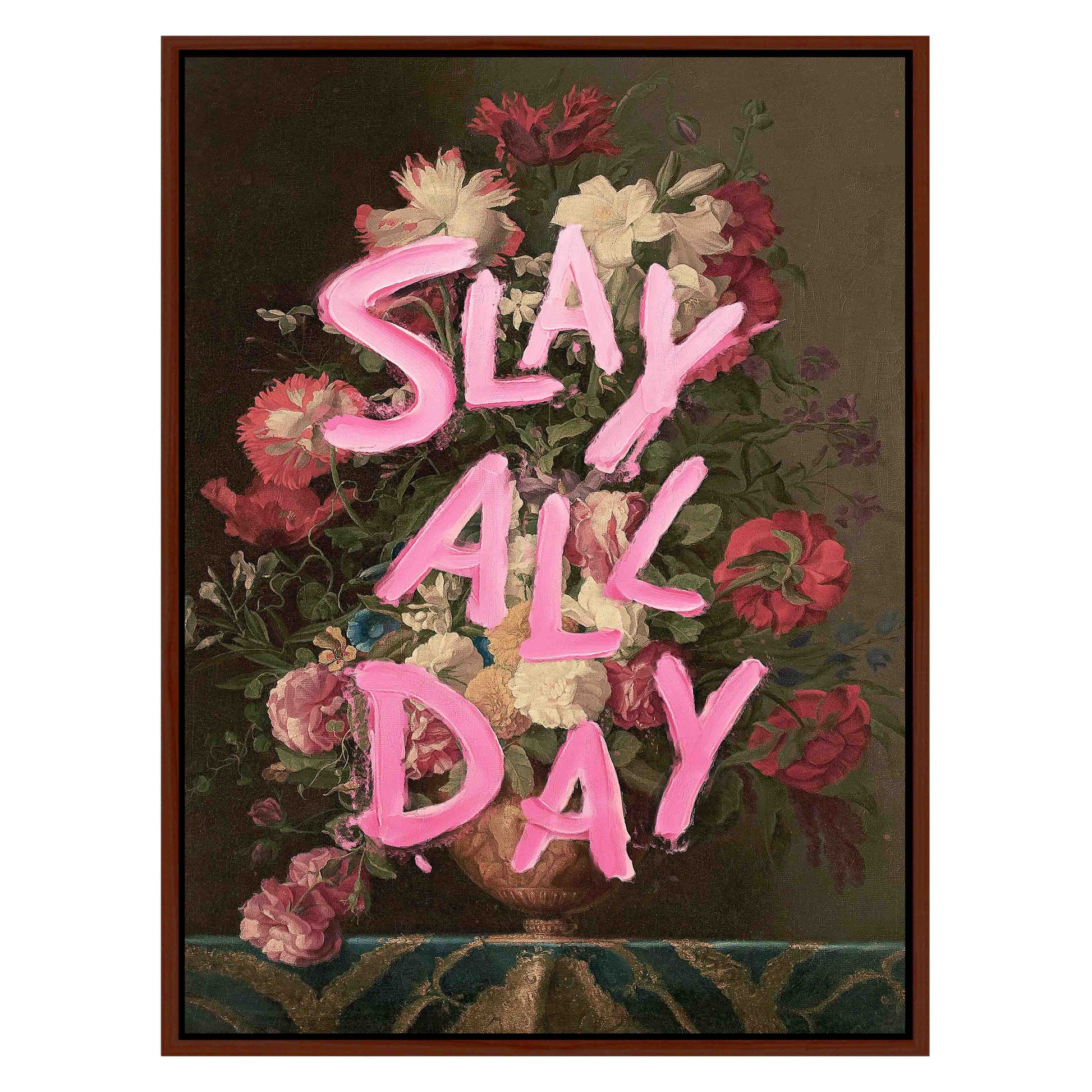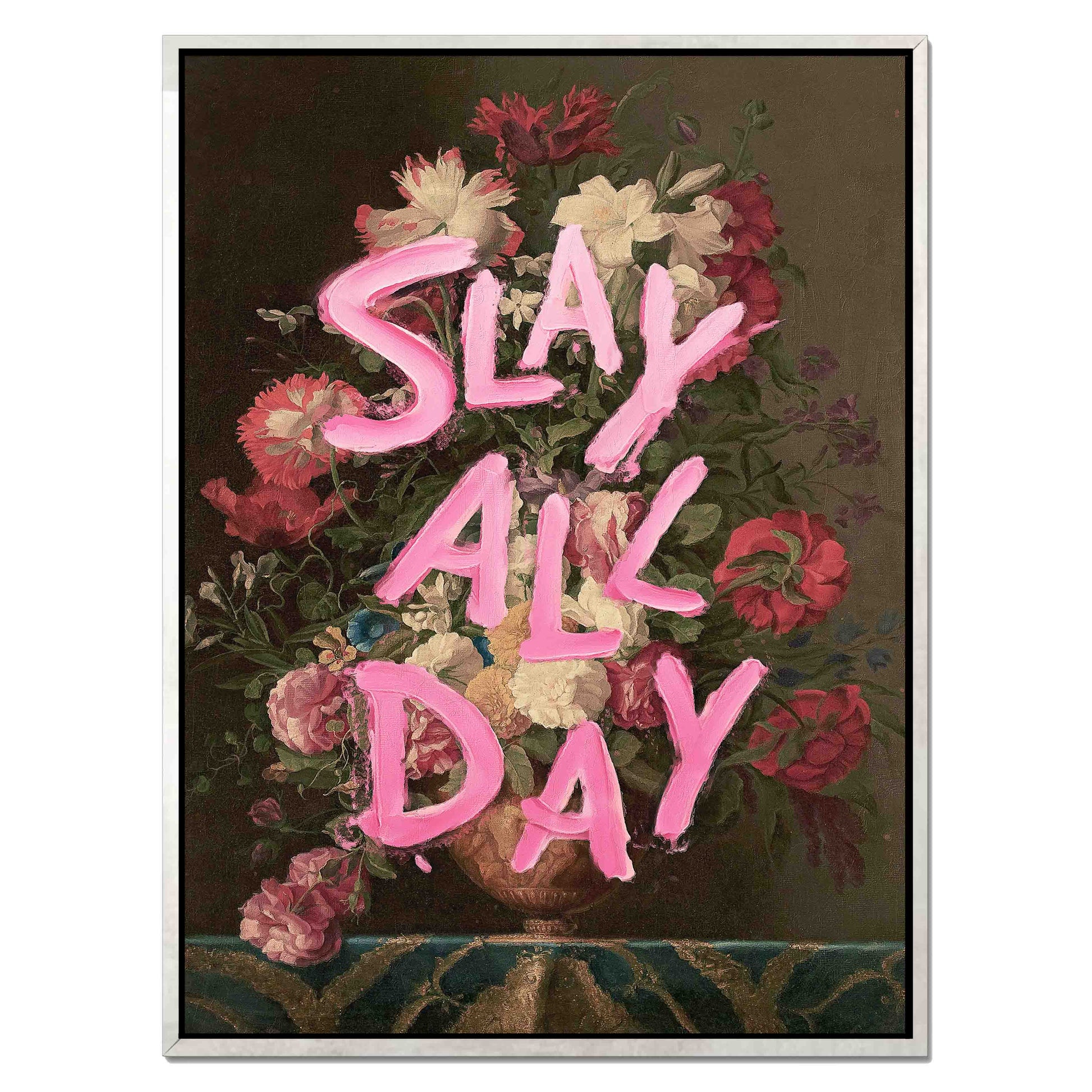 Unique canvas print combining a vintage floral bouquet with bold neon pink text SLAY ALL DAY. A stylish mix of classical elegance and modern motivation.