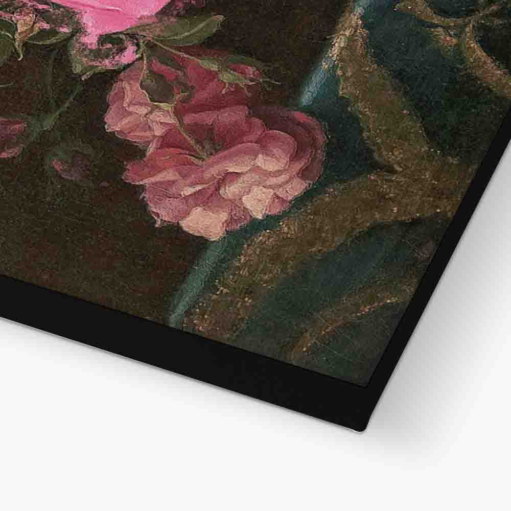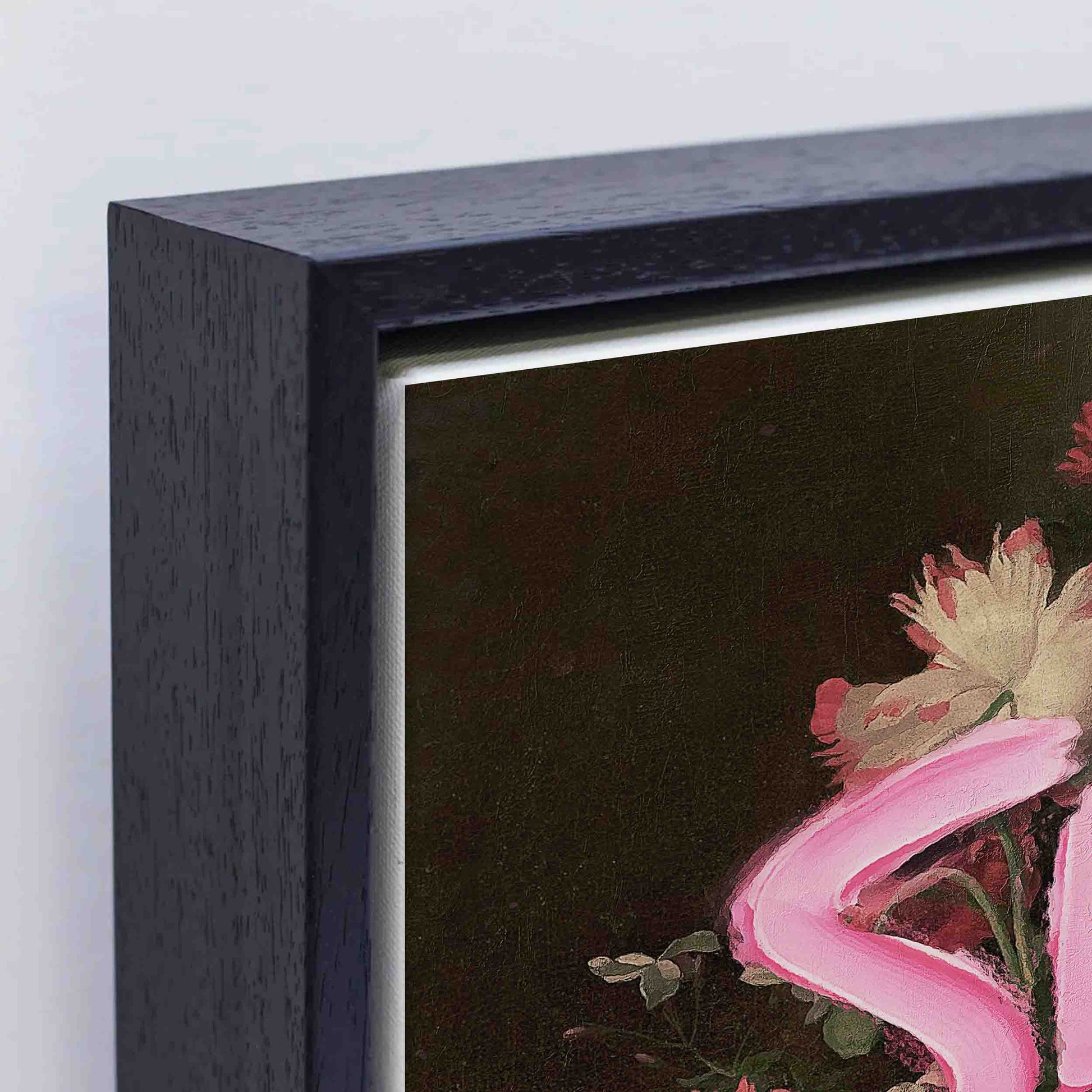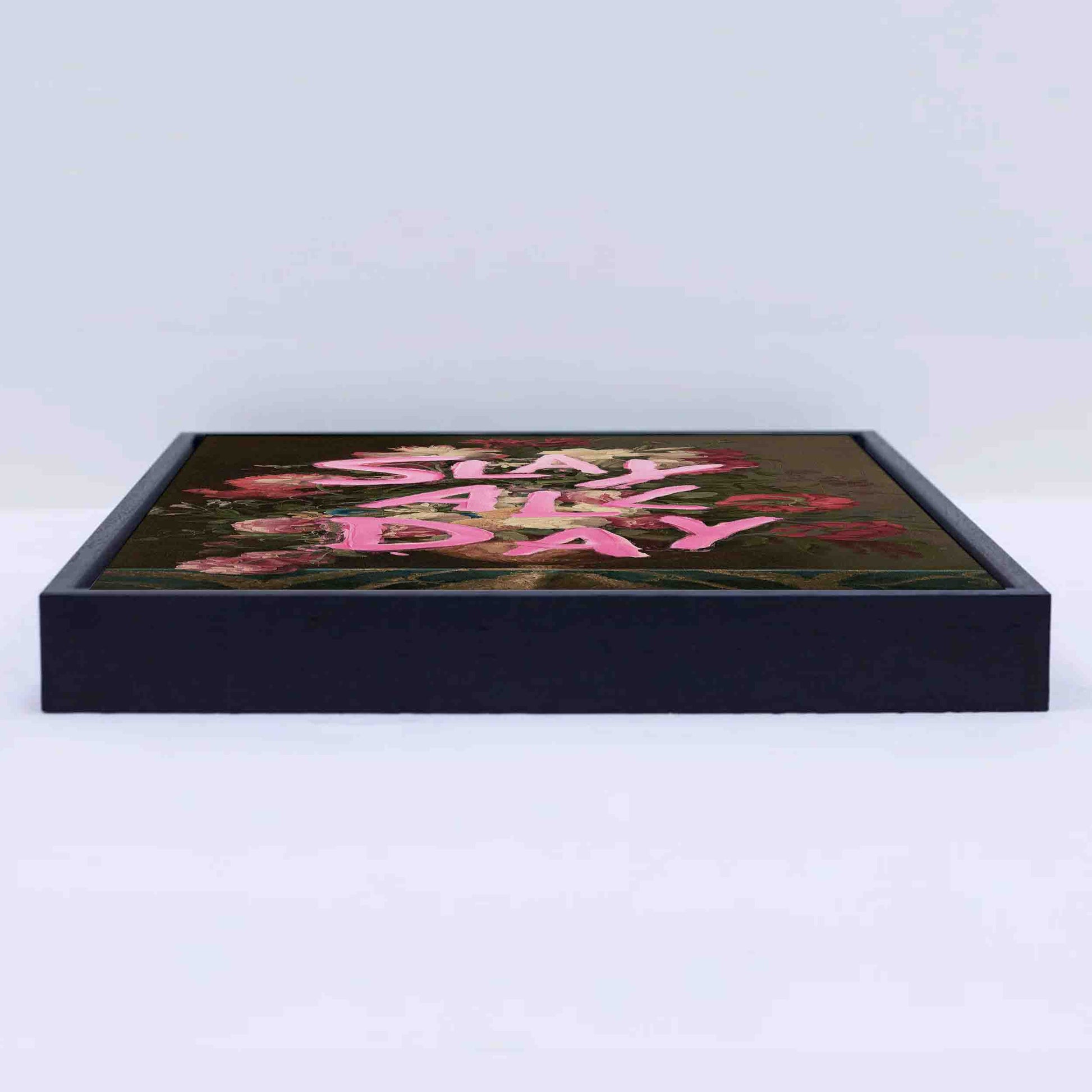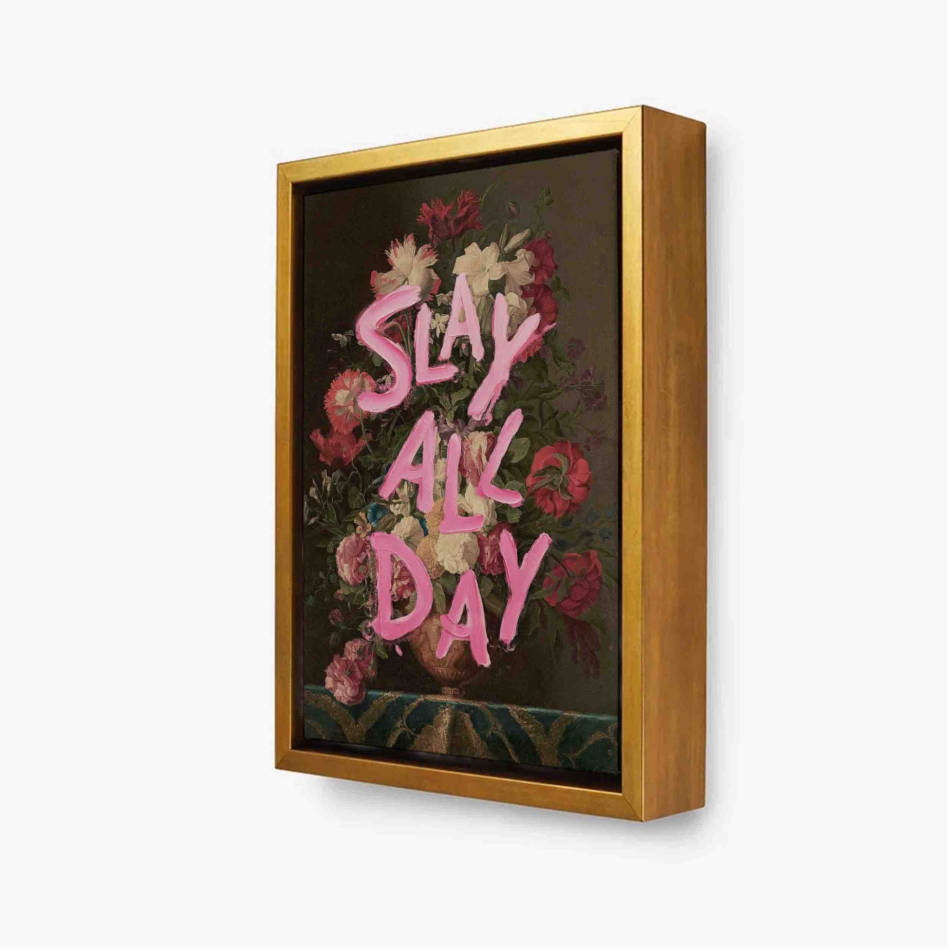 Unique canvas print combining a vintage floral bouquet with bold neon pink text SLAY ALL DAY. A stylish mix of classical elegance and modern motivation.