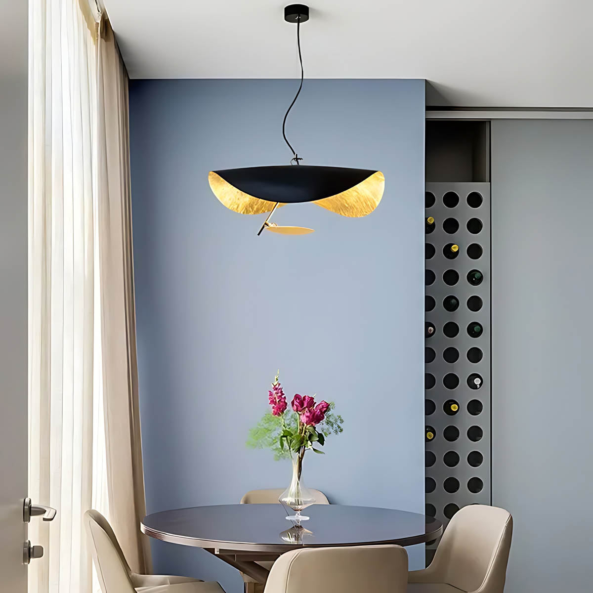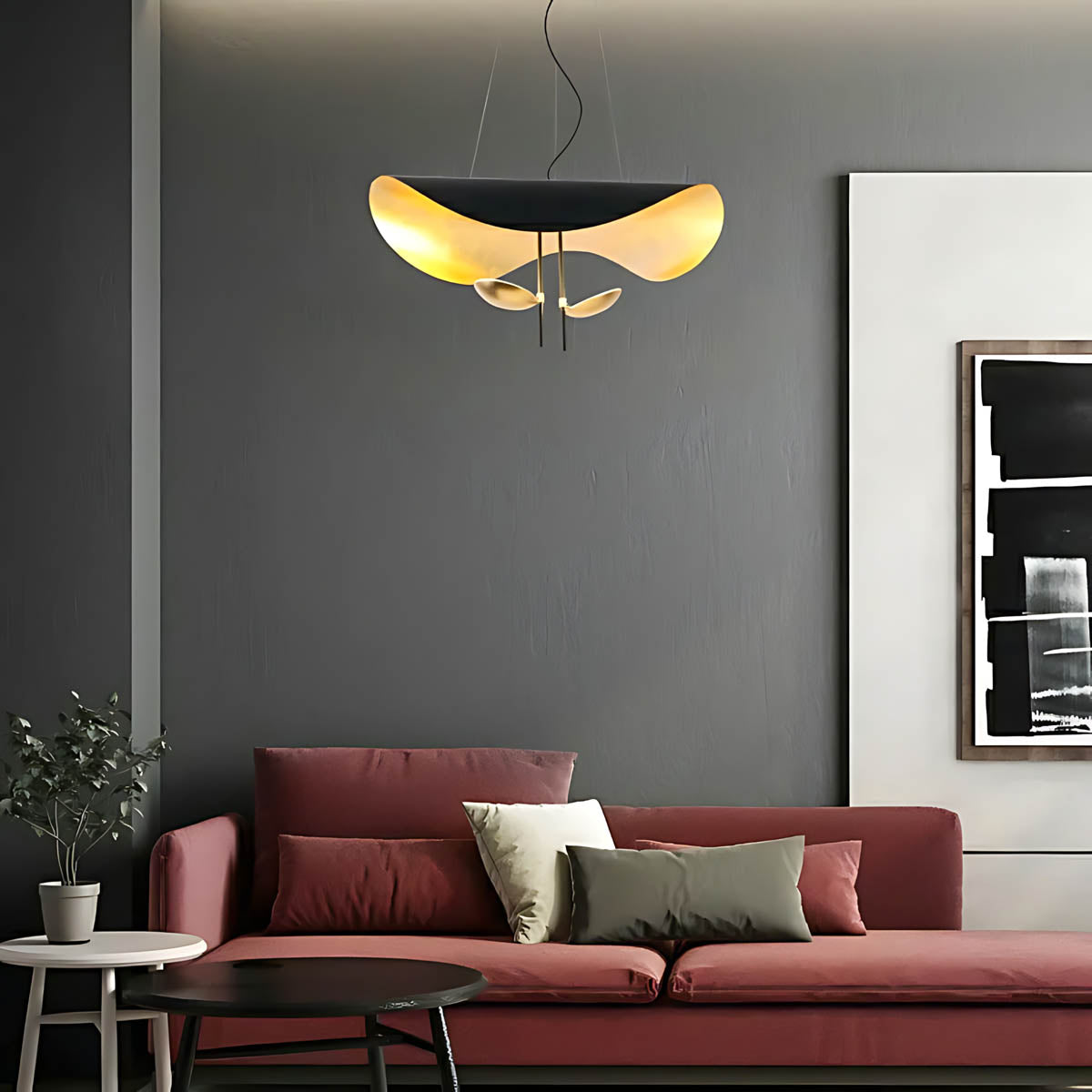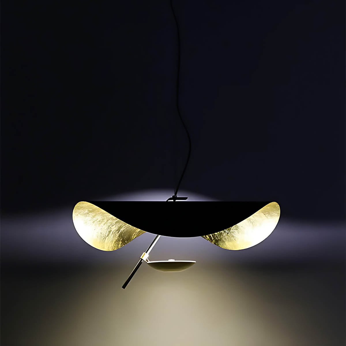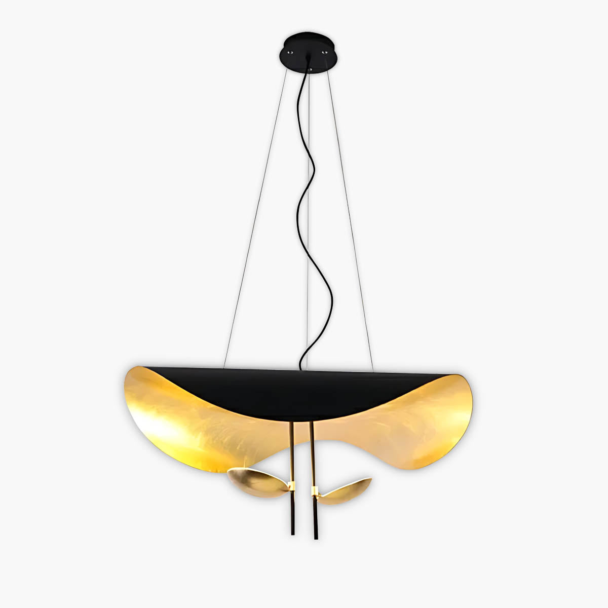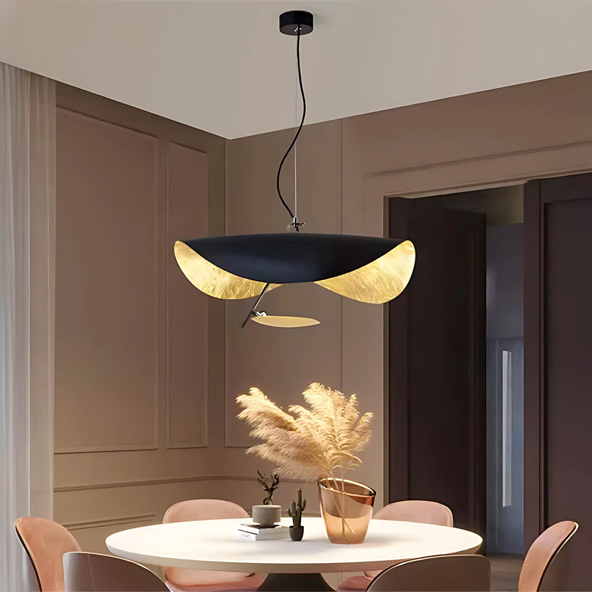 Its flowing, wing-like shades open to reveal a softly gilded interior that bounces light upward and outward, creating a warm, ambient glow with gentle downlight for dining tables, living rooms, or bedrooms.